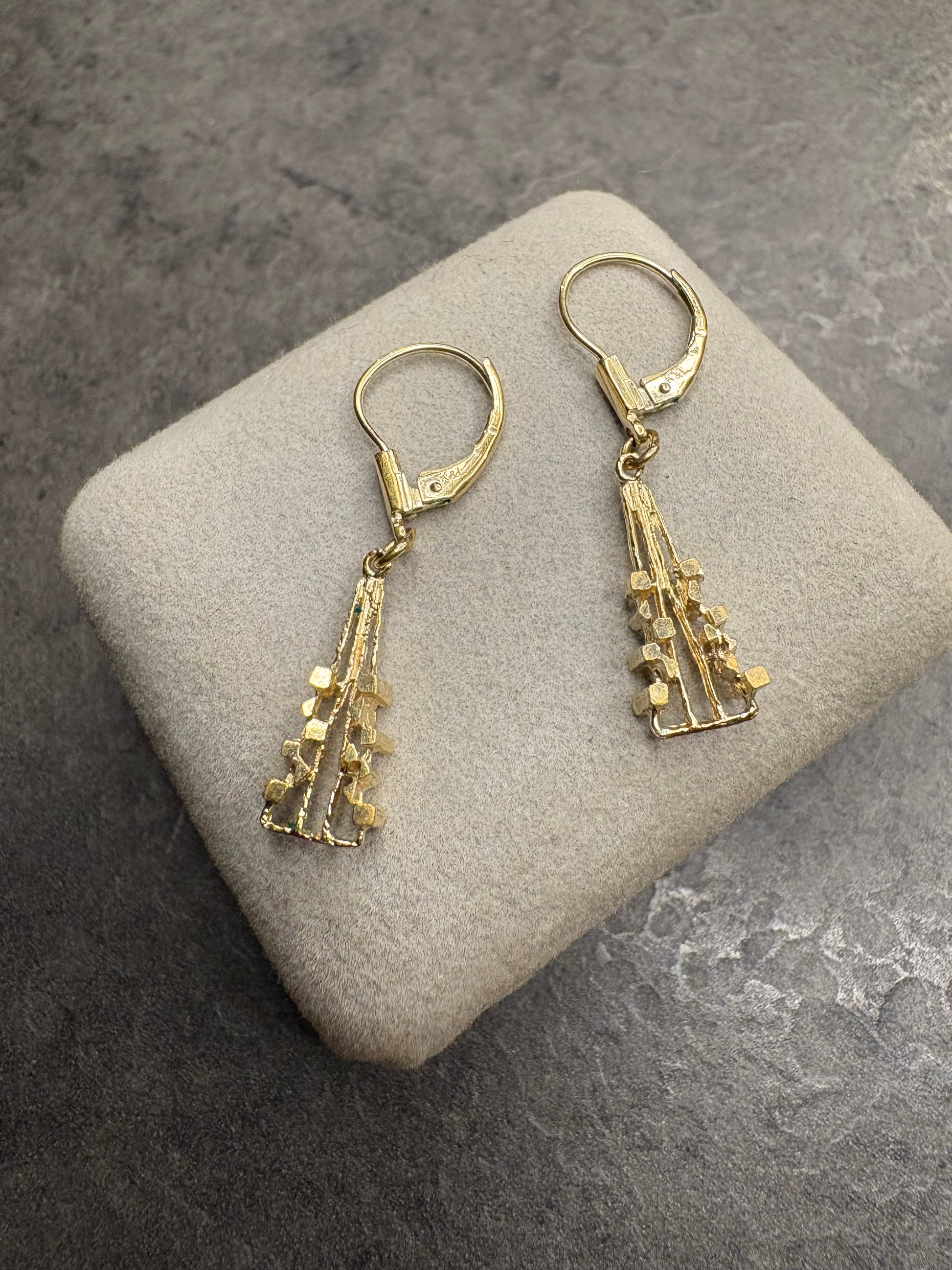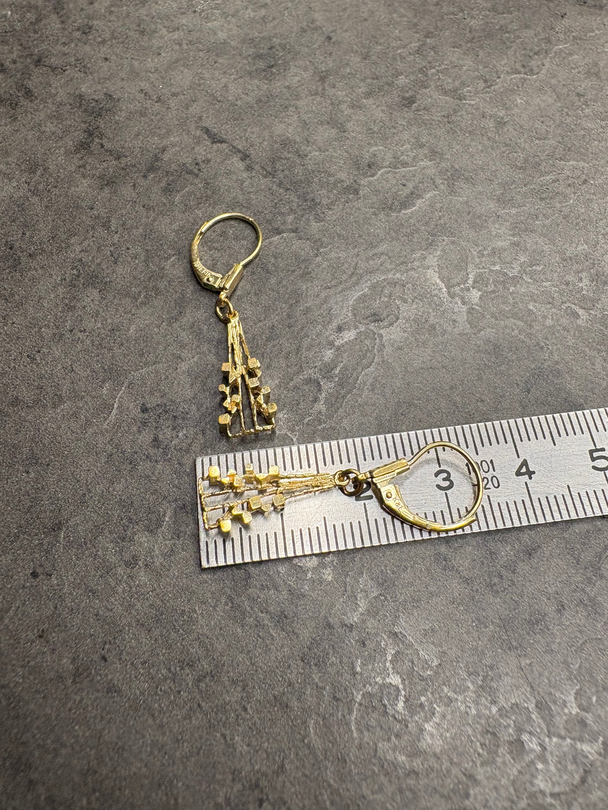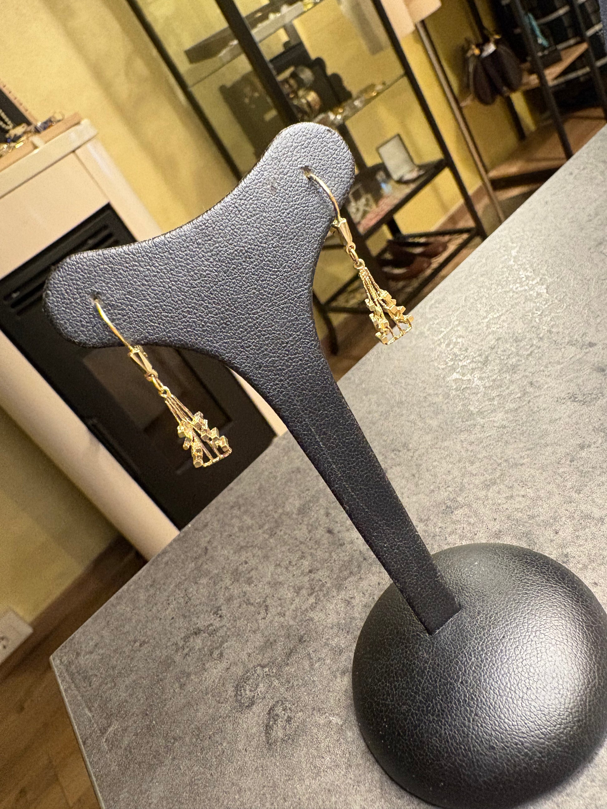 Questi orecchini vintage in Amerikaner presentano un design elegante e leggero. La montatura dorata, sottile e slanciata, si arricchisce di piccoli elementi geometrici che donano movimento e luminosità. La garantisce praticità e sicurezza. Un gioiello raffinato, dallo stile intramontabile, ideale per chi ama gli accessori dal fascino retrò.