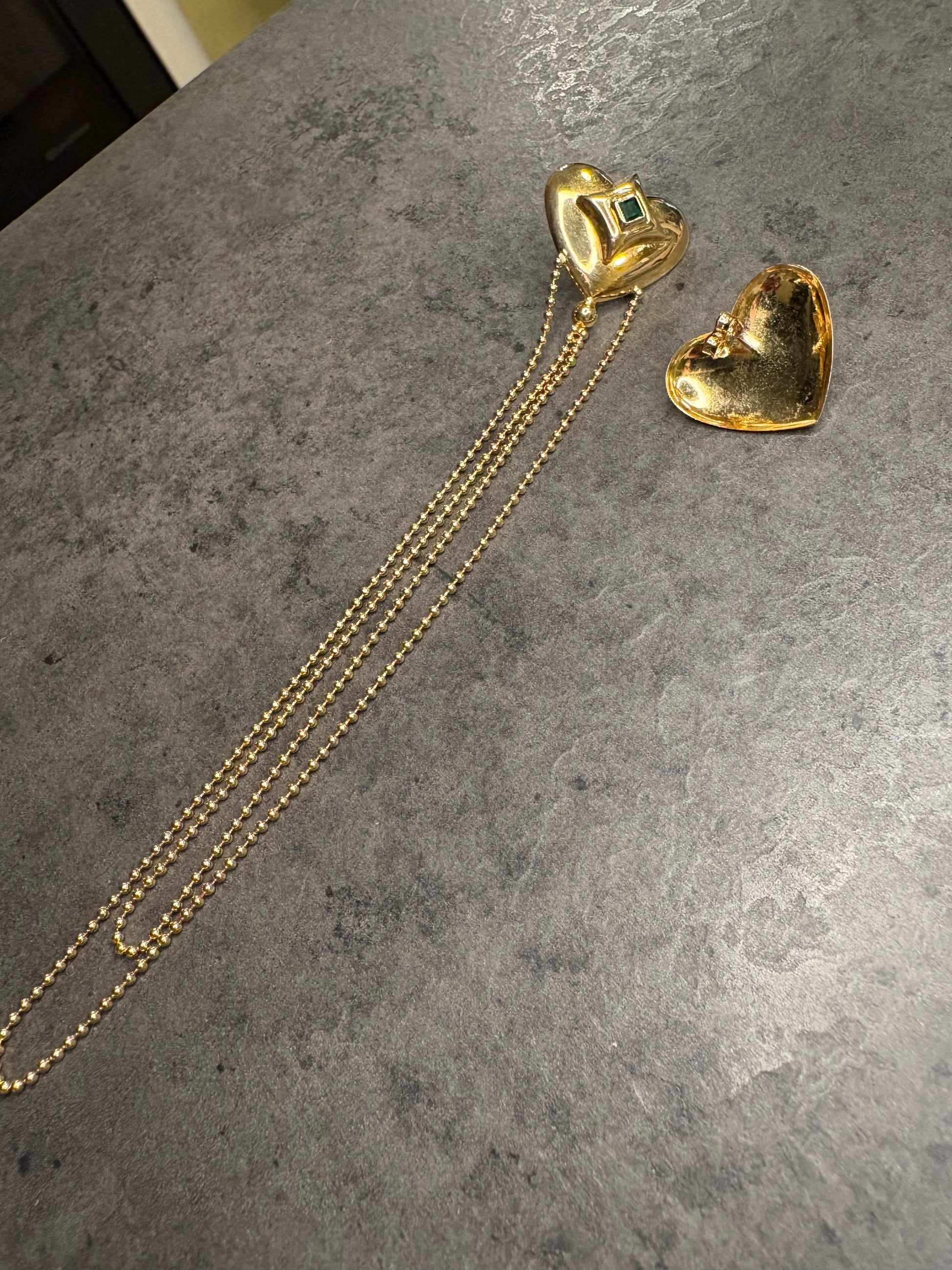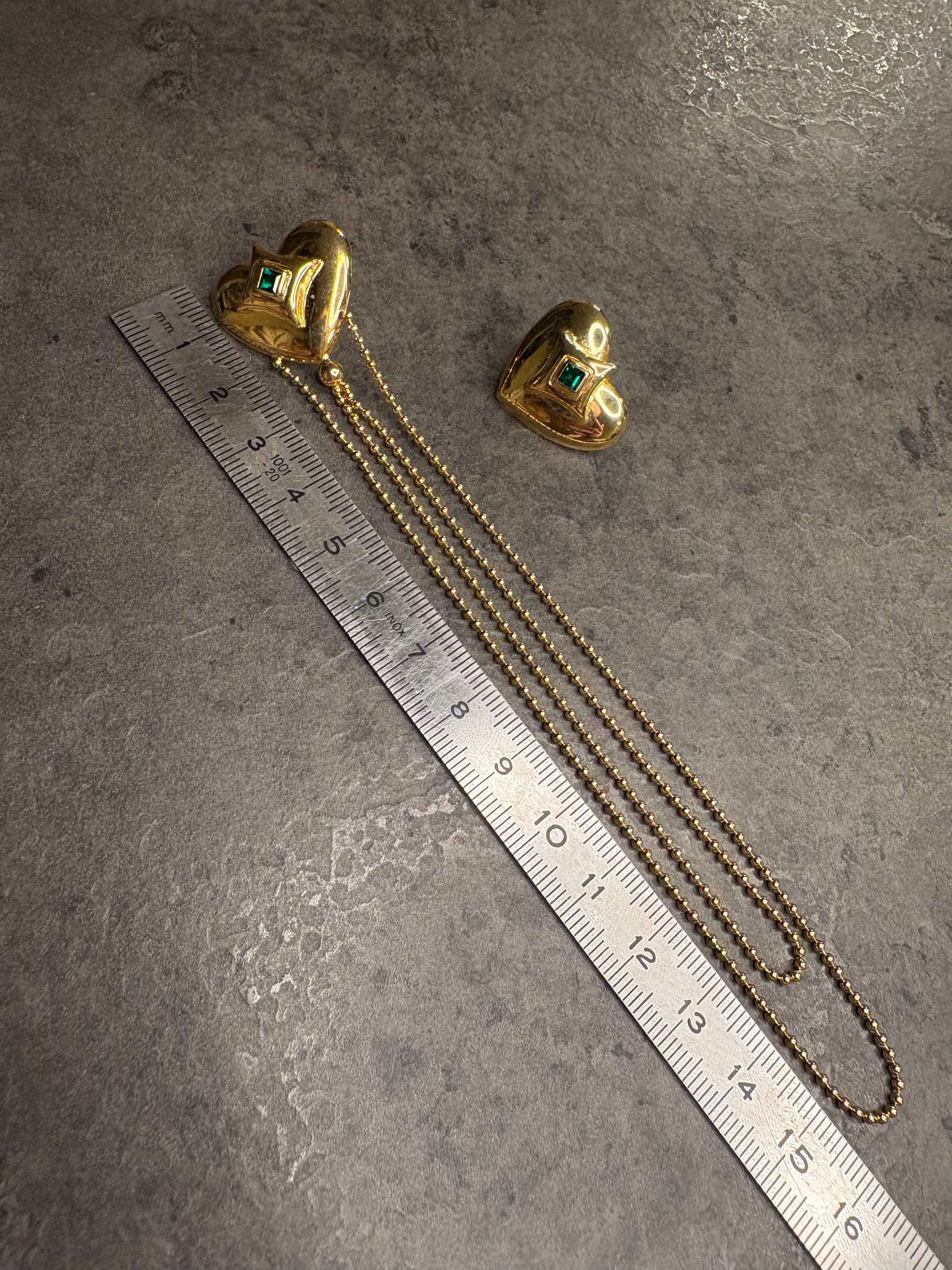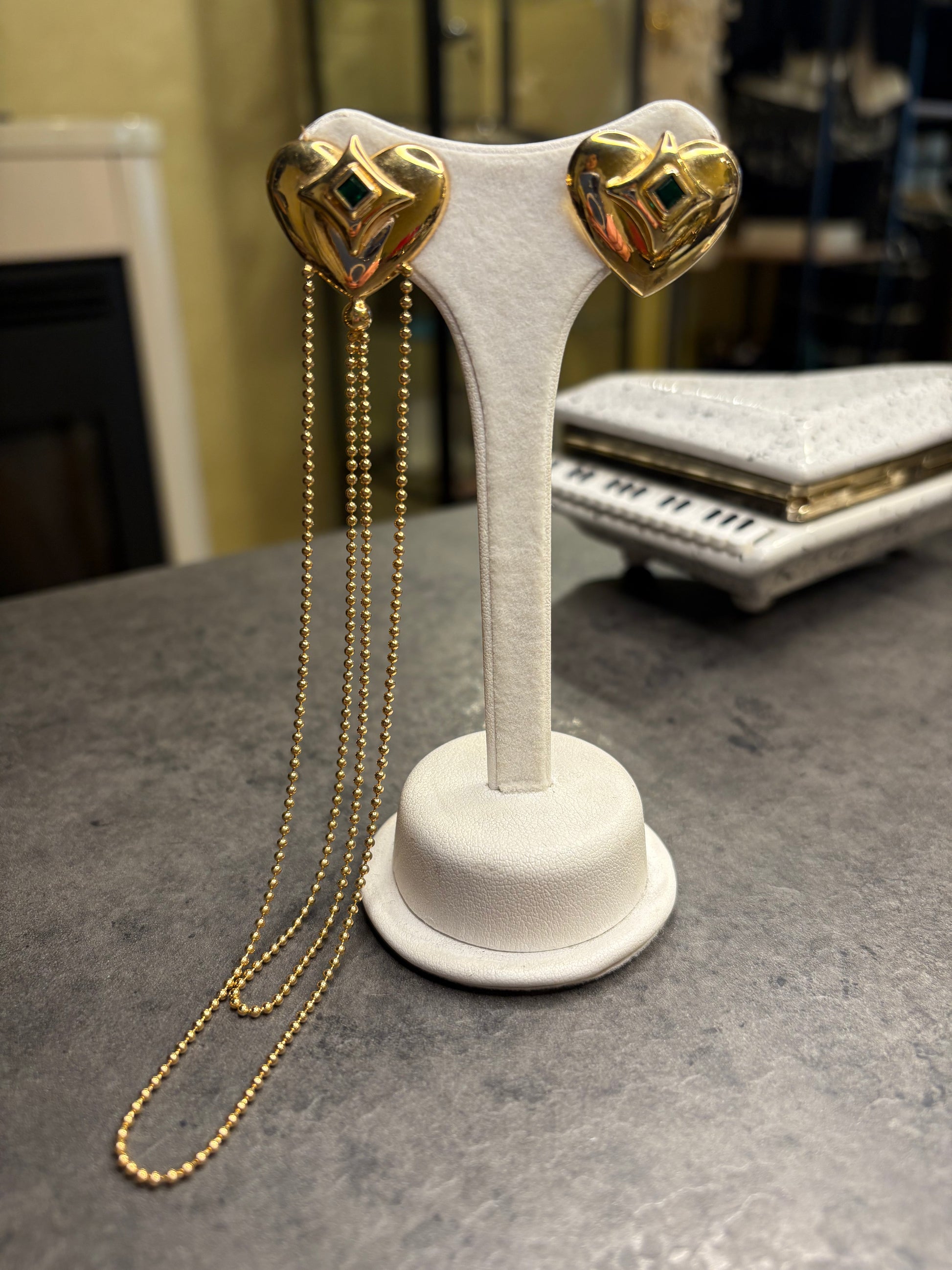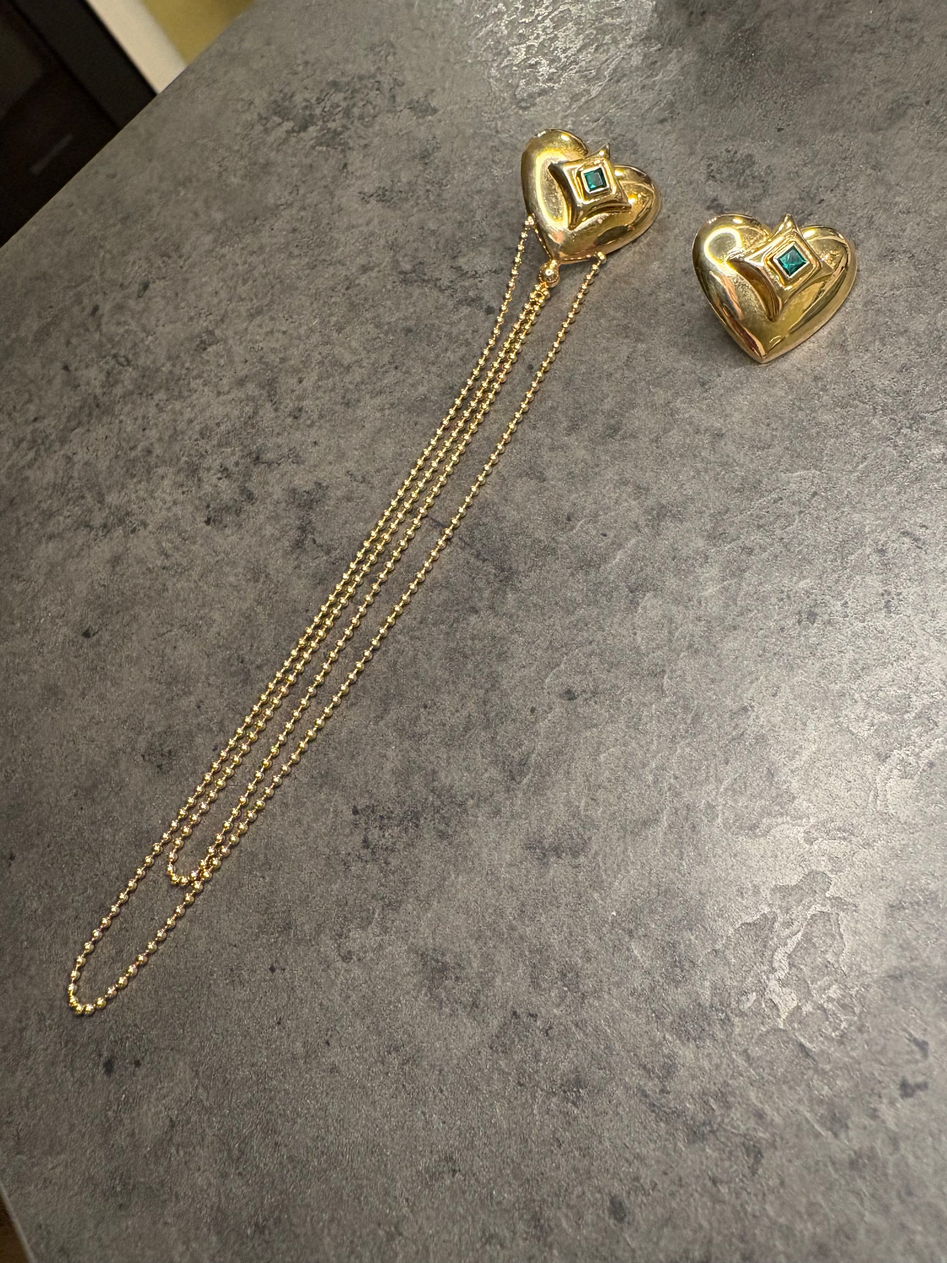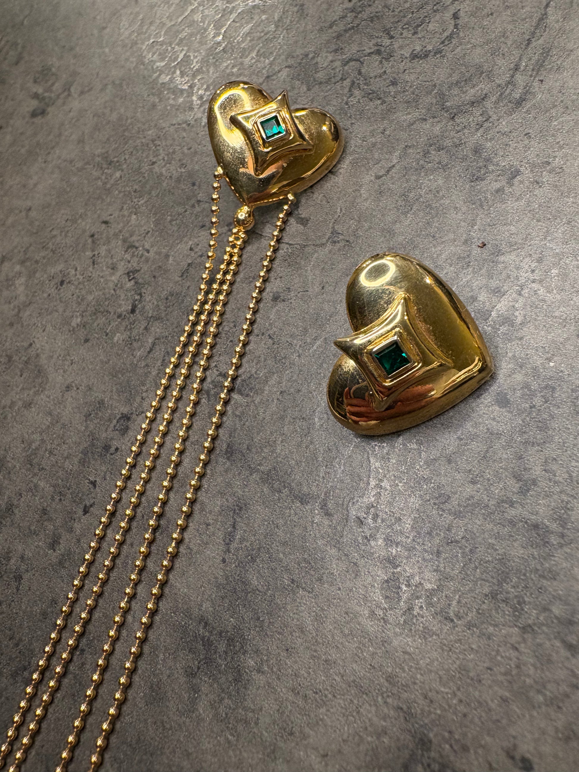 Splendidi orecchini vintage in argento 800 dorato, dal design scultoreo e armonioso. La montatura a cuore bombato accoglie al centro un cristallo color verde smeraldo taglio quadrato, creando un raffinato contrasto di volumi e riflessi.