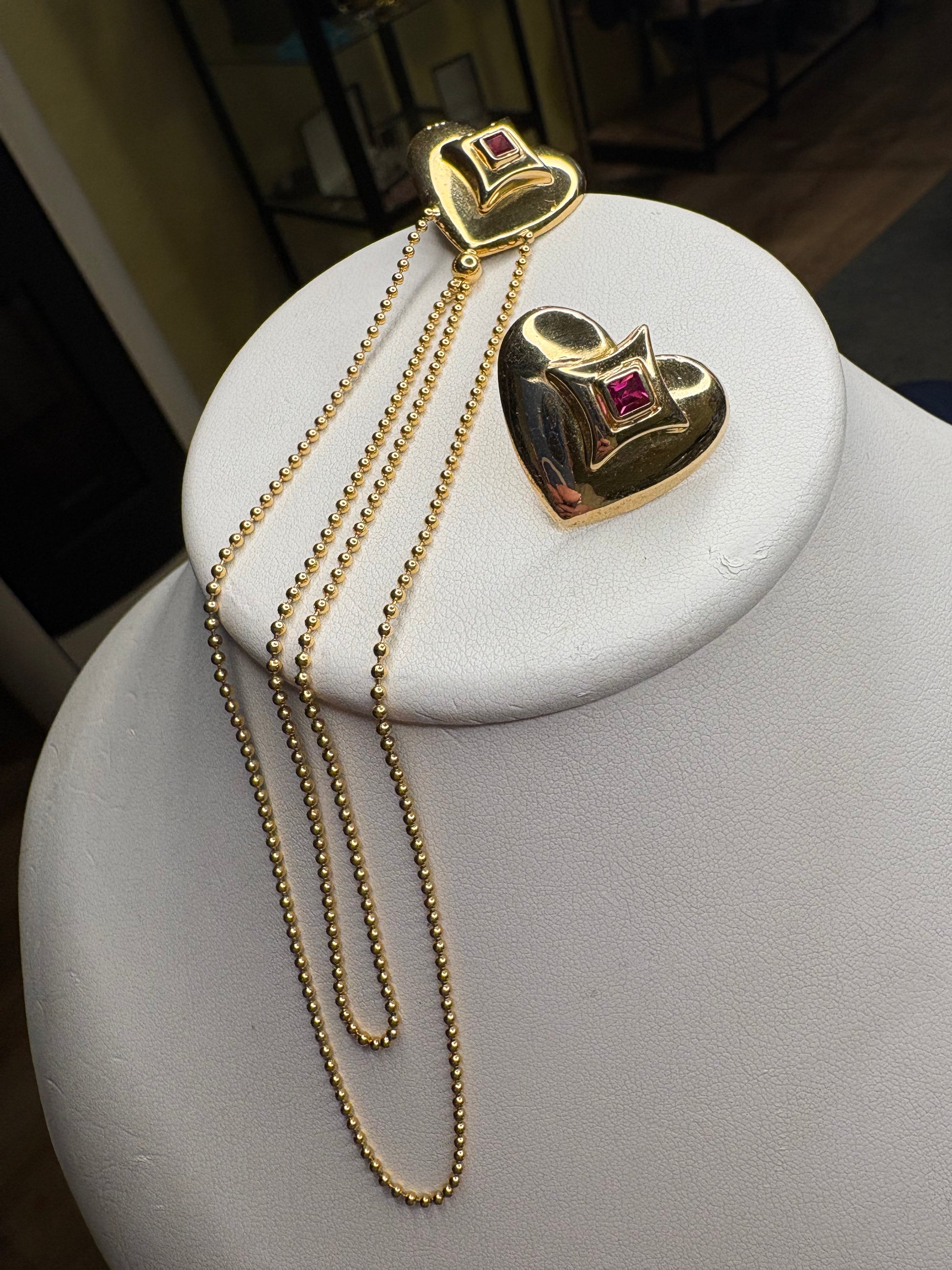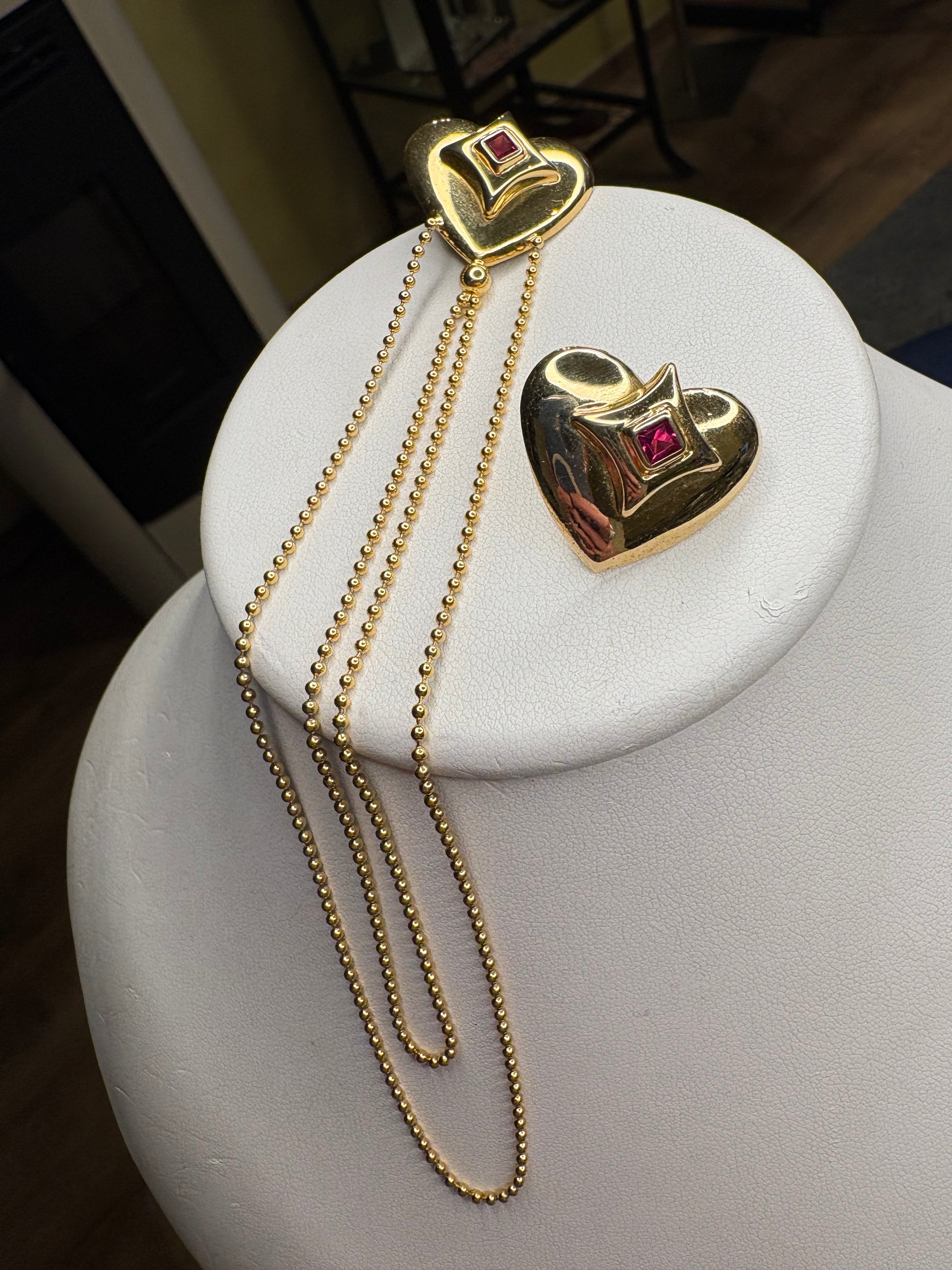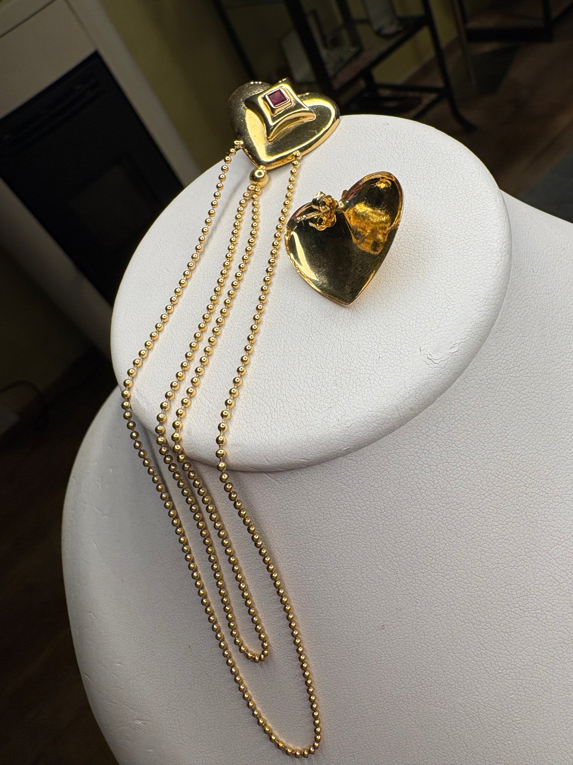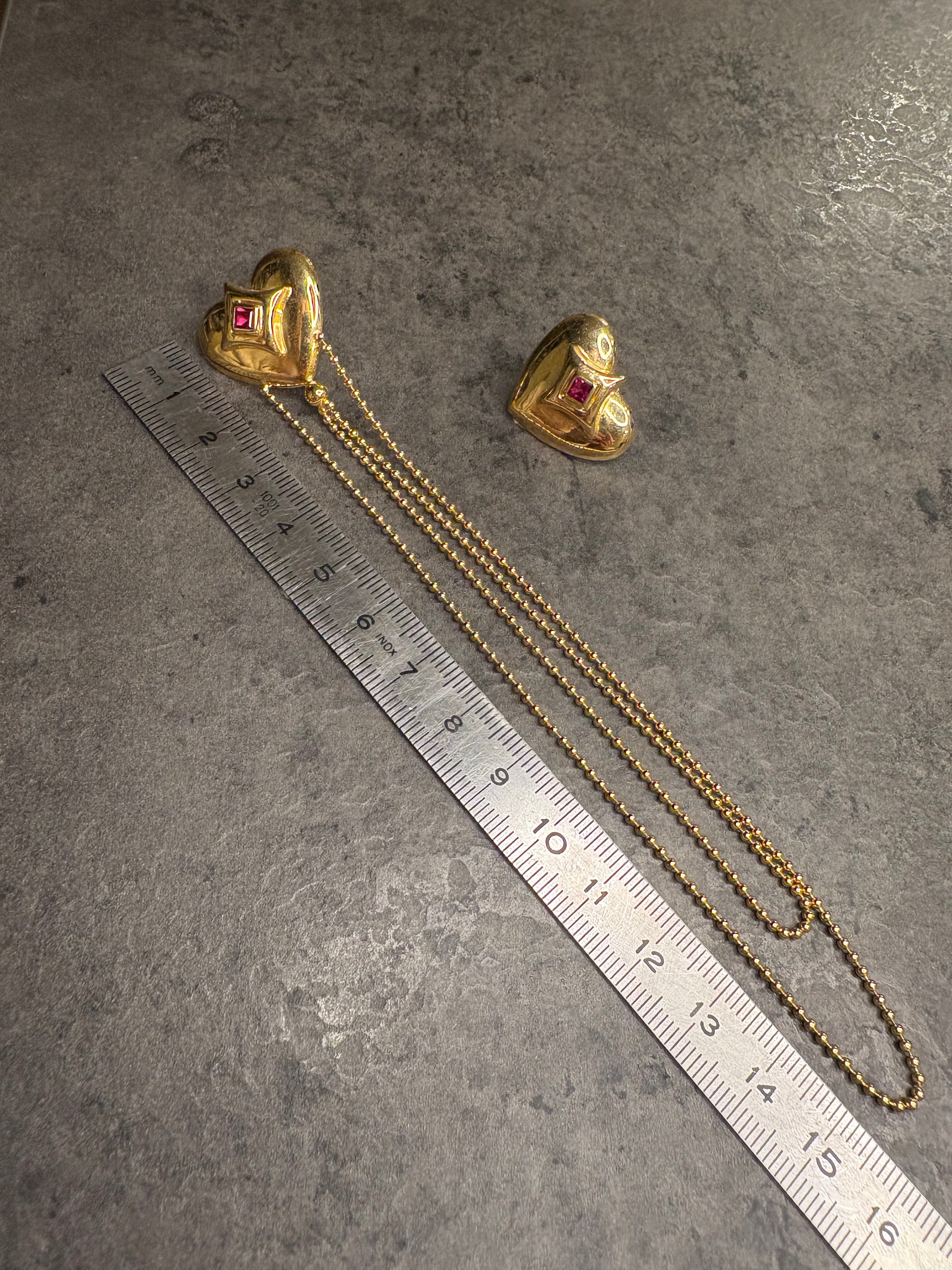 Raffinati orecchini vintage in argento 800 dorato, dalla caratteristica forma a cuore bombato con montatura geometrica centrale che incornicia un brillante cristallo color rosso rubino taglio quadrato.