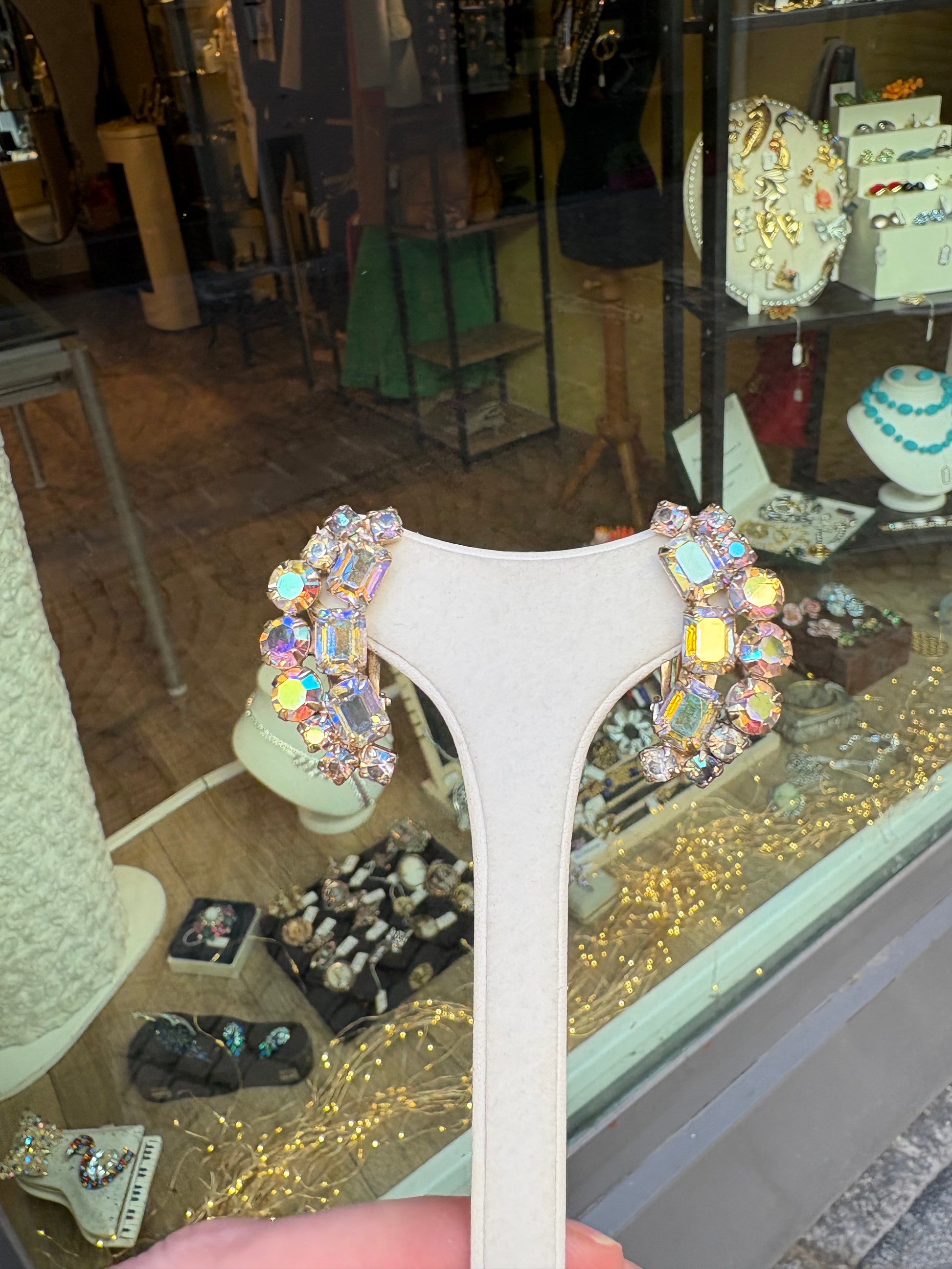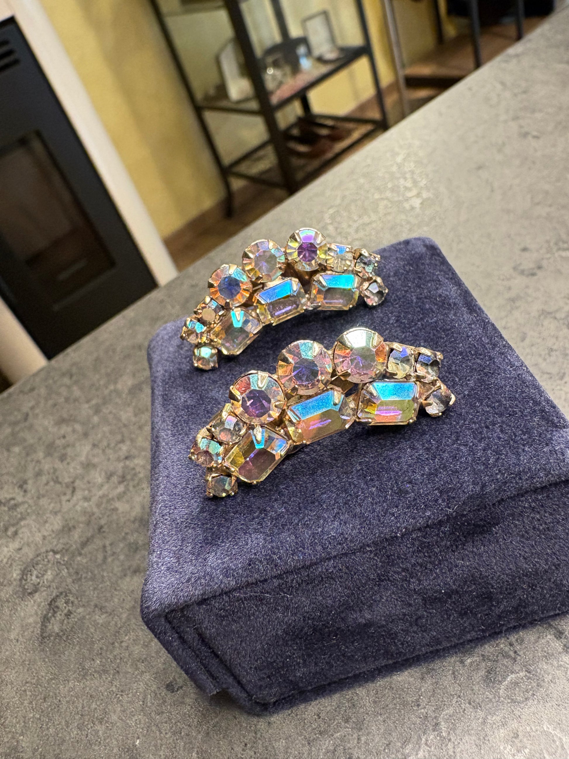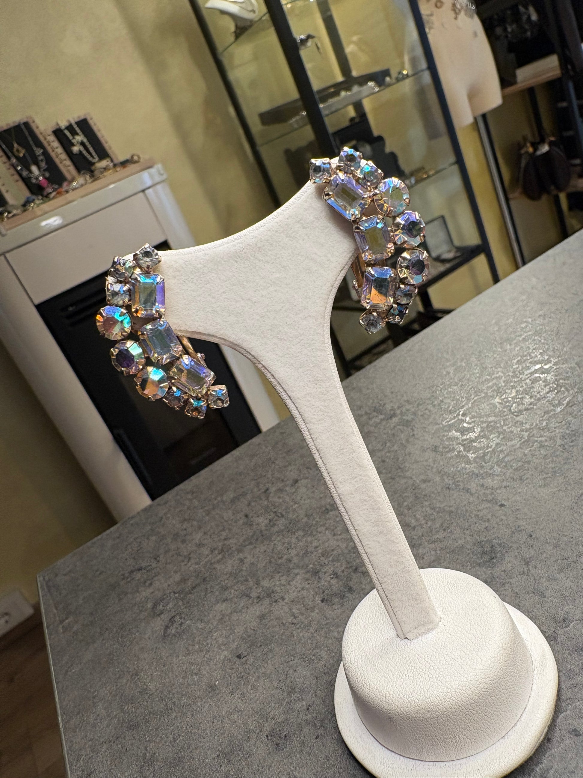La montatura è realizzata in metallo dorato, con lavorazione robusta e struttura arcuata che segue delicatamente il profilo del lobo. La parte frontale è interamente decorata da una ricca composizione di cristalli con effetto Aurora Boreale, una particolare finitura introdotta negli anni ’50 che dona riflessi cangianti iridescenti, passando dal blu al rosa, dal verde all’oro.