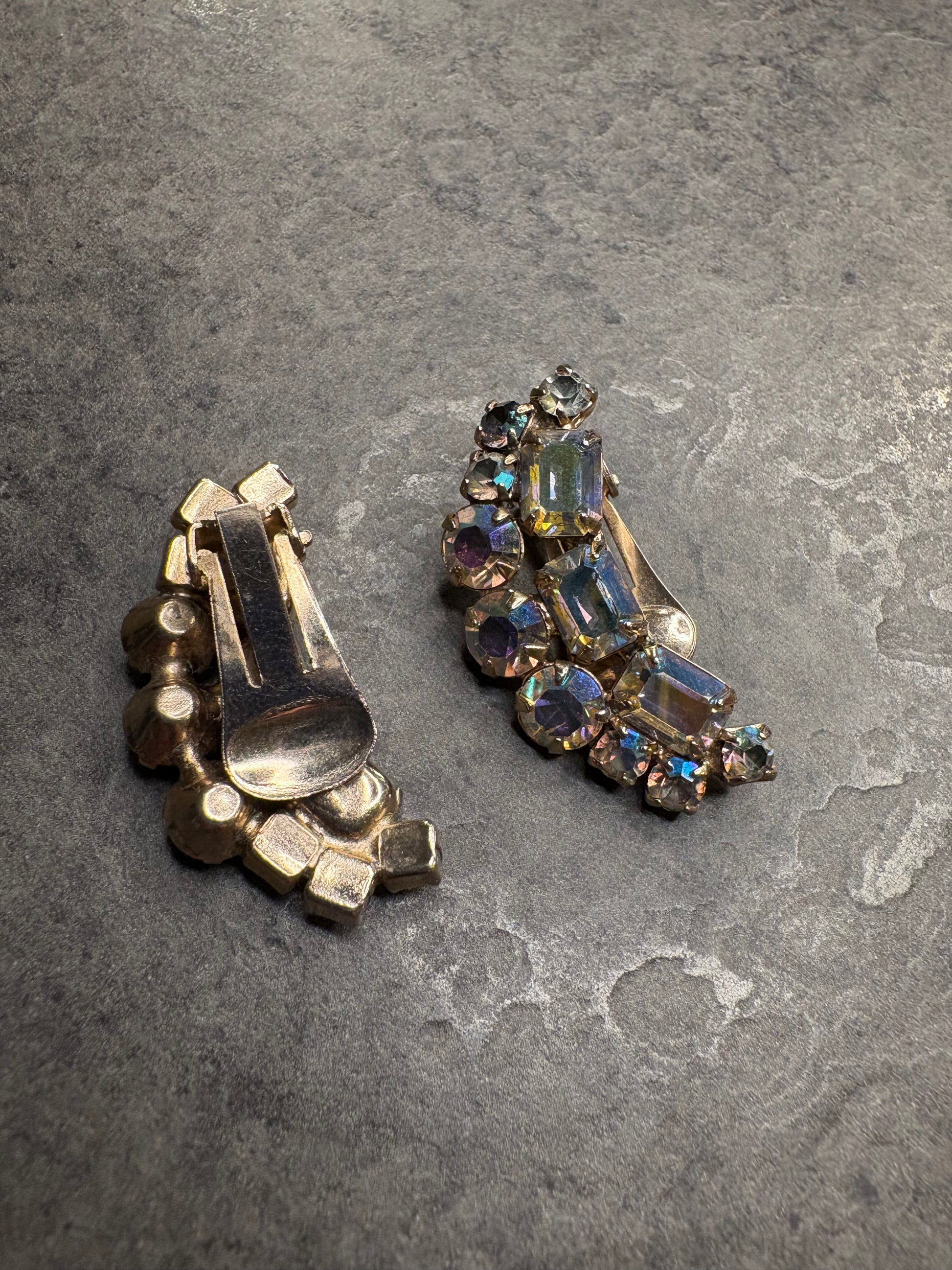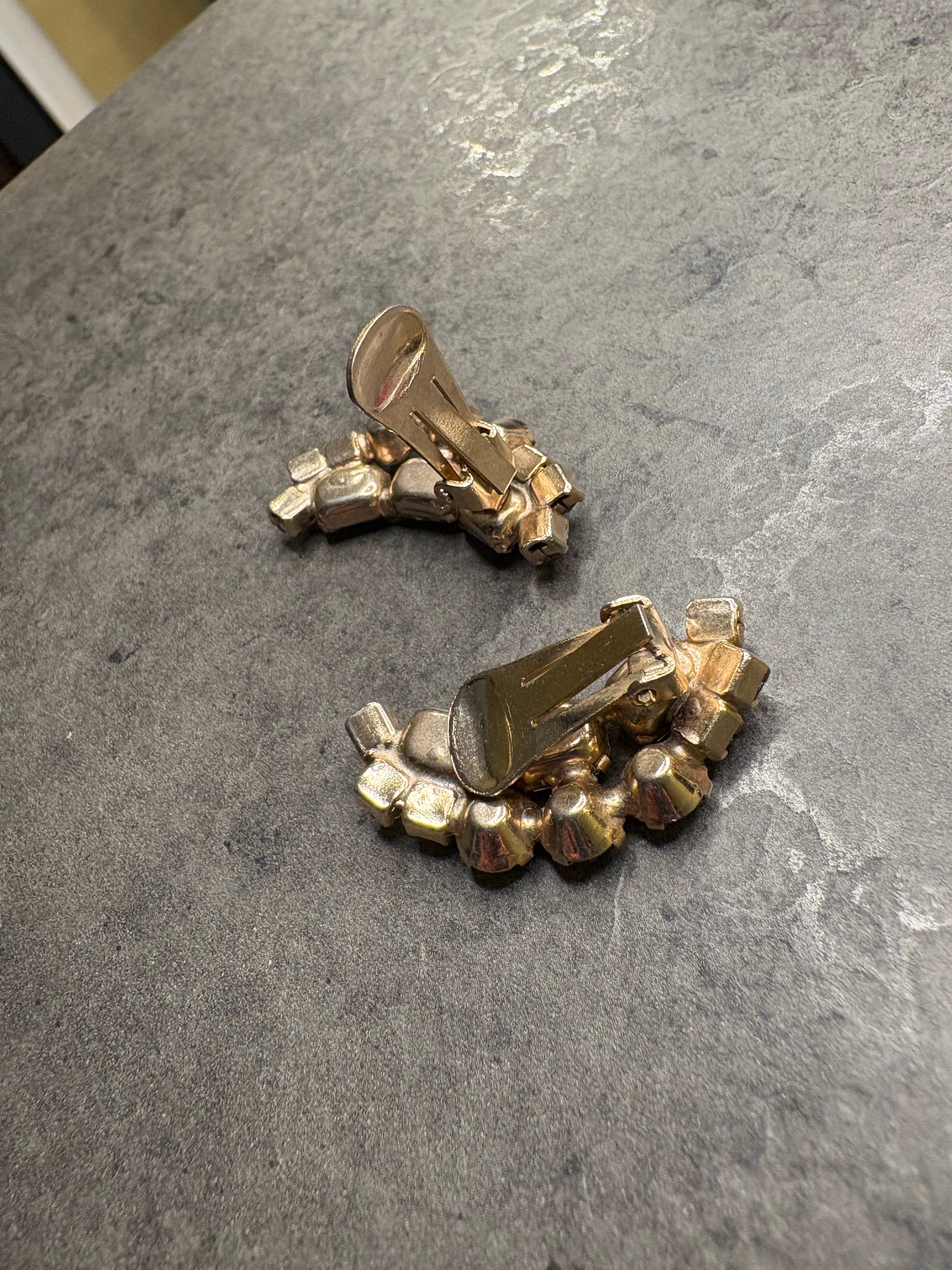 Questi incantevoli orecchini a clip vintage sono un autentico esempio di gioielleria costume anni ’50-’60, caratterizzati da un’eleganza scenografica.