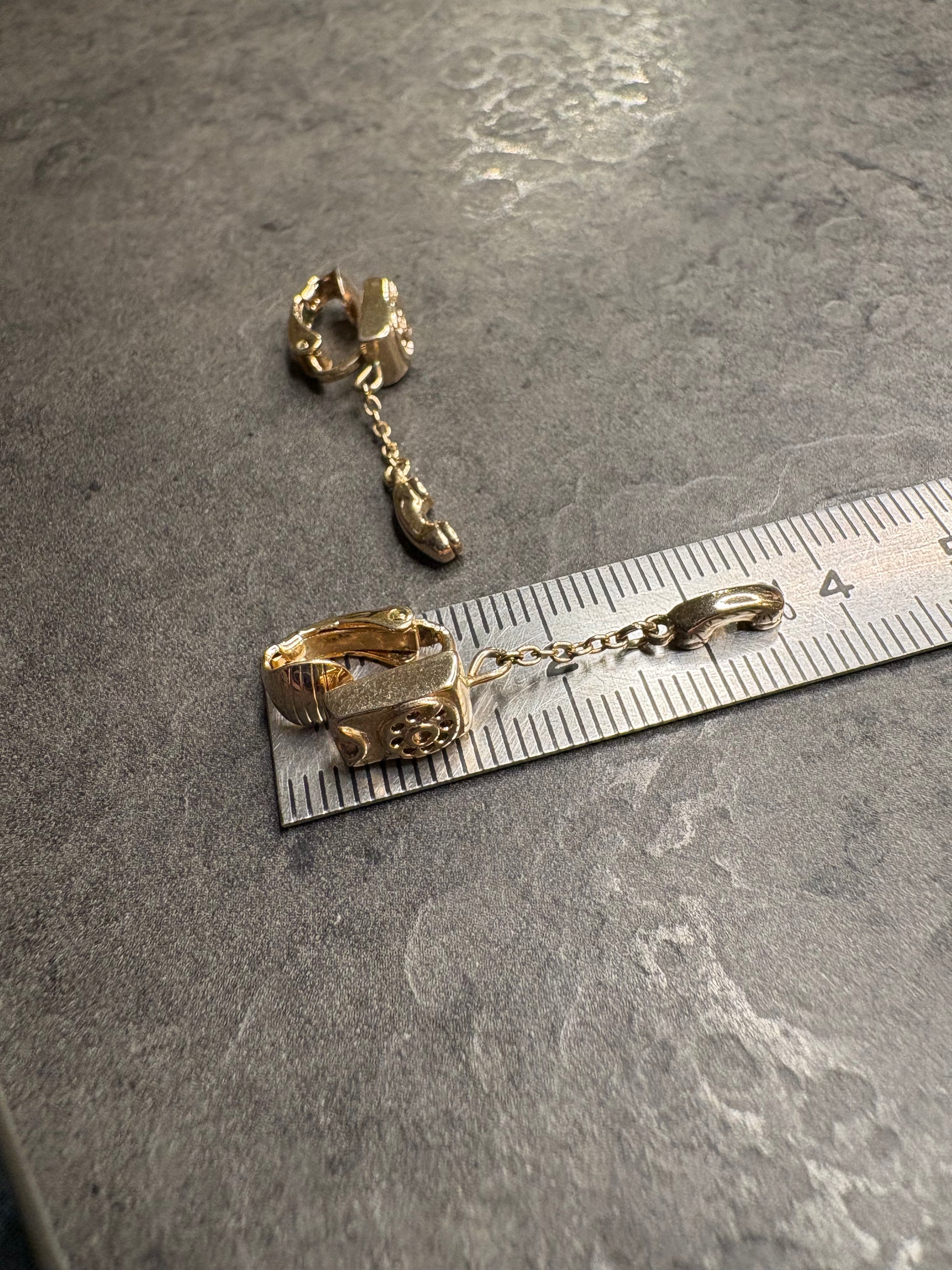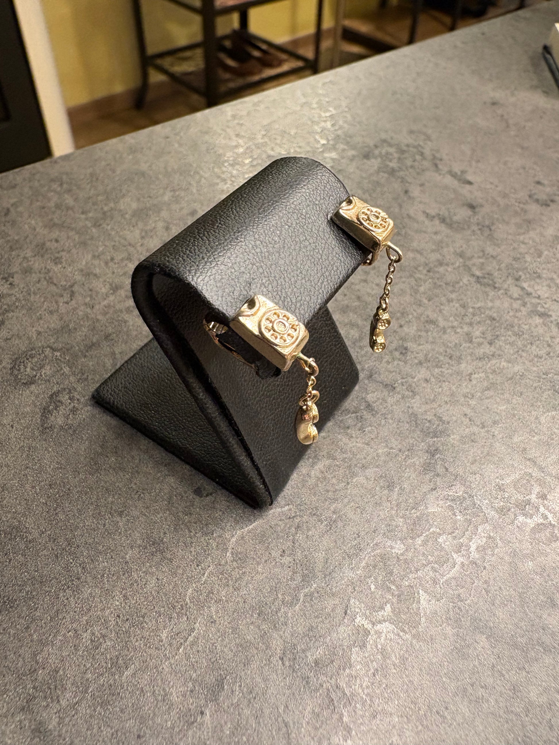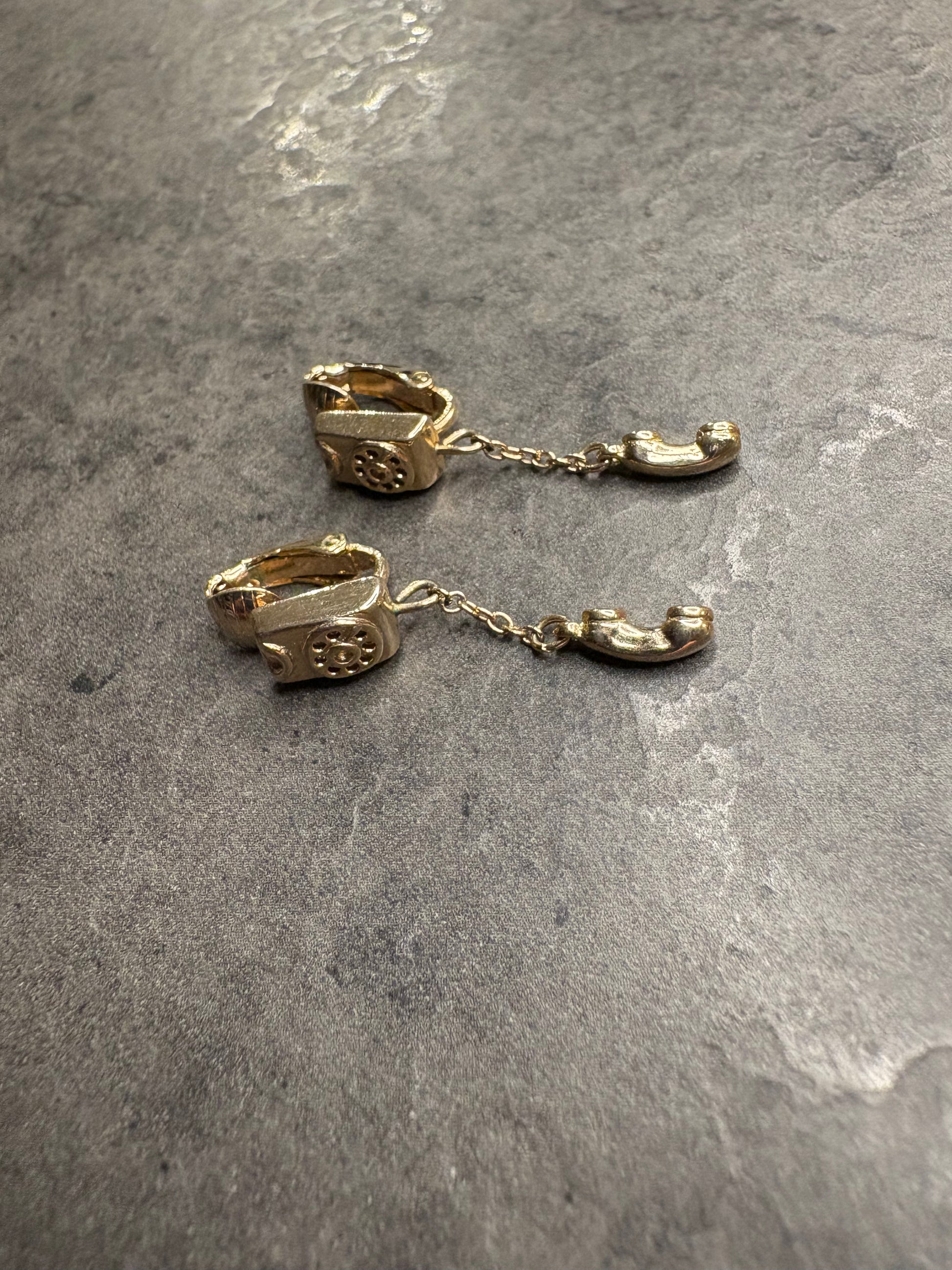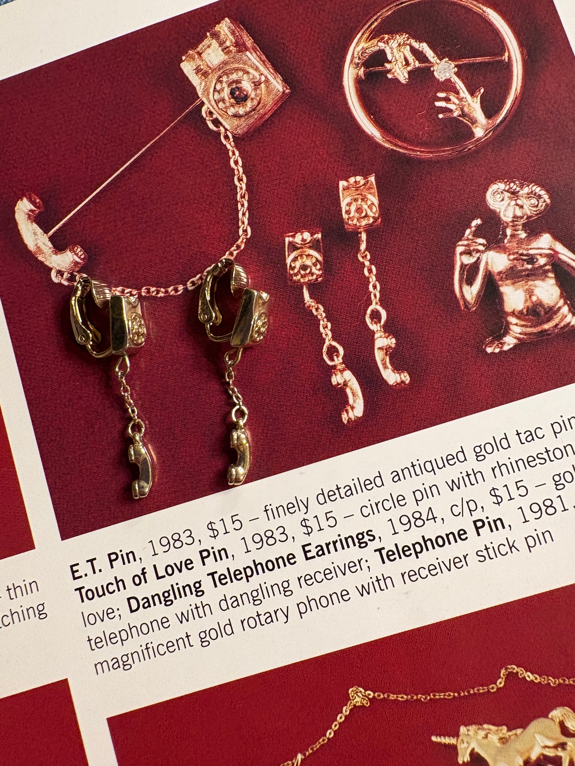 Questi orecchini a clip Avon del 1984, collezione “Dangling Telephone”, sono un perfetto esempio di bigiotteria novelty anni ’80, ironica e curata nei dettagli. Realizzati in metallo dorato anticato, riproducono in miniatura il classico telefono a disco con la cornetta pendente agganciata a una sottile catenella, che dona movimento e un tocco giocoso quando indossati. Il disco combinatore è inciso con grande precisione, mentre la cornetta, oscillando leggermente, rende il design vivace e originale. Avon in quegli anni affiancava alla cosmetica collezioni di gioielli moda particolarmente apprezzate, e questi orecchini facevano parte di un set tematico insieme a spille e pendenti. Oggi sono ricercati dai collezionisti di costume jewelry per il loro stile divertente e pop, legato all’immaginario culturale degli anni ’80. In ottimo stato di conservazione mantengono intatto il loro fascino vintage e il valore come pezzo iconico della produzione Avon di quel periodo.