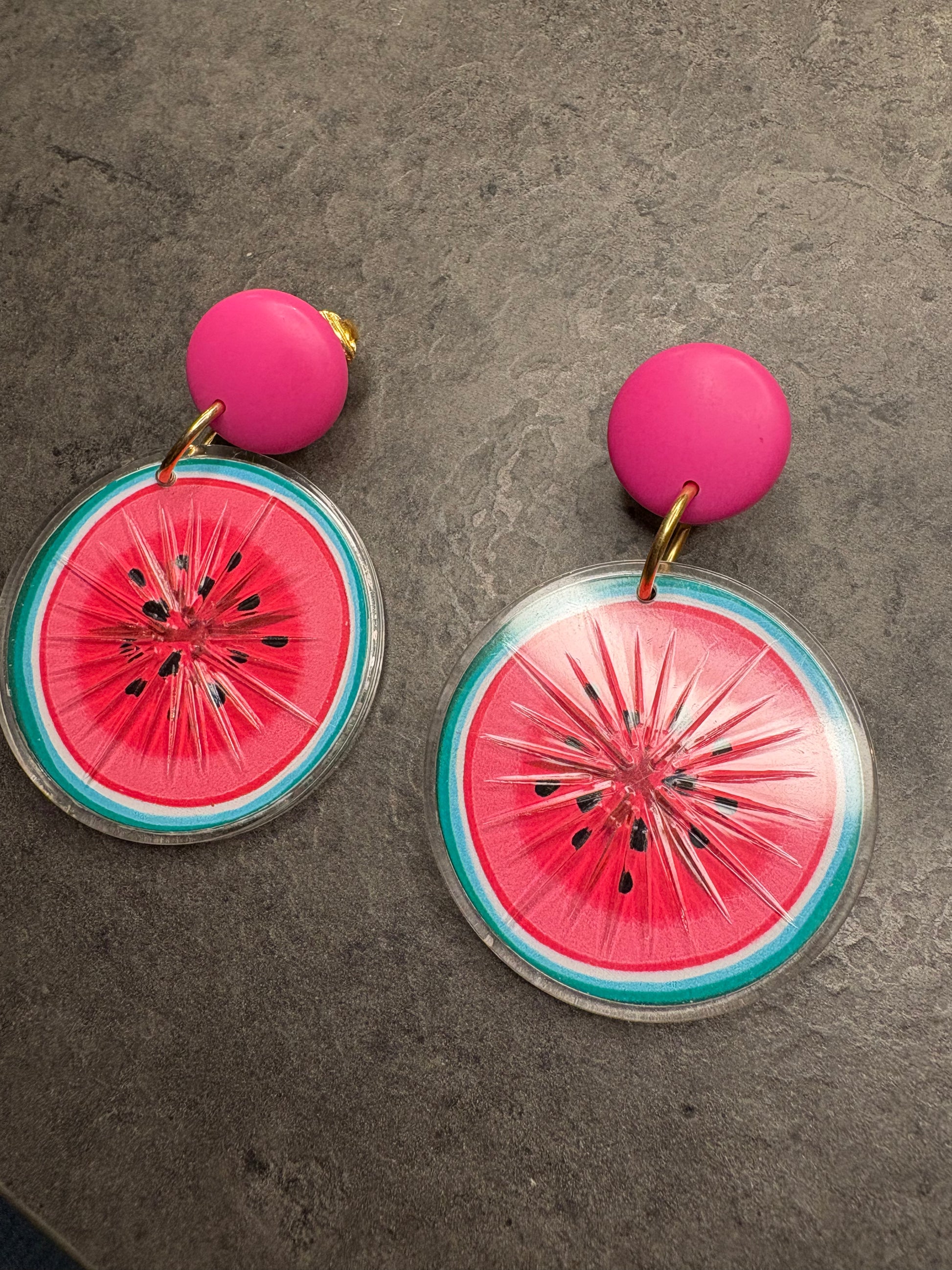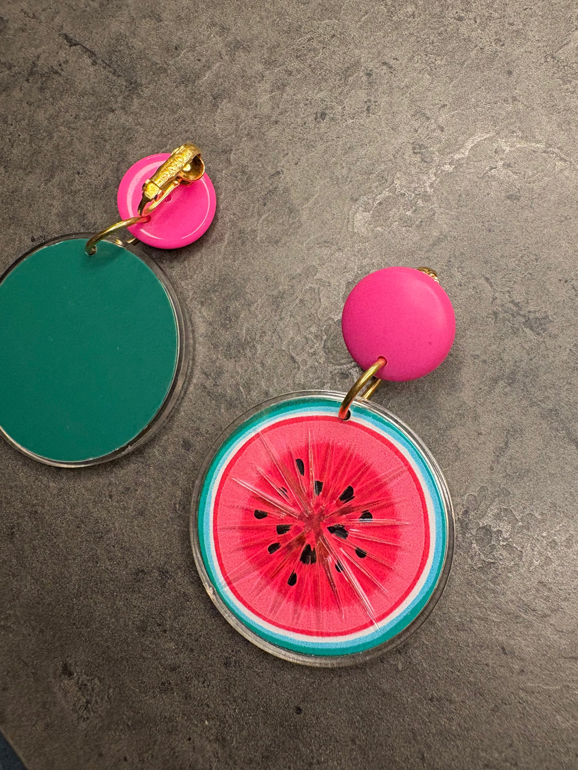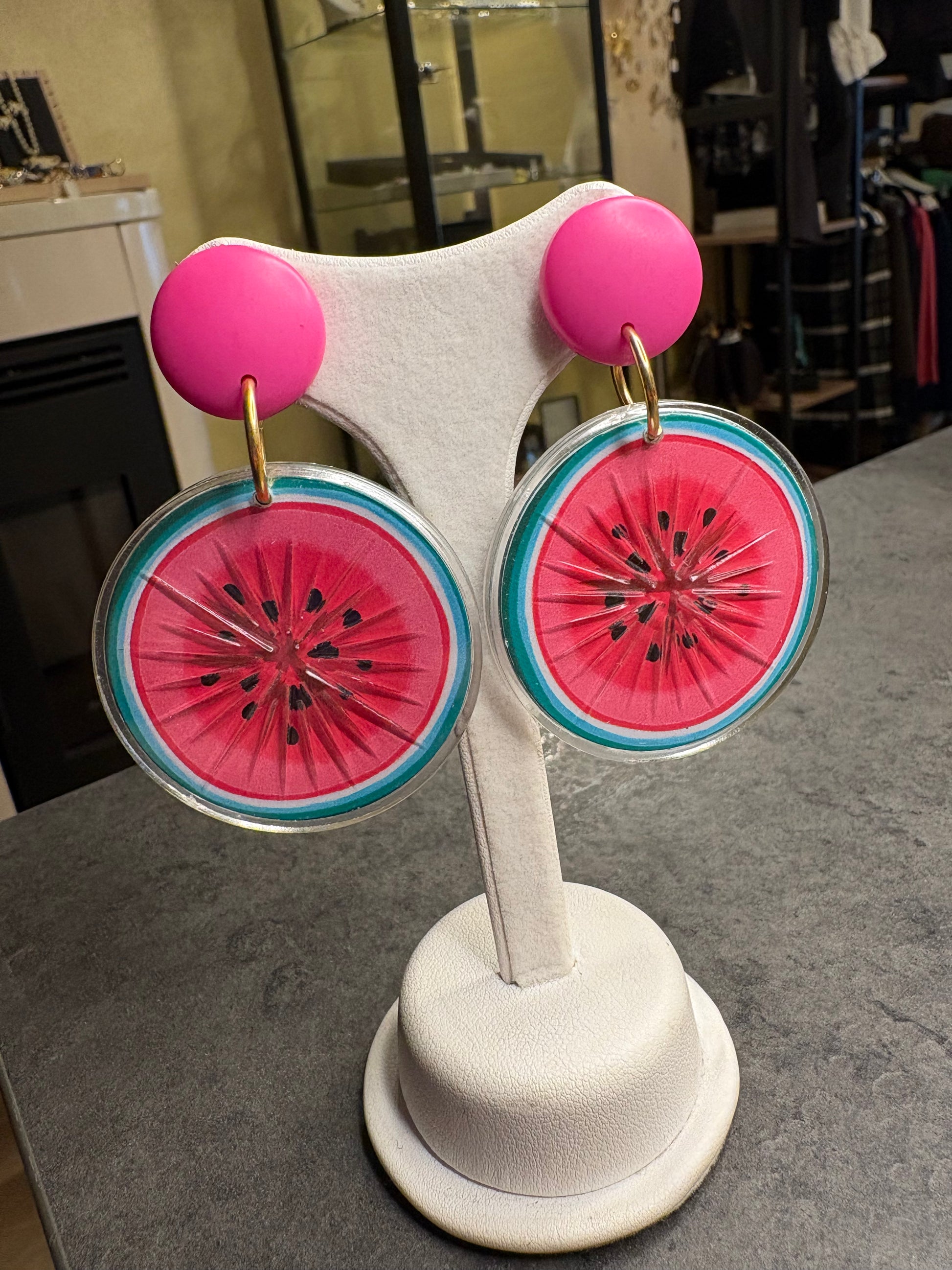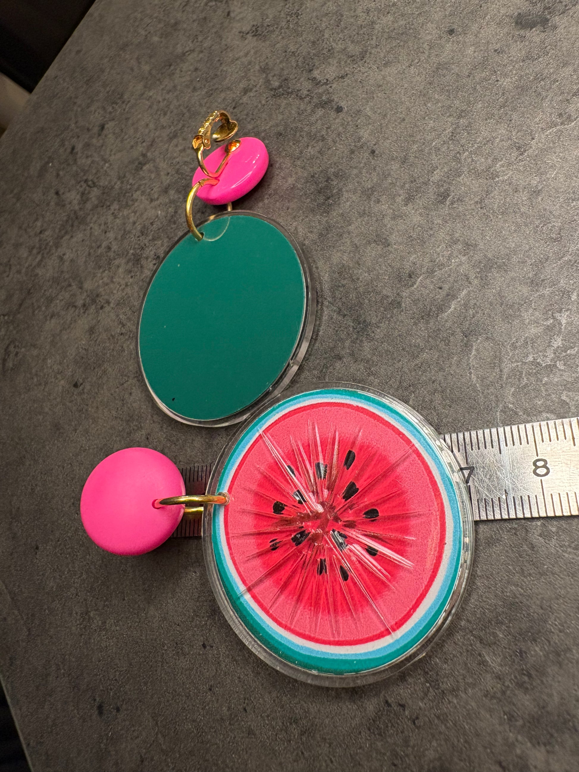 Il design è immediatamente riconoscibile: grandi pendenti rotondi che riproducono una fetta di anguria con i suoi vivaci colori rosso-rosa, semi neri stilizzati e bordo verde-acqua che richiama la buccia. La parte superiore è formata da un bottone rotondo color fucsia acceso, da cui scende il pendente tramite un piccolo anellino dorato. Gli elementi dorati sono in metallo leggero, mentre la struttura principale è in plastica stampata, scelta che garantisce un effetto vistoso ma allo stesso tempo molto leggero e comodo da indossare.