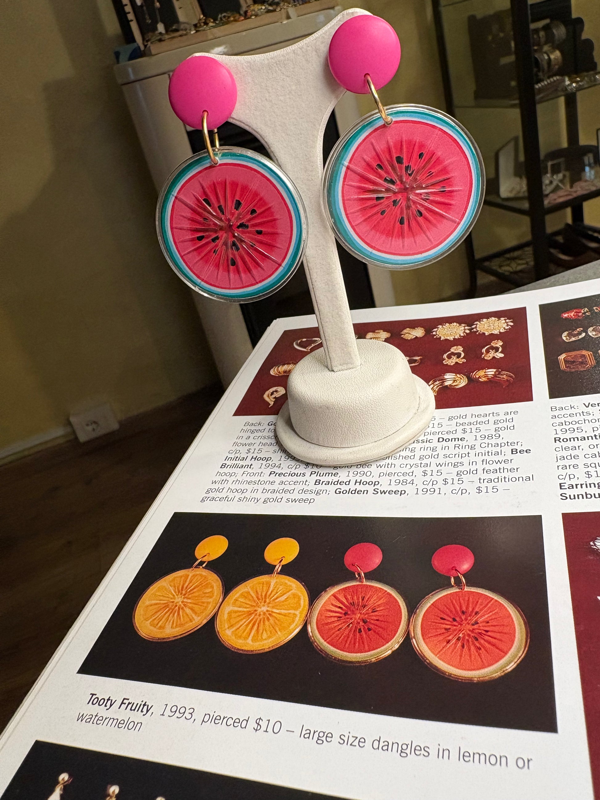 Questi orecchini a clip Avon, realizzati nel 1993 e chiamati “Tooty Fruity”, sono un delizioso esempio di bigiotteria giocosa e pop degli anni ’90.