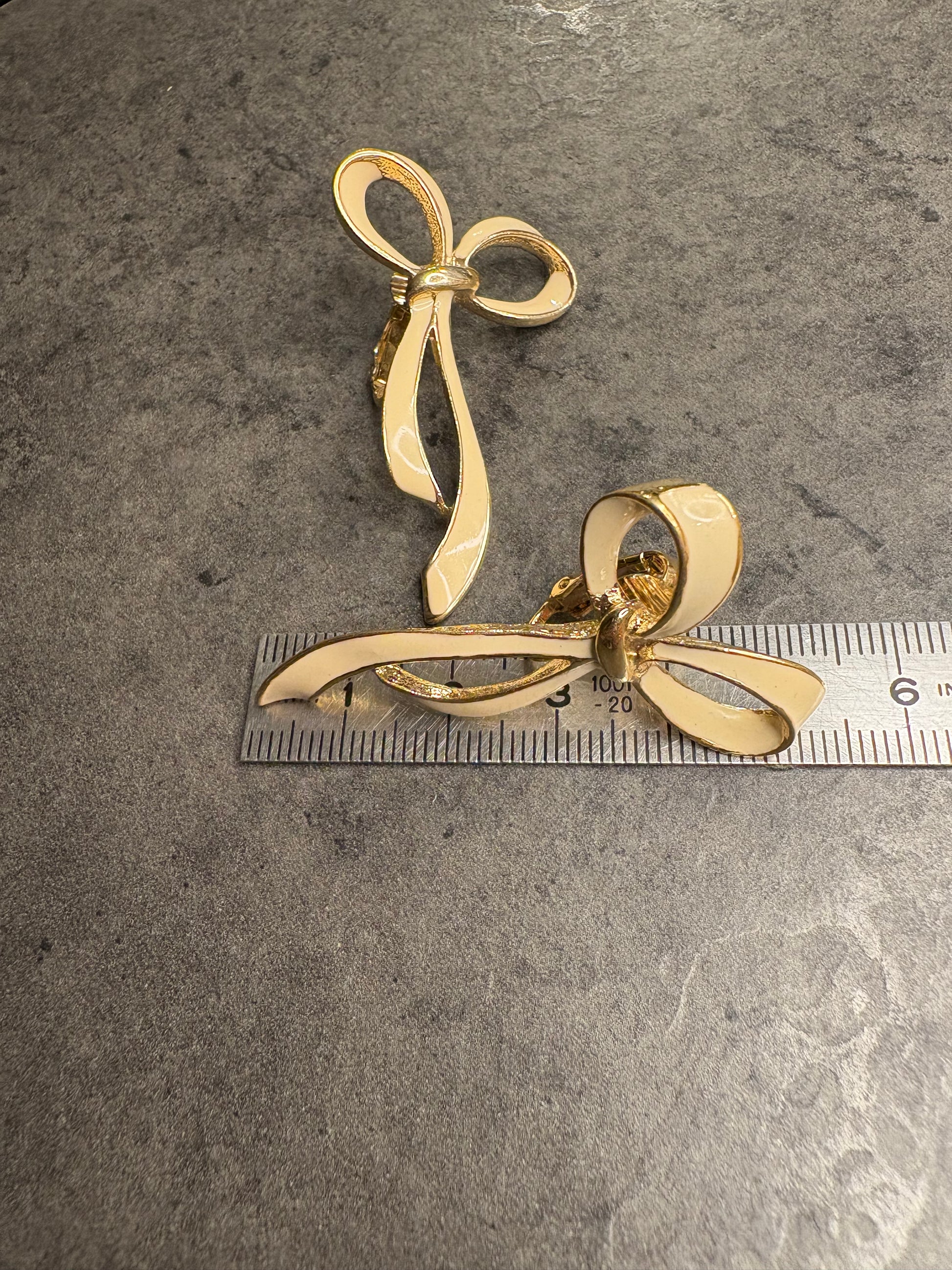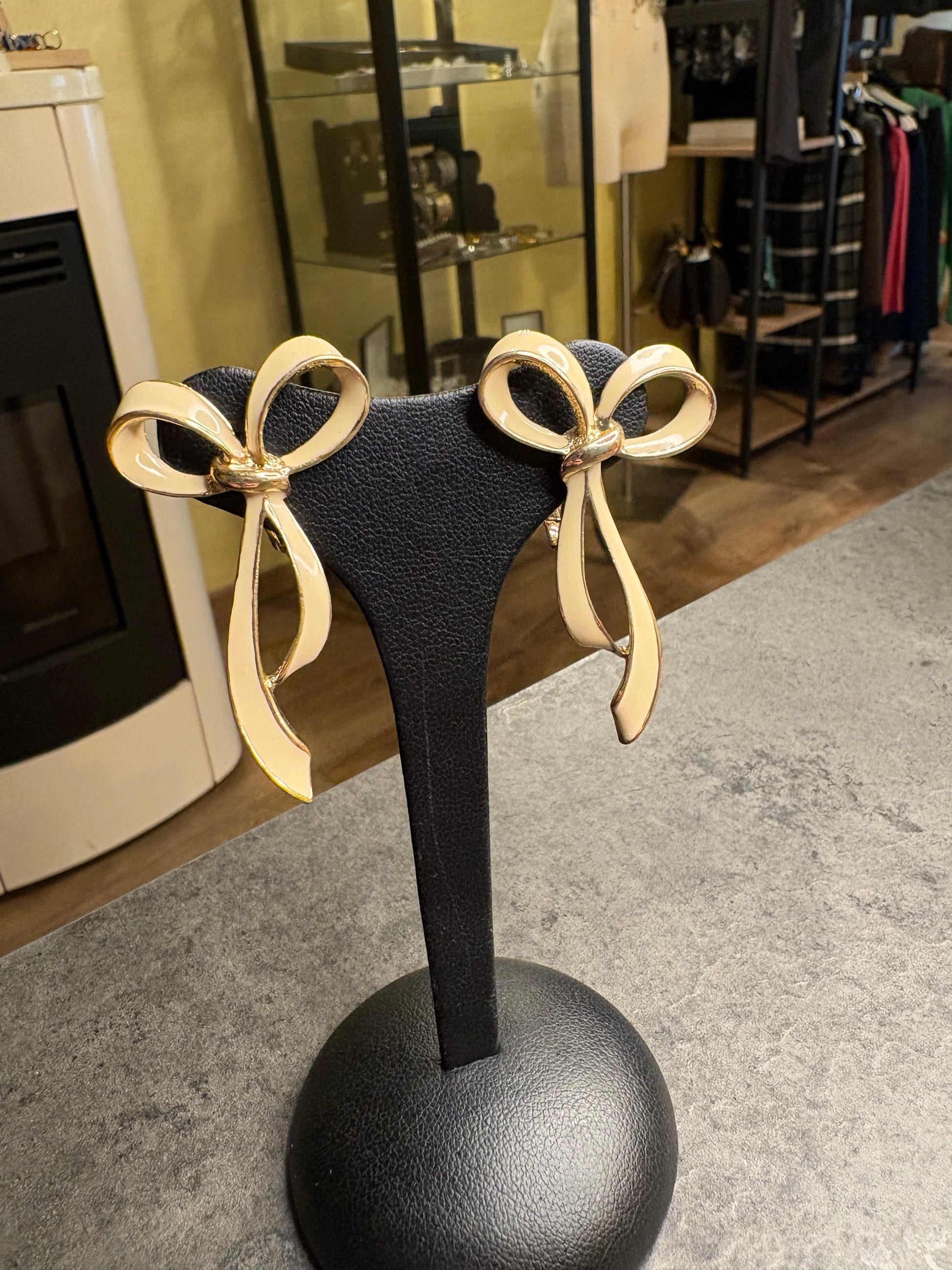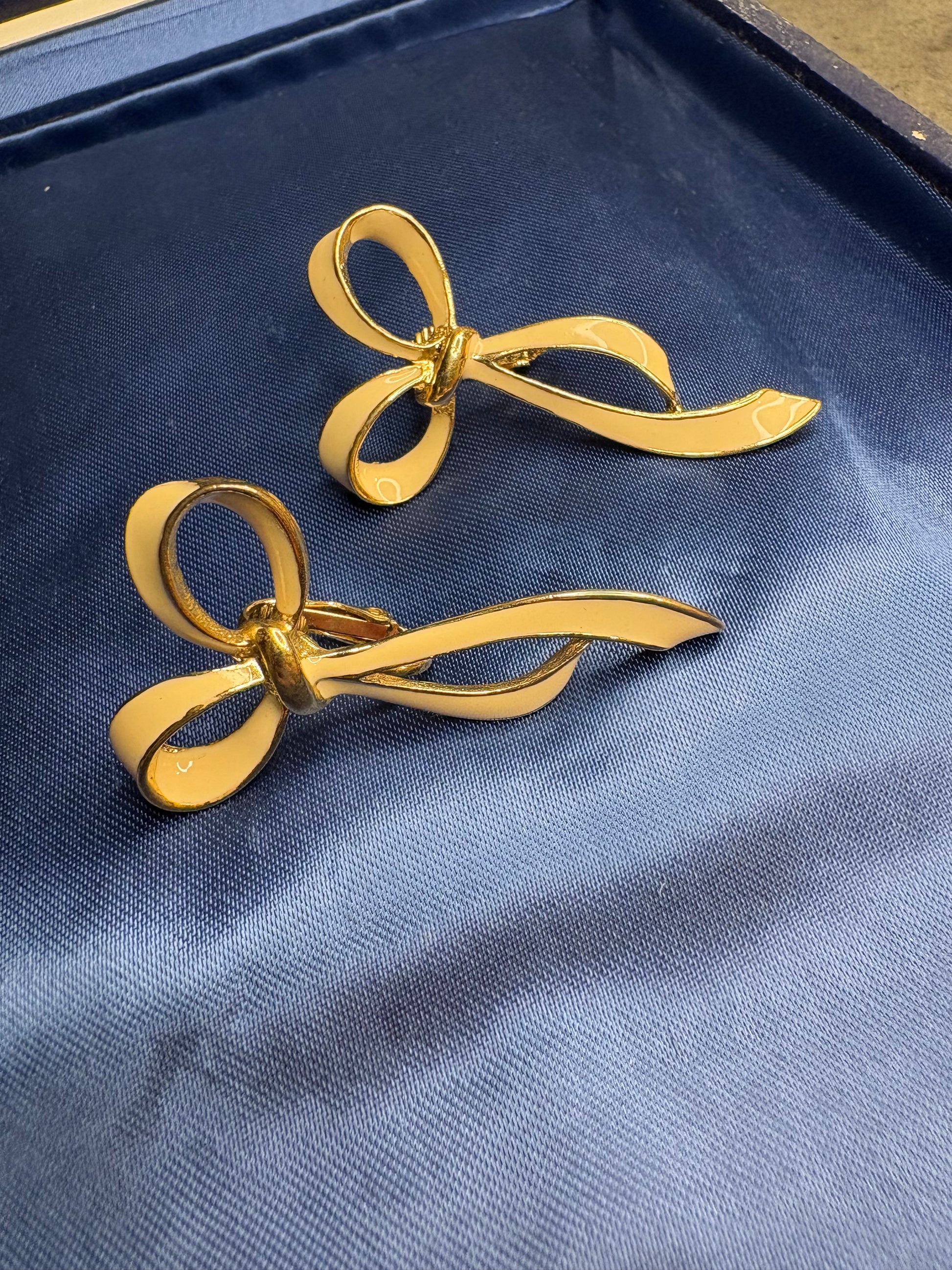 Il design riproduce due nastri annodati a fiocco, simbolo di grazia e delicatezza, resi moderni e stilizzati nelle linee allungate. La montatura è in metallo dorato lucido, mentre la superficie frontale è impreziosita da uno smalto color avorio, applicato con grande cura per ottenere un effetto uniforme, lucente e molto chic. Questo contrasto tra il calore dell’oro e la morbida tonalità avorio dona un’eleganza sobria ma allo stesso tempo molto sofisticata.