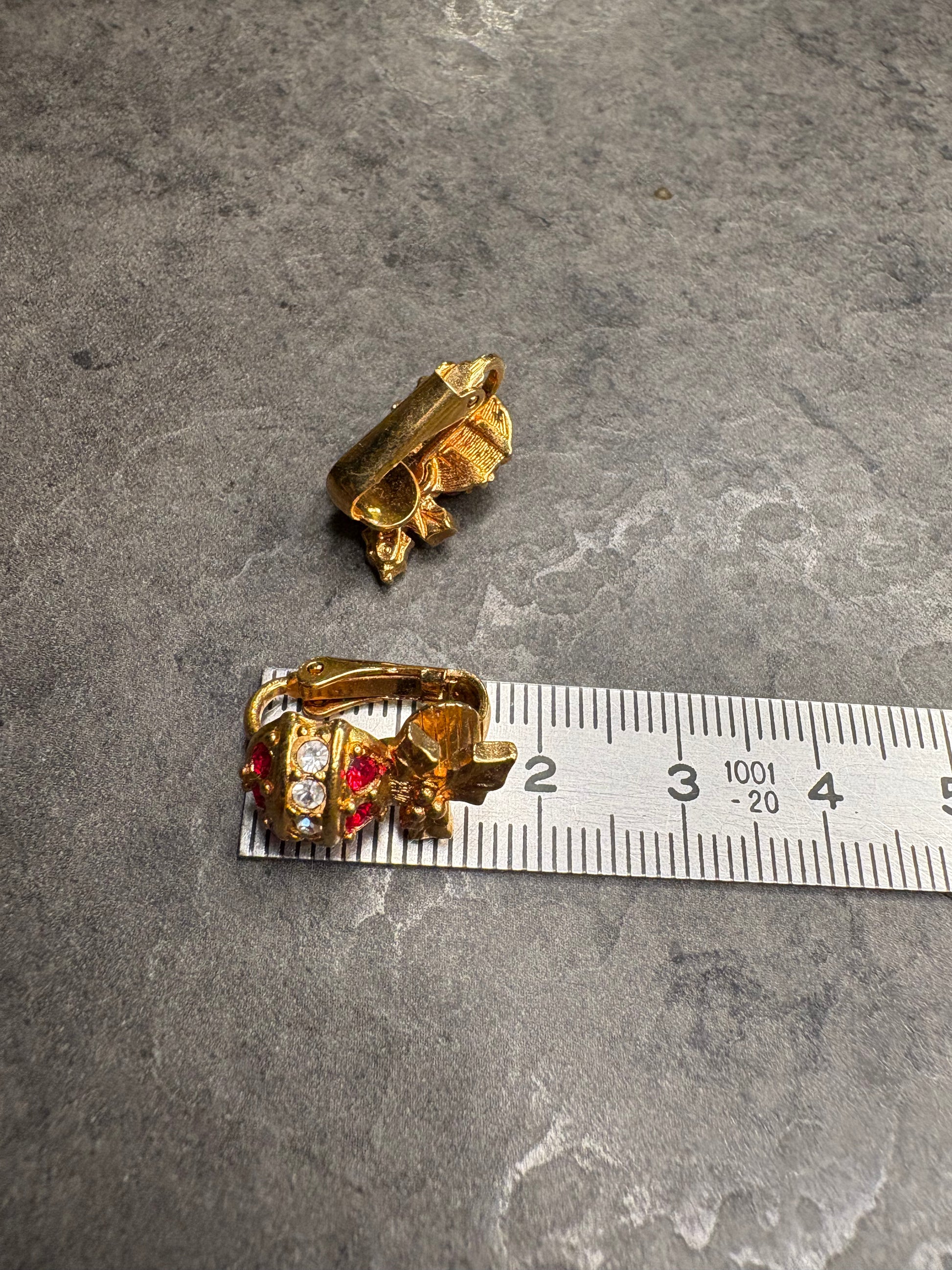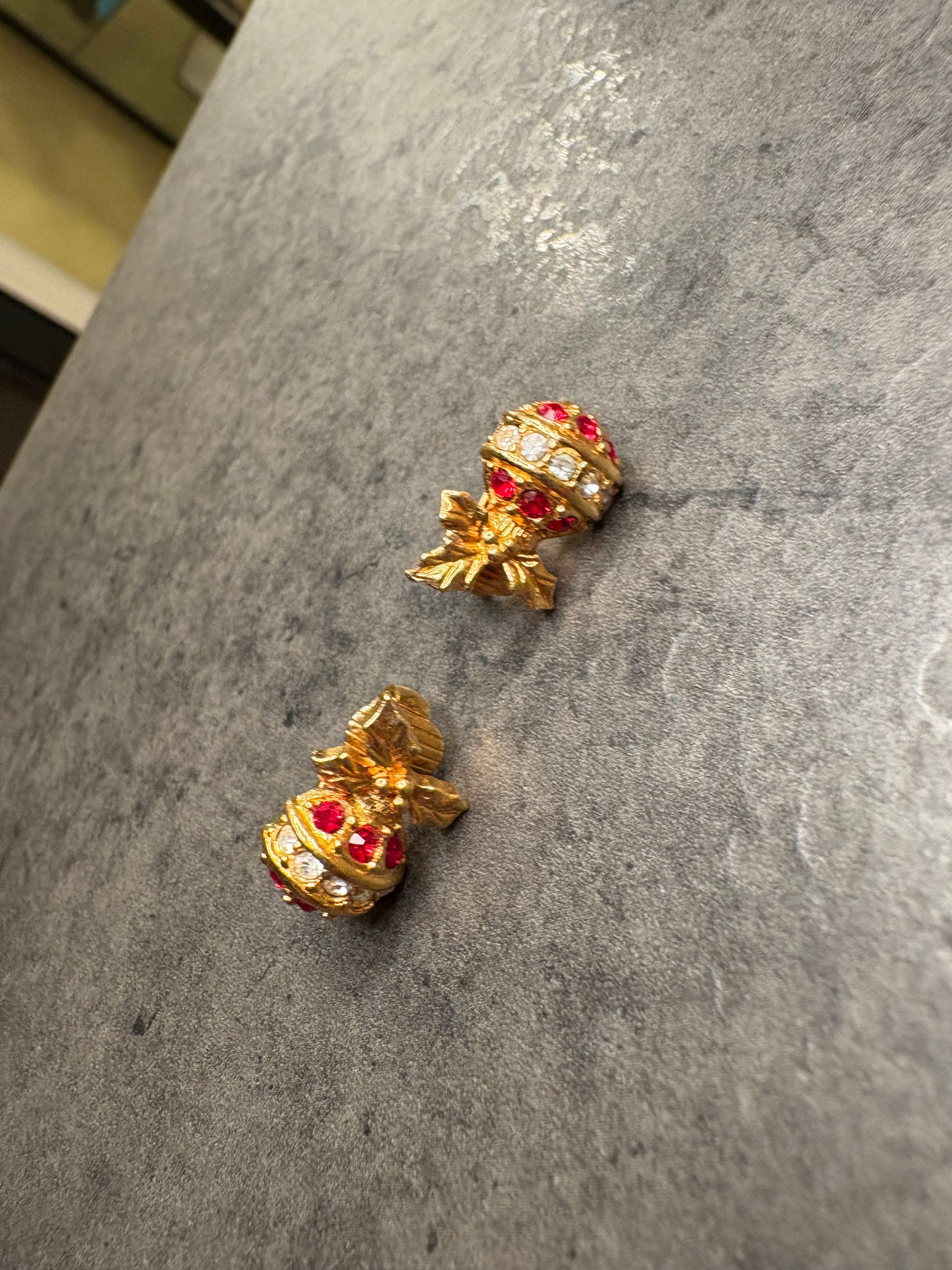 Realizzati in metallo dorato lucente, raffigurano due decorazioni natalizie a sfera, finemente modellate e impreziosite da cristalli rossi e trasparenti che donano luce e vivacità alla composizione. Nella parte superiore, un grazioso fiocco dorato completa il design, evocando l’eleganza delle tradizionali decorazioni da albero di Natale.