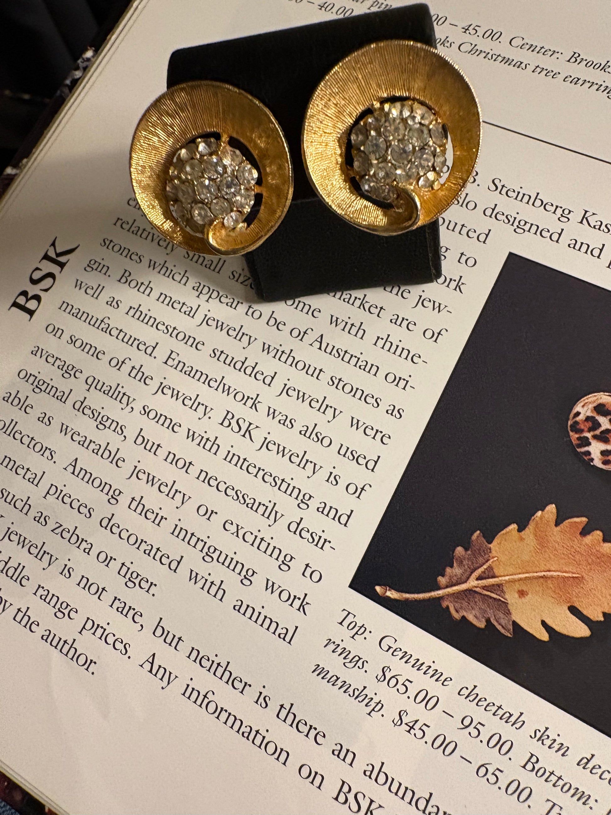 Raffinato paio di orecchini a clip firmati B.S.K., realizzati in metallo dorato satinato con un design elegante e strutturato.
