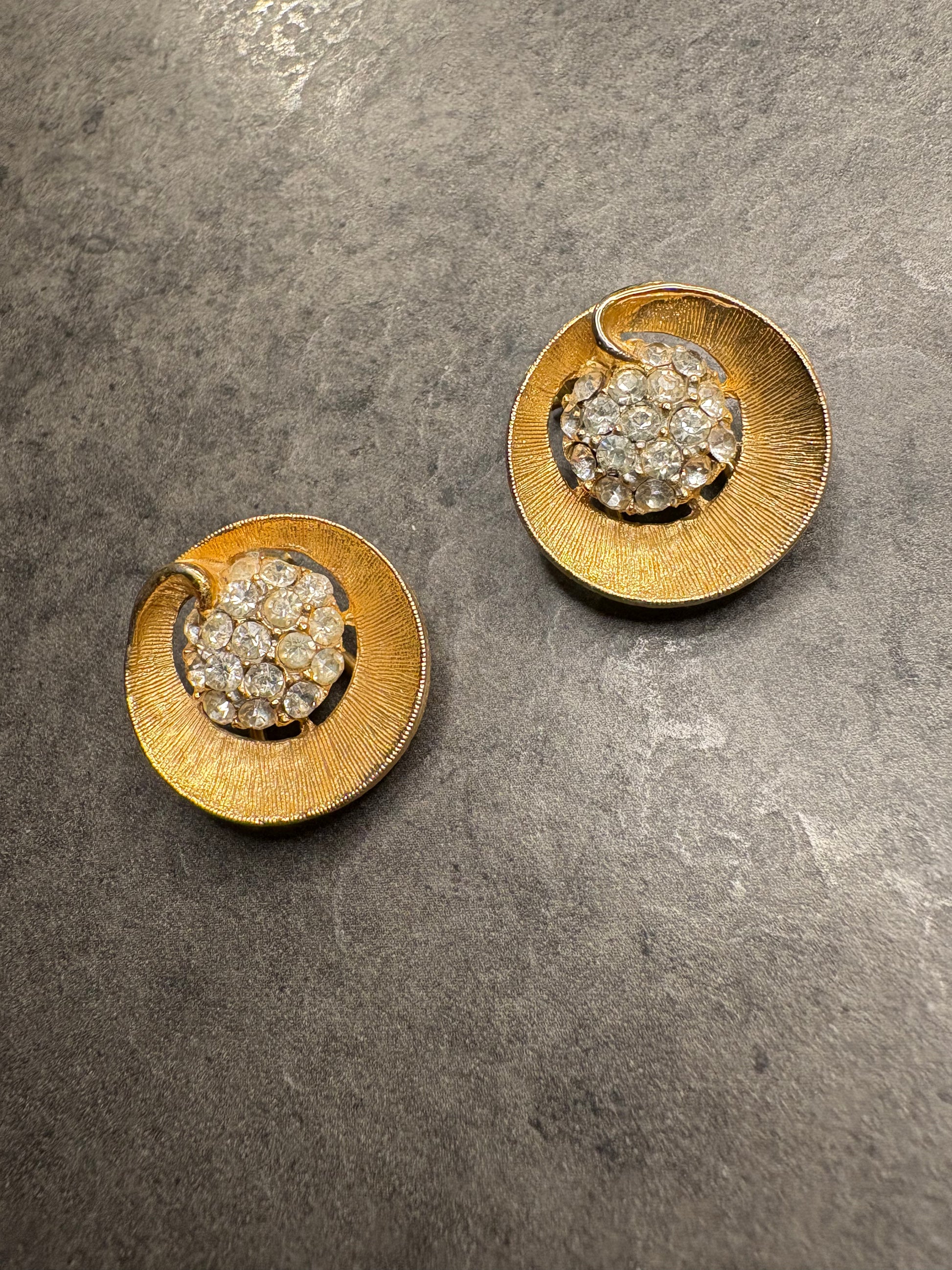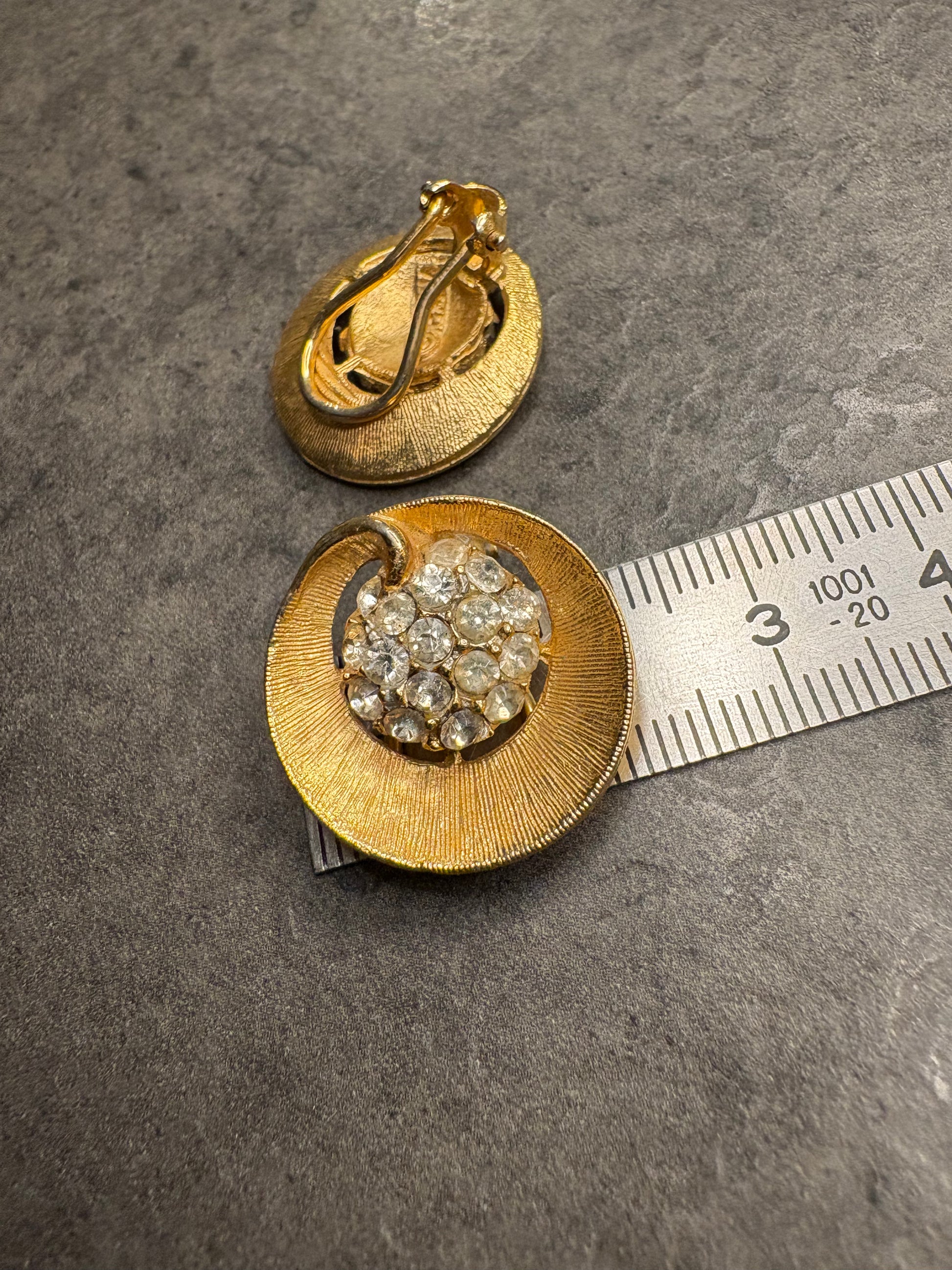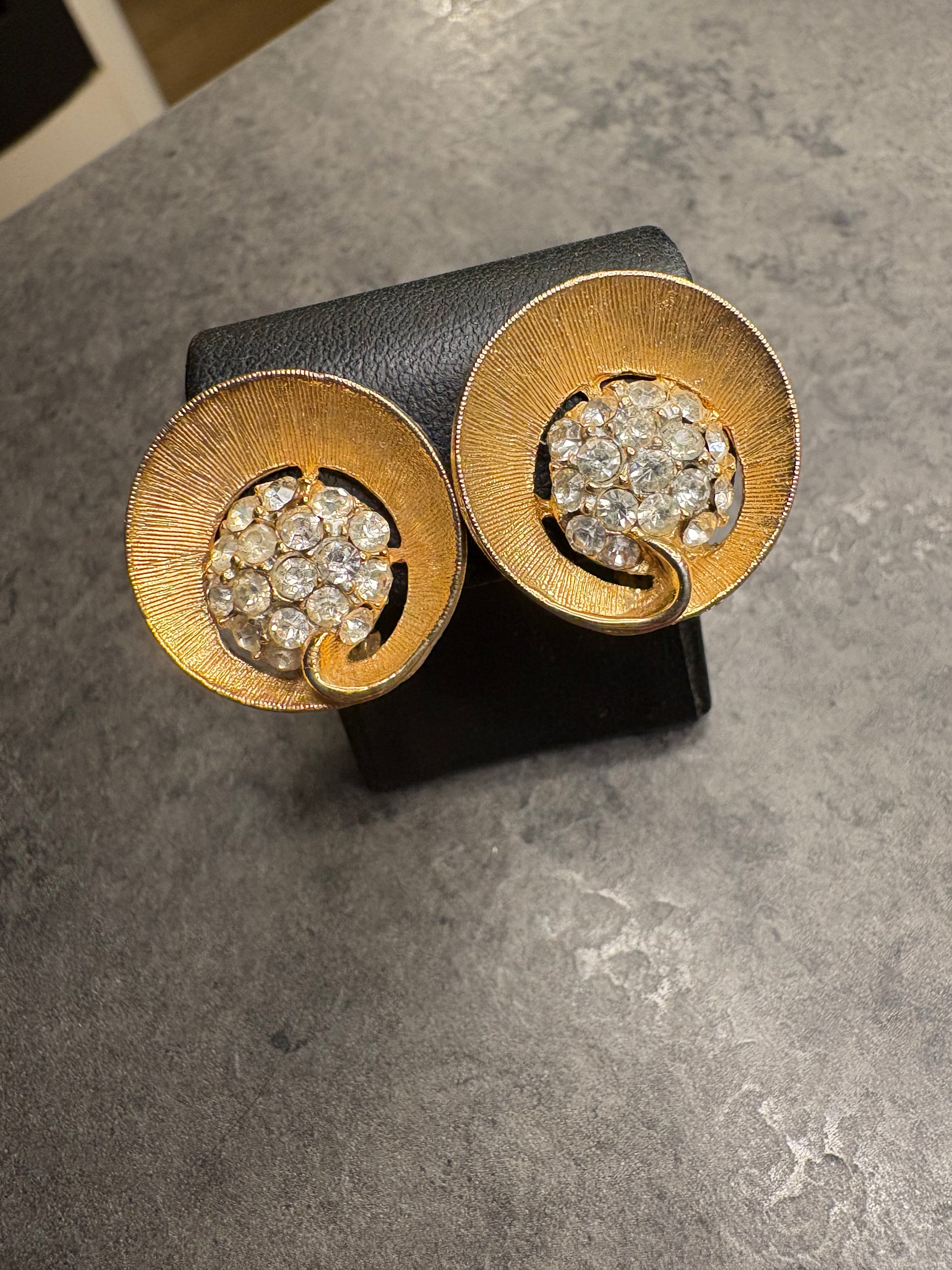 La forma è circolare e leggermente bombata, con: un inserto centrale pavé di cristalli luminosissimi, una cornice dorata con linea grafica e moderna, molto tipica del gusto anni ’60–’70.