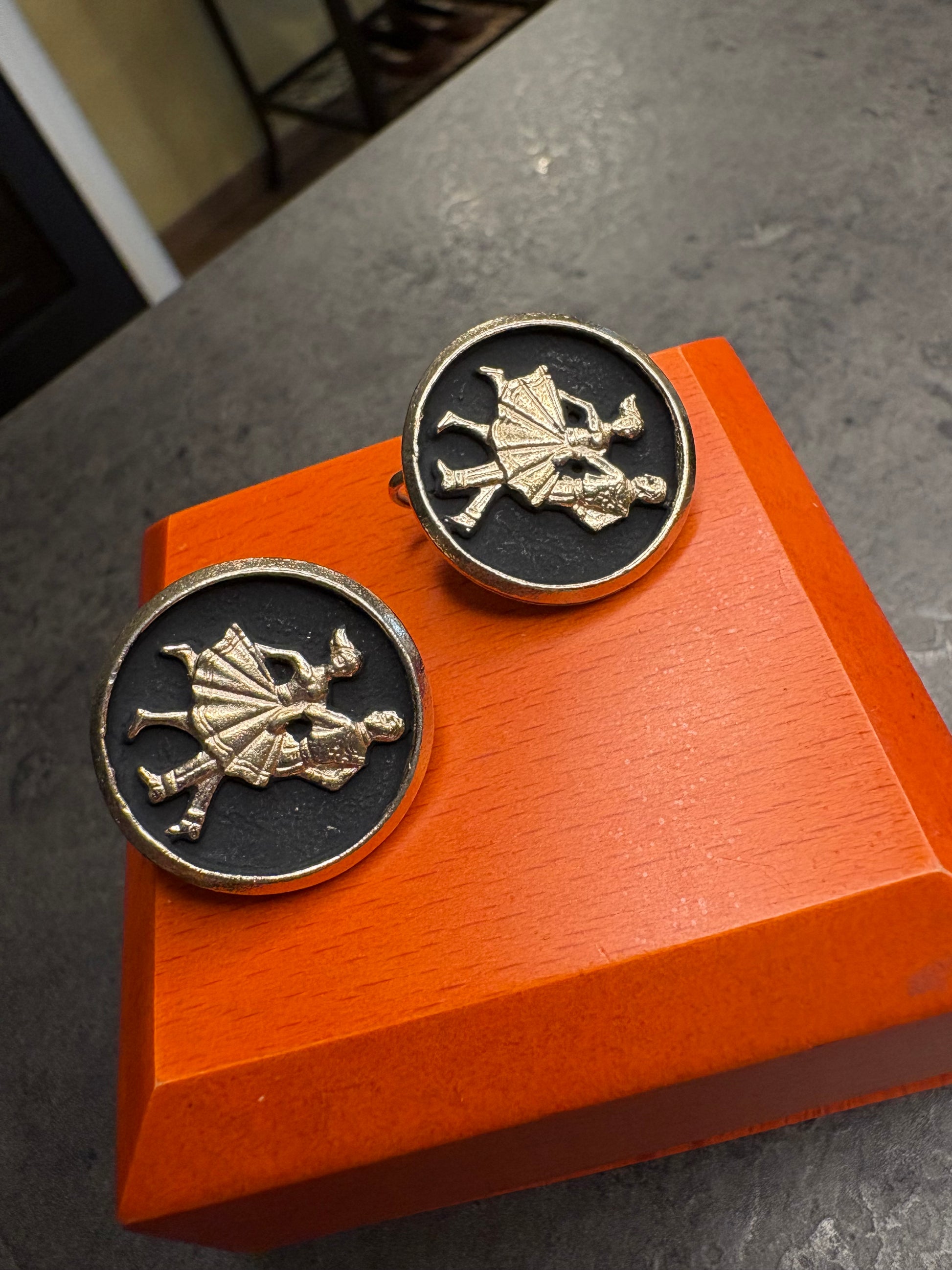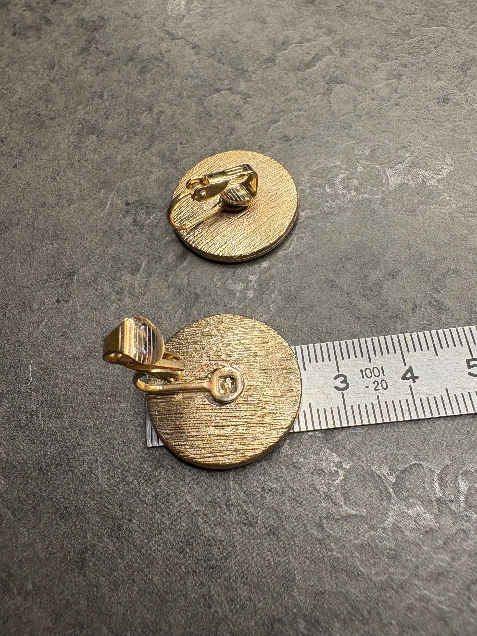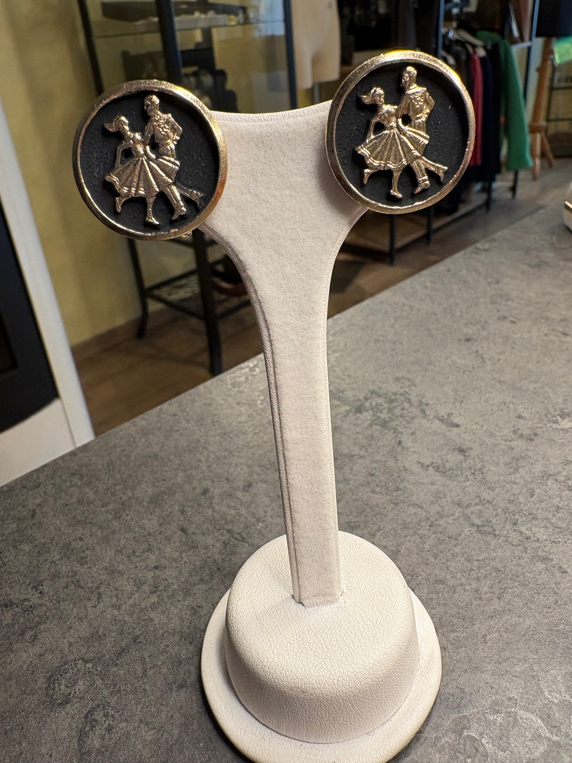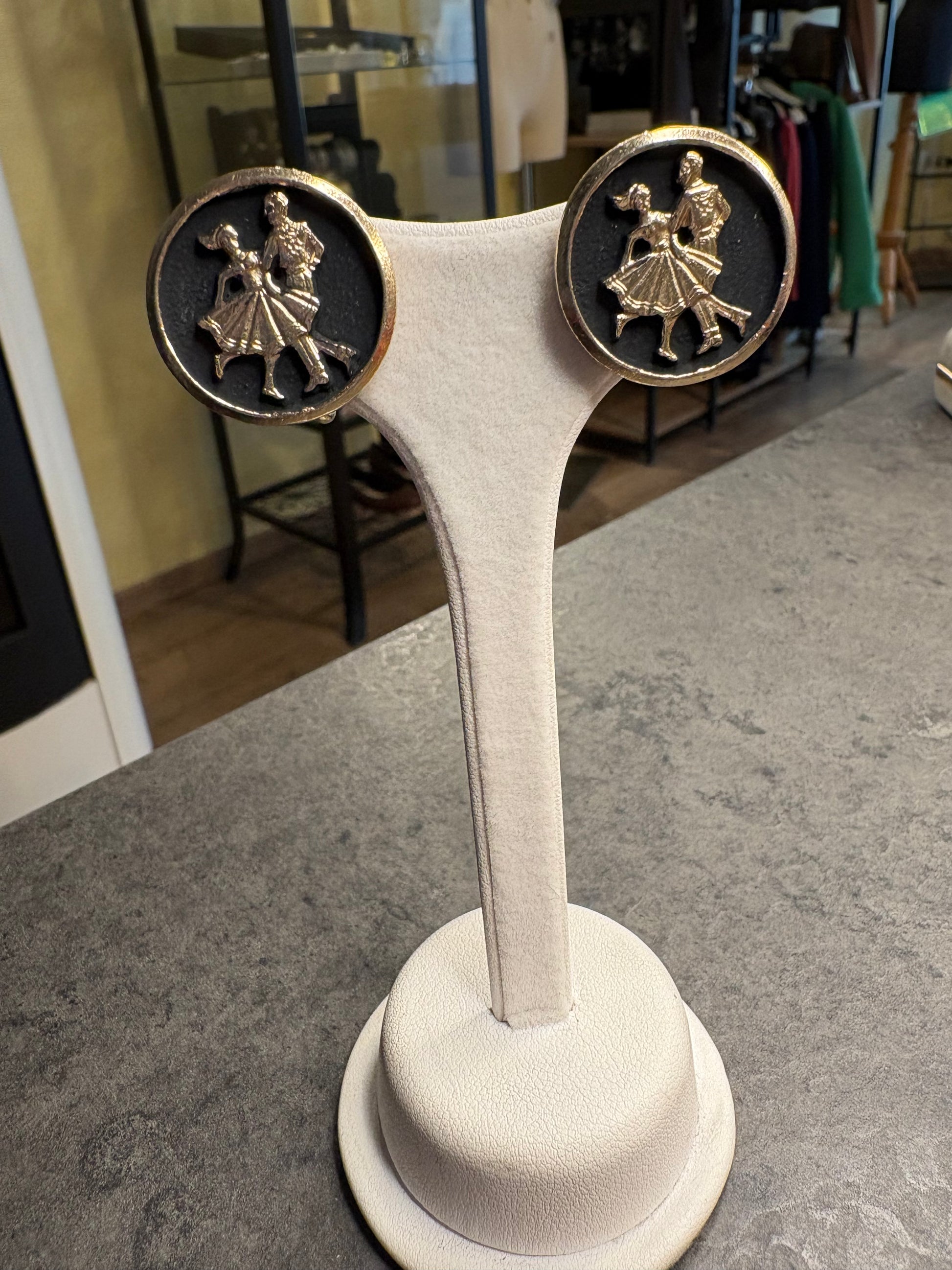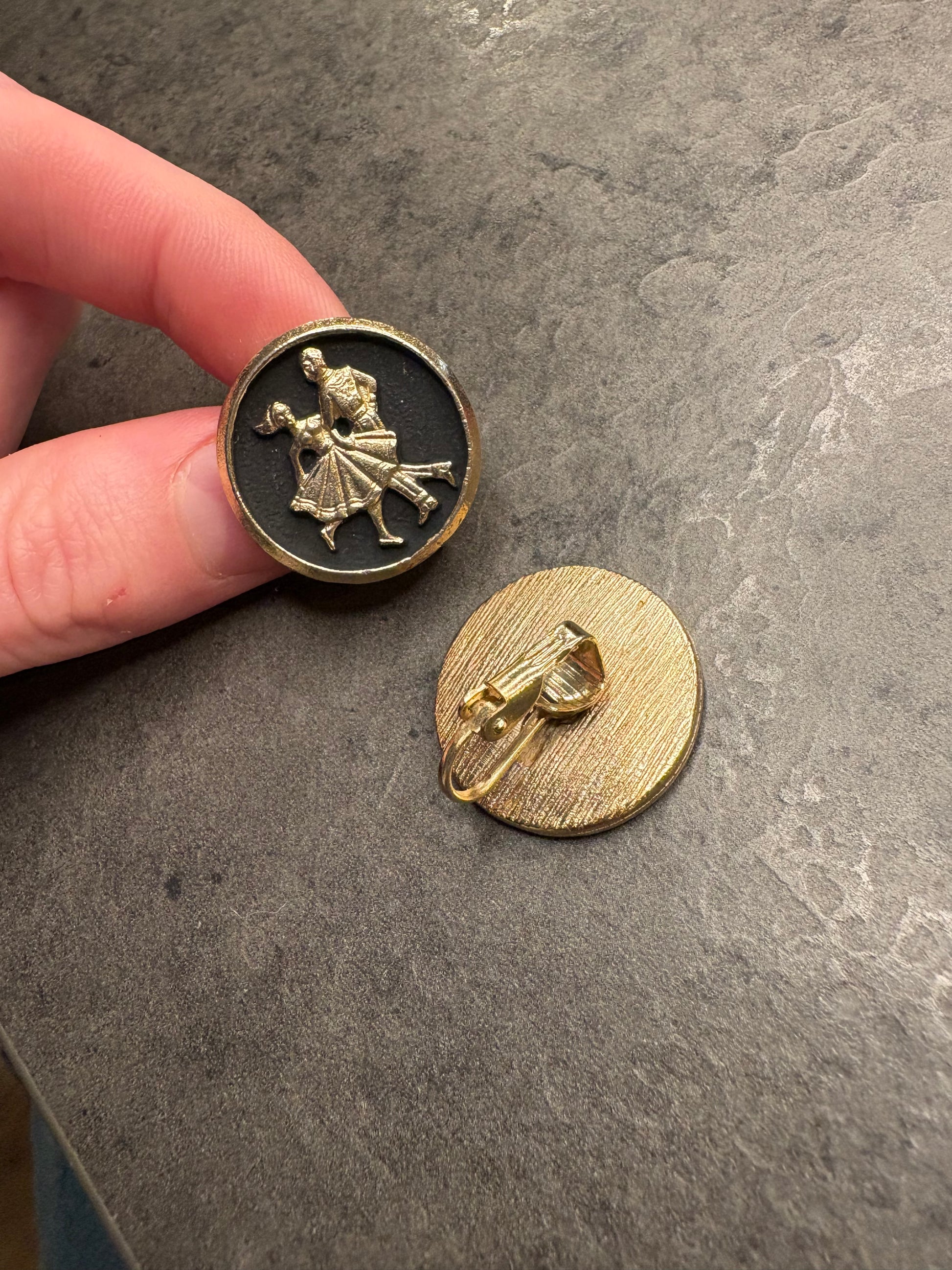 Questi splendidi orecchini a clip vintage presentano un raffinato design circolare con una scena in rilievo di coppia danzante, simbolo di grazia e movimento.
