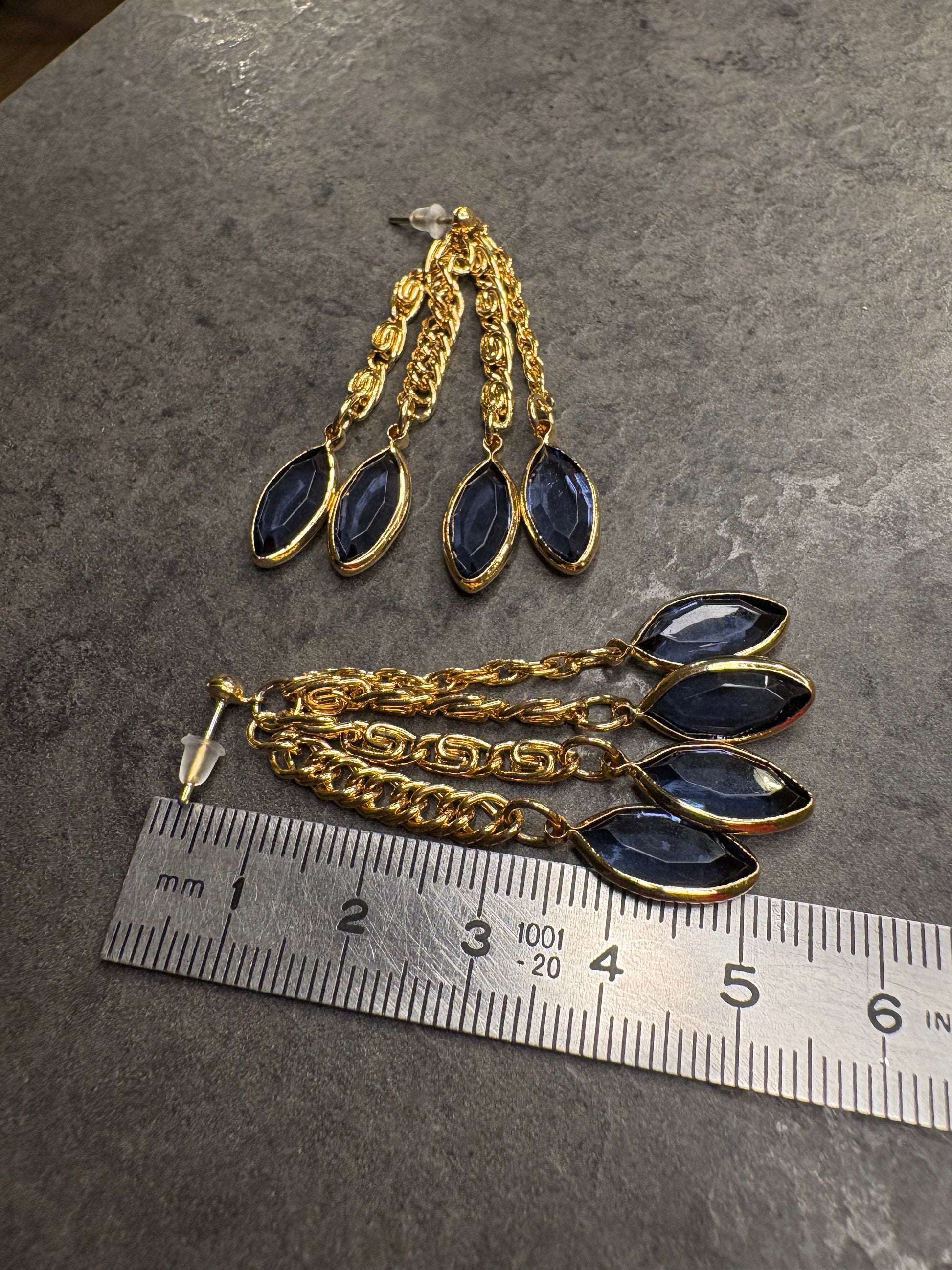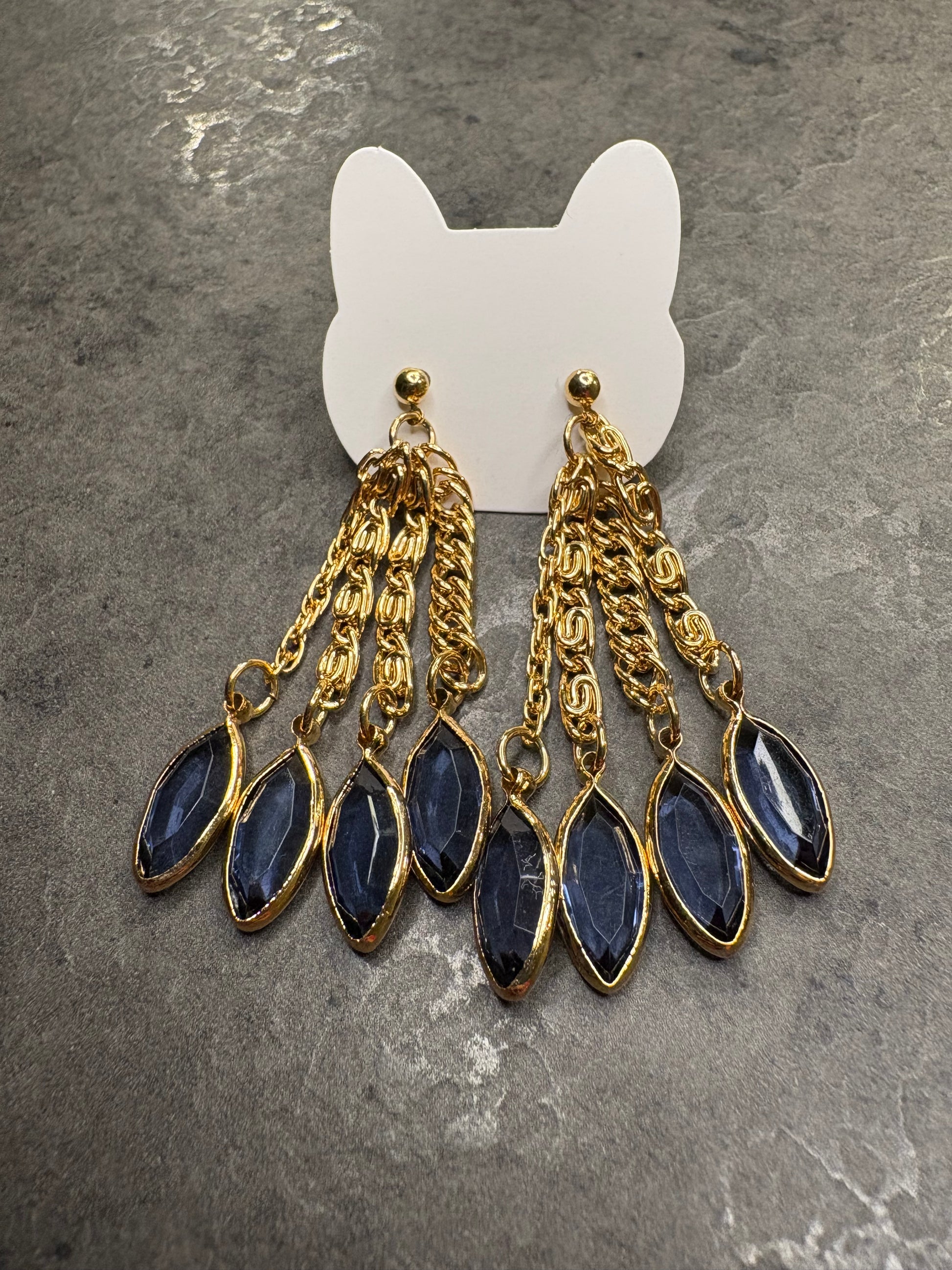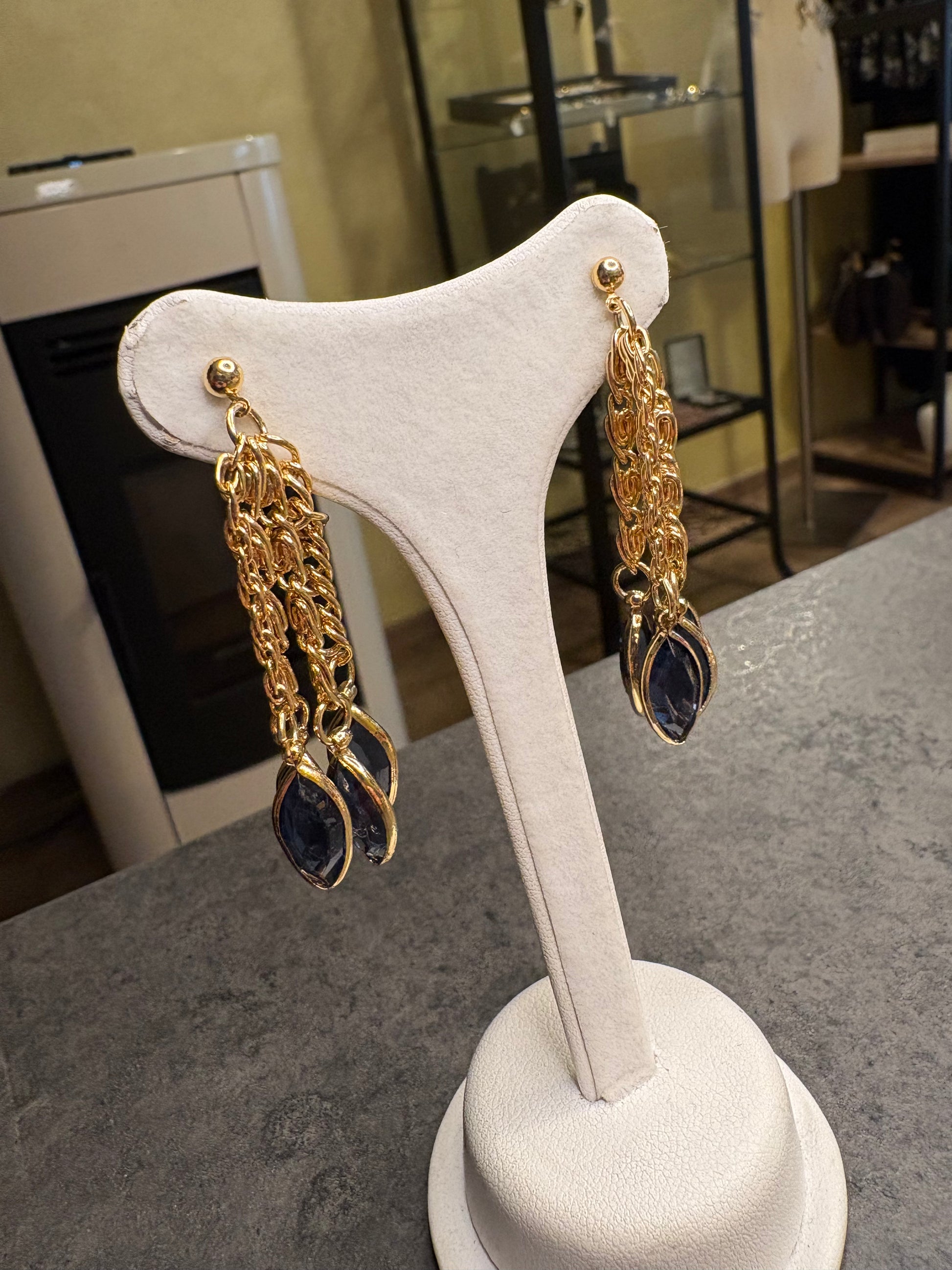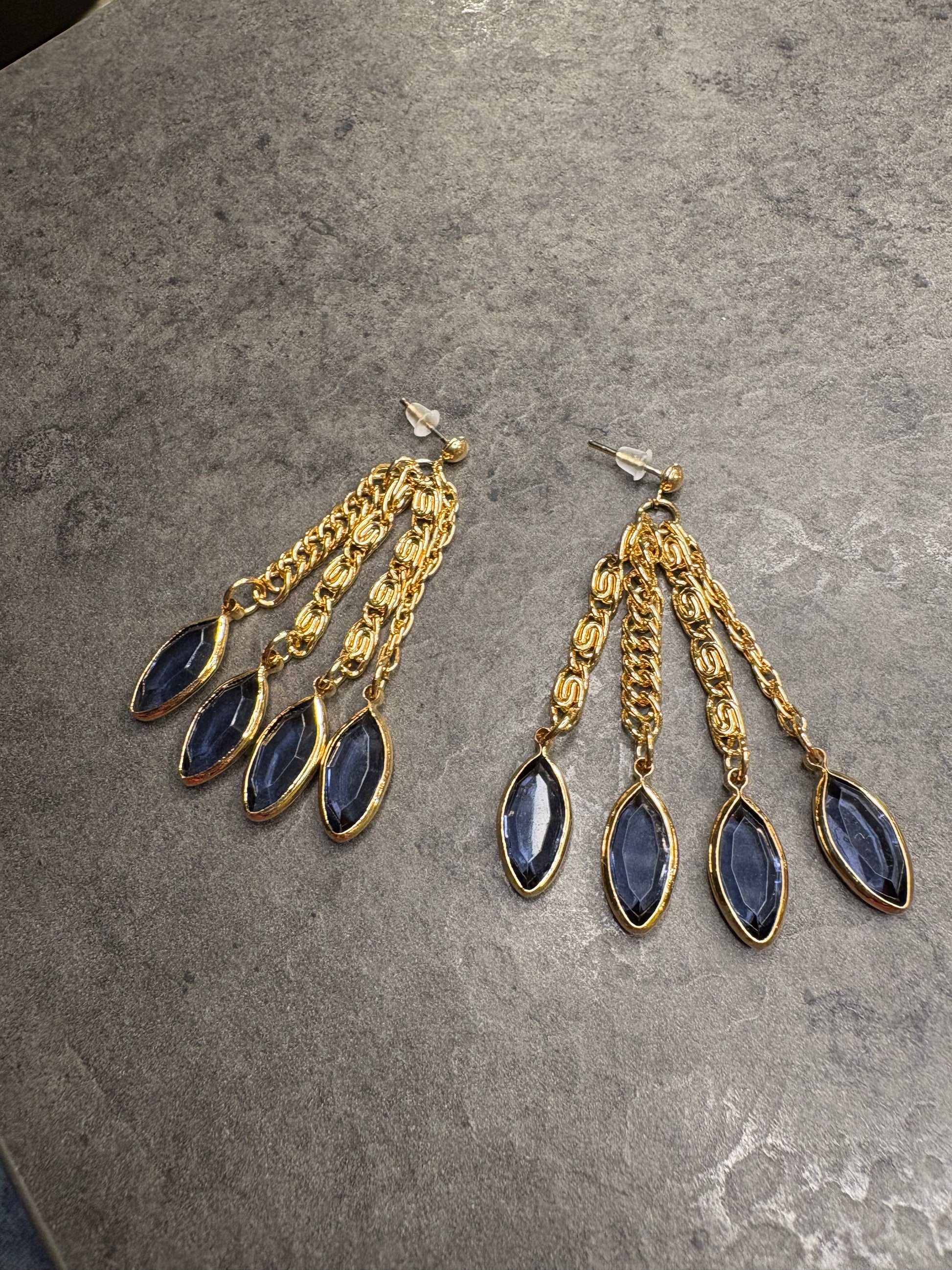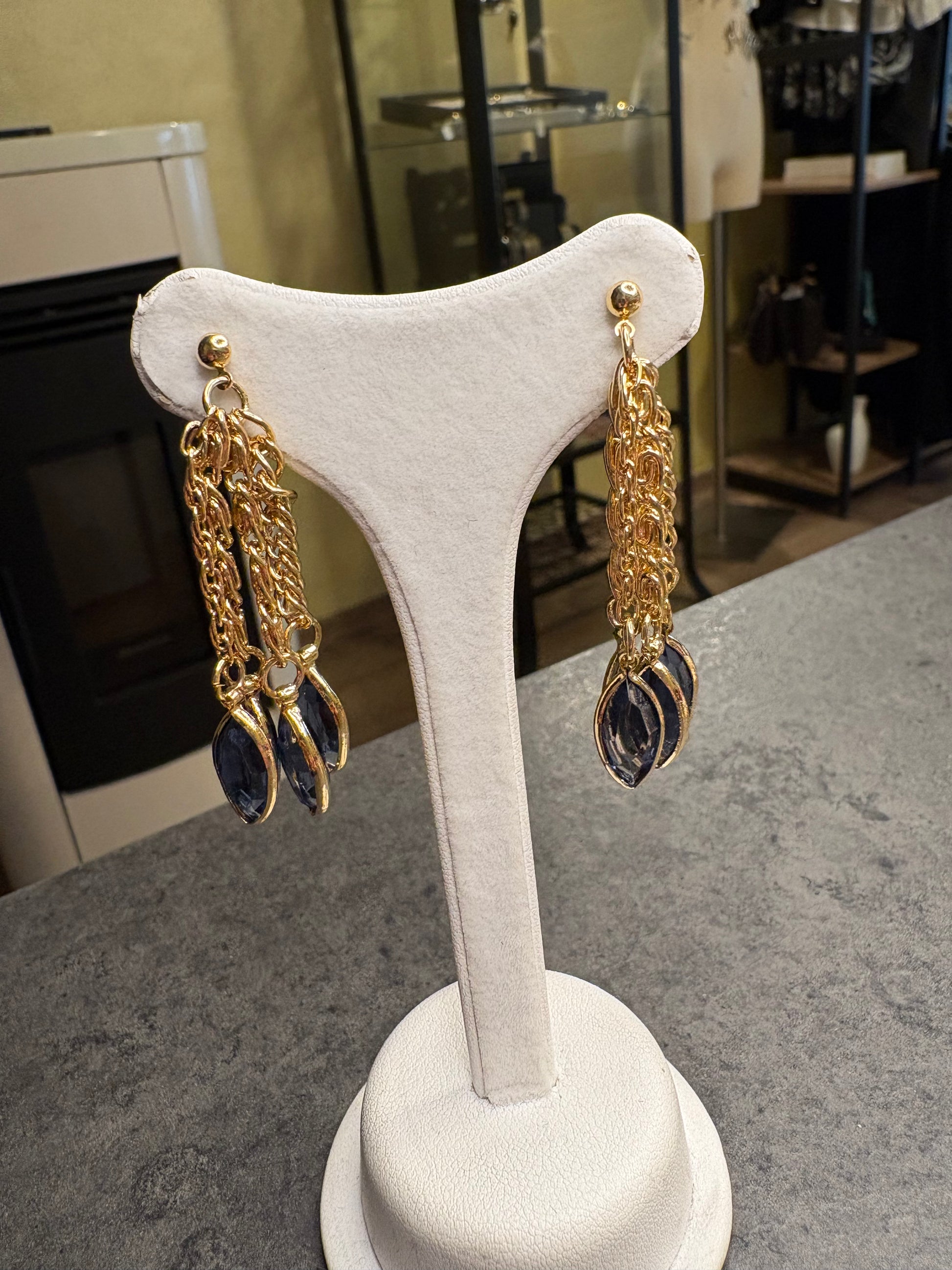 Eleganti orecchini vintage pendenti per lobi forati, realizzati in metallo dorato lucido dal design raffinato e dinamico.Ciascun orecchino presenta quattro catene dorate di maglie diverse, da cui pendono splendide pietre in vetro blu zaffiro taglio marquise con montatura bezel che donano luminosità e profondità ai movimenti.