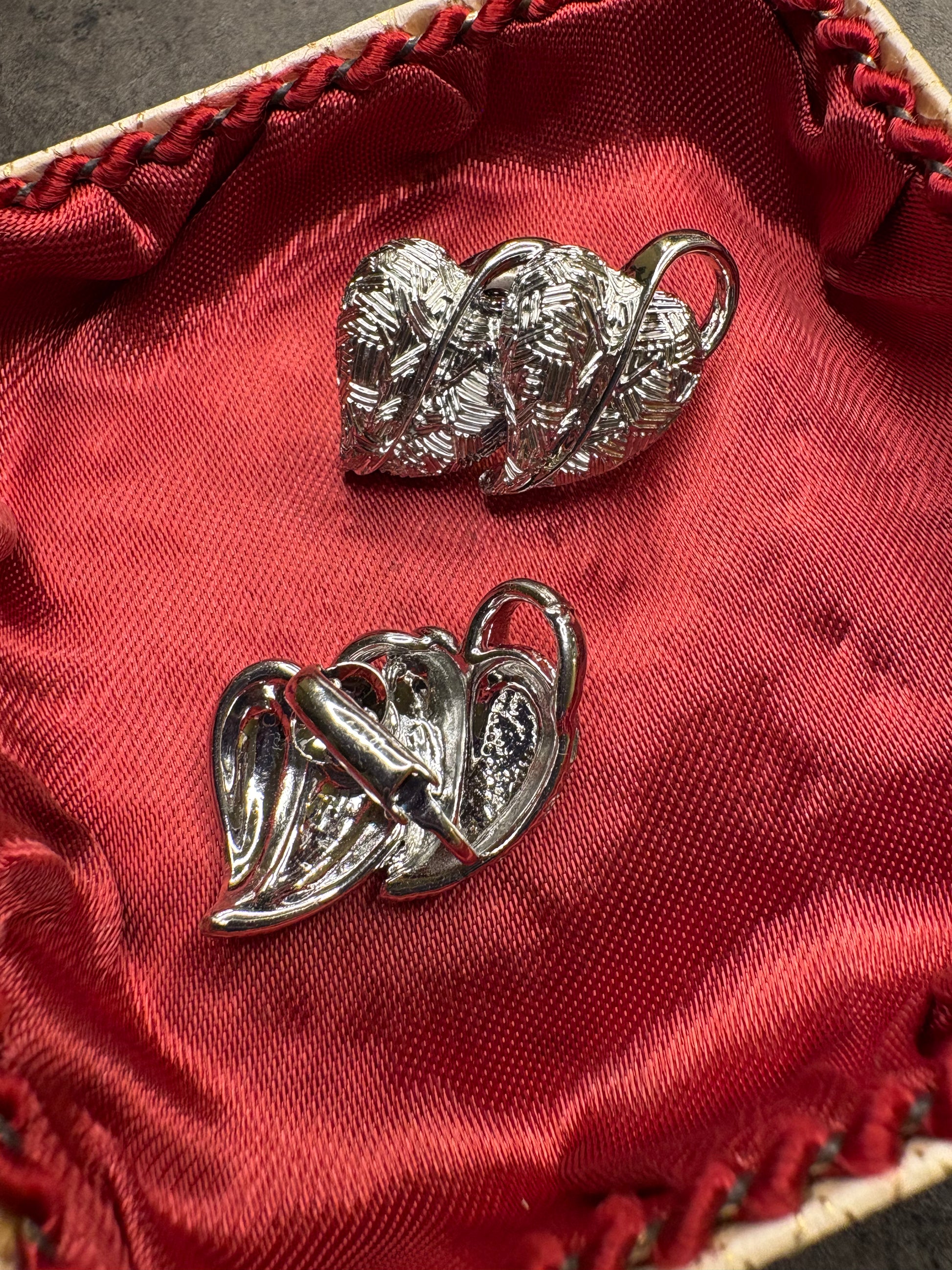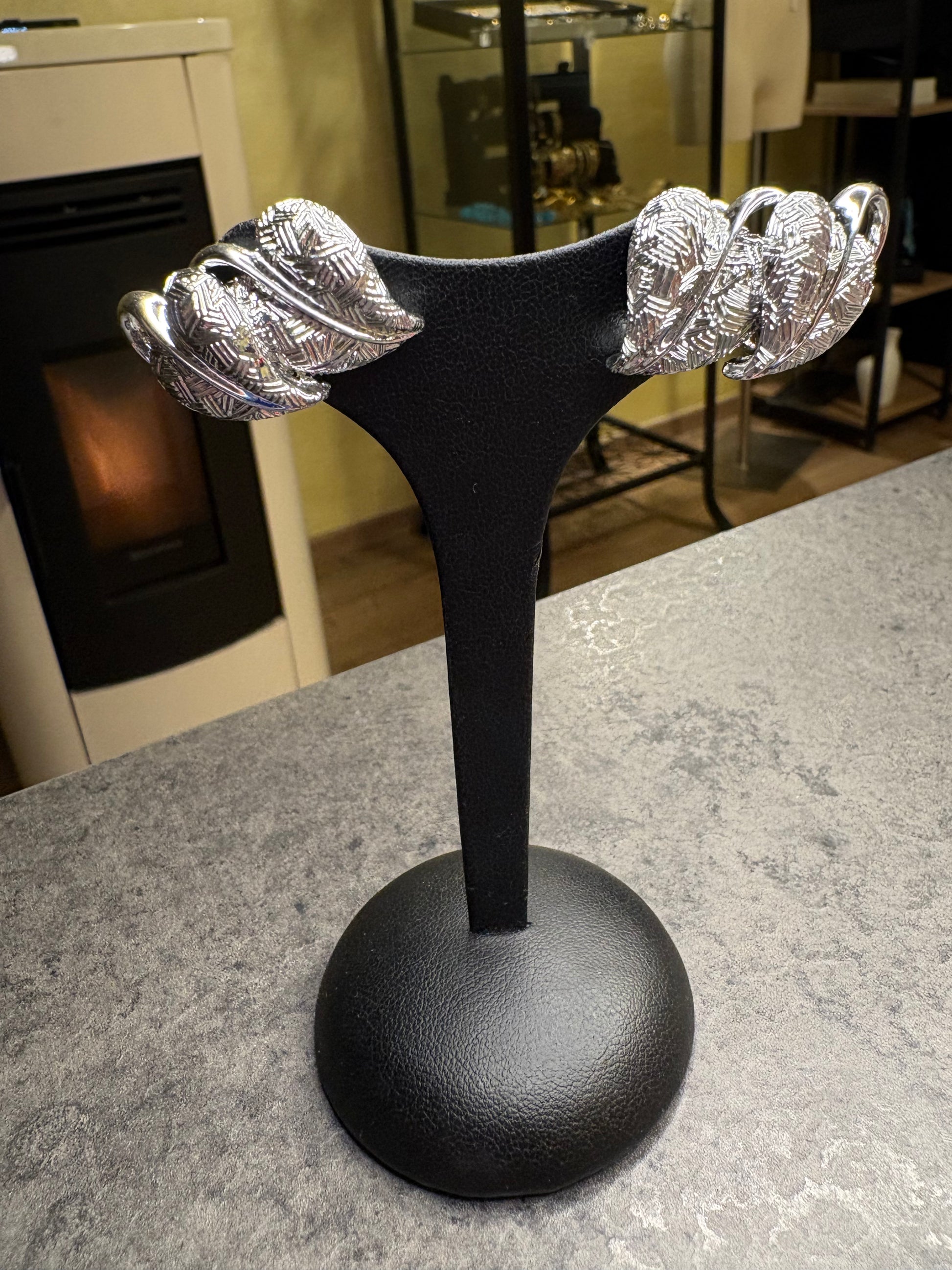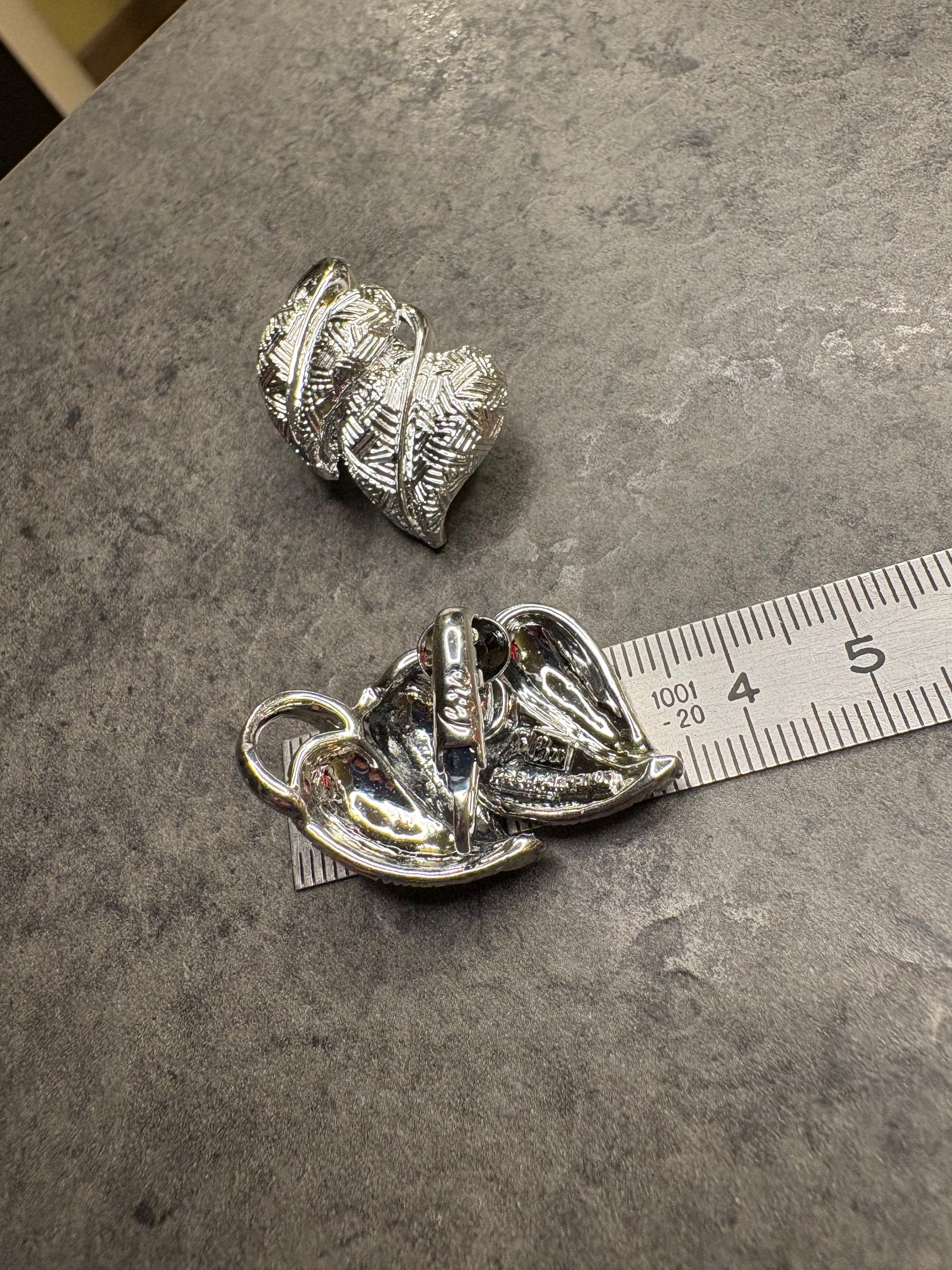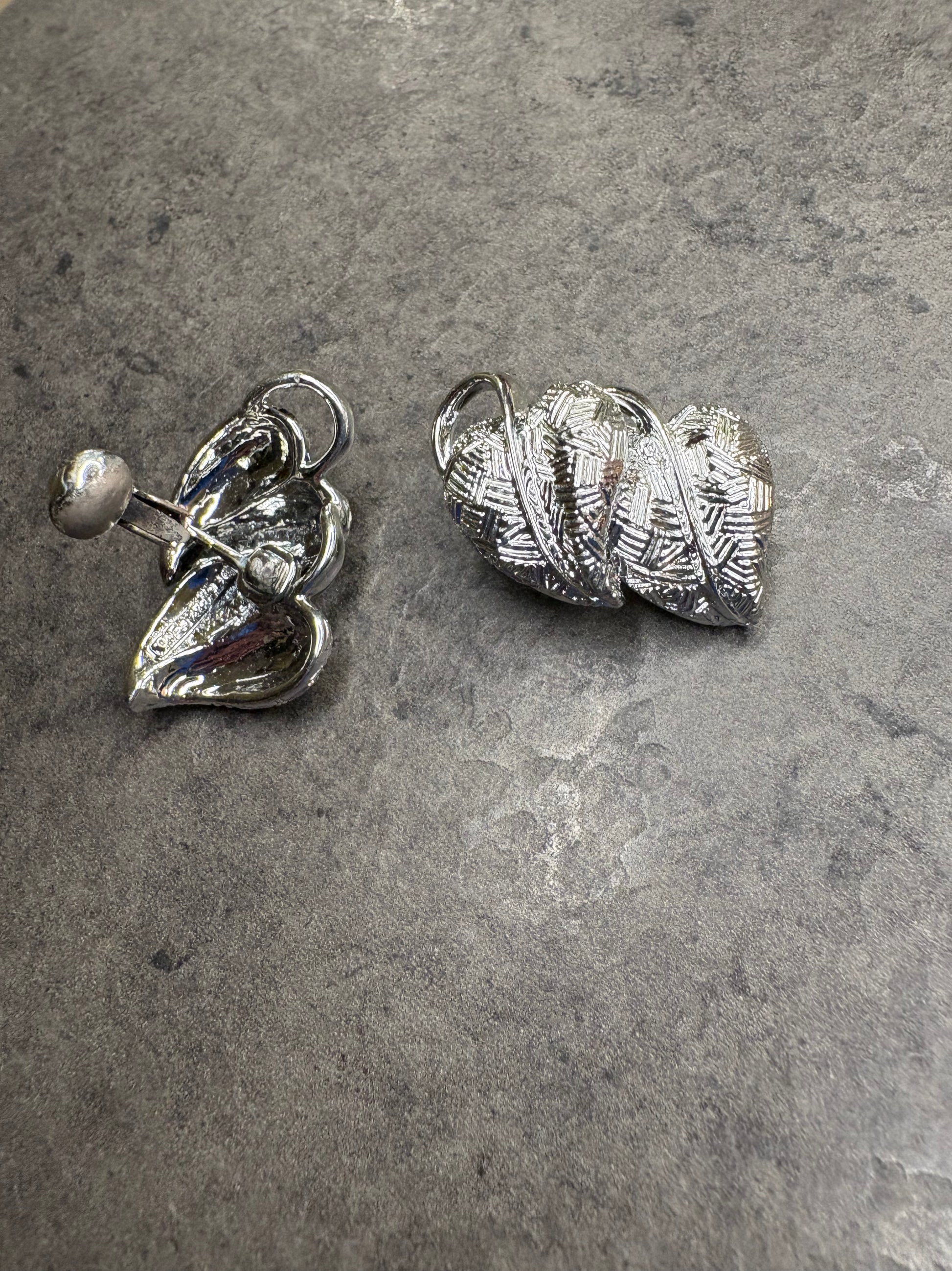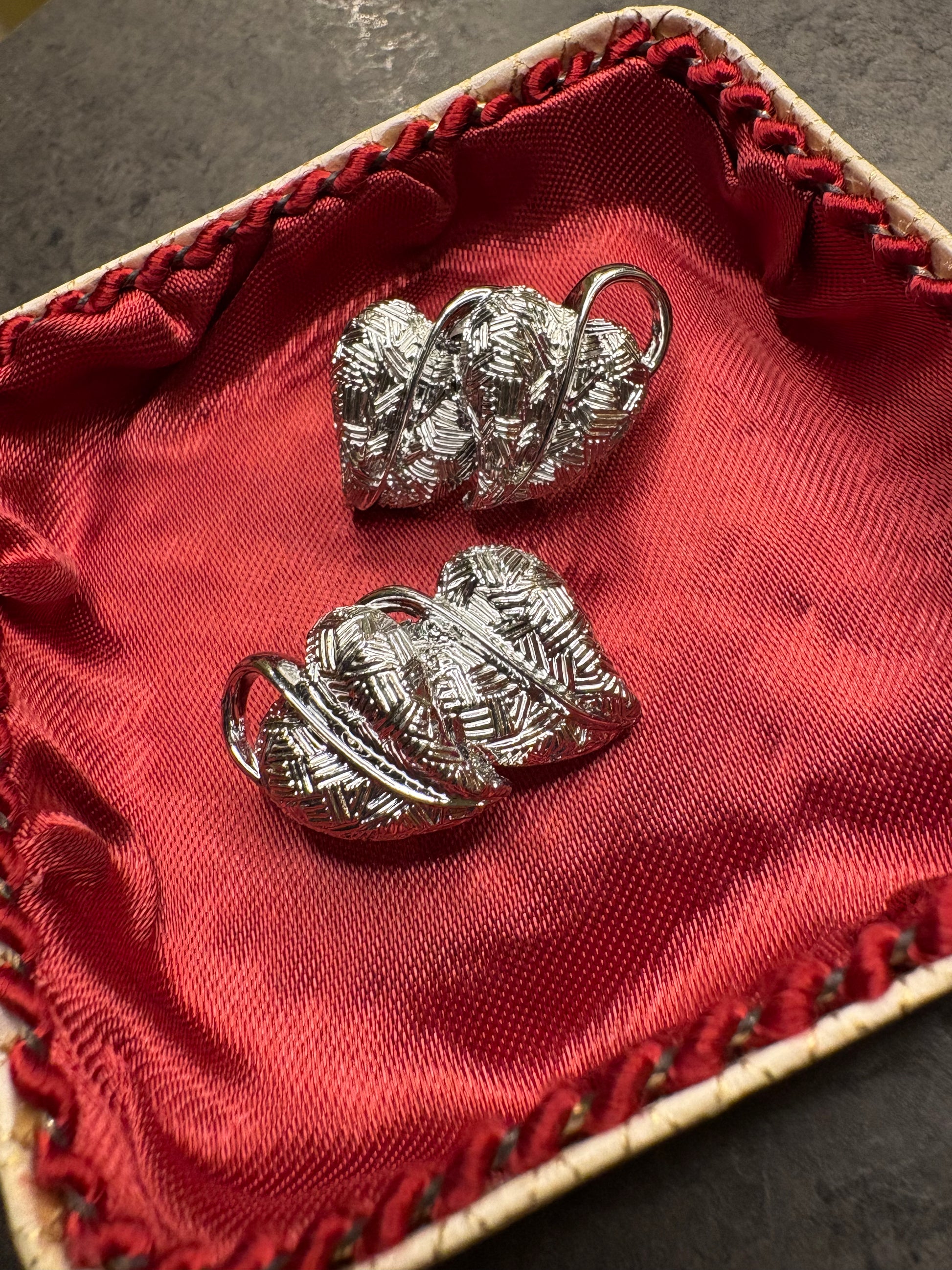 Raffinati orecchini a clip vintage firmati Coro, un’elegante espressione del design americano degli anni ’50-’60. Realizzati in metallo argentato con una lavorazione finemente cesellata, raffigurano due foglie stilizzate intrecciate in un gioco di rilievi e texture che cattura la luce con straordinaria vivacità. Le superfici alternate lucide e satinate conferiscono profondità e movimento, esaltando la qualità artigianale tipica delle creazioni Coro.