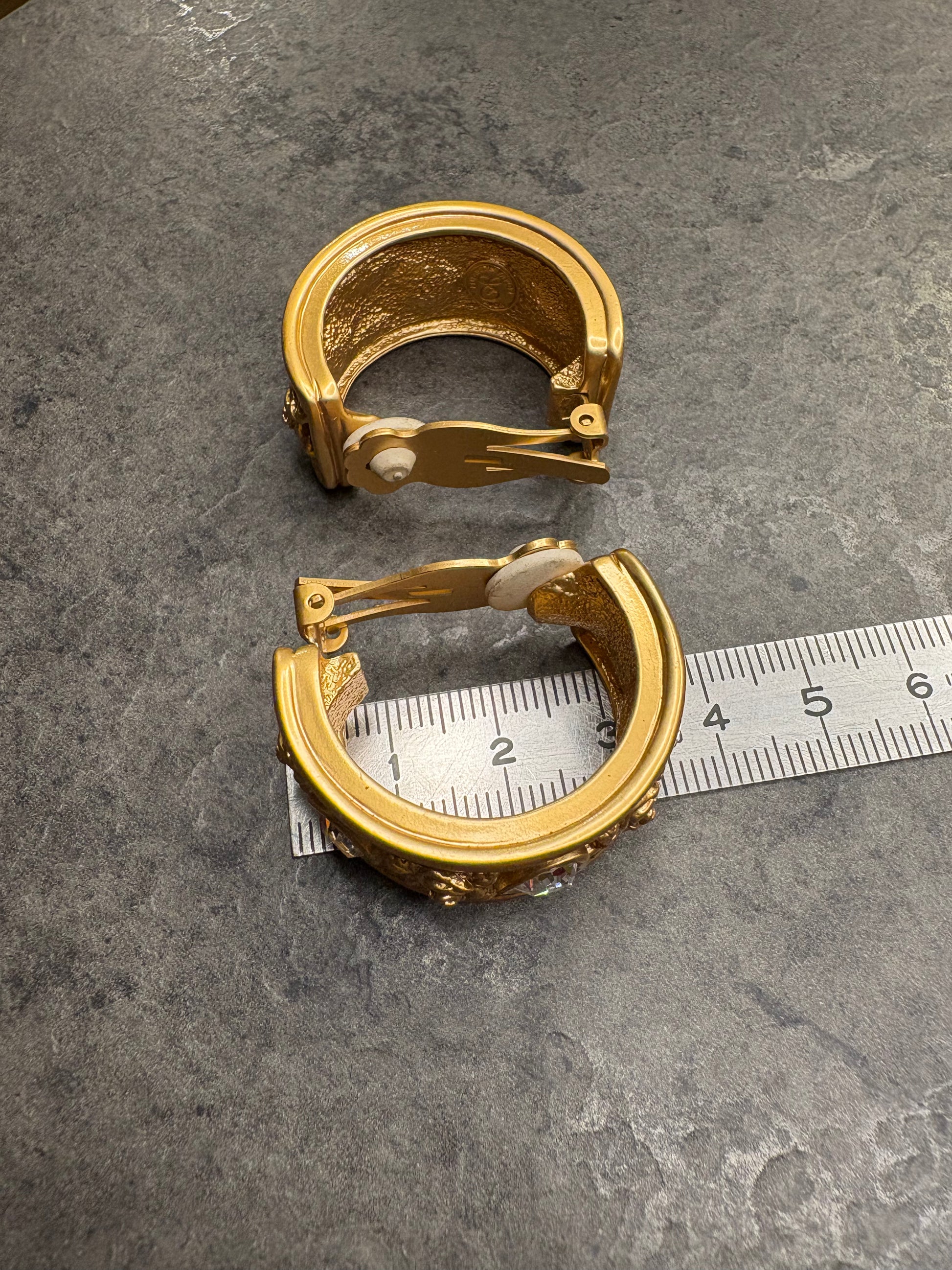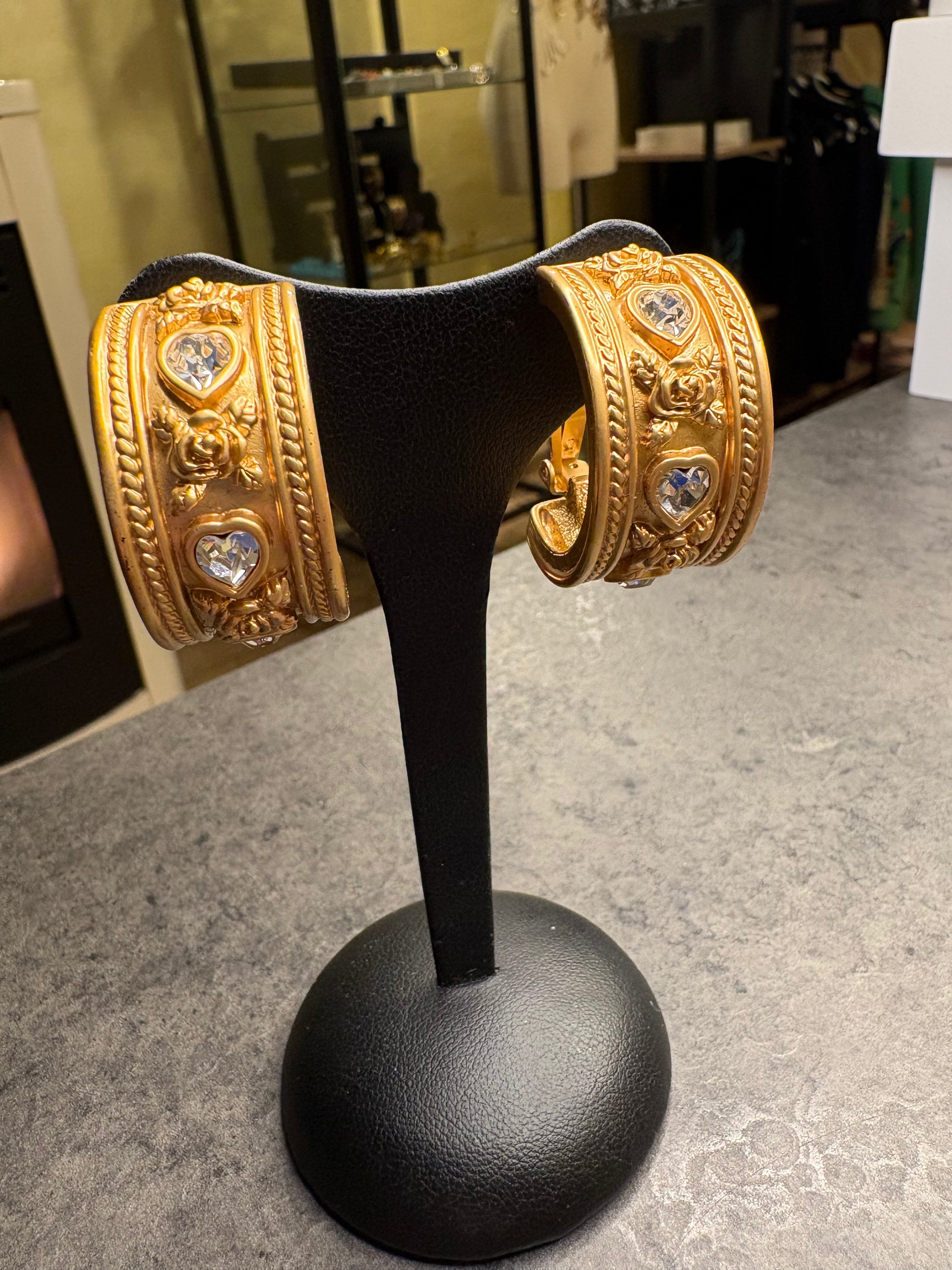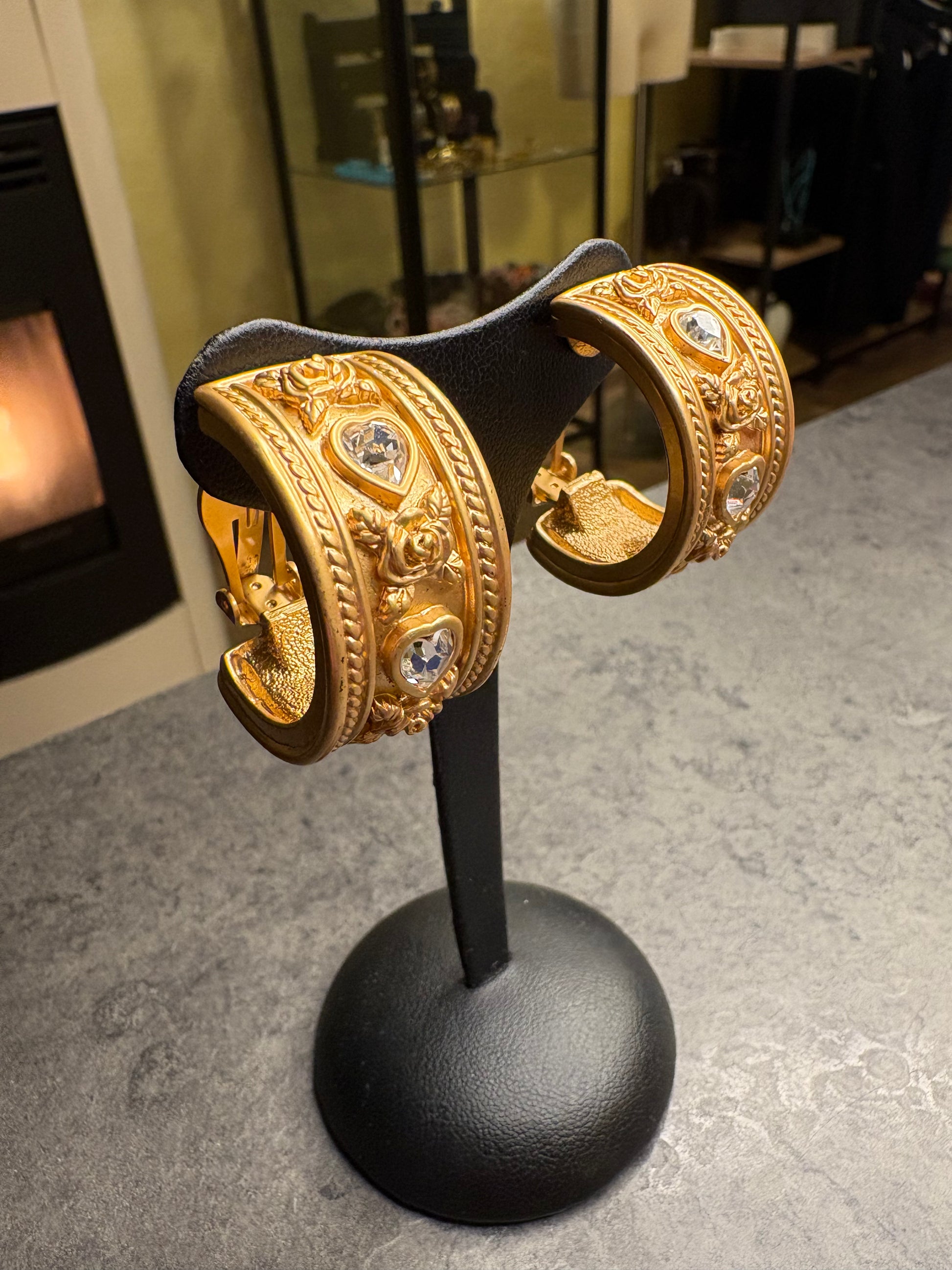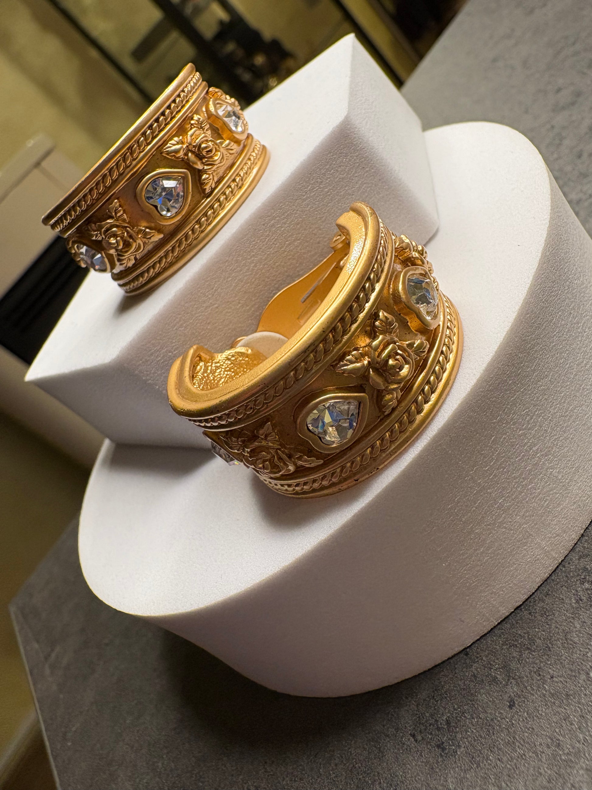 Questo è un paio di rari orecchini a clip disegnati da Elizabeth Taylor per Avon nel 1995, appartenenti alla celebre “Love Blooms Collection”. Si tratta di orecchini importanti, ricchi e tridimensionali, realizzati in metallo color oro con una lavorazione molto elaborata, impreziositi da cristalli trasparenti incastonati che catturano la luce con grande brillantezza. Il design, sontuoso ma armonioso, richiama chiaramente il gusto dell’alta gioielleria classica tanto amata da Elizabeth Taylor, con volumi generosi, dettagli scolpiti e un effetto complessivo estremamente elegante e scenografico. La loro rarità li rende oggi particolarmente ricercati dai collezionisti di Avon e dai fan della celebre attrice.