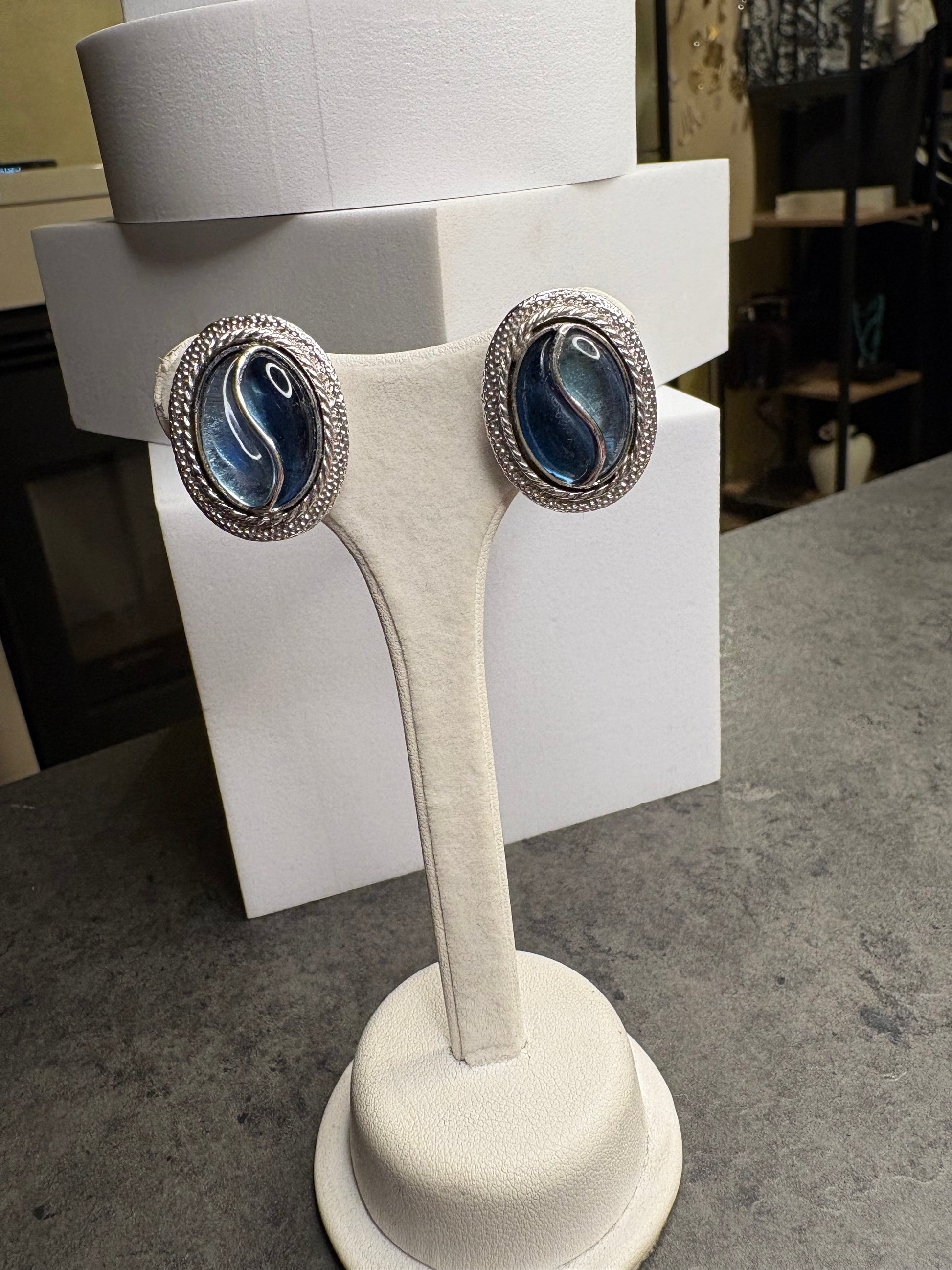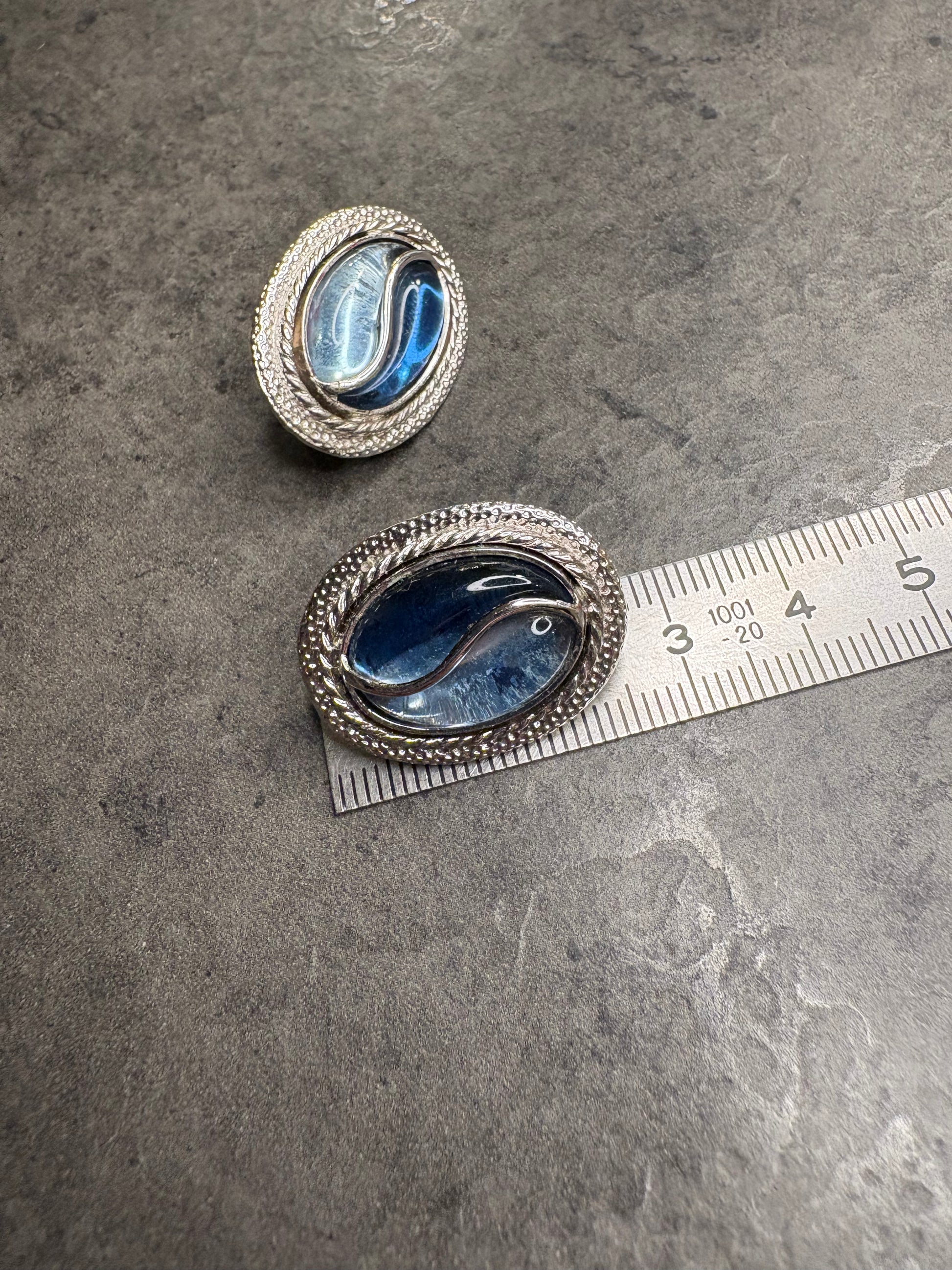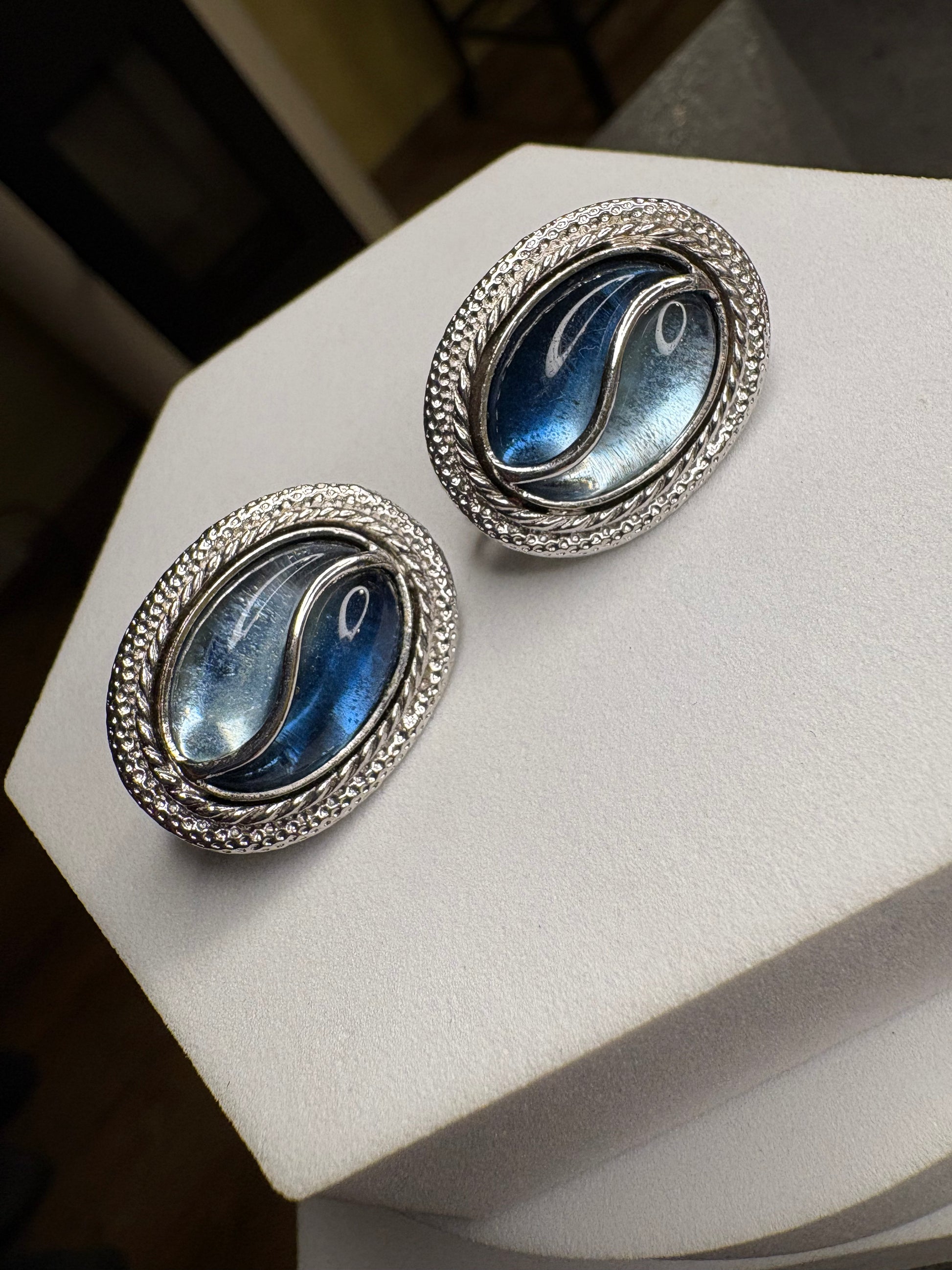 Raffinati orecchini vintage firmati Emmons, realizzati in metallo color argento con elementi ondulati in plastica nei toni dell’azzurro e del blu dal suggestivo effetto vetro. Il design è morbido, fluido e organico, chiaramente ispirato all’estetica modernista e spaziale degli anni ’60.