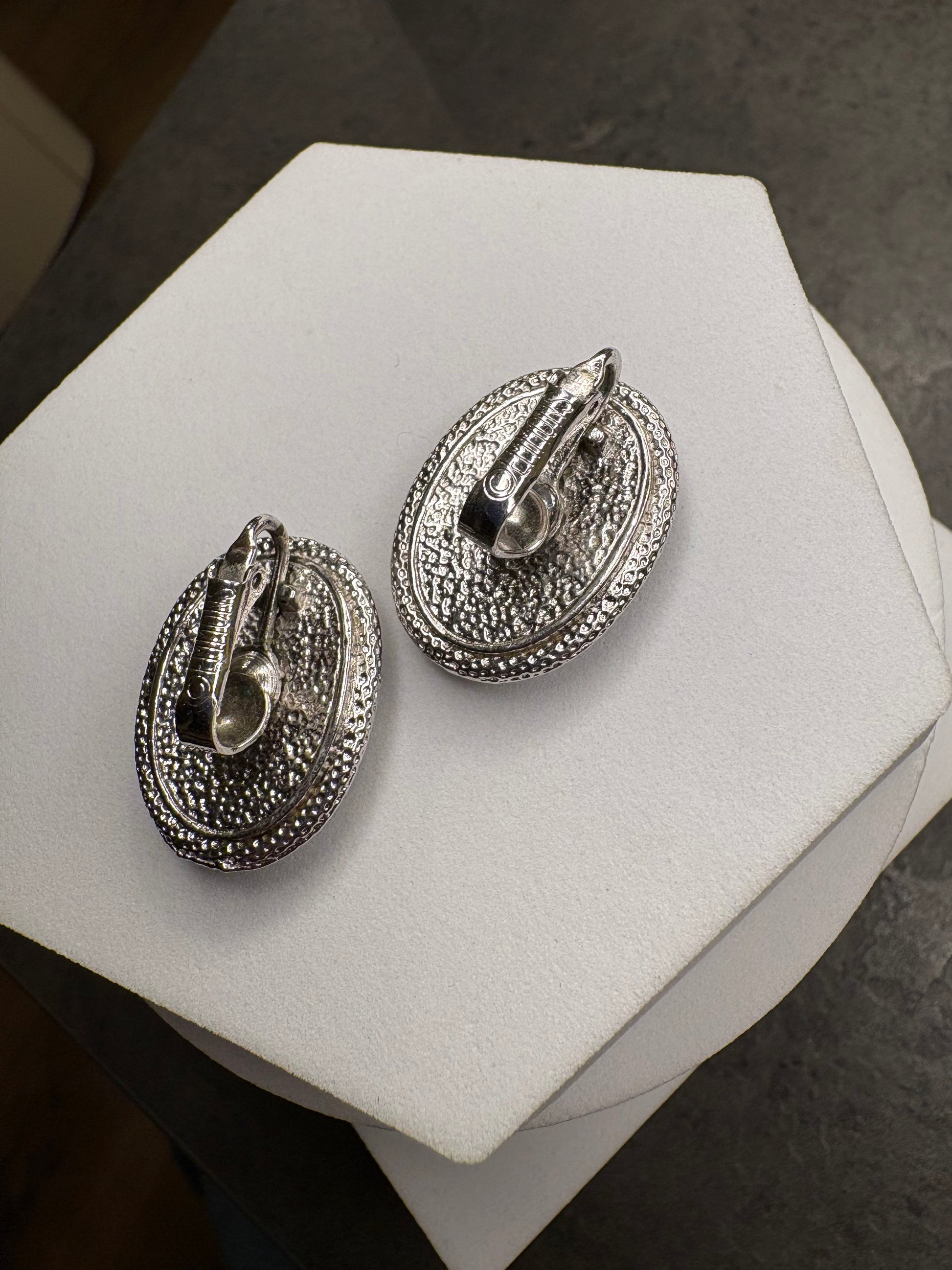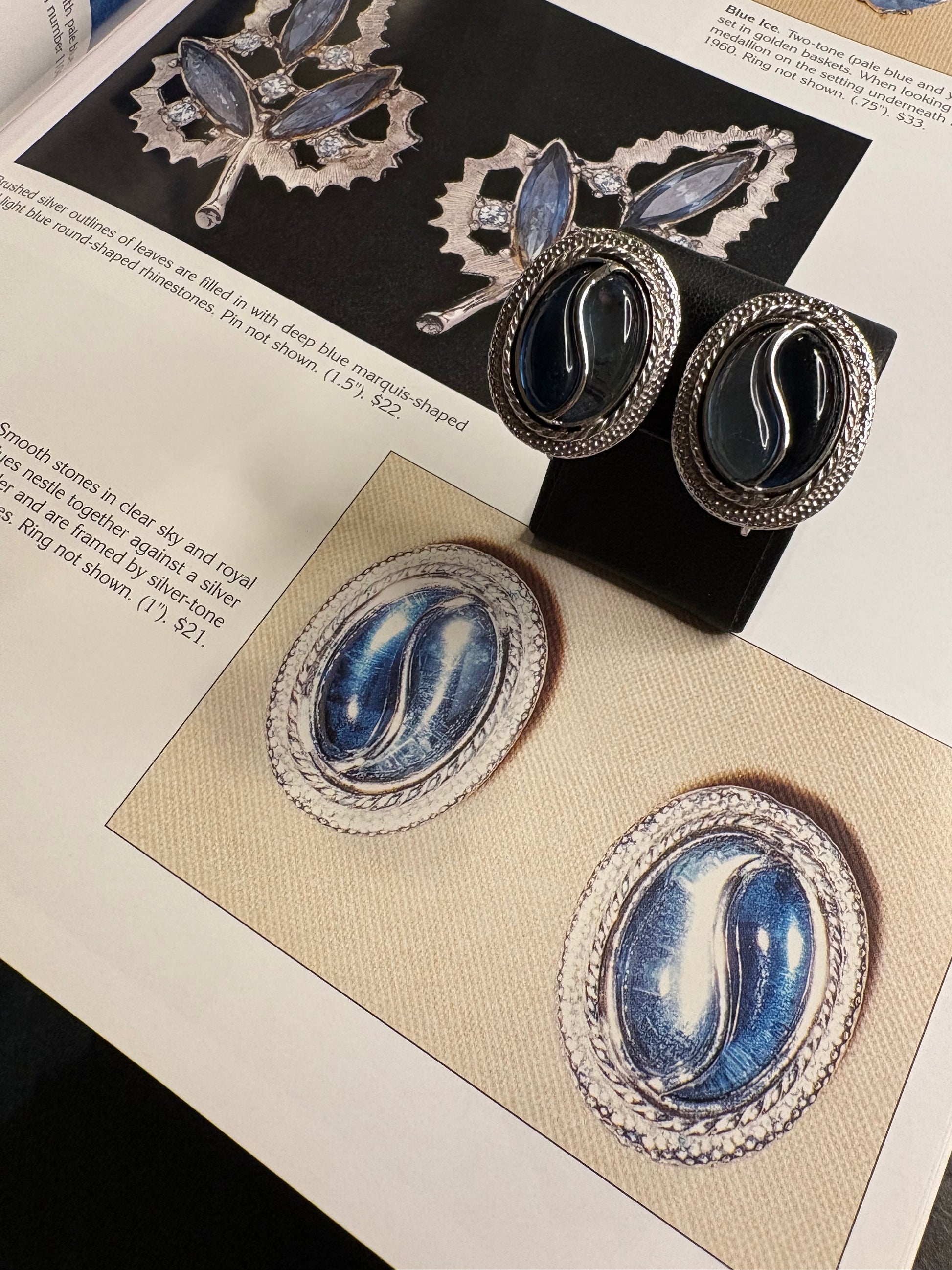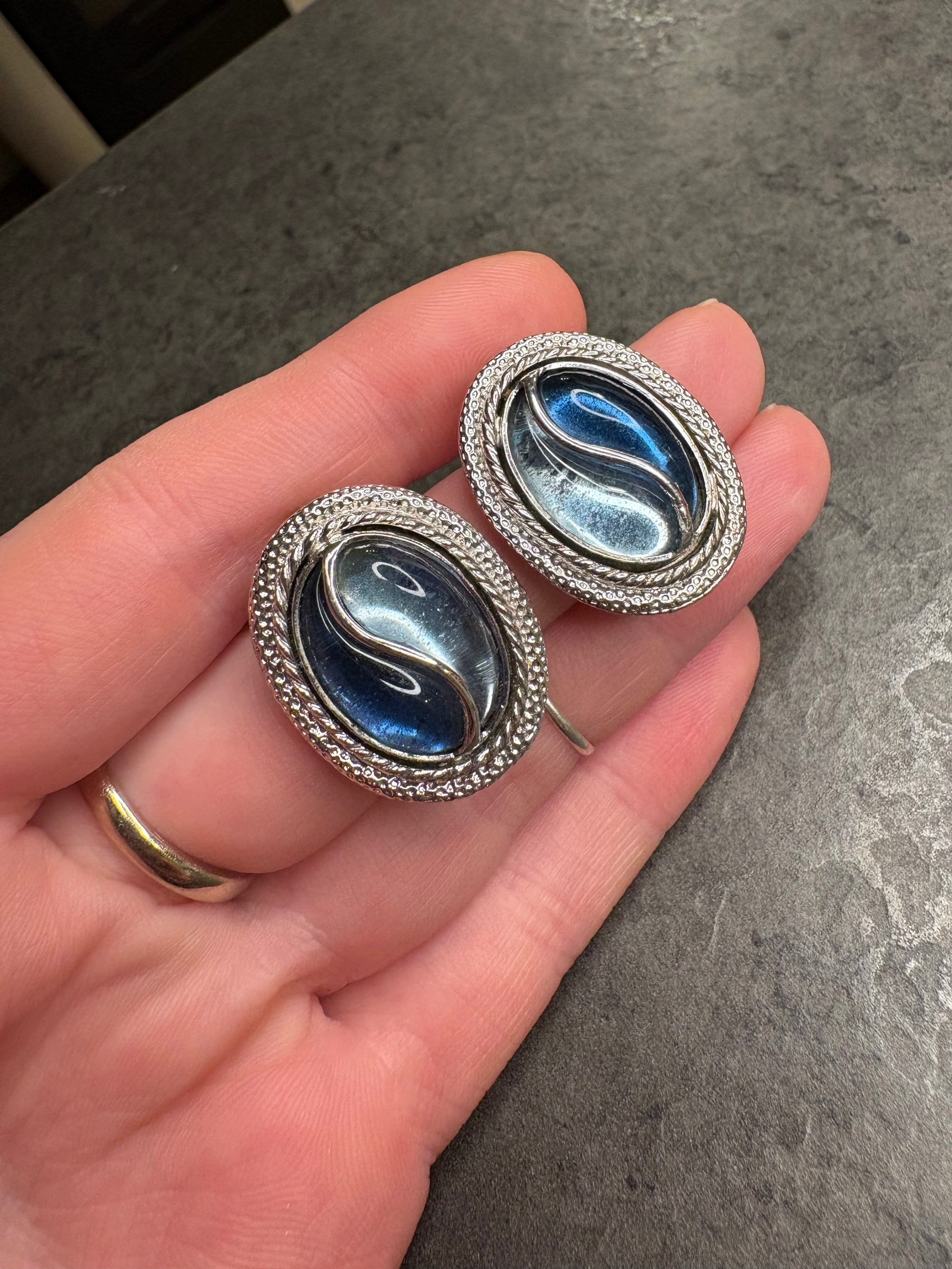 Raffinati orecchini vintage firmati Emmons, realizzati in metallo color argento con elementi ondulati in plastica nei toni dell’azzurro e del blu dal suggestivo effetto vetro. Il design è morbido, fluido e organico, chiaramente ispirato all’estetica modernista e spaziale degli anni ’60.