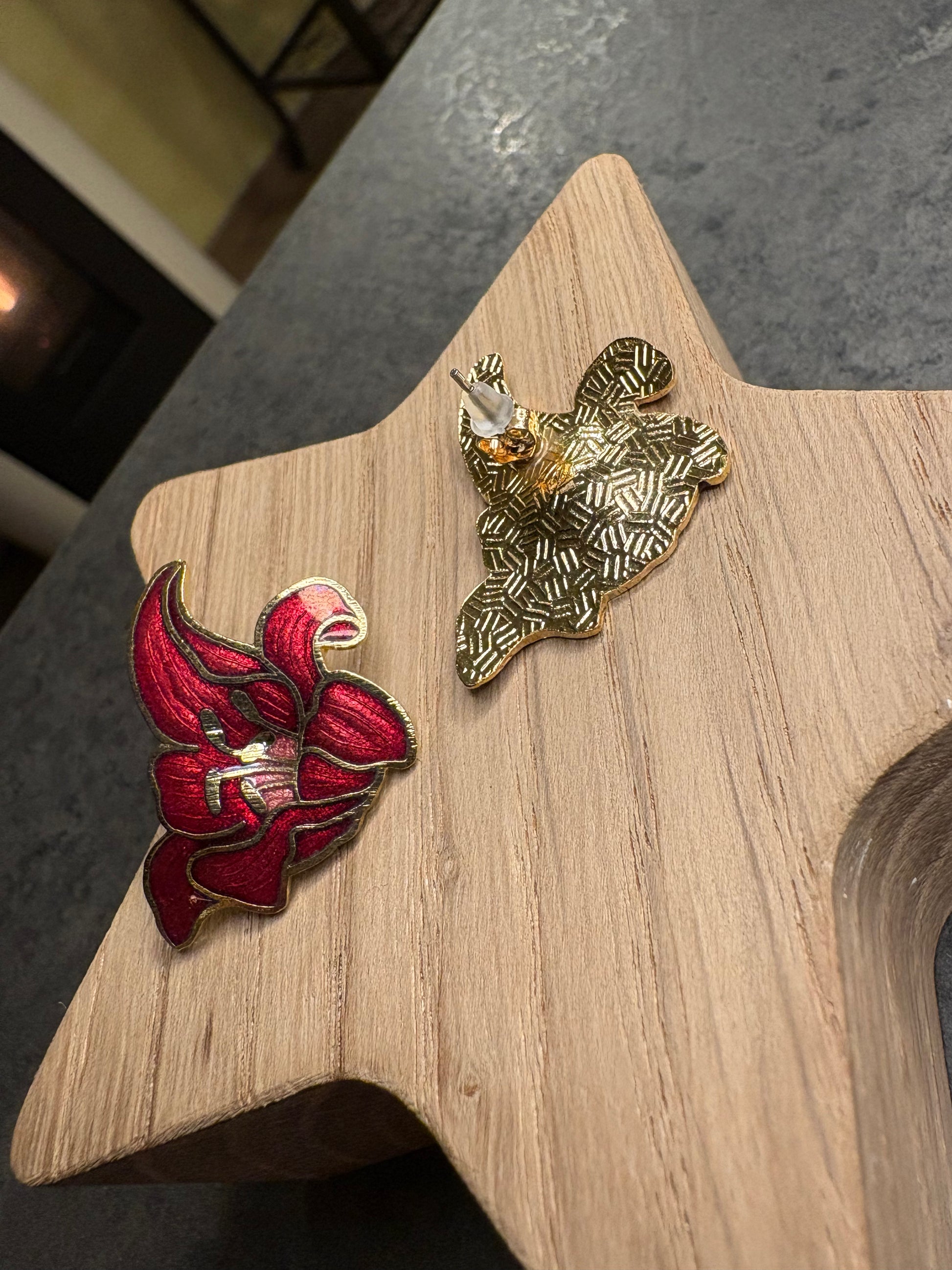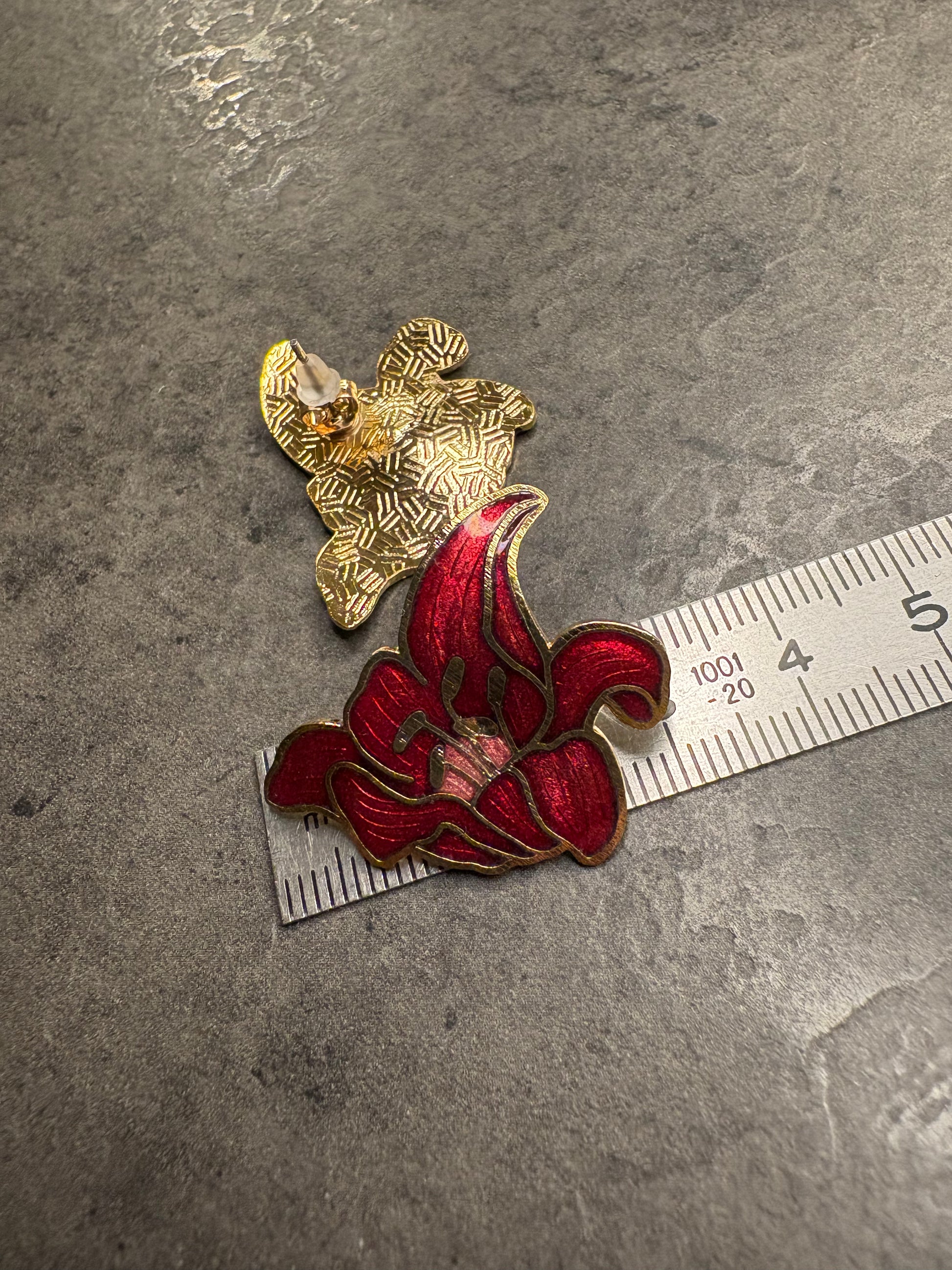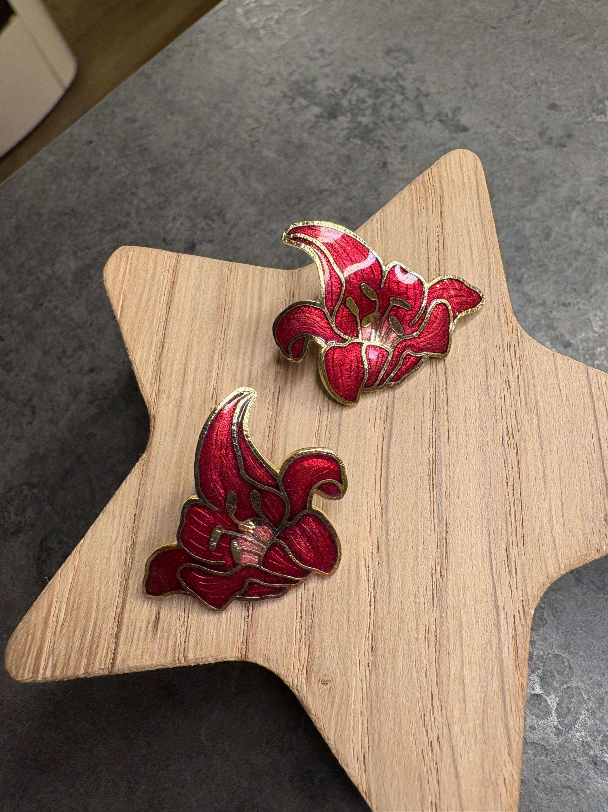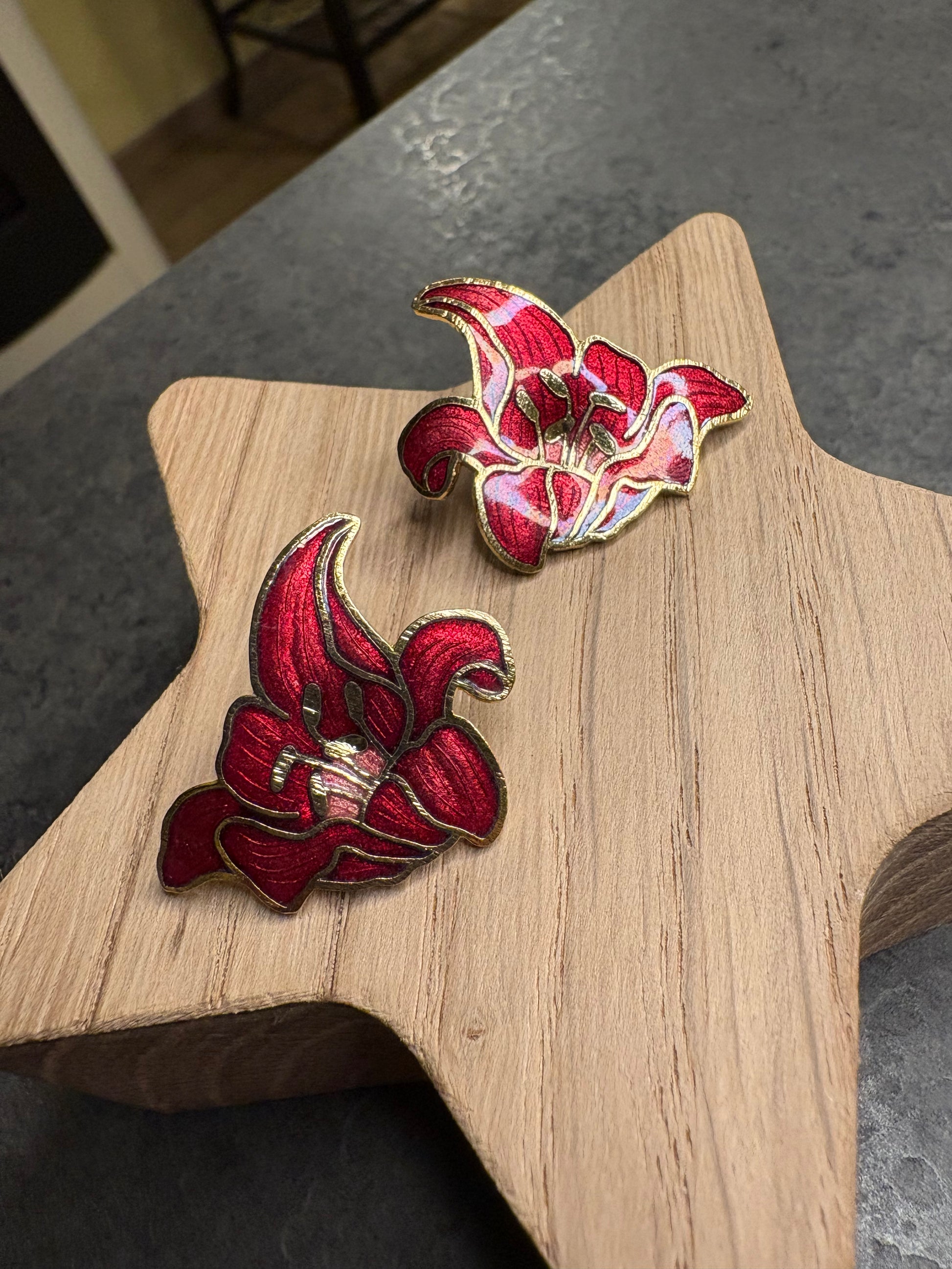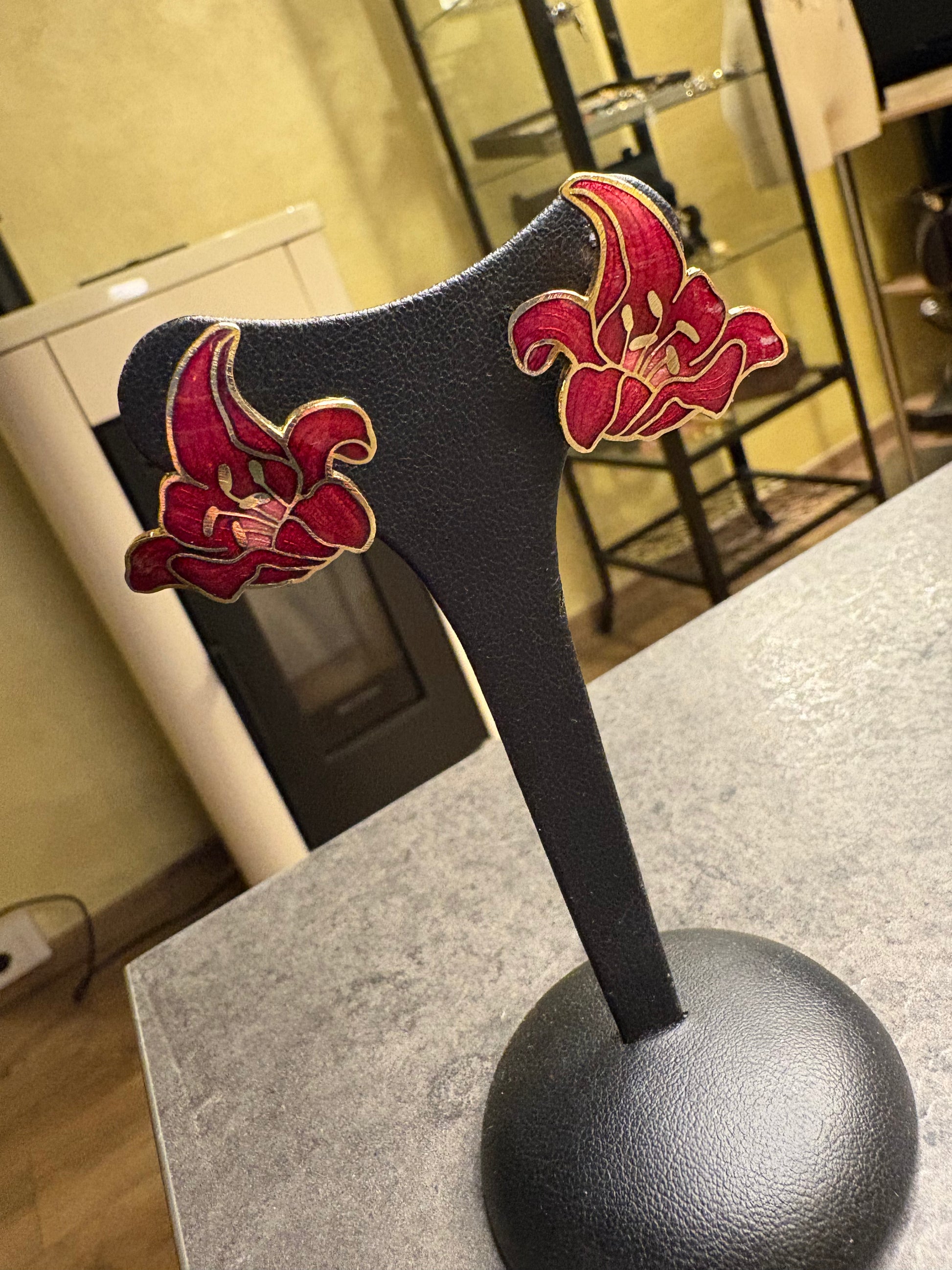 Questi meravigliosi orecchini vintage dalla forma stilizzata e sinuosa, raffigura fiori in tonalità di rosso intenso, con petali ondulati e dettagli dorati che ne definiscono i contorni. Lo smalto rosso, lucido e vibrante, è attraversato da leggere venature che donano movimento e vitalità al disegno, mentre il metallo dorato crea un elegante contrasto, valorizzando la composizione floreale.