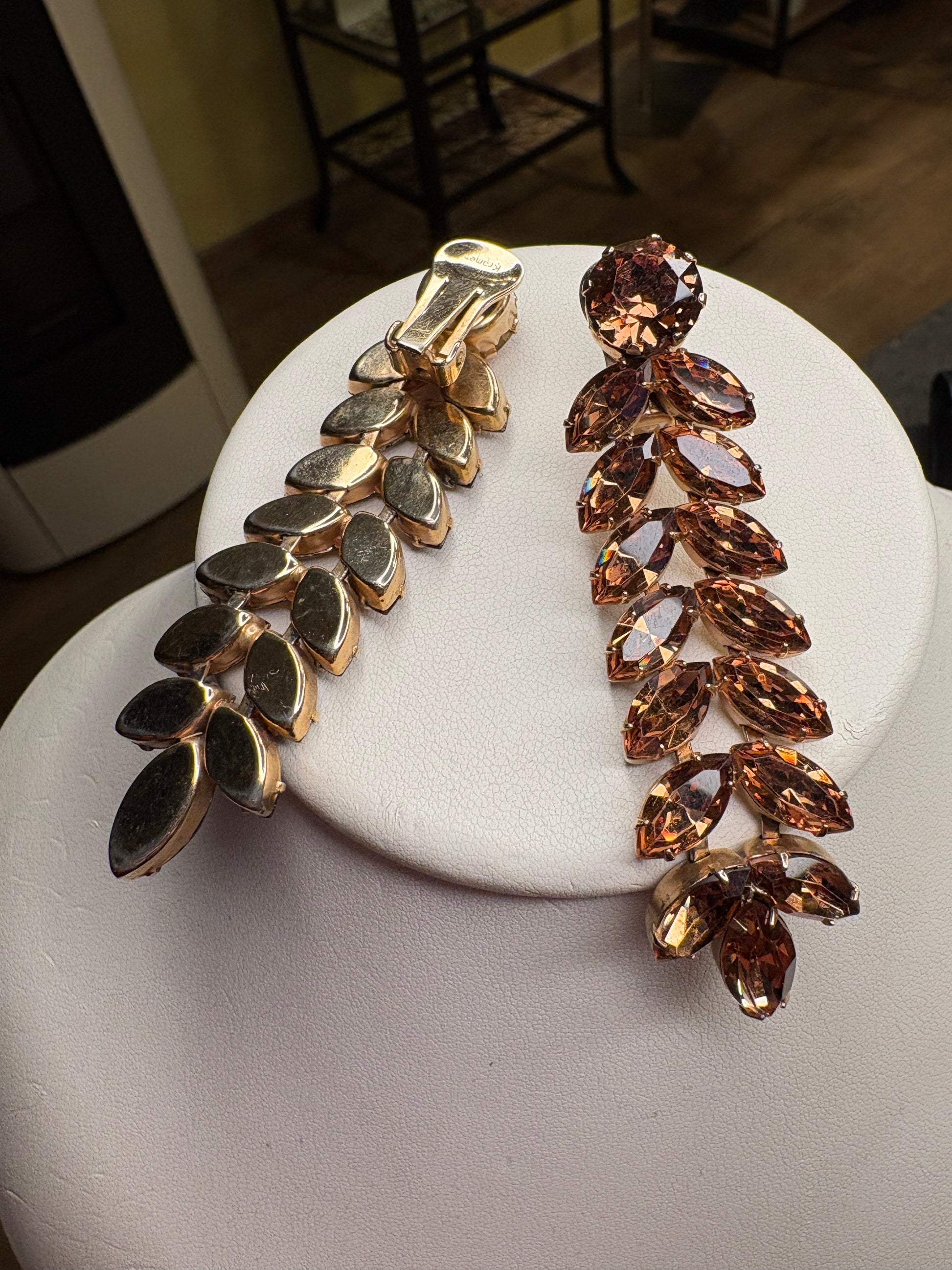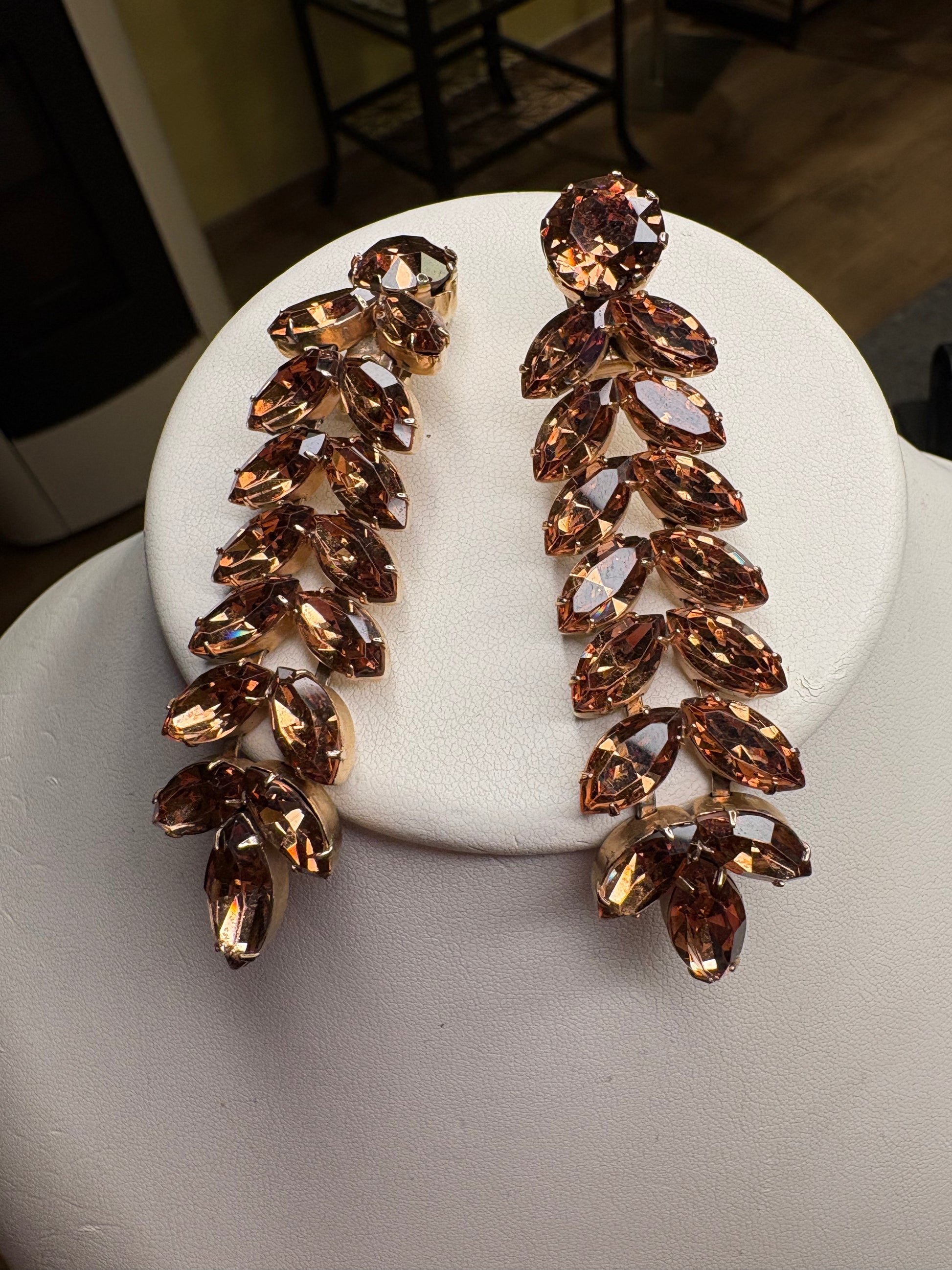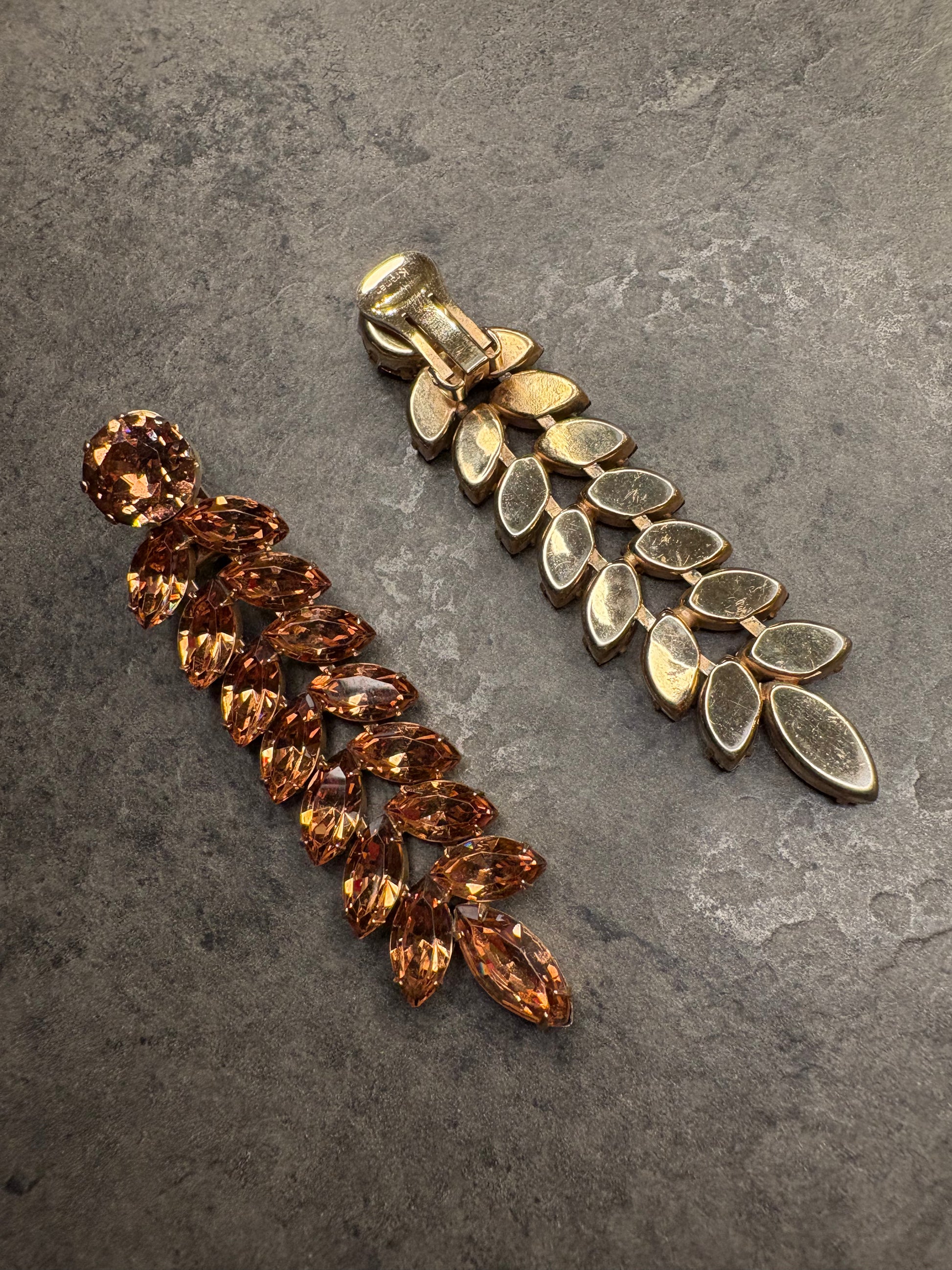 Realizzati in metallo dorato e impreziositi da una cascata di cristalli sfaccettati color topazio, taglio marquise, sono disposti con maestria per creare un elegante effetto di movimento e luminosità.
