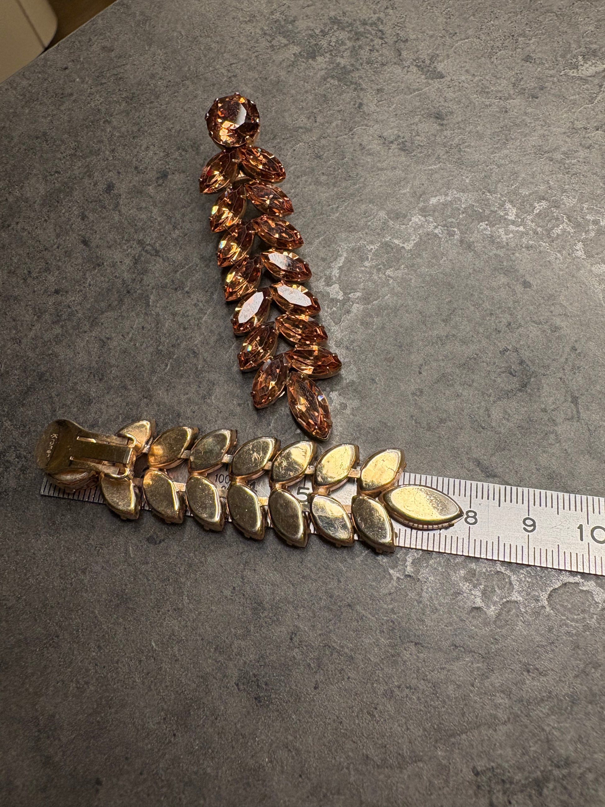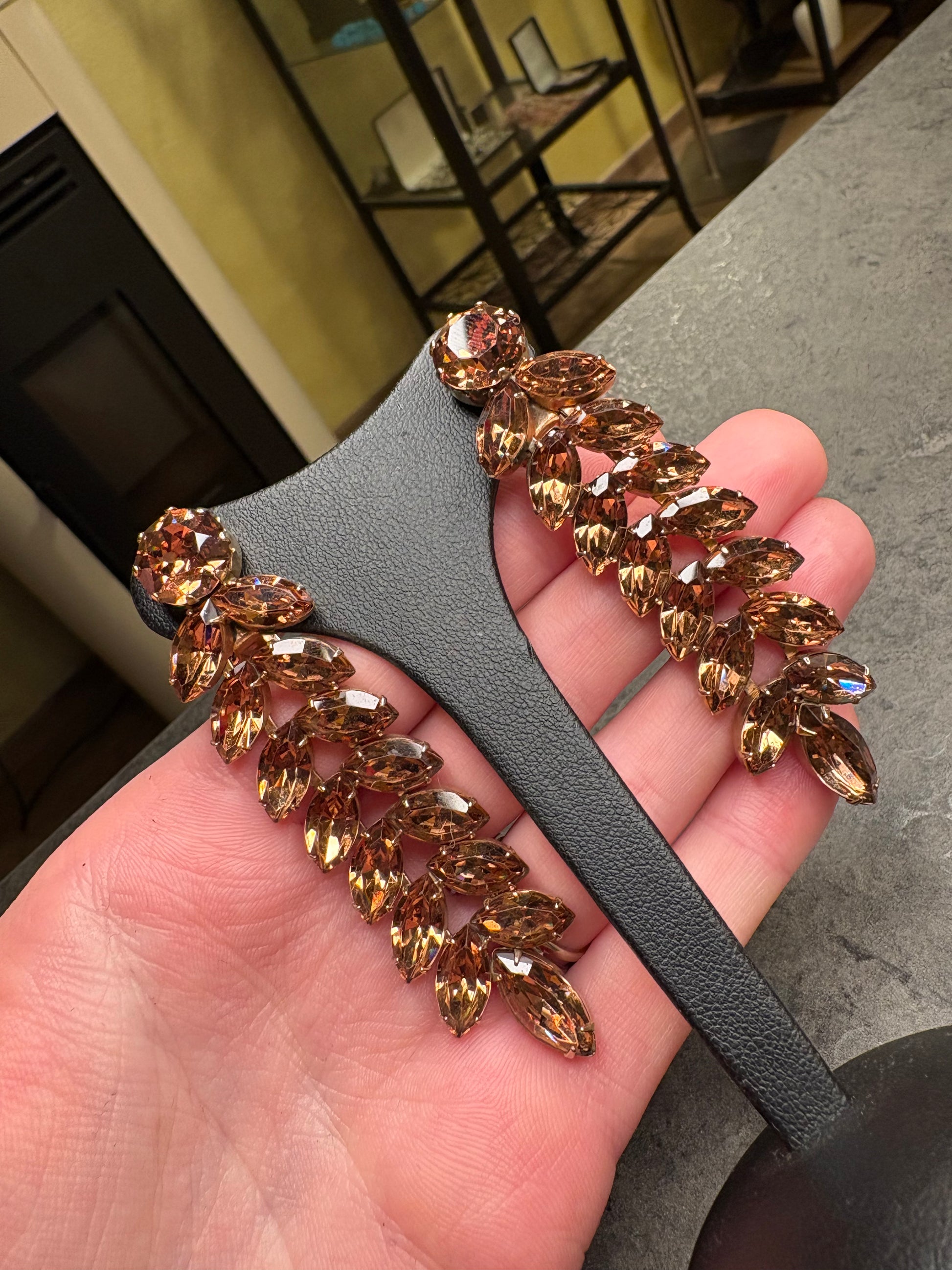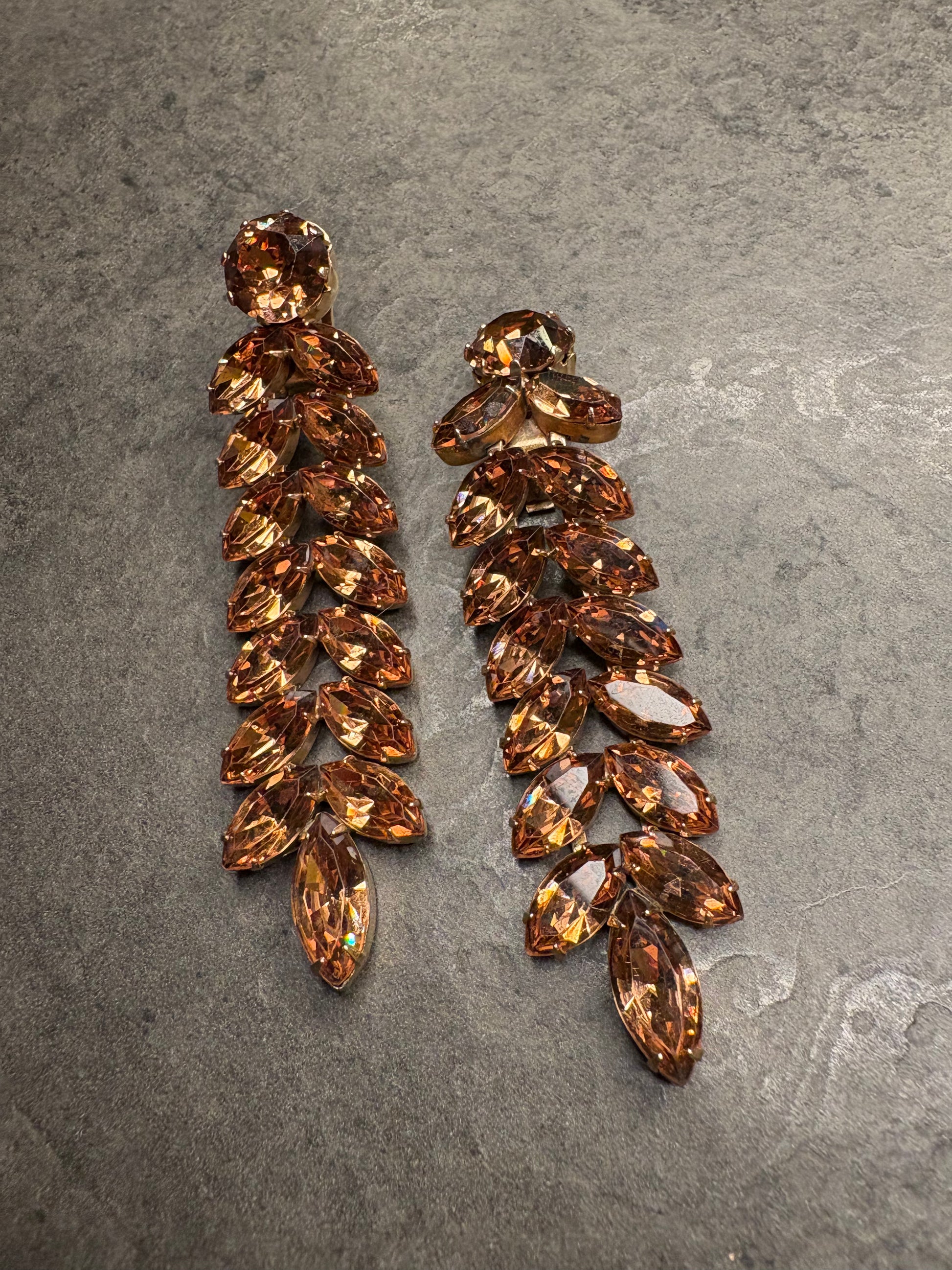 Realizzati in metallo dorato e impreziositi da una cascata di cristalli sfaccettati color topazio, taglio marquise, sono disposti con maestria per creare un elegante effetto di movimento e luminosità.