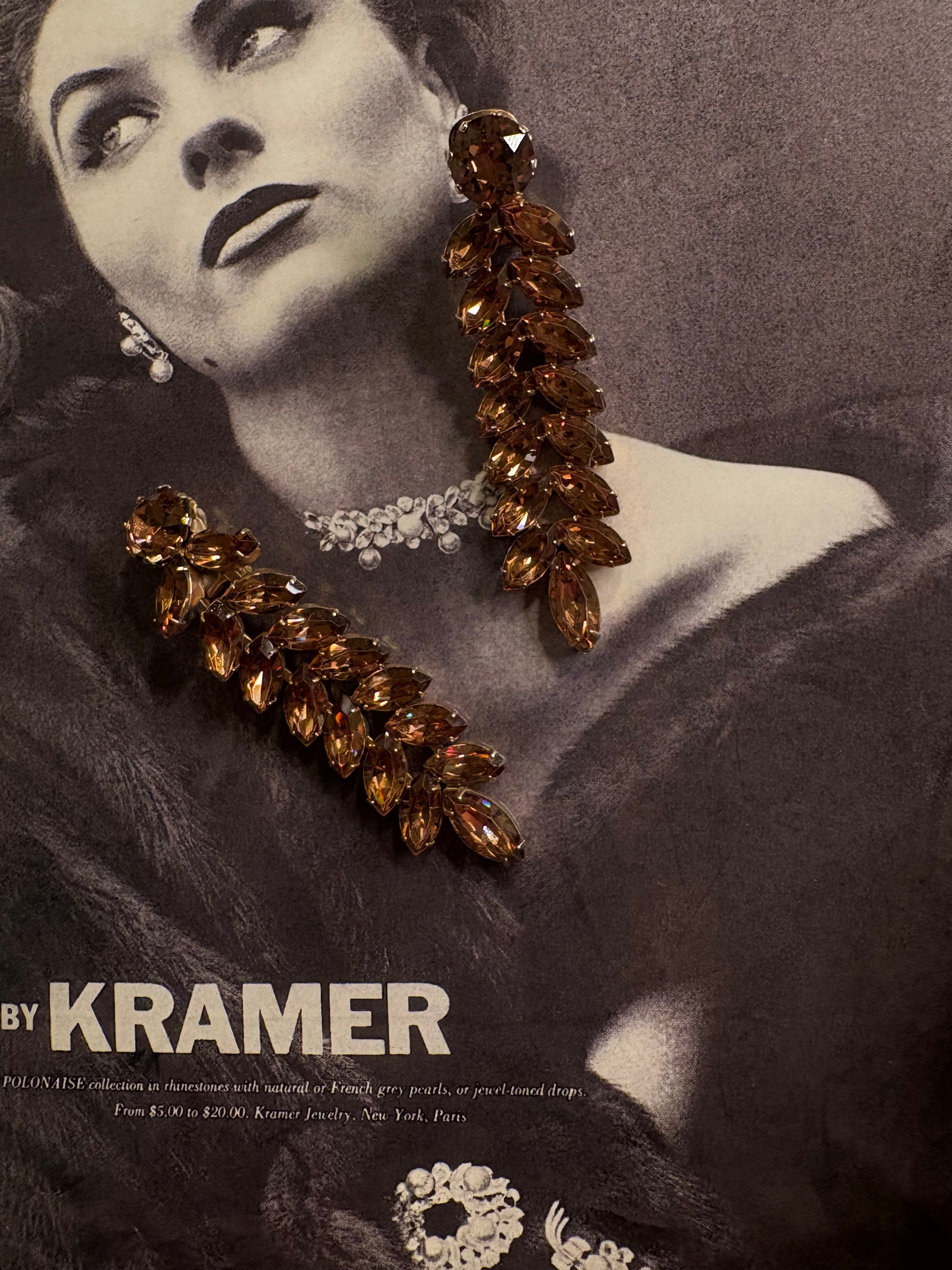 Magnifici orecchini a clip firmati Kramer, autentici capolavori di bigiotteria americana risalenti ai primi anni ’40, emblema dello stile glamour e sofisticato dell’epoca.