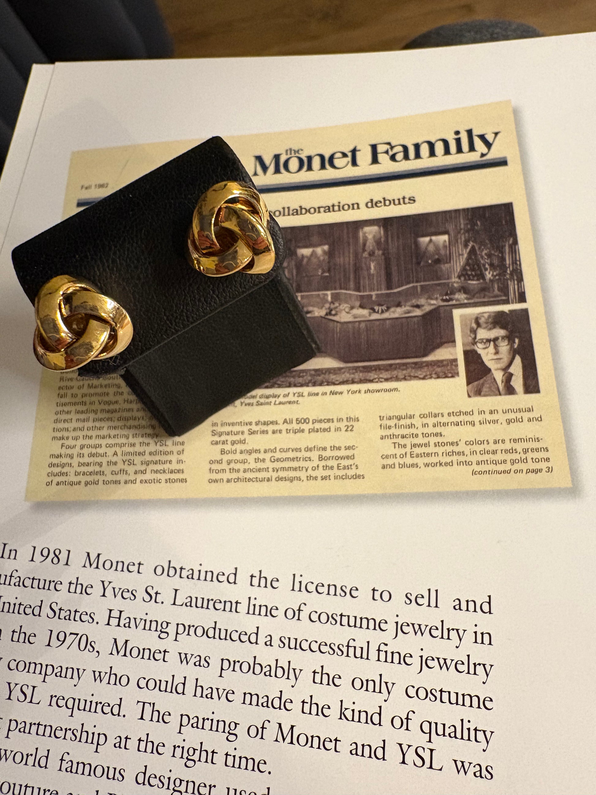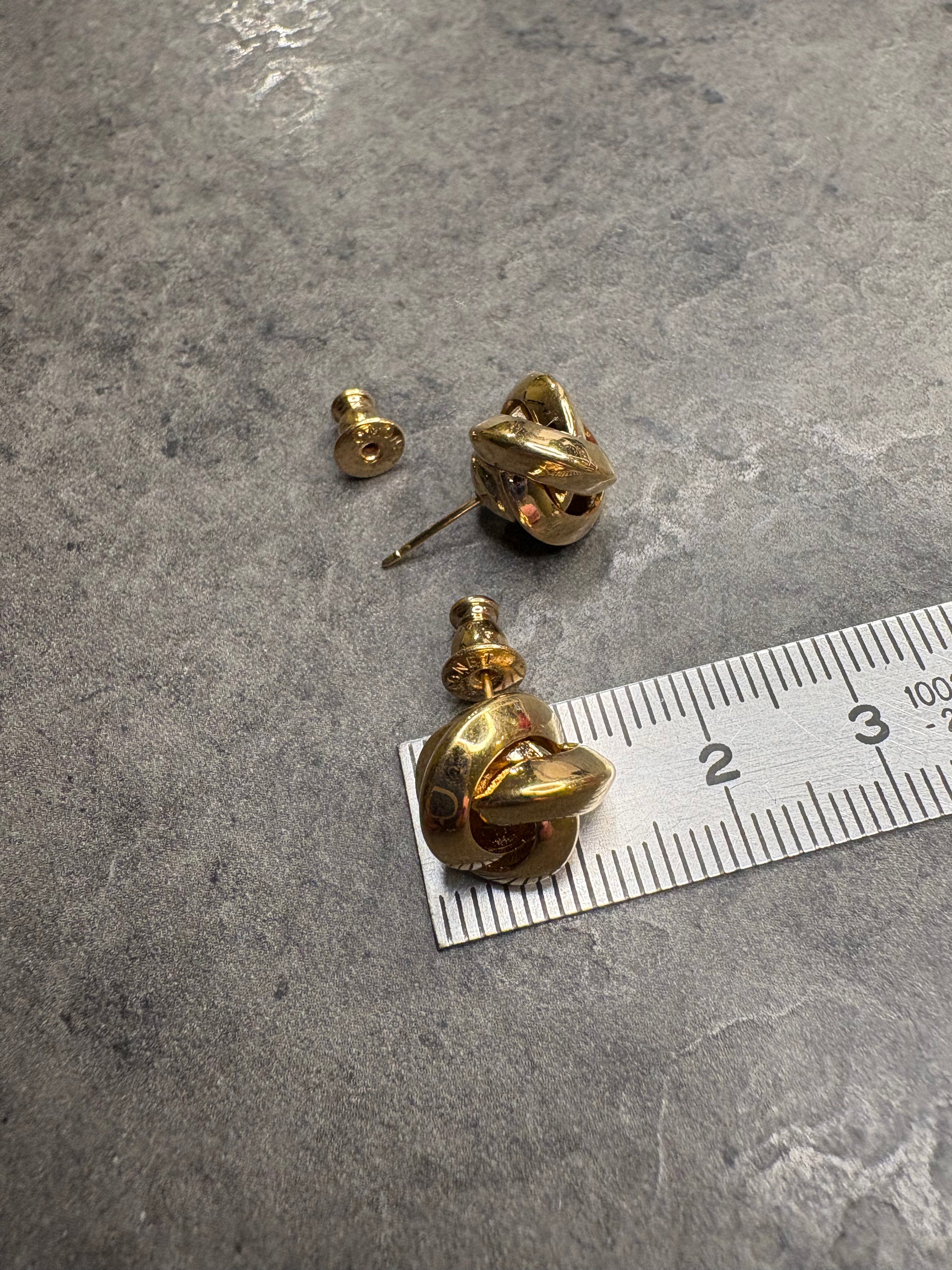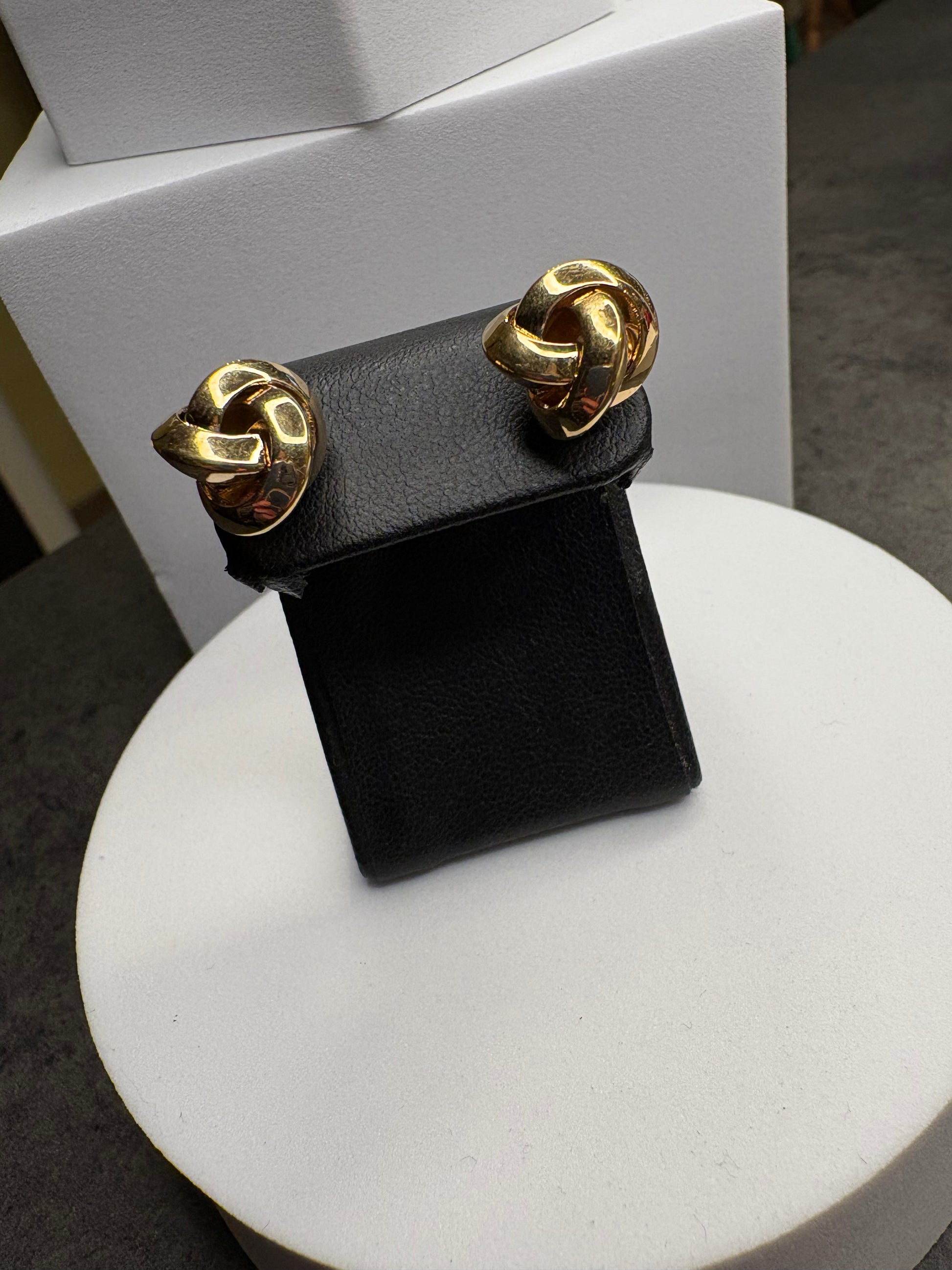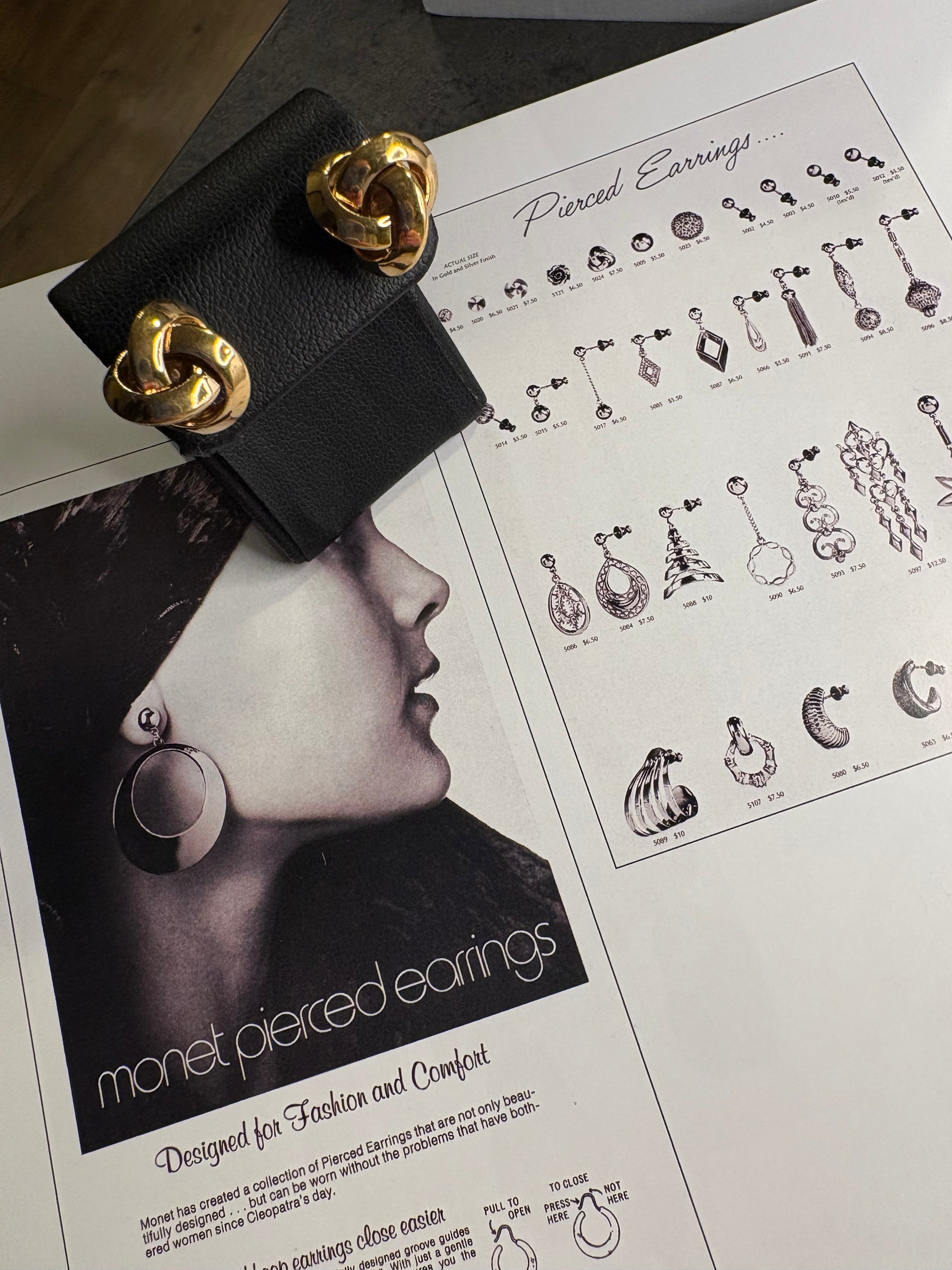 Eleganti orecchini vintage firmati Monet, pensati per lobi forati, caratterizzati da un raffinato motivo a nodo in metallo dorato lucido.