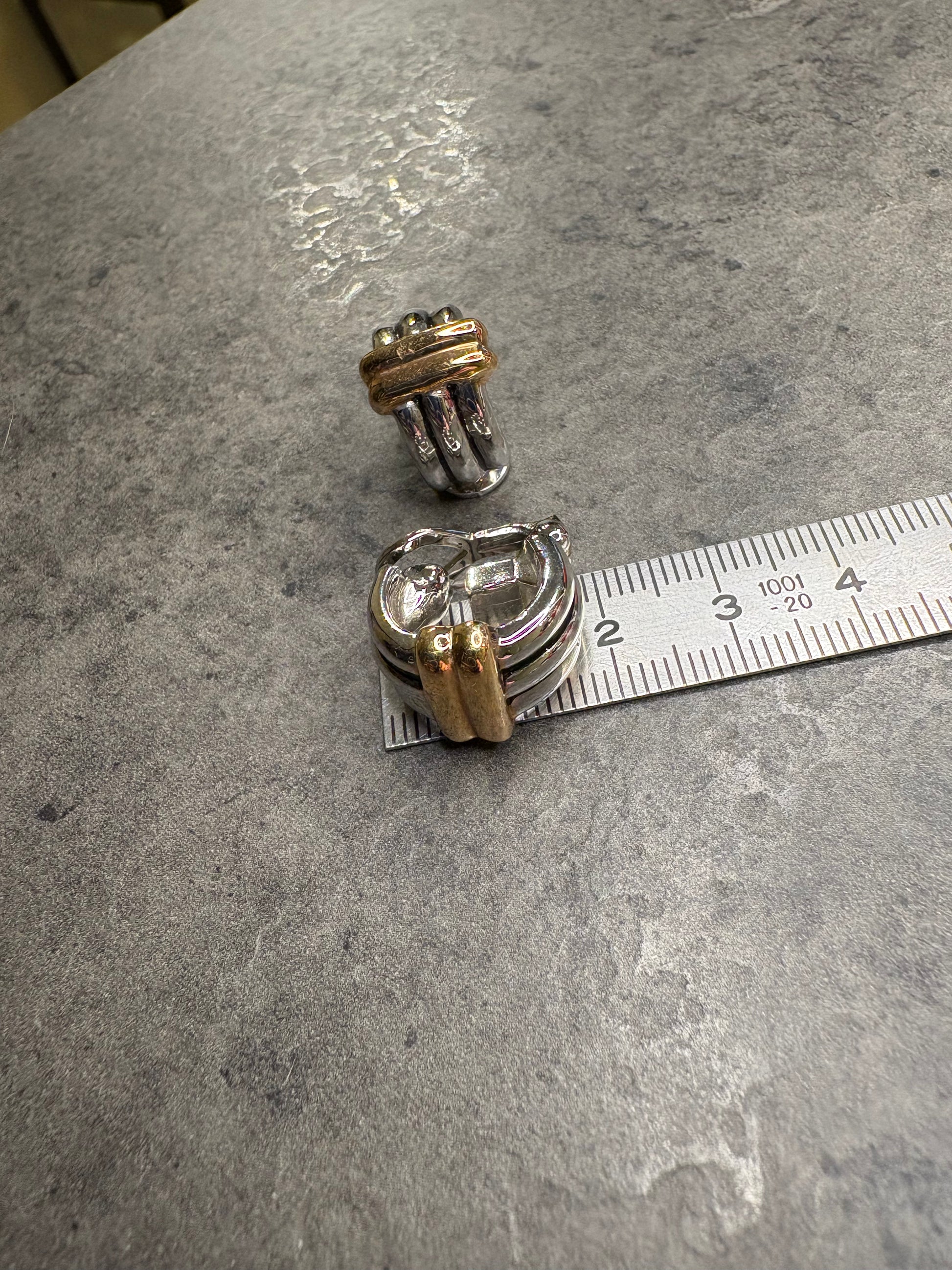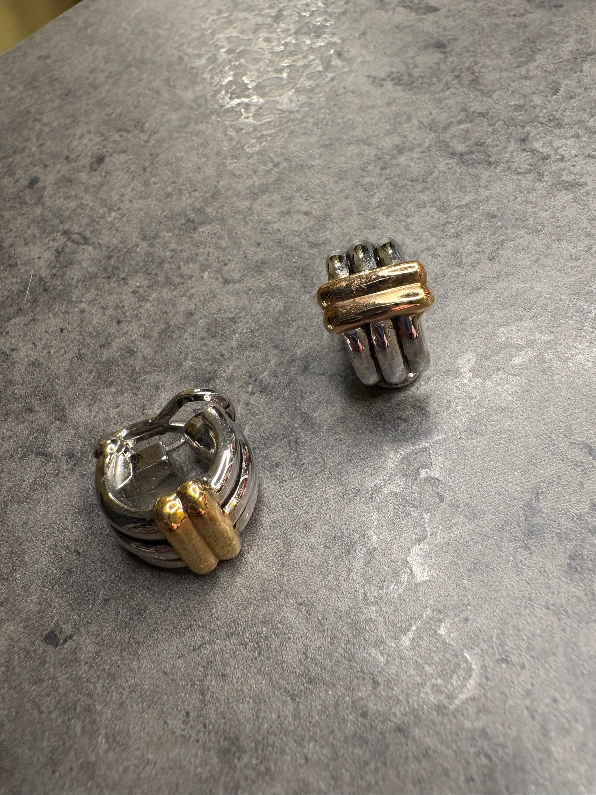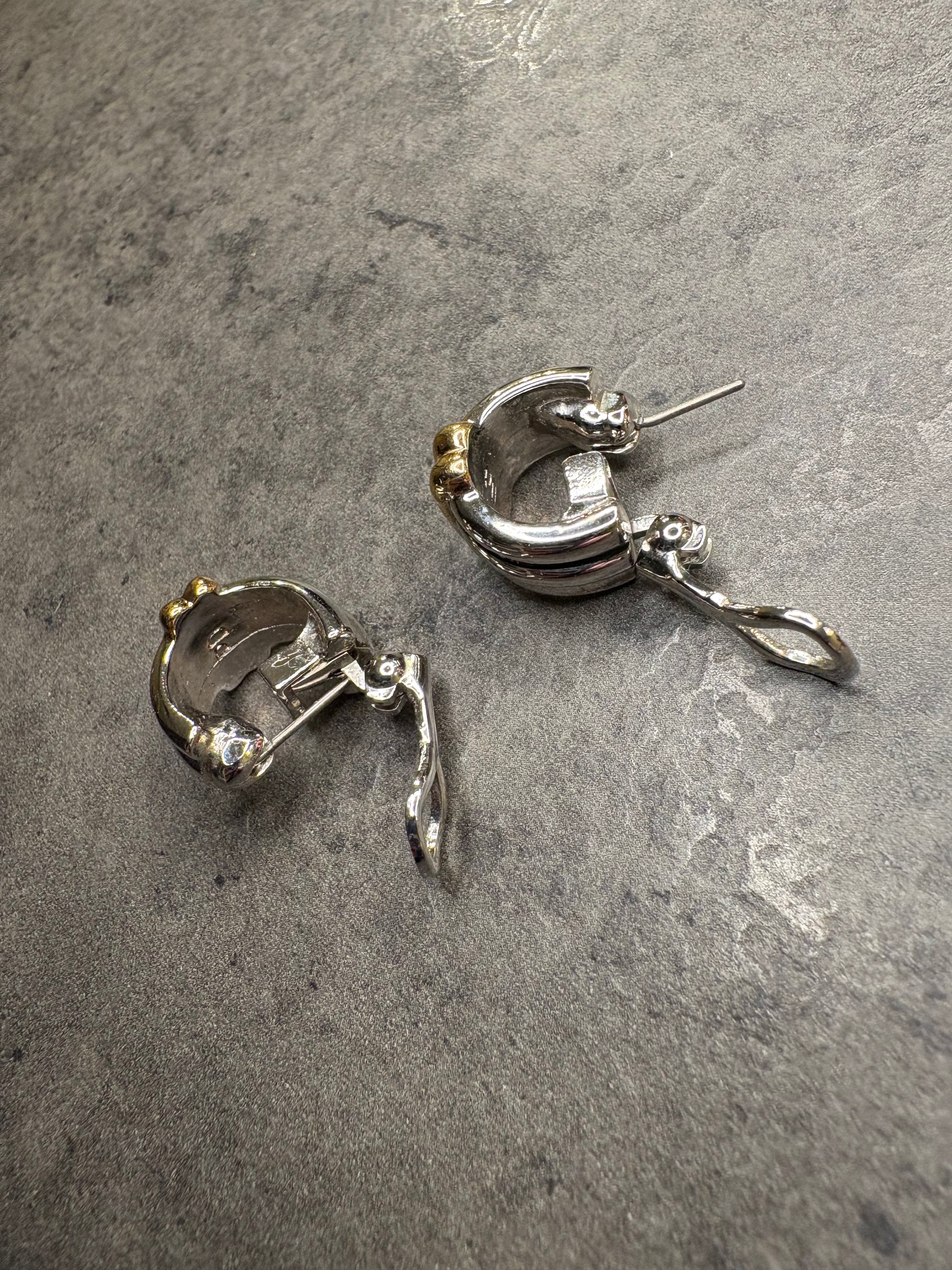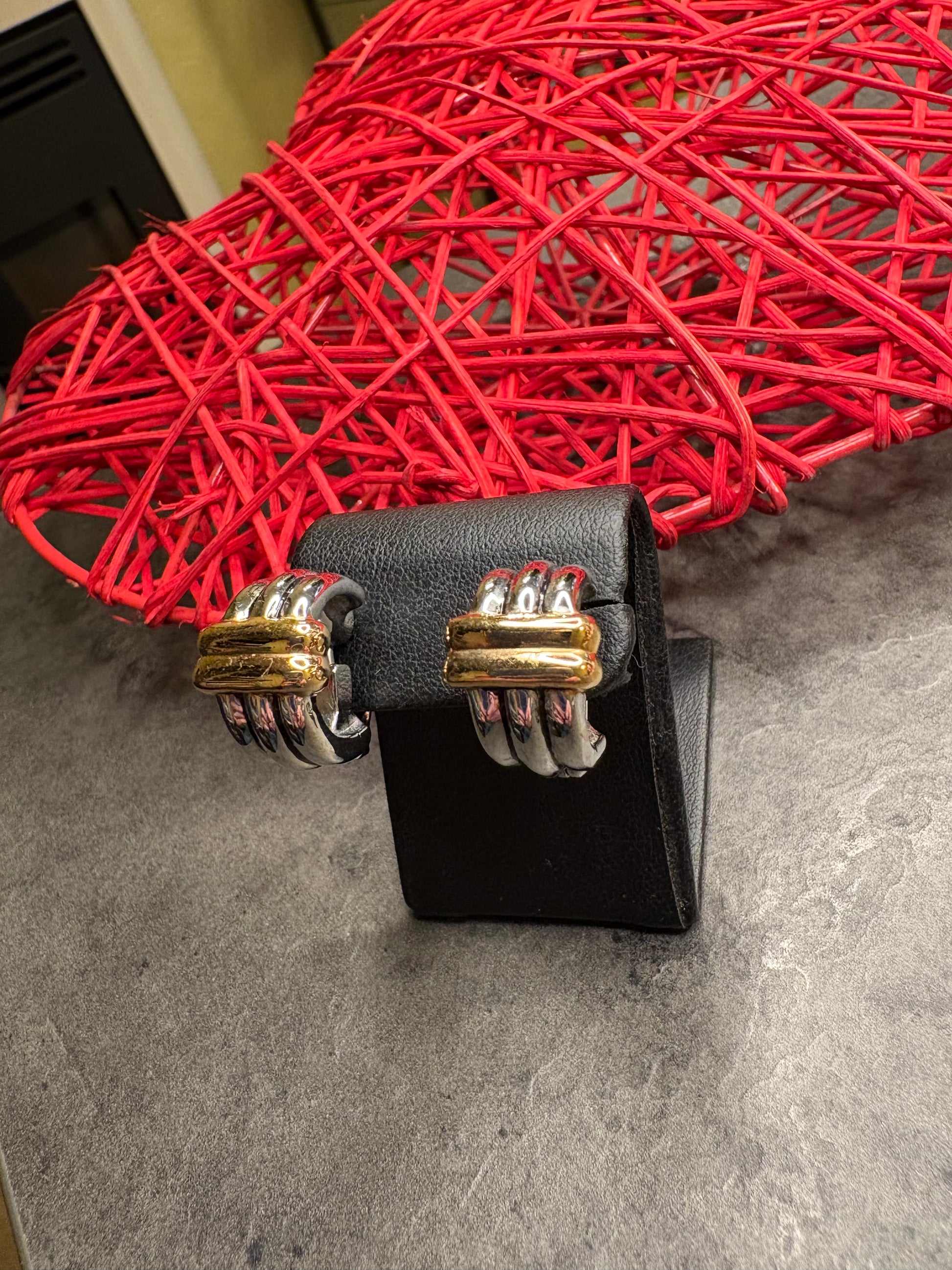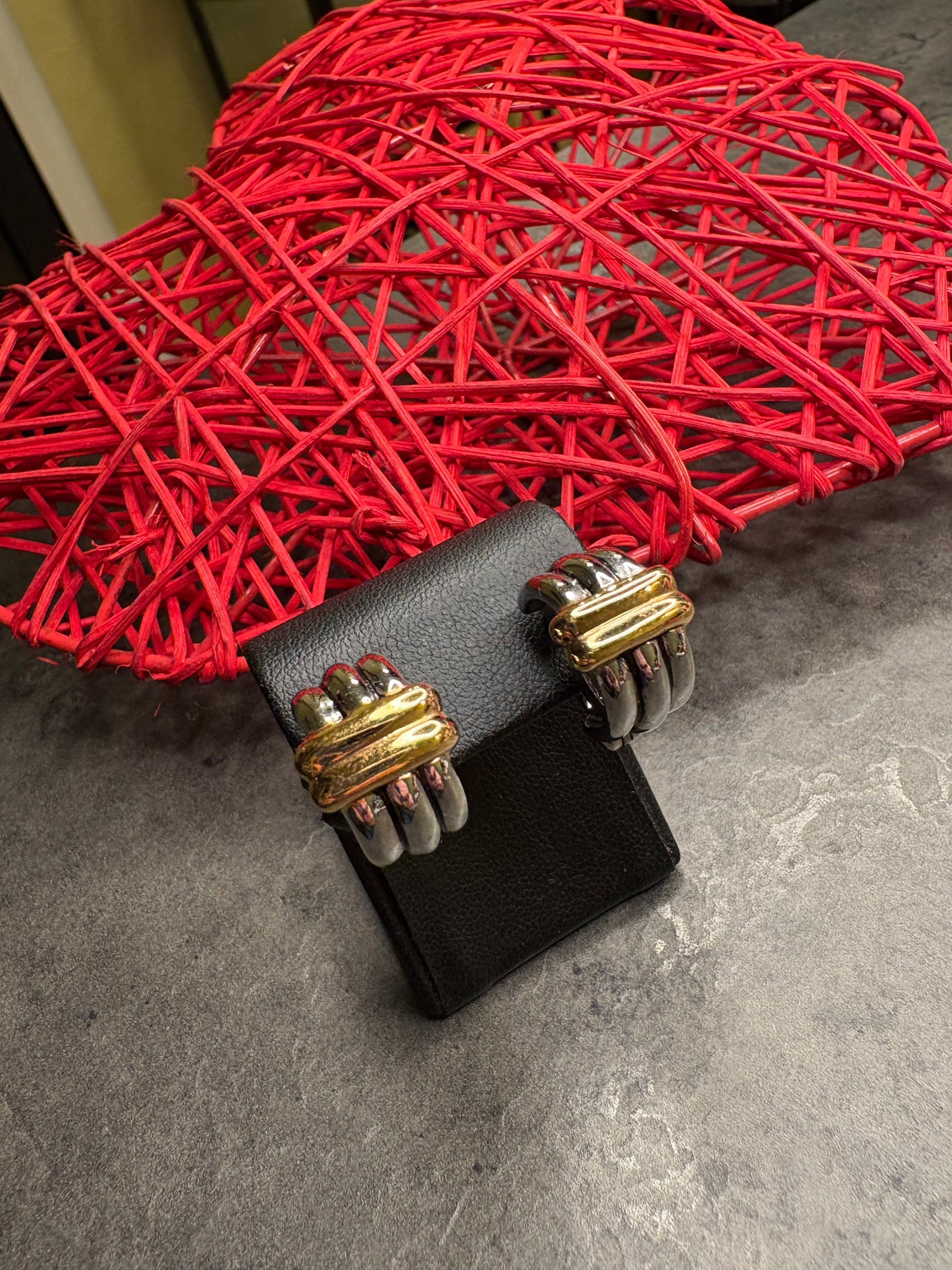 Eleganti e originali, questi orecchini vintage firmati Premier Design si distinguono per il loro design deciso e sofisticato. Realizzati in metallo color argento lucido, presentano un raffinato dettaglio centrale dorato che crea un elegante contrasto di tonalità e riflessi.