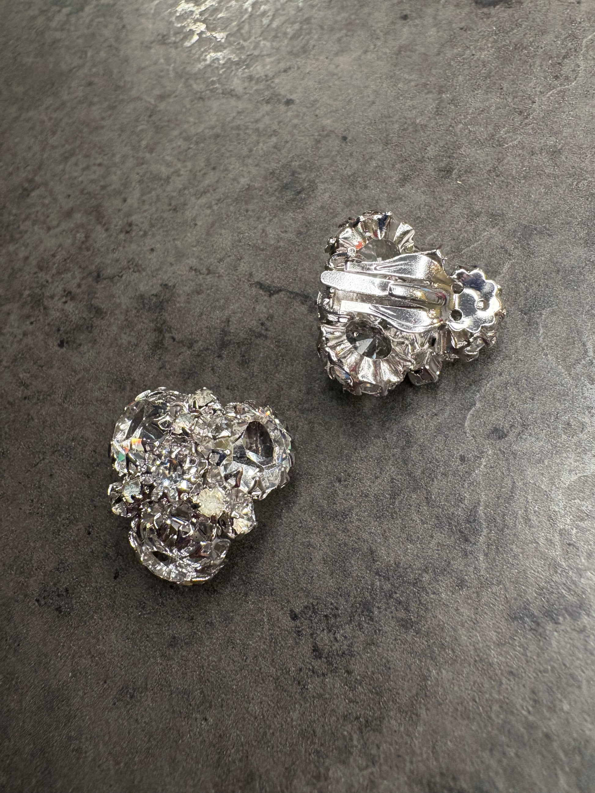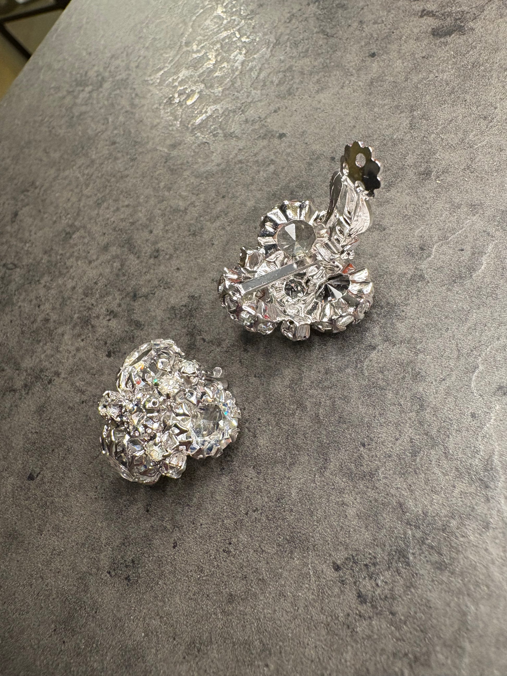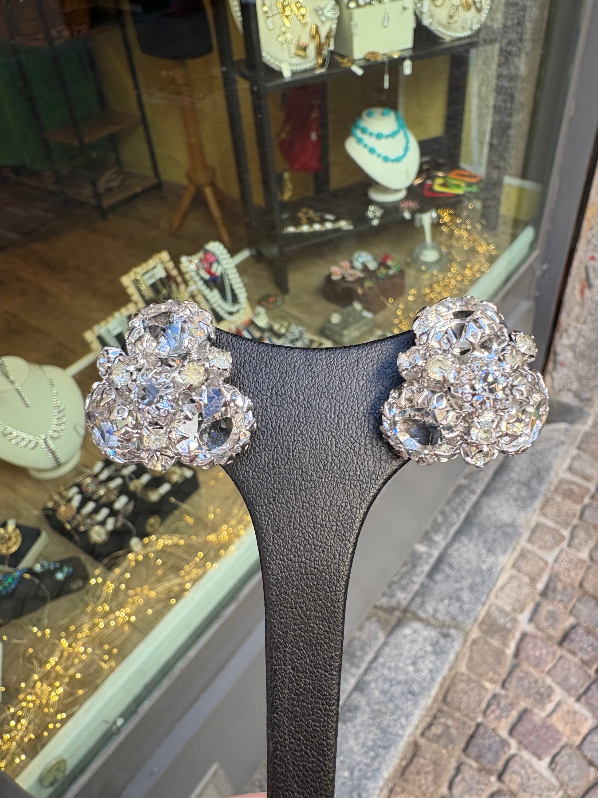 Questi orecchini vintage a clip racchiudono tutta la magia dei gioielli d’epoca. La montatura in metallo argentato lucido fa da cornice a un trionfo di cristalli che catturano la luce in ogni angolazione.