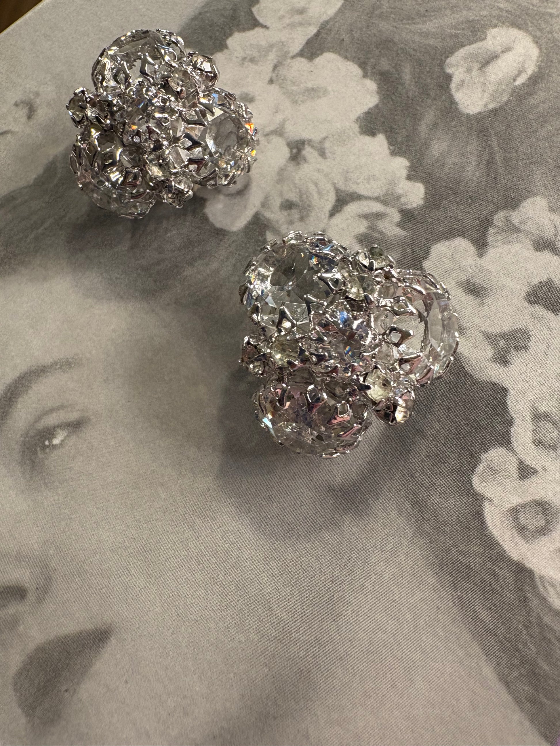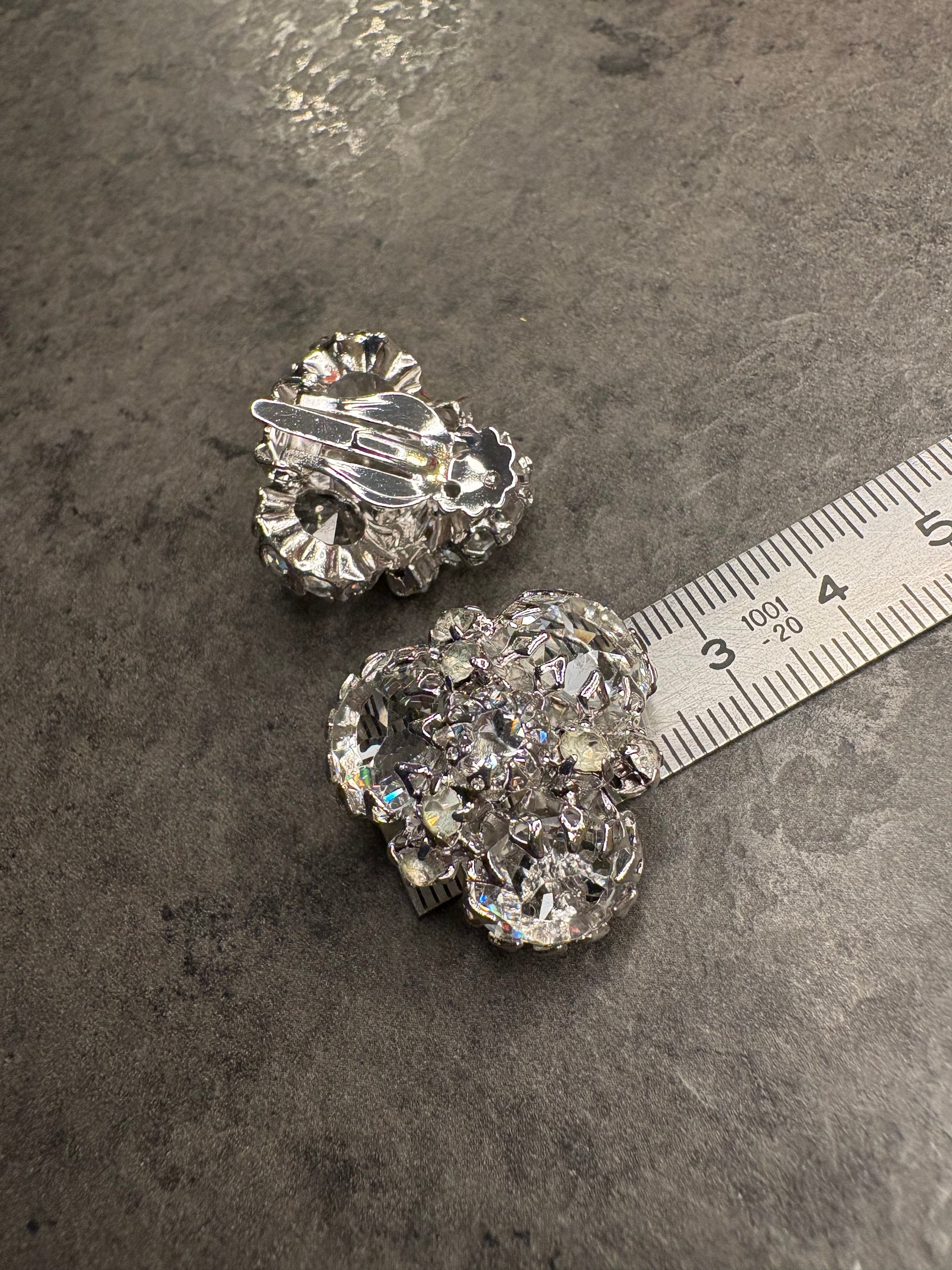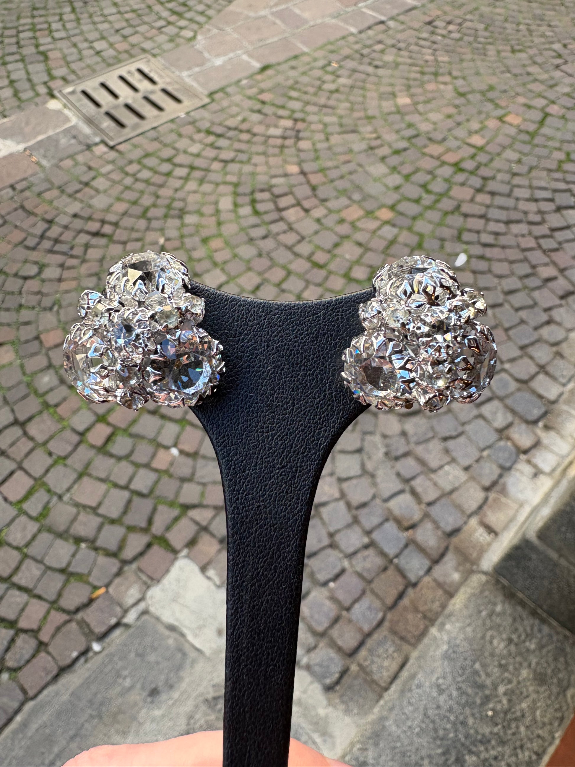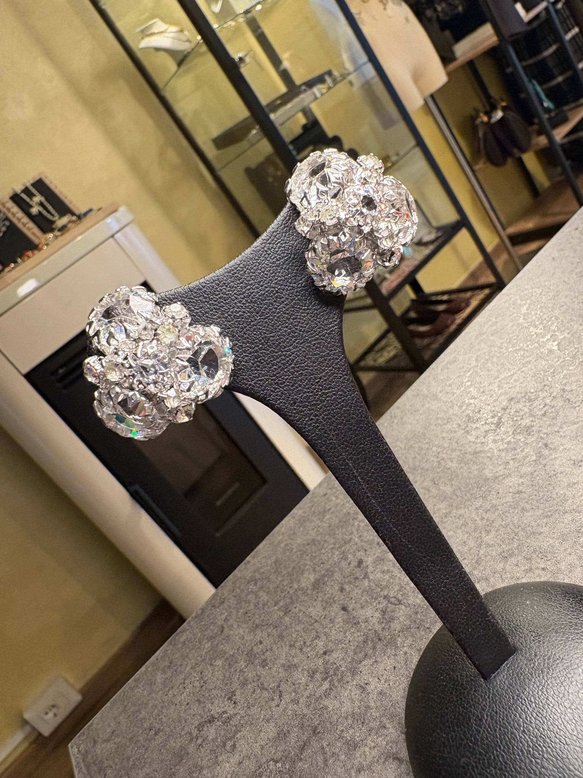 Questi orecchini vintage a clip racchiudono tutta la magia dei gioielli d’epoca. La montatura in metallo argentato lucido fa da cornice a un trionfo di cristalli che catturano la luce in ogni angolazione.
