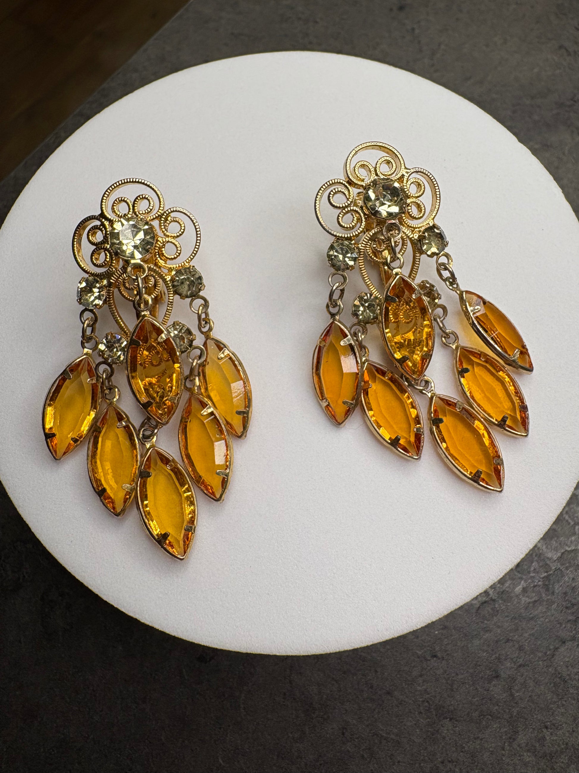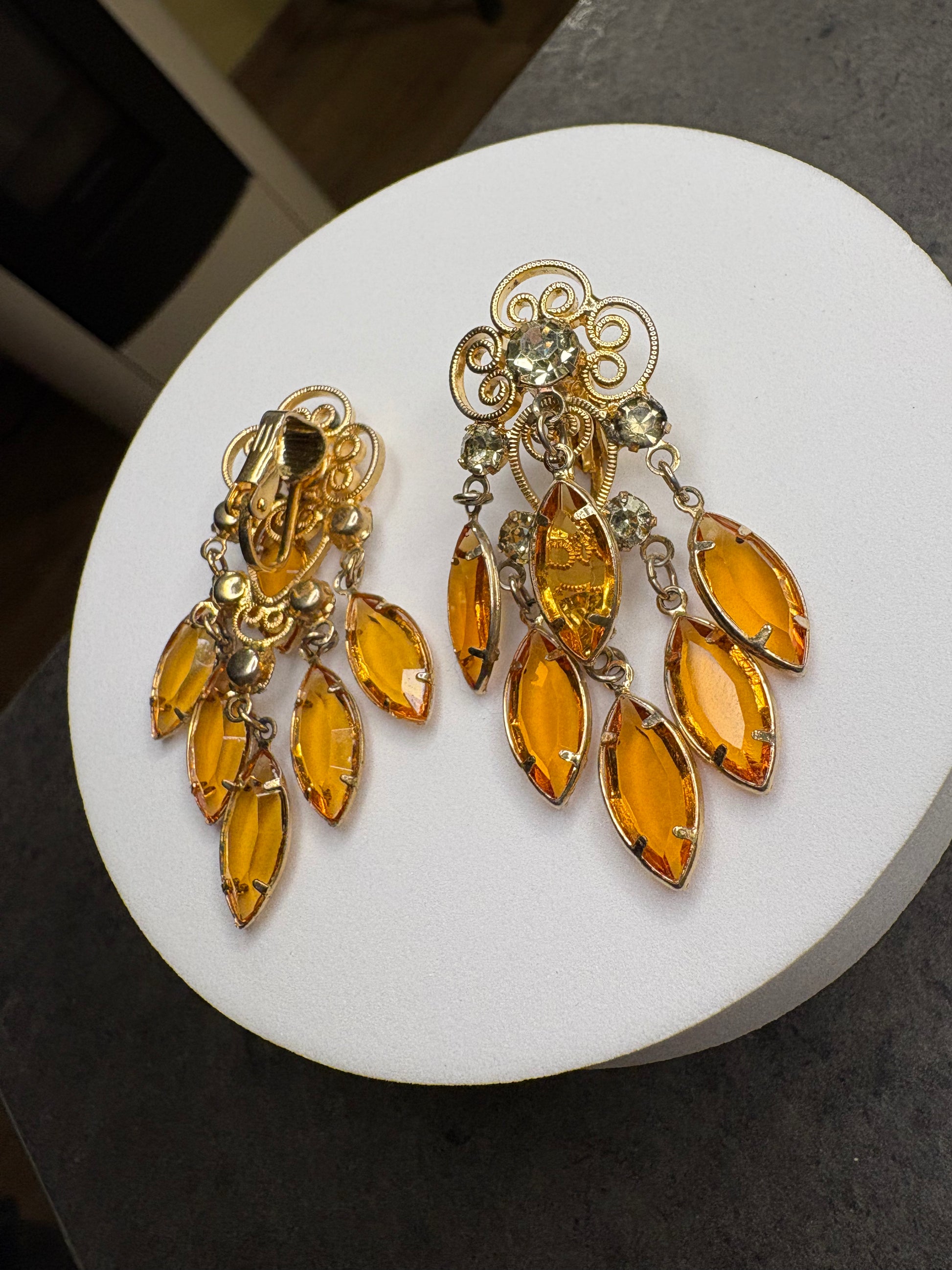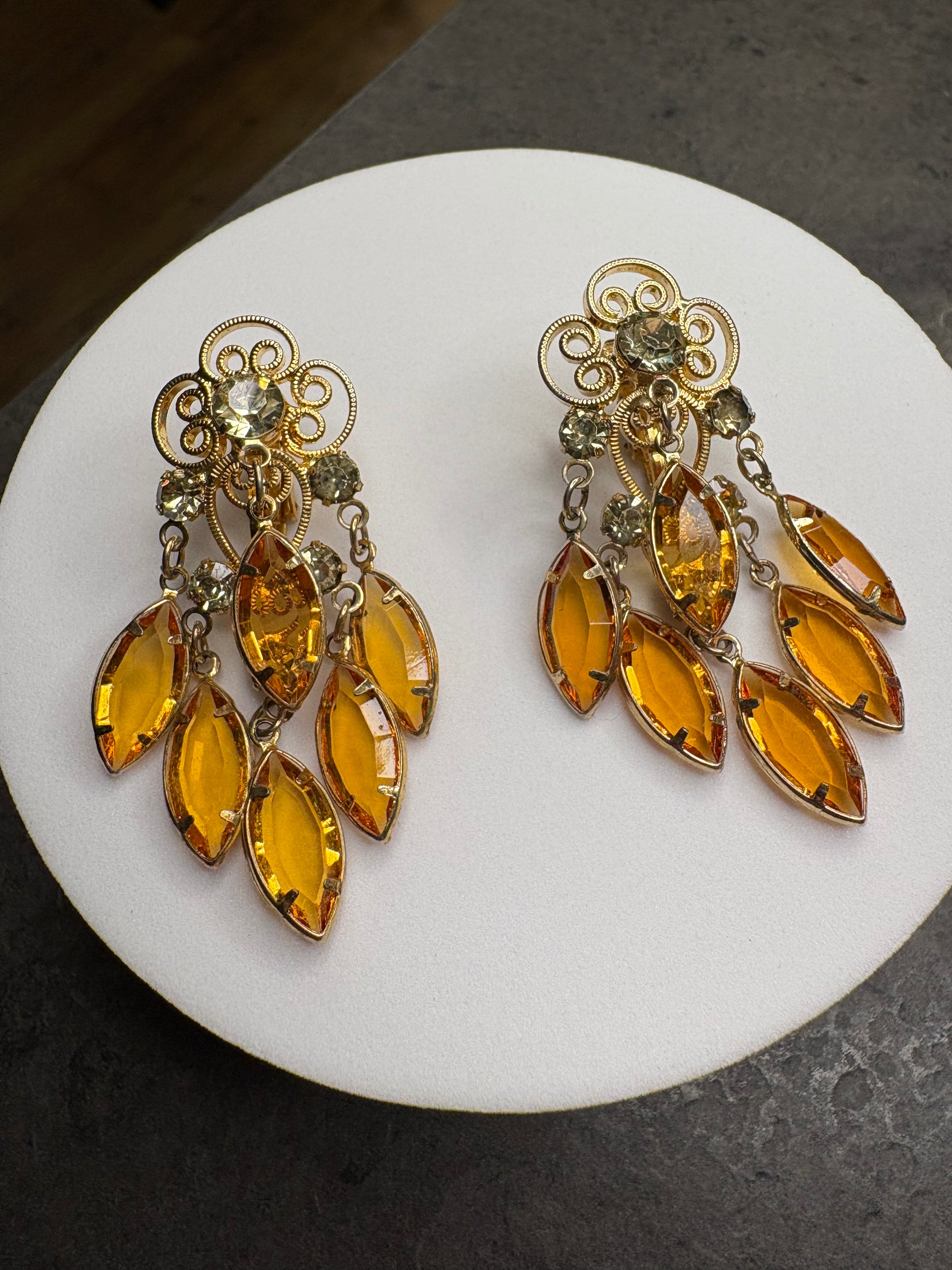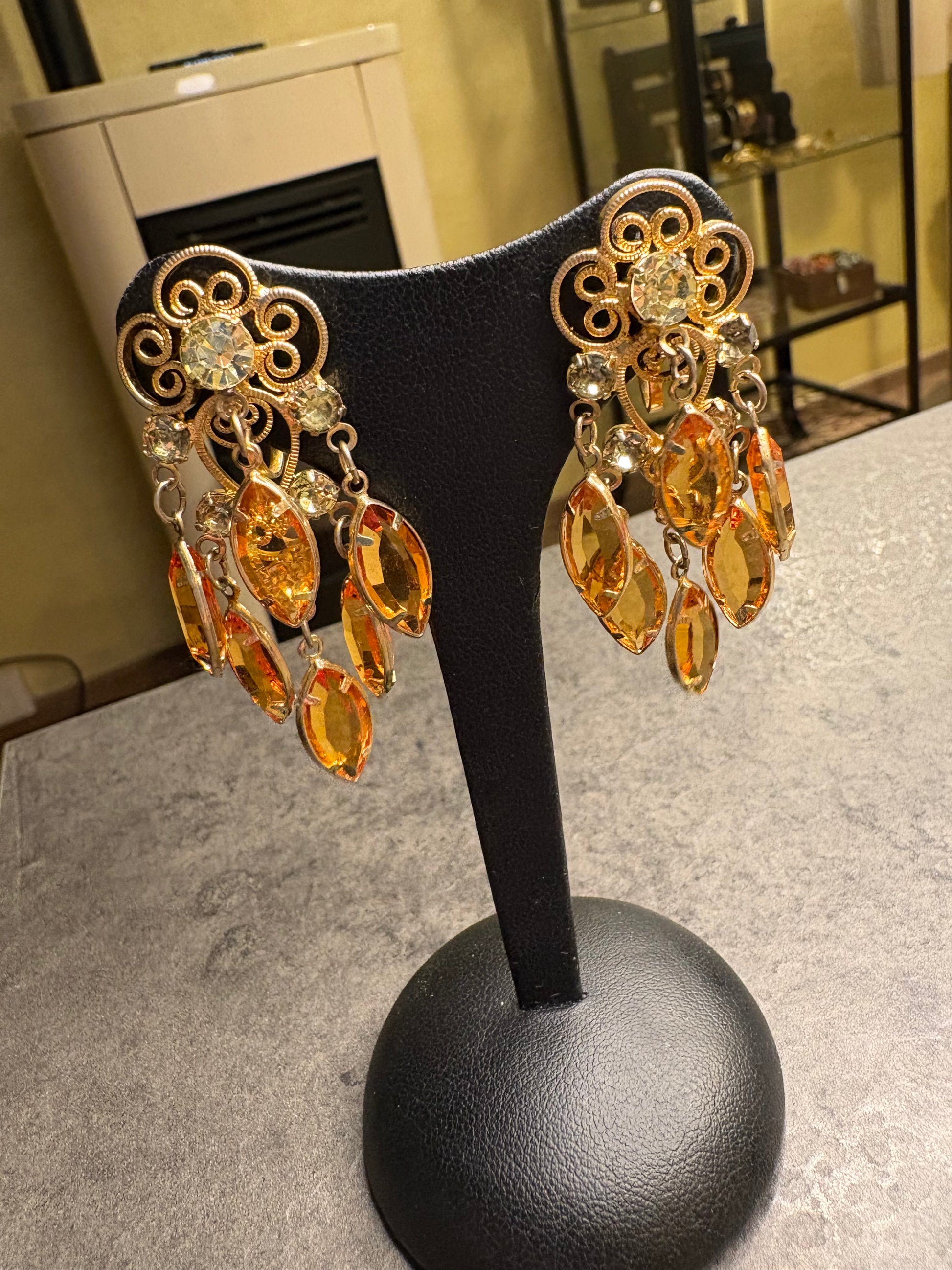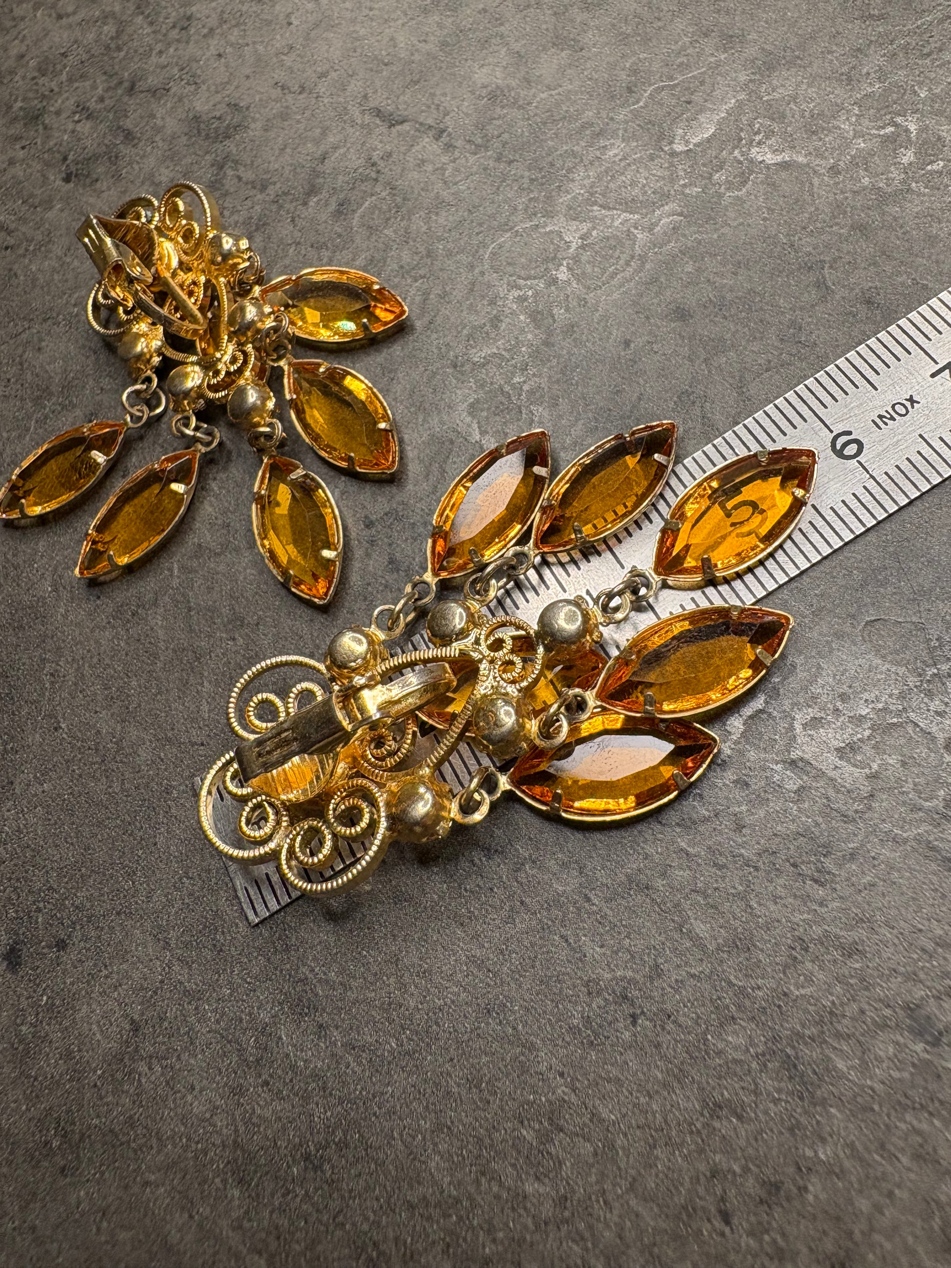 Eleganti orecchini a clip vintage degli anni ’50–’60, realizzati in metallo dorato con lavorazione raffinata e grande attenzione ai dettagli. Il modello presenta una struttura filigranata finemente traforata, impreziosita da cristalli chiari taglio brillante, da cui scendono elementi pendenti con grandi cristalli color ambra dal taglio marquise in montatura bezel. Il movimento dei pendenti dona luce e dinamismo, rendendoli estremamente scenografici e femminili.