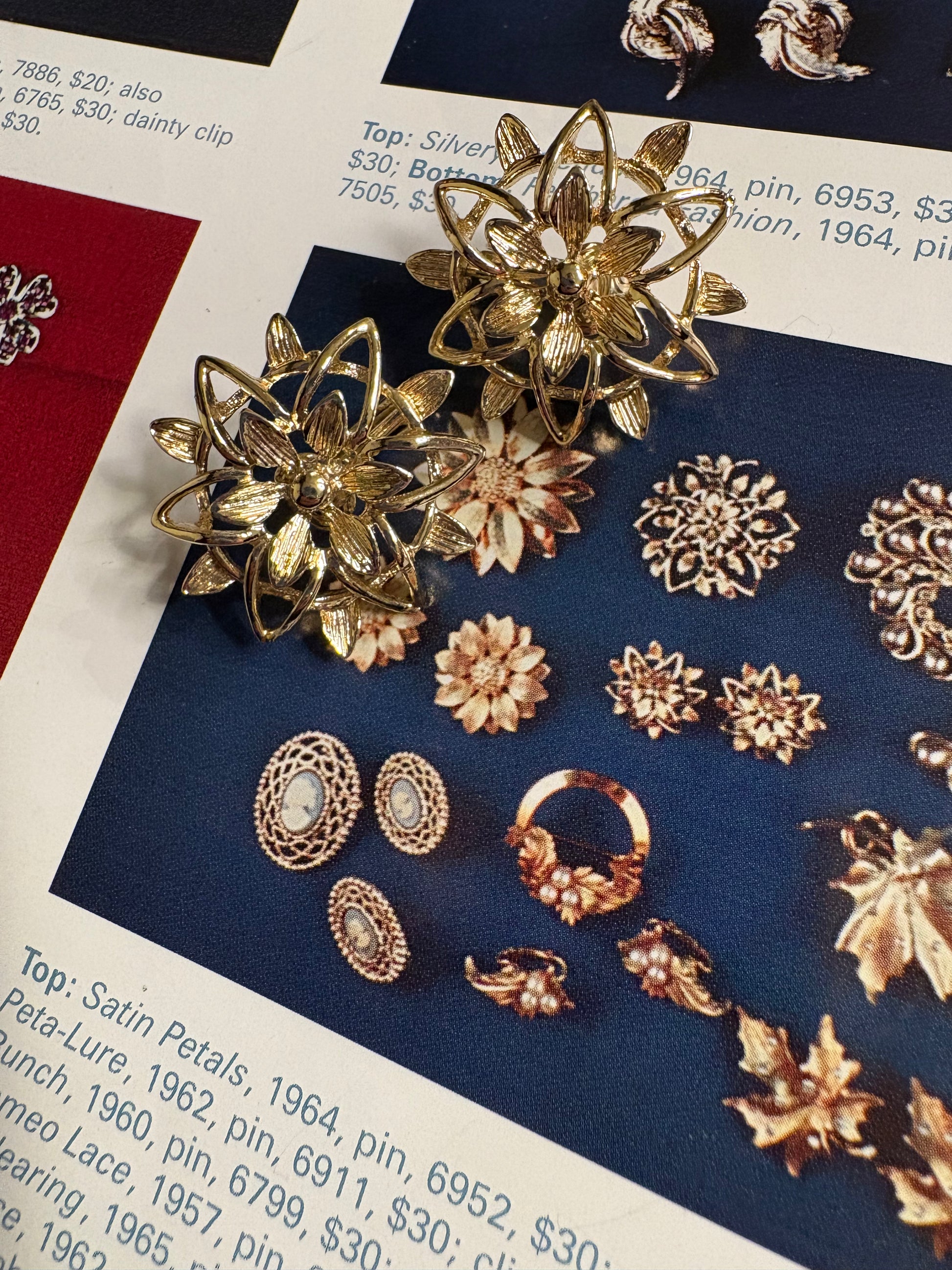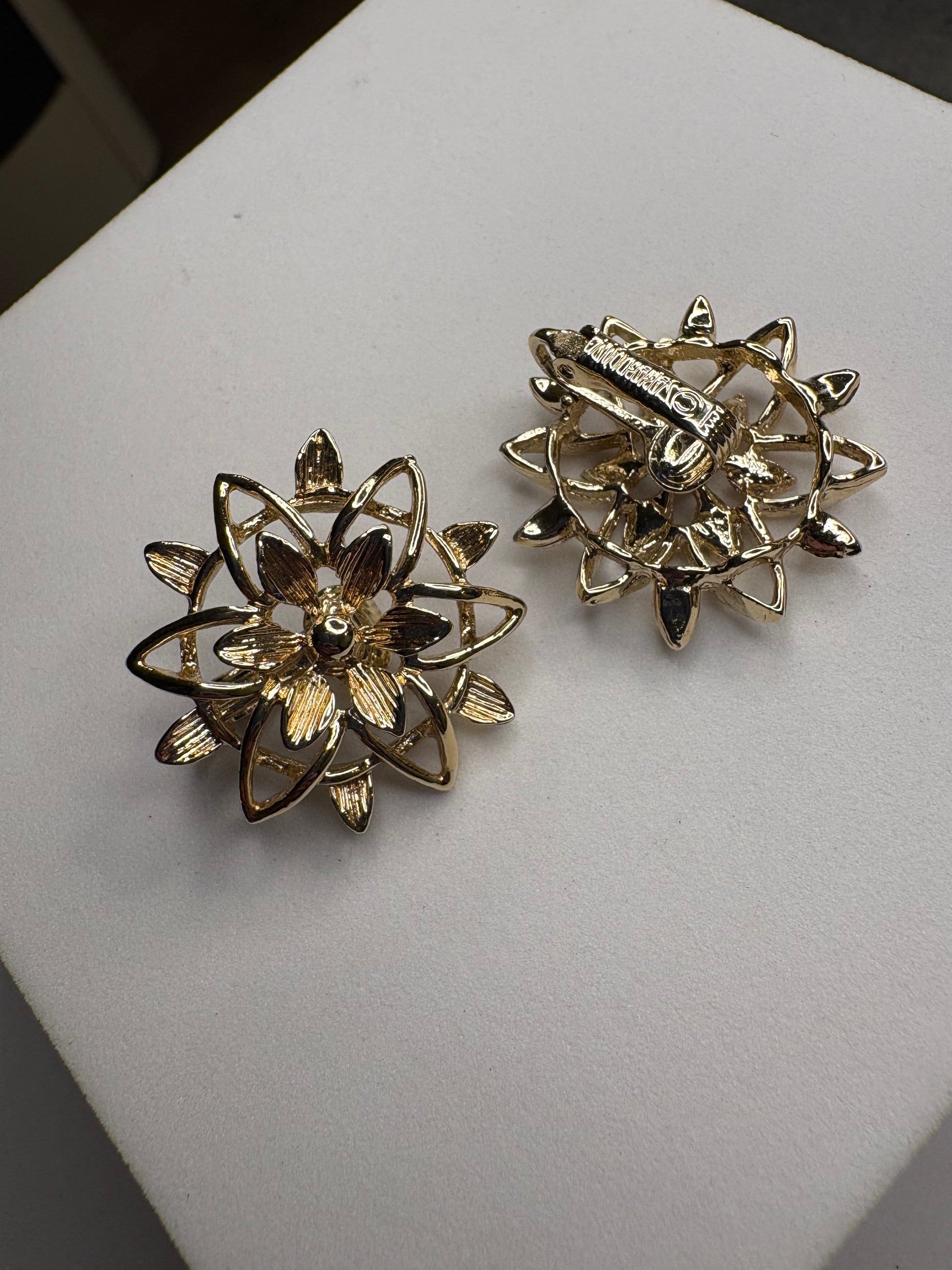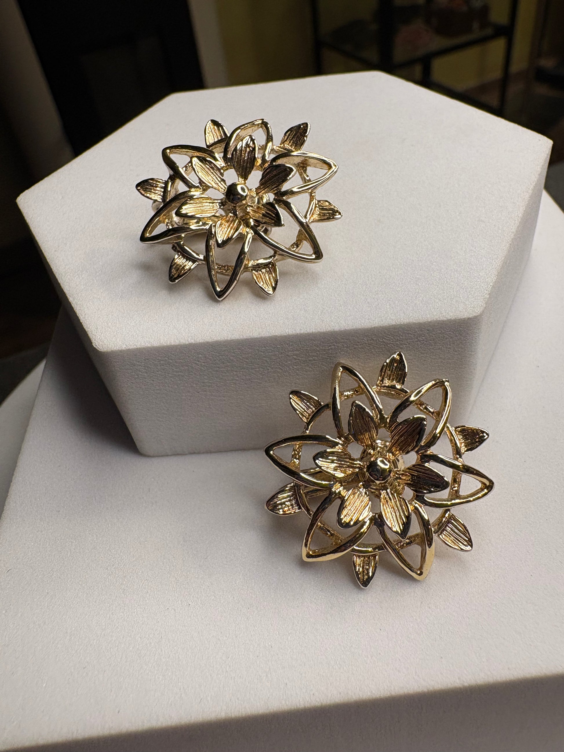 Questi bellissimi orecchini vintage, appartengono alla collezione “Peta-Lure” di Sarah Coventry del 1962, è un esempio straordinario di design rétro, realizzati con una base metallica dorata, che emana un caldo bagliore lucido, tipico dello stile dell’epoca. Gli orecchini si presentano con una forma a fiore stilizzato, con un intricato motivo a petali o foglie che si irradiano dal centro, creando una struttura aperta e traforata che dona leggerezza e movimento.