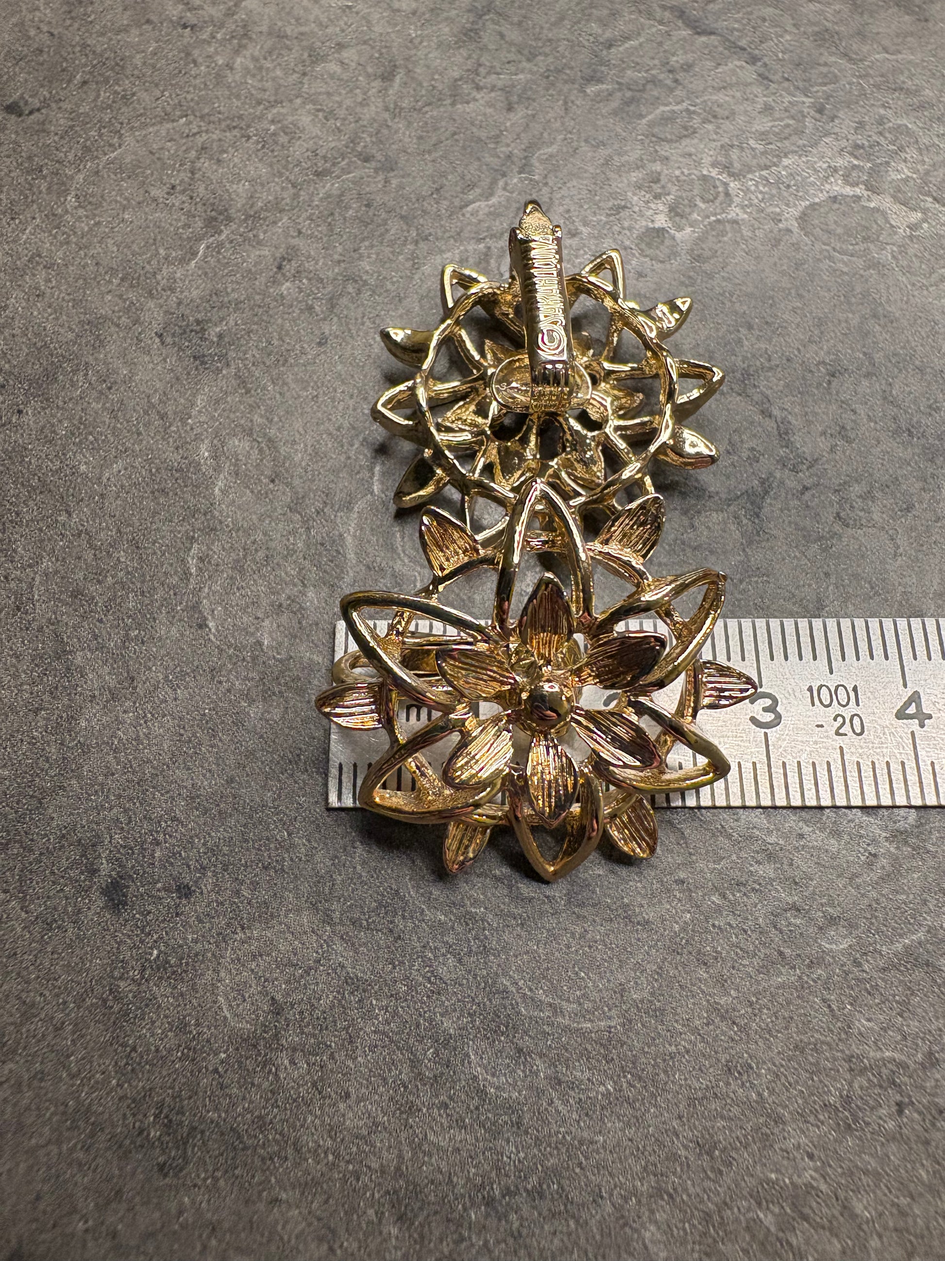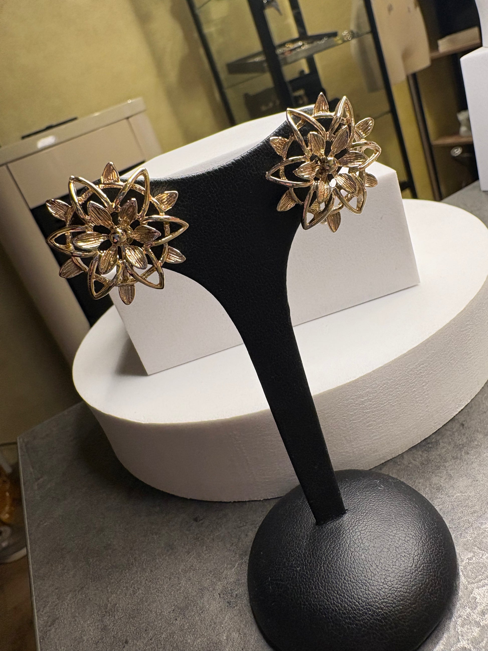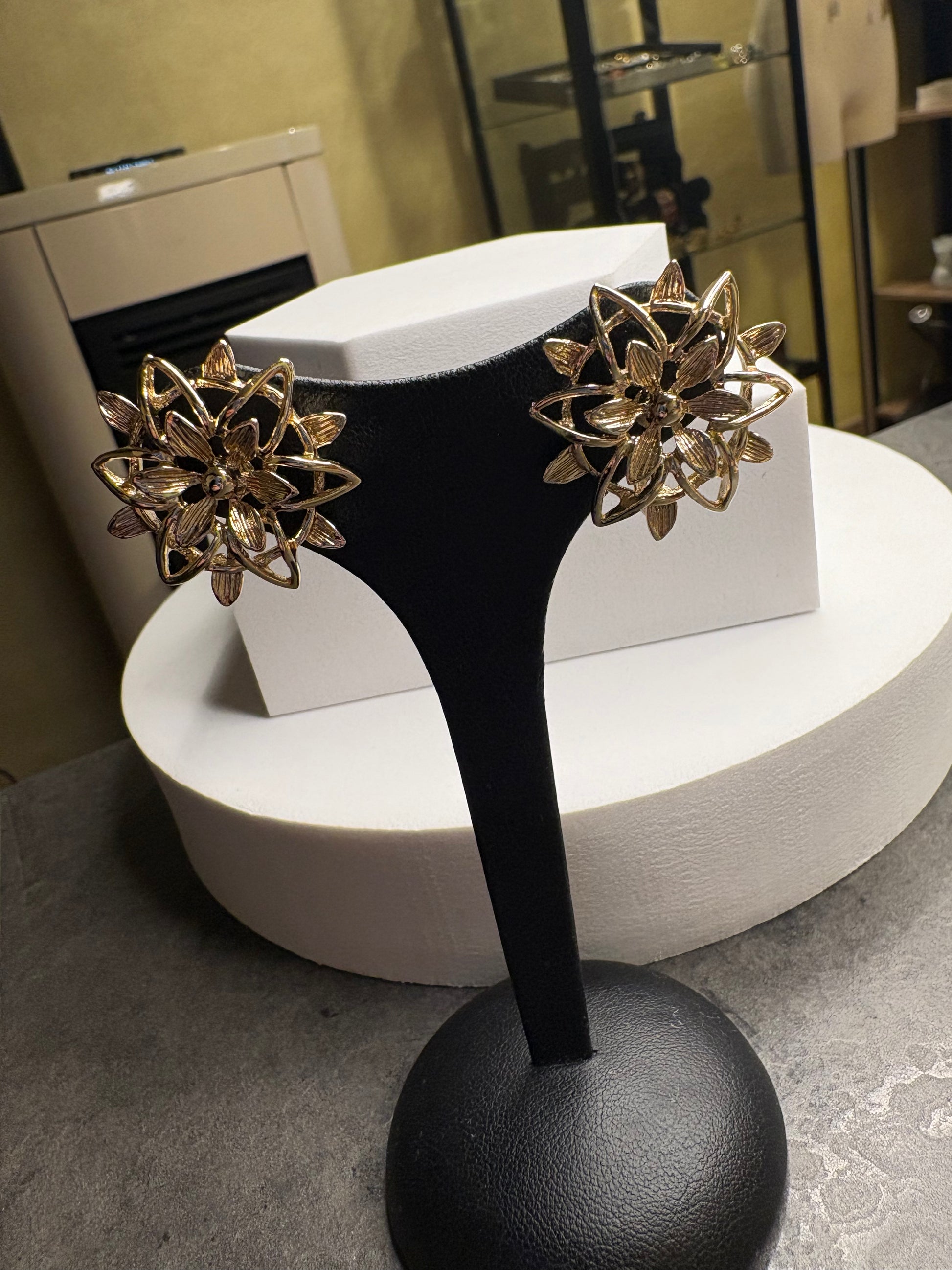 Questi bellissimi orecchini vintage, appartengono alla collezione “Peta-Lure” di Sarah Coventry del 1962, è un esempio straordinario di design rétro, realizzati con una base metallica dorata, che emana un caldo bagliore lucido, tipico dello stile dell’epoca. Gli orecchini si presentano con una forma a fiore stilizzato, con un intricato motivo a petali o foglie che si irradiano dal centro, creando una struttura aperta e traforata che dona leggerezza e movimento.