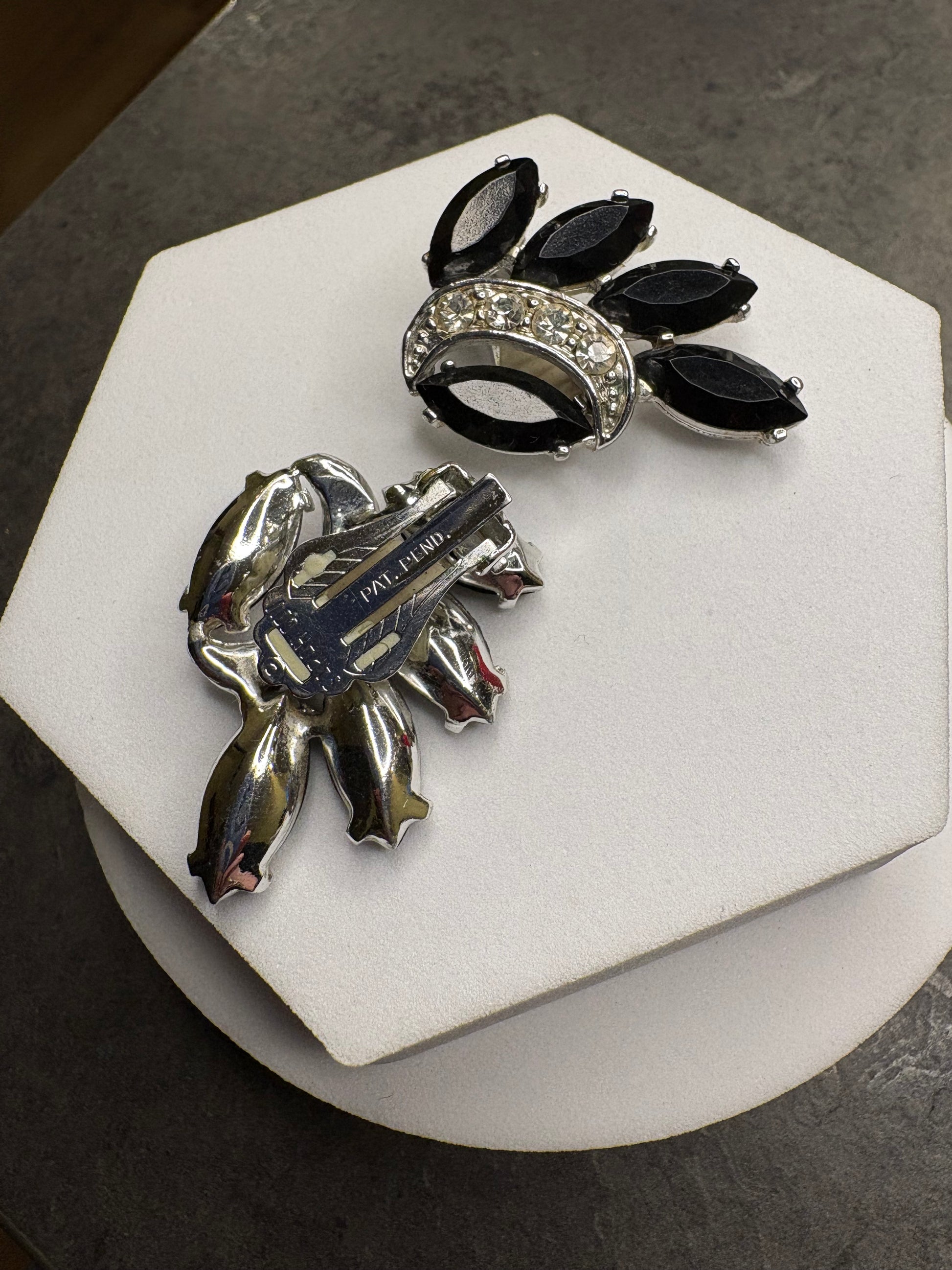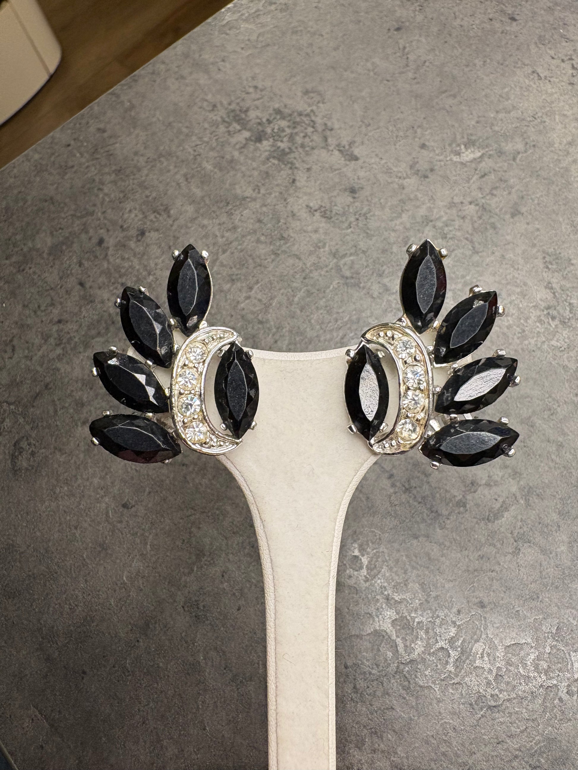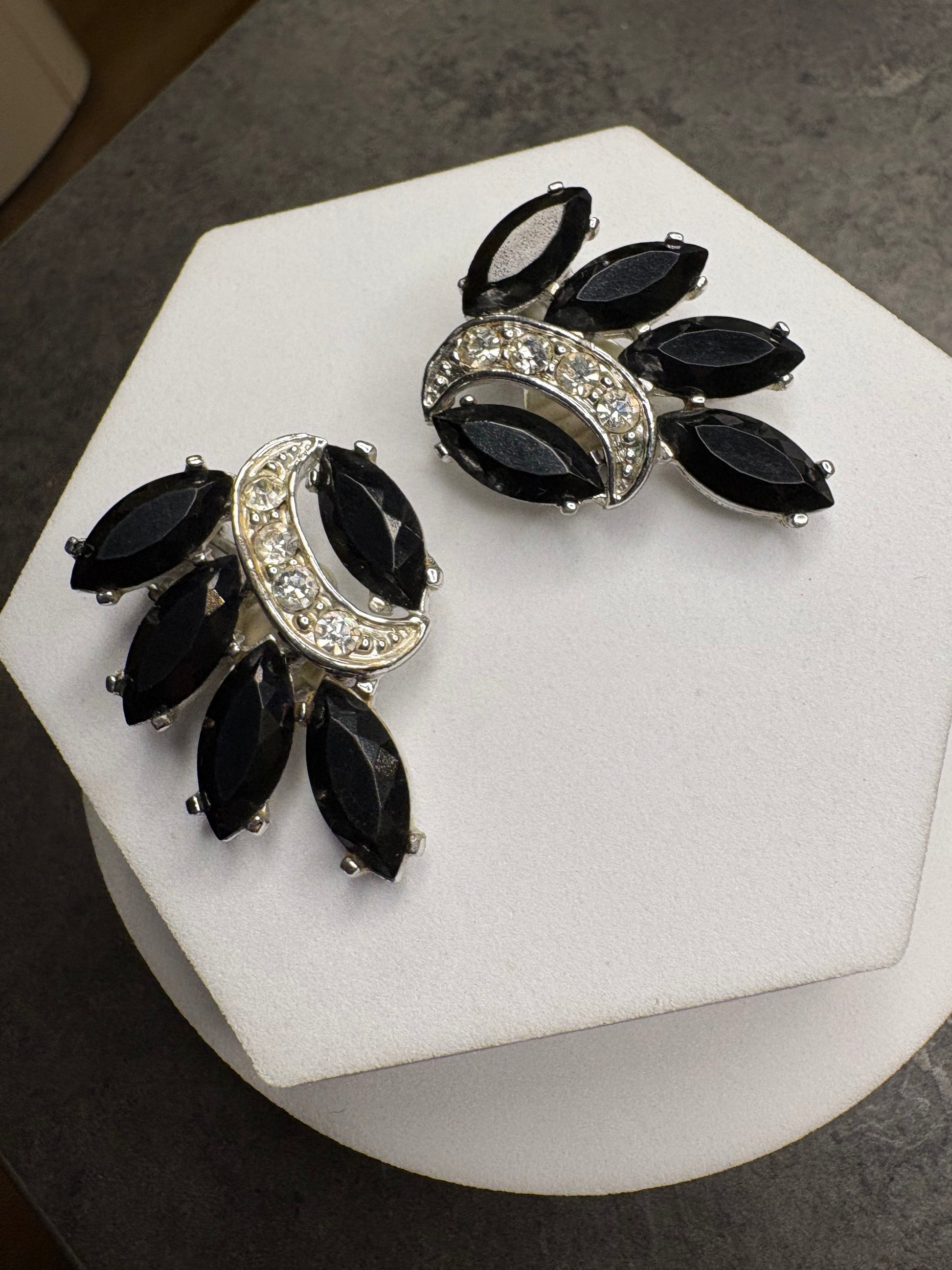 Il contrasto tra il nero profondo e la brillantezza dei cristalli chiari crea un effetto estremamente sofisticato e luminoso. Il design è ricco ma armonioso, tipico dell’alta bigiotteria americana degli anni ’60, pensato per valorizzare il viso con grande eleganza. Chiusura a clip solida e confortevole.