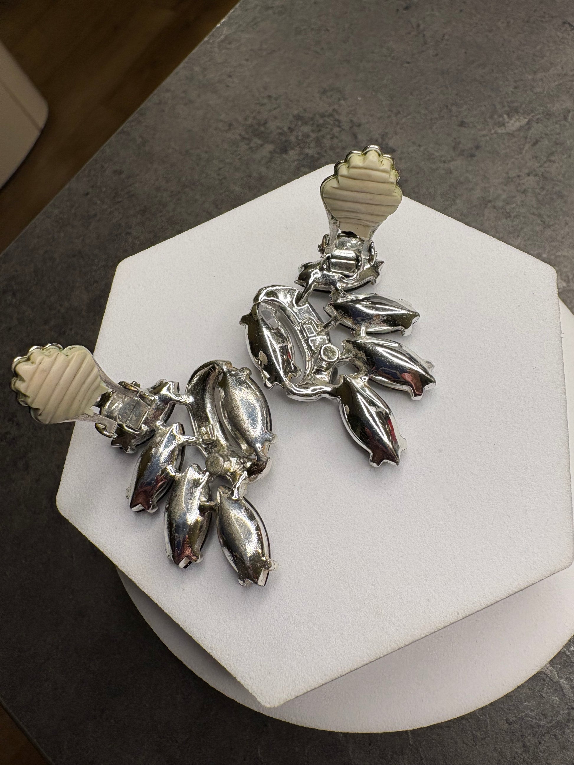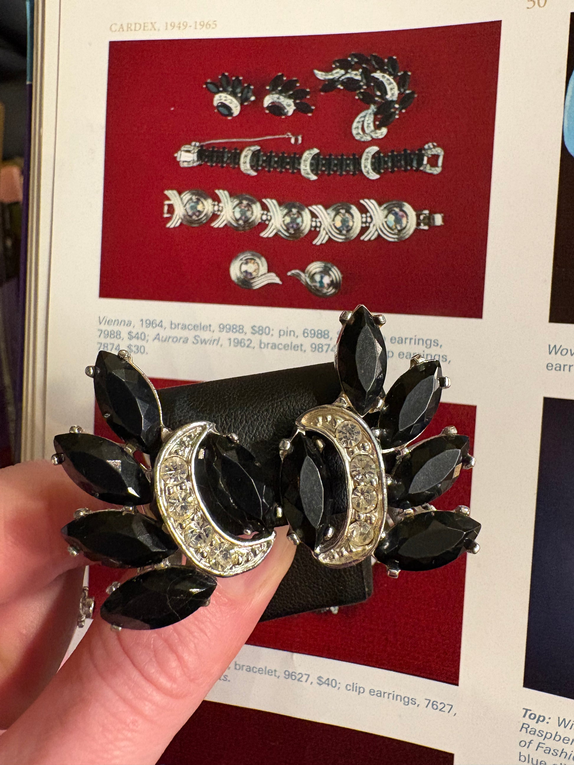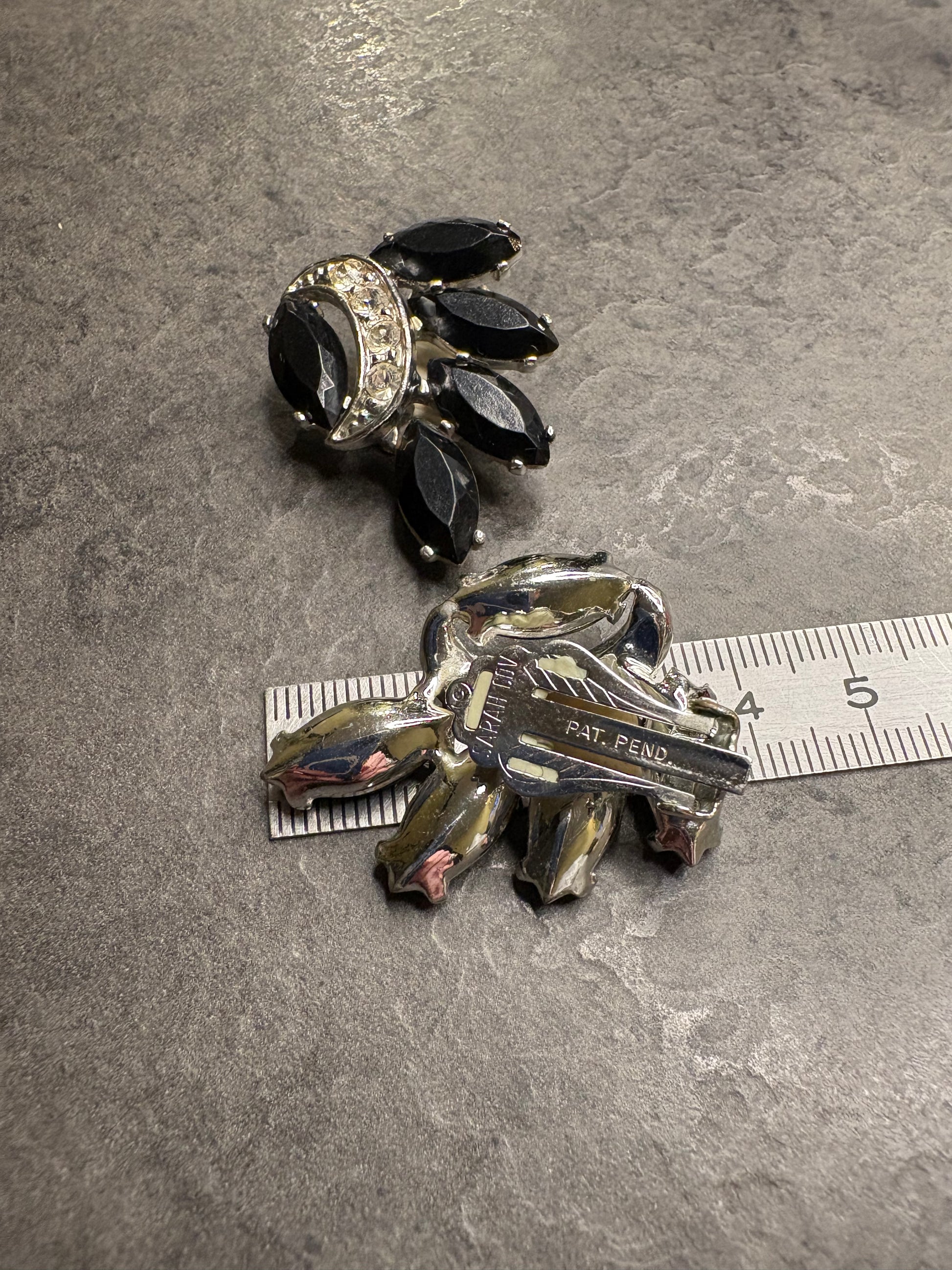 Il contrasto tra il nero profondo e la brillantezza dei cristalli chiari crea un effetto estremamente sofisticato e luminoso. Il design è ricco ma armonioso, tipico dell’alta bigiotteria americana degli anni ’60, pensato per valorizzare il viso con grande eleganza. Chiusura a clip solida e confortevole.