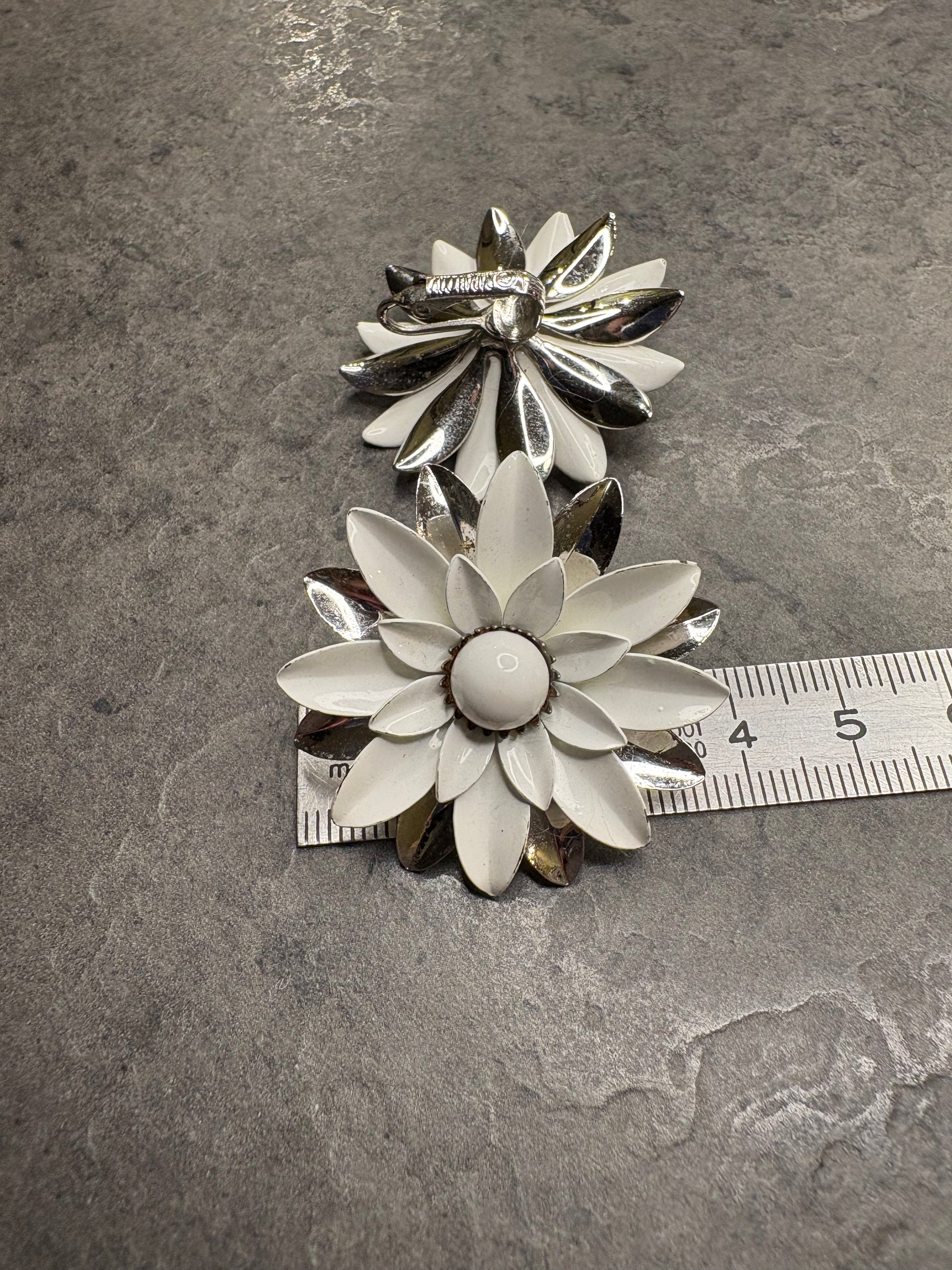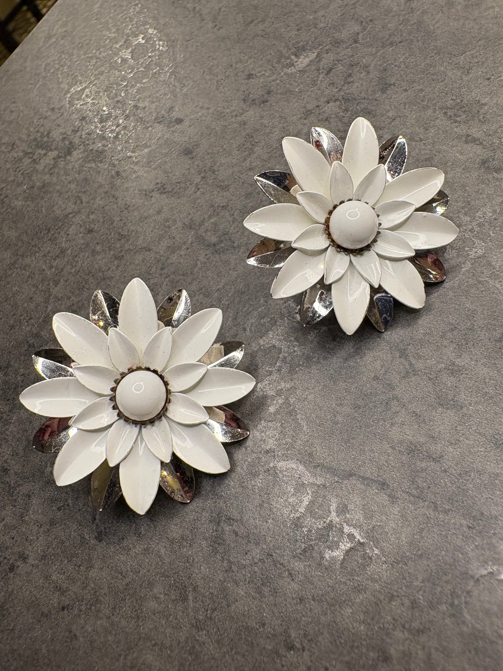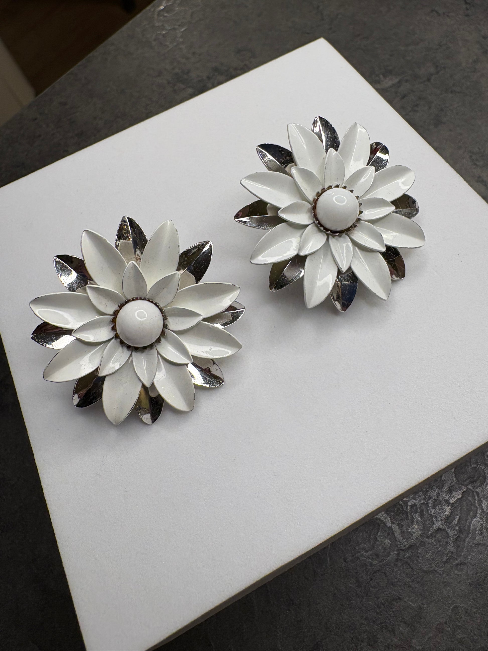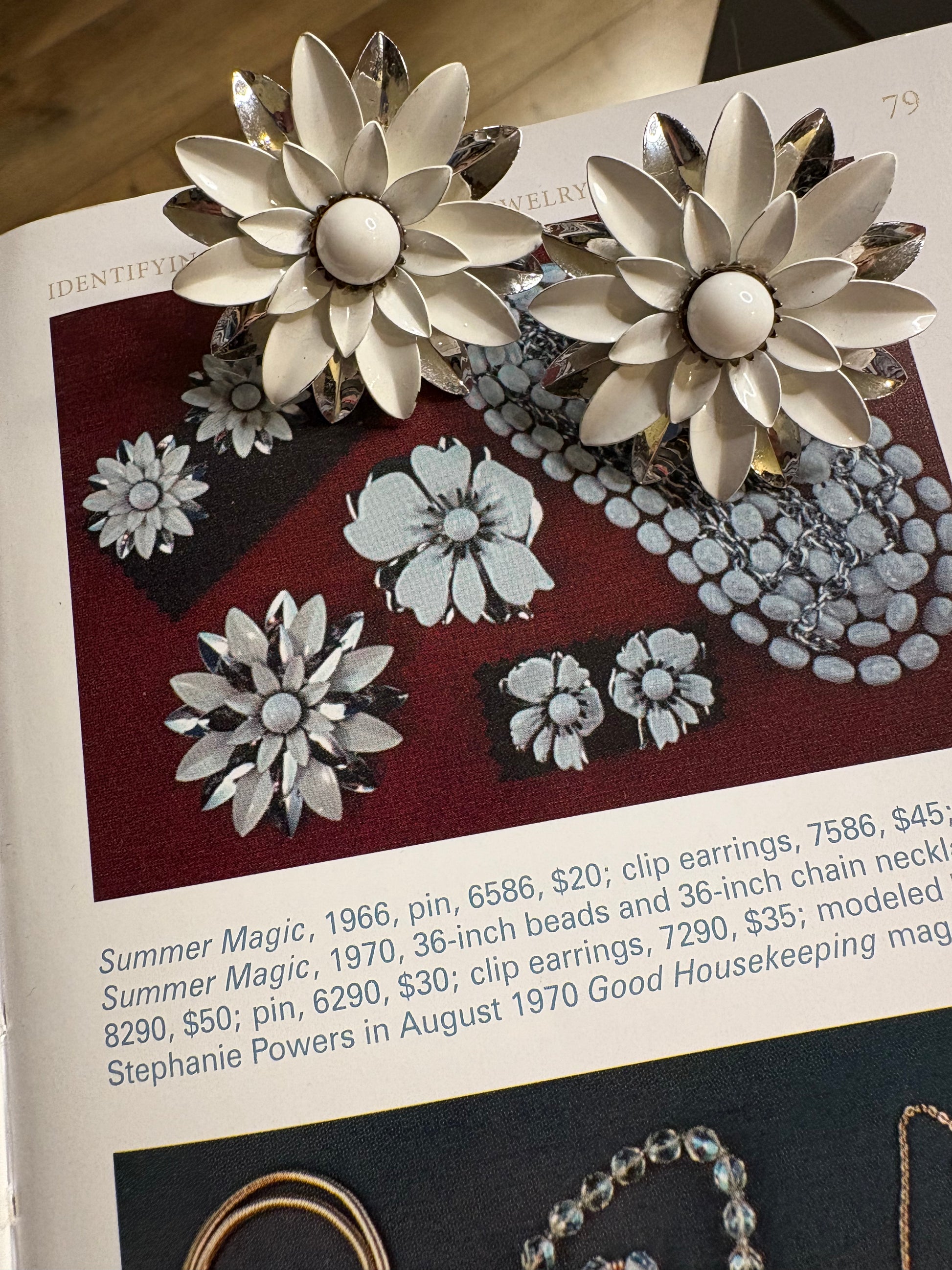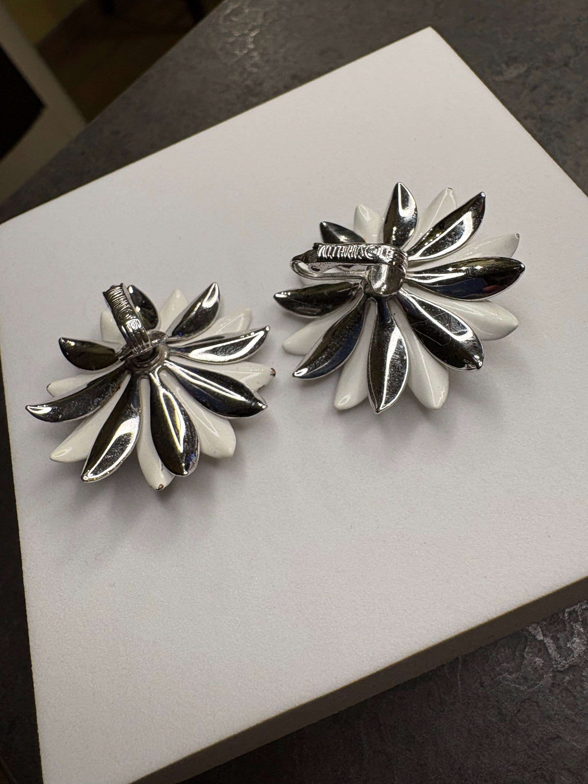 Questi bellissimi orecchini a clip vintage di Sarah Coventry della collezione “Summer Magic” realizzati nel 1966, riprende il motivo floreale in una versione più stilizzata e grafica. Sono orecchini a clip in metallo color argento con petali smaltati di bianco, dal design pulito ed equilibrato. Rispetto alla versione del 1964, questo modello appare più essenziale e moderno, mantenendo però la stessa eleganza luminosa e la stessa ispirazione romantica. Rappresentano perfettamente l’evoluzione dello stile Sarah Coventry nella seconda metà degli anni ’60.