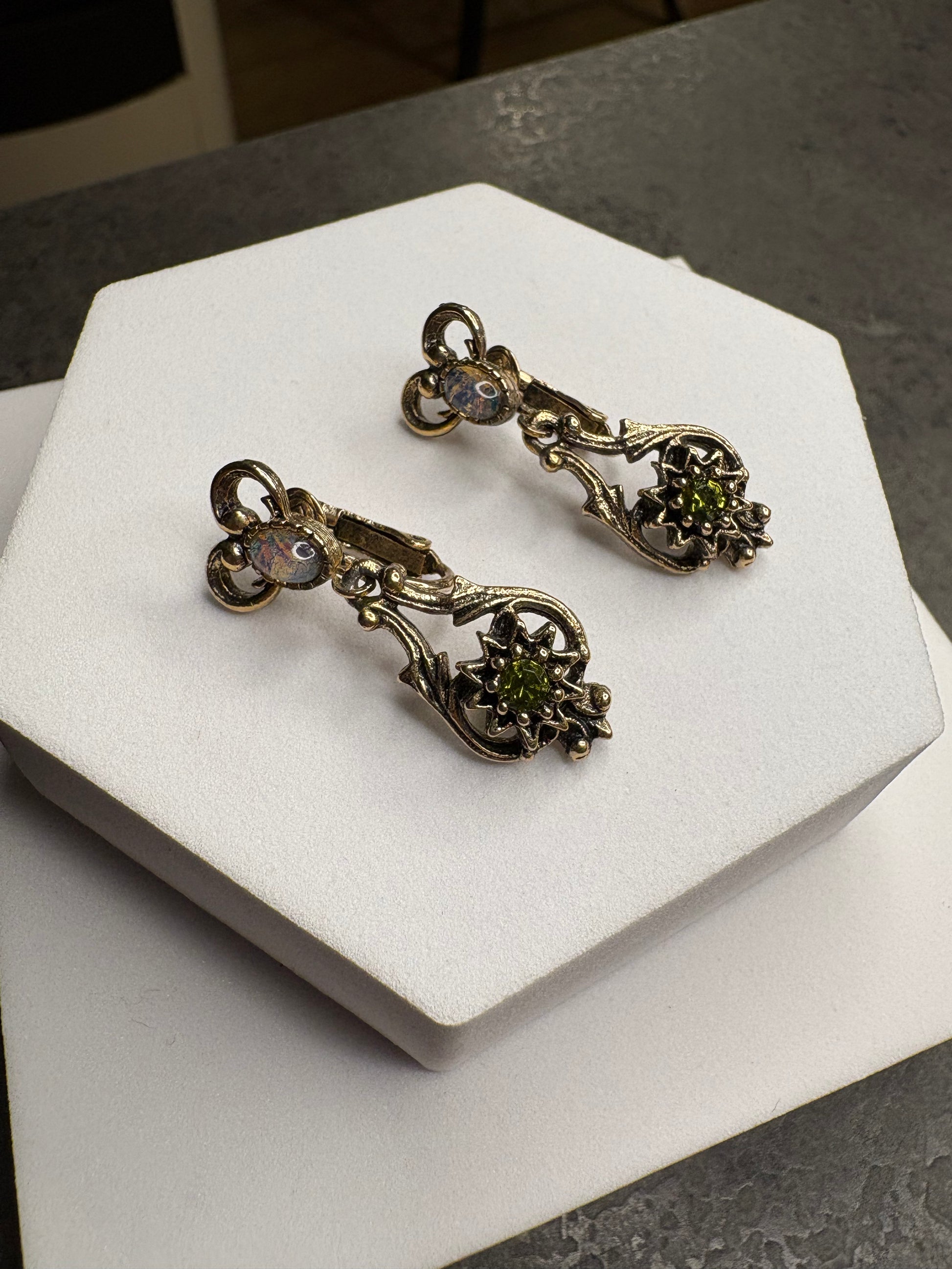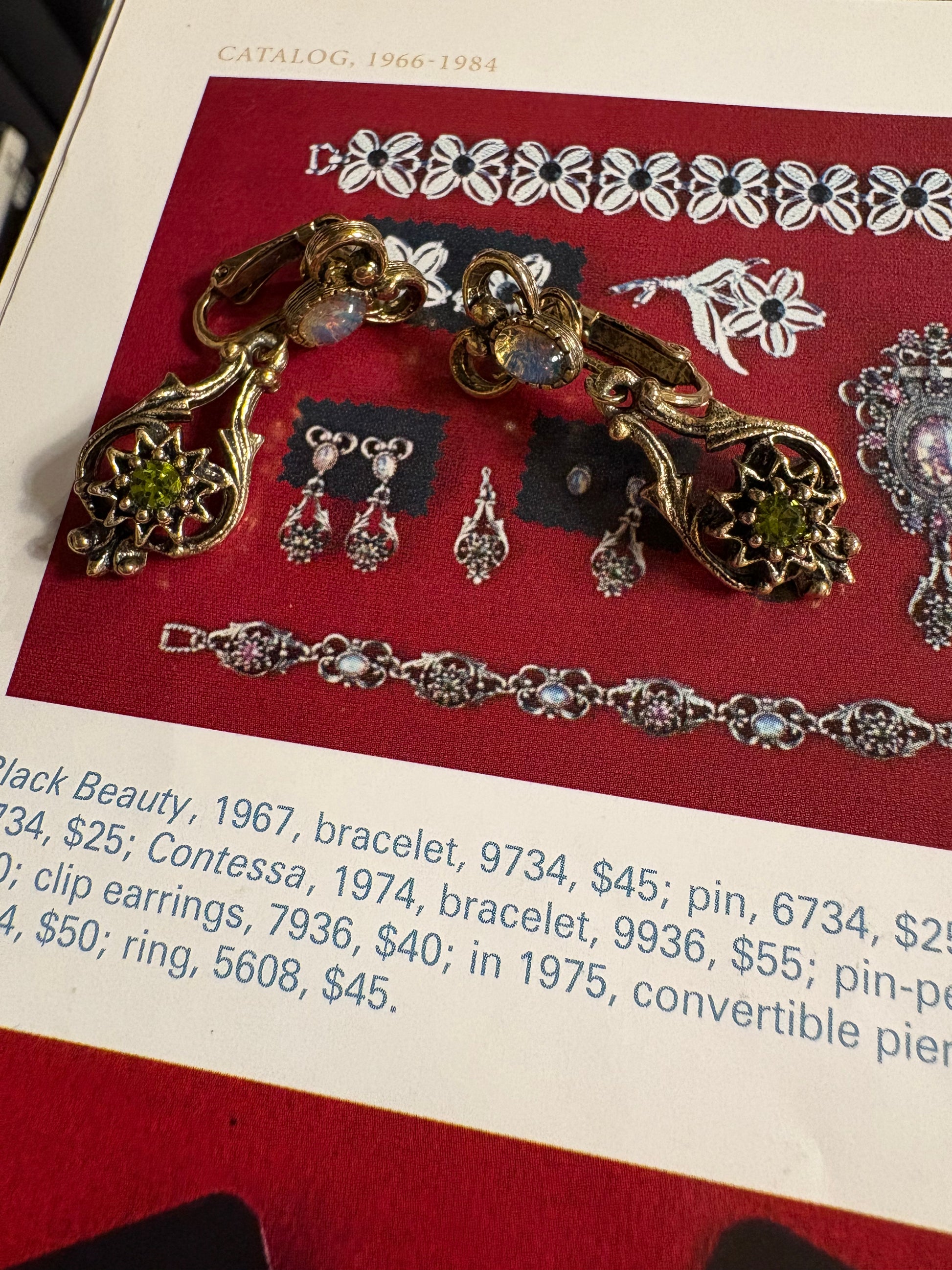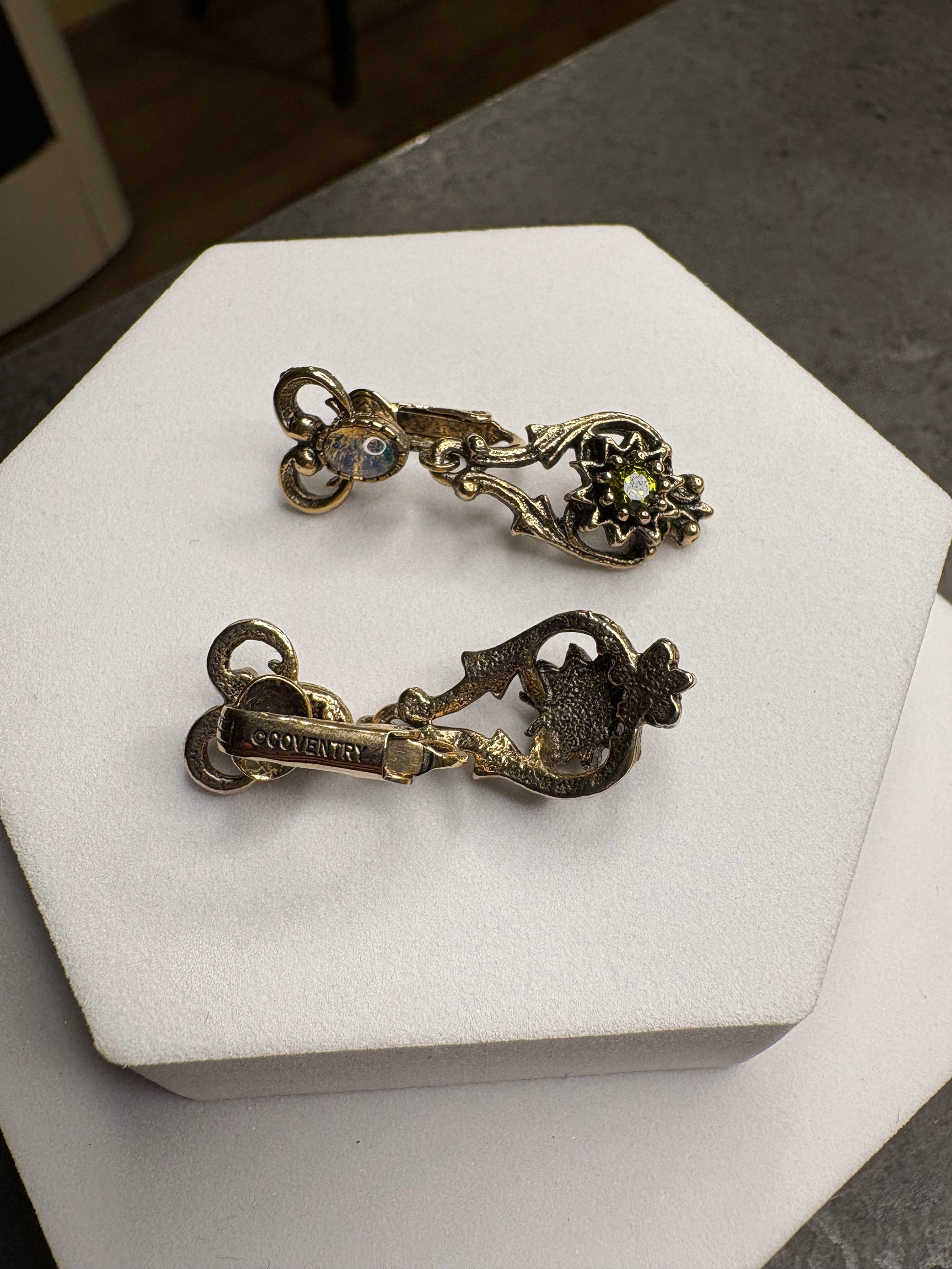 Questi incantevoli orecchini a clip sono uno dei più rari e ricercati, proveniente dalla collezione “Contessa” del 1975. Realizzati in metallo brunito, presentano una struttura elegante con elementi pendenti che donano movimento e grande presenza scenica. Il design è più sofisticato e maturo, pienamente rappresentativo dello stile anni ’70, con un carattere deciso e importante che li rende veri protagonisti una volta indossati.
