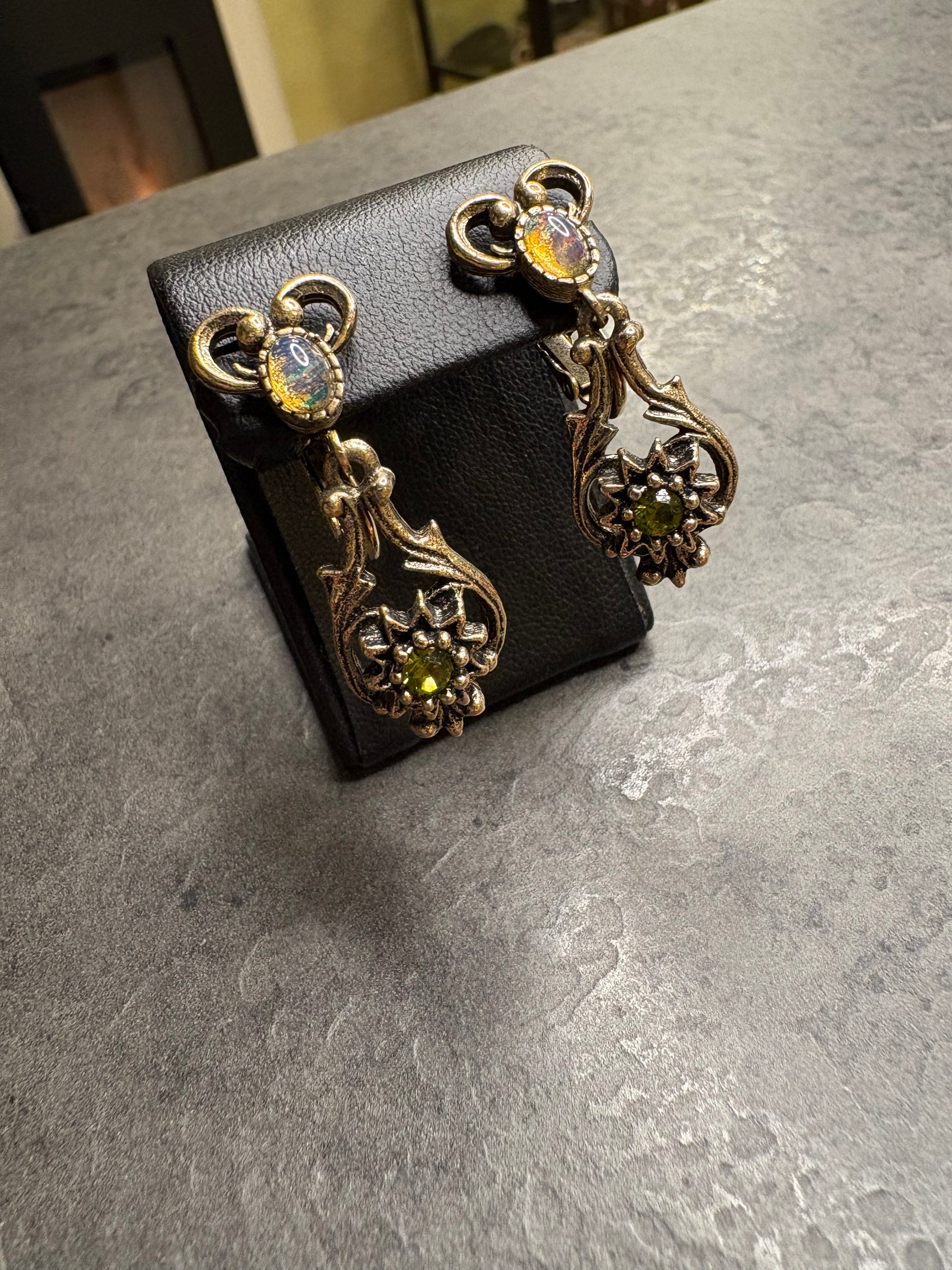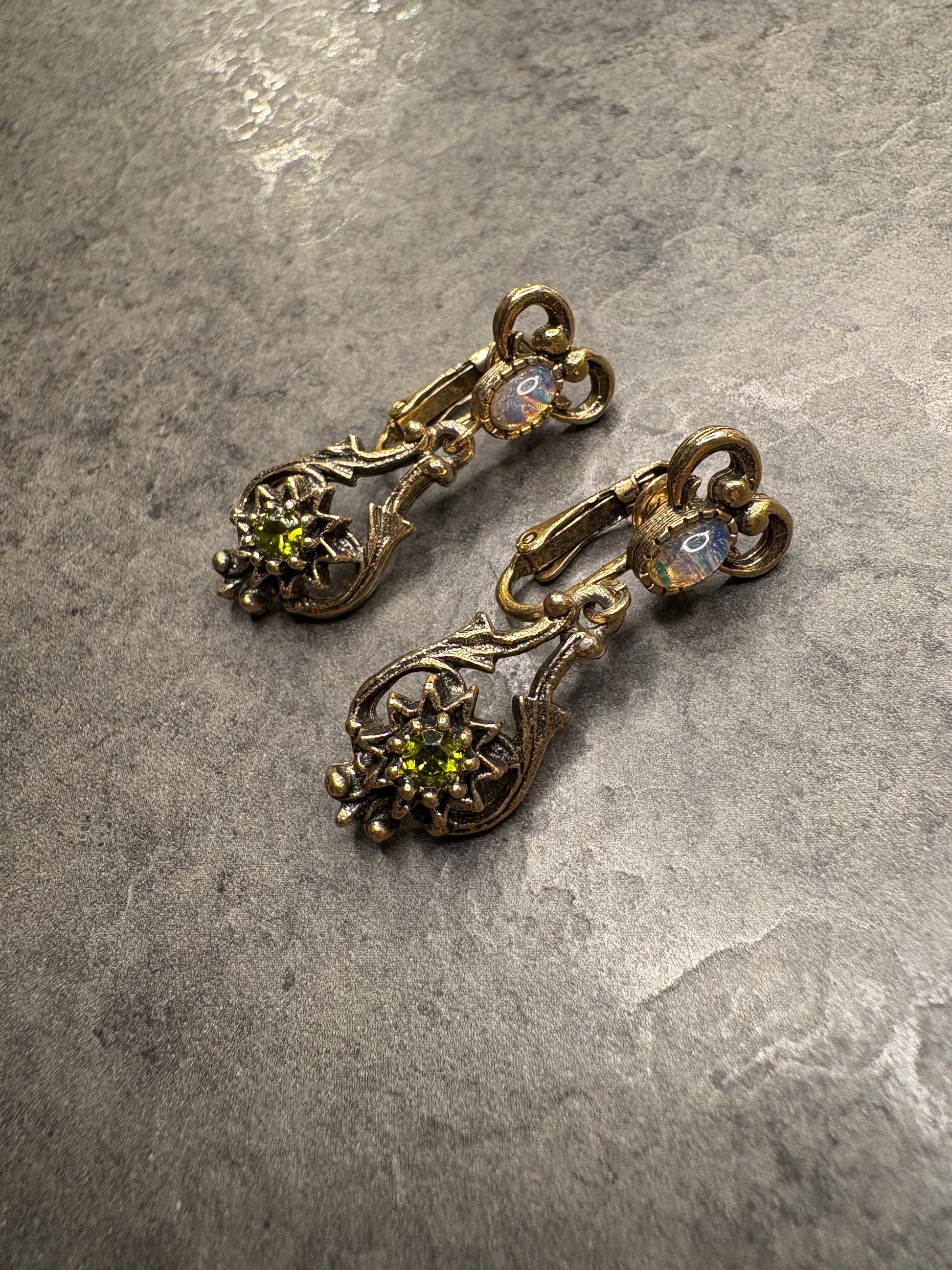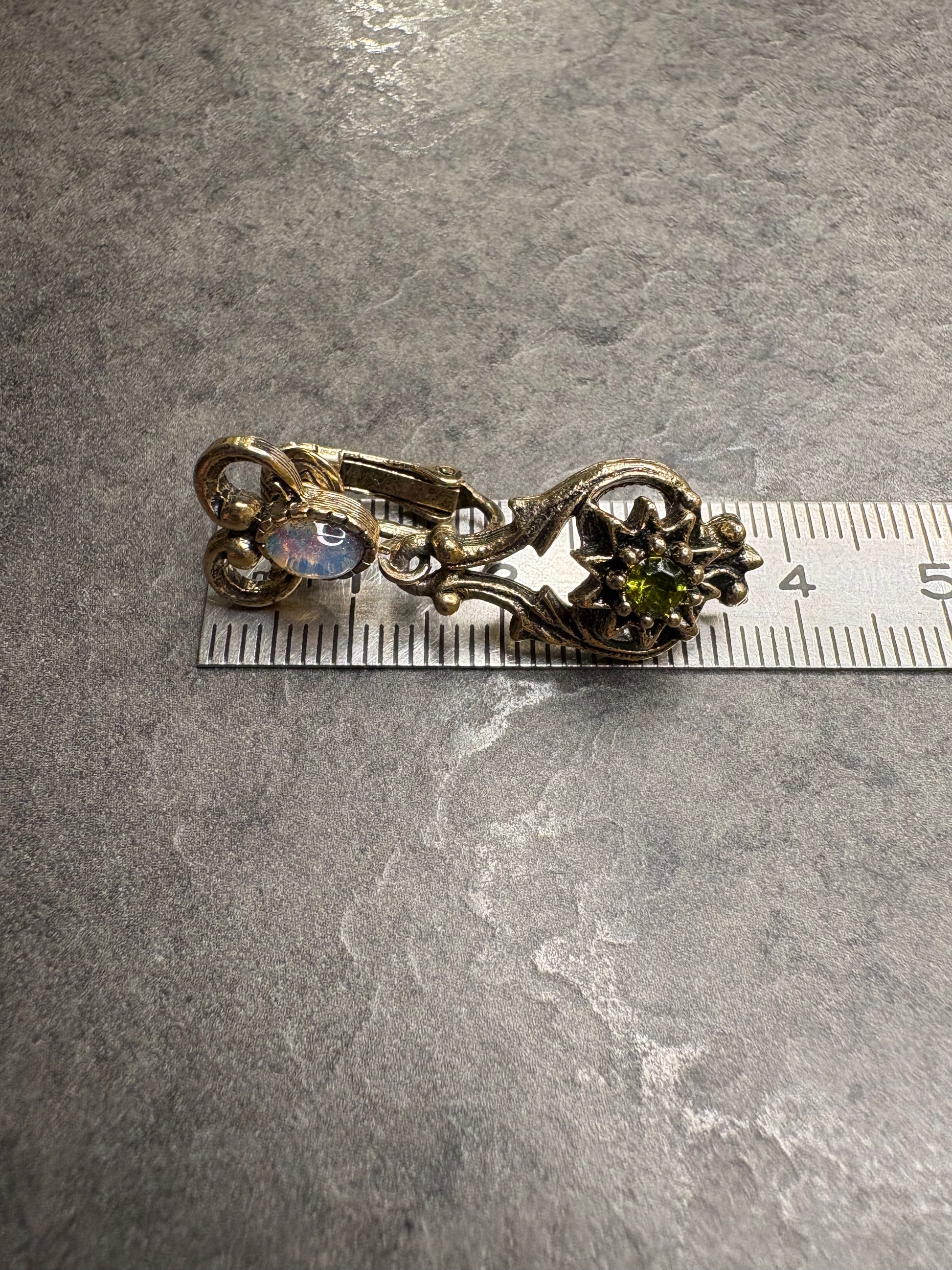 Questi incantevoli orecchini a clip sono uno dei più rari e ricercati, proveniente dalla collezione “Contessa” del 1975. Realizzati in metallo brunito, presentano una struttura elegante con elementi pendenti che donano movimento e grande presenza scenica. Il design è più sofisticato e maturo, pienamente rappresentativo dello stile anni ’70, con un carattere deciso e importante che li rende veri protagonisti una volta indossati.