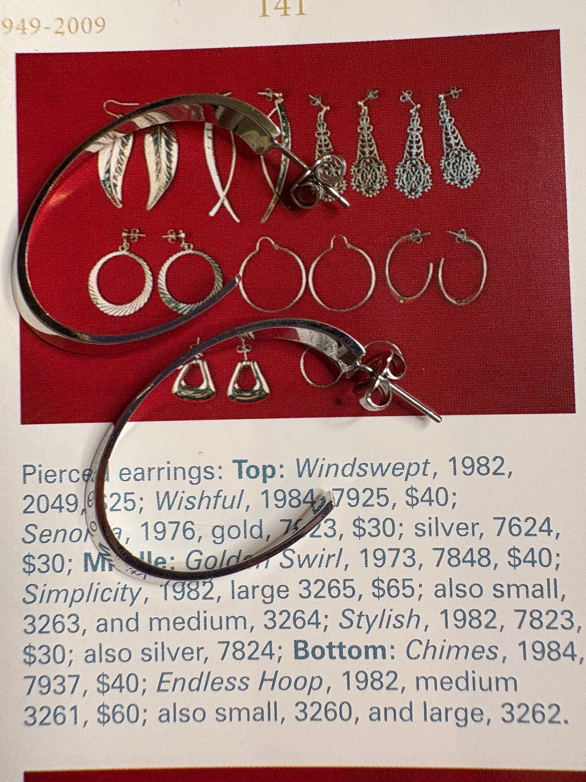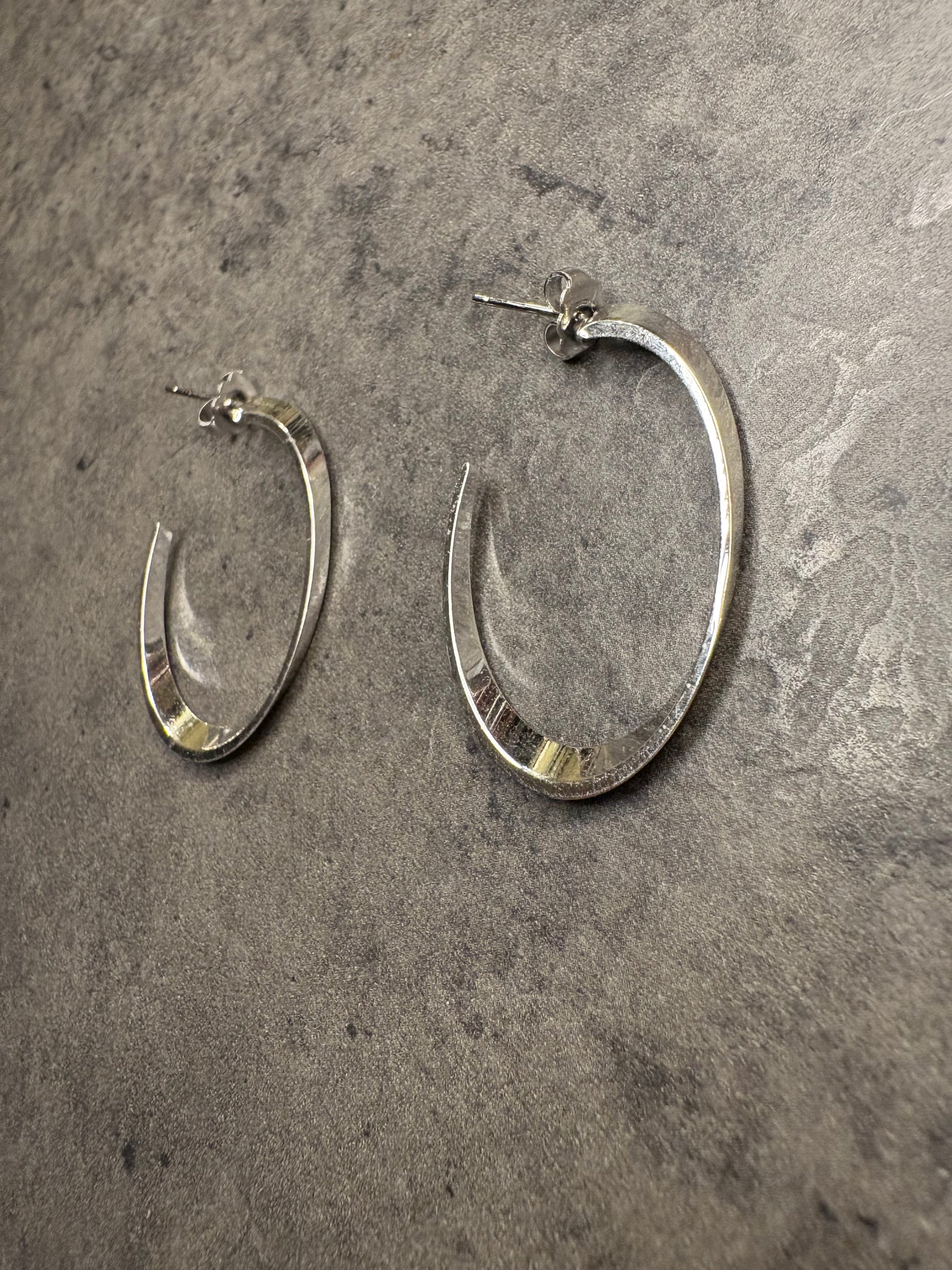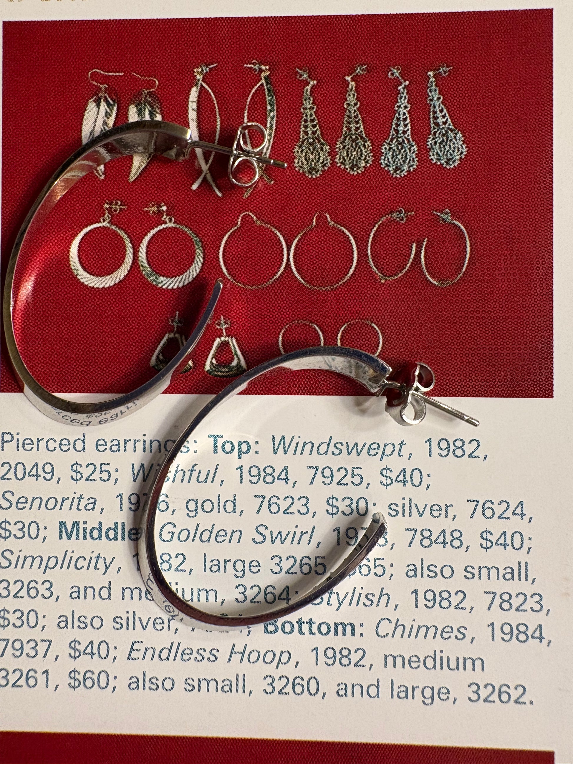 Eleganti orecchini vintage Sarah Coventry del 1982, modello “Stylish”, pensati per lobi forati. Realizzati in metallo argentato lucido, presentano una linea sinuosa e moderna, a forma di mezza luna asimmetrica, che abbraccia delicatamente il viso con un effetto di luce raffinato.