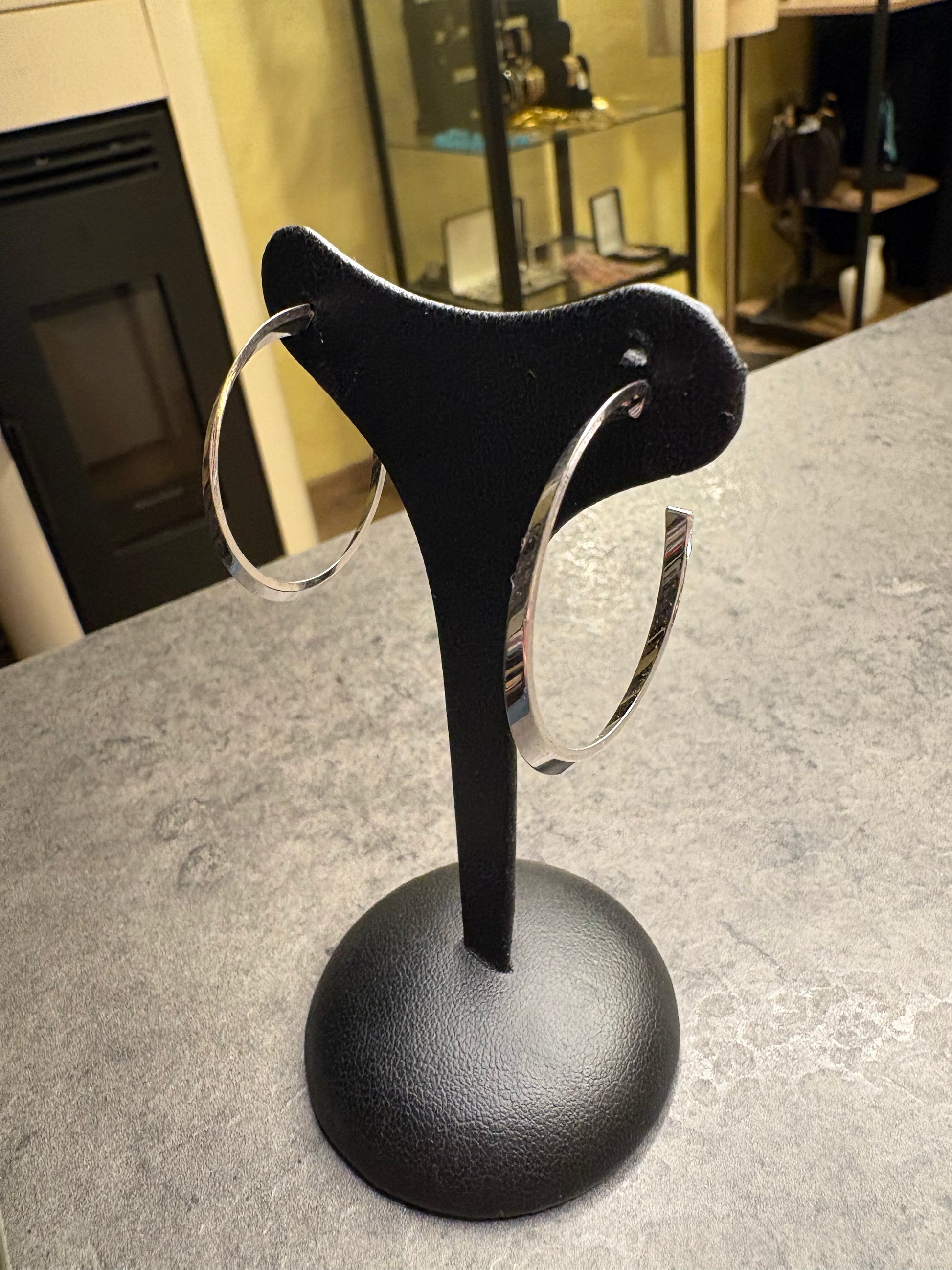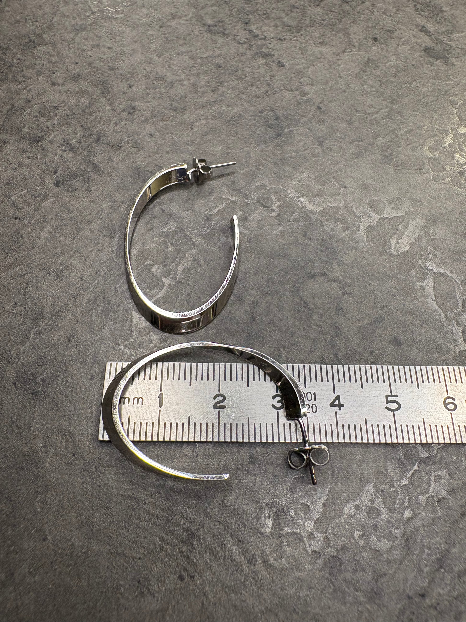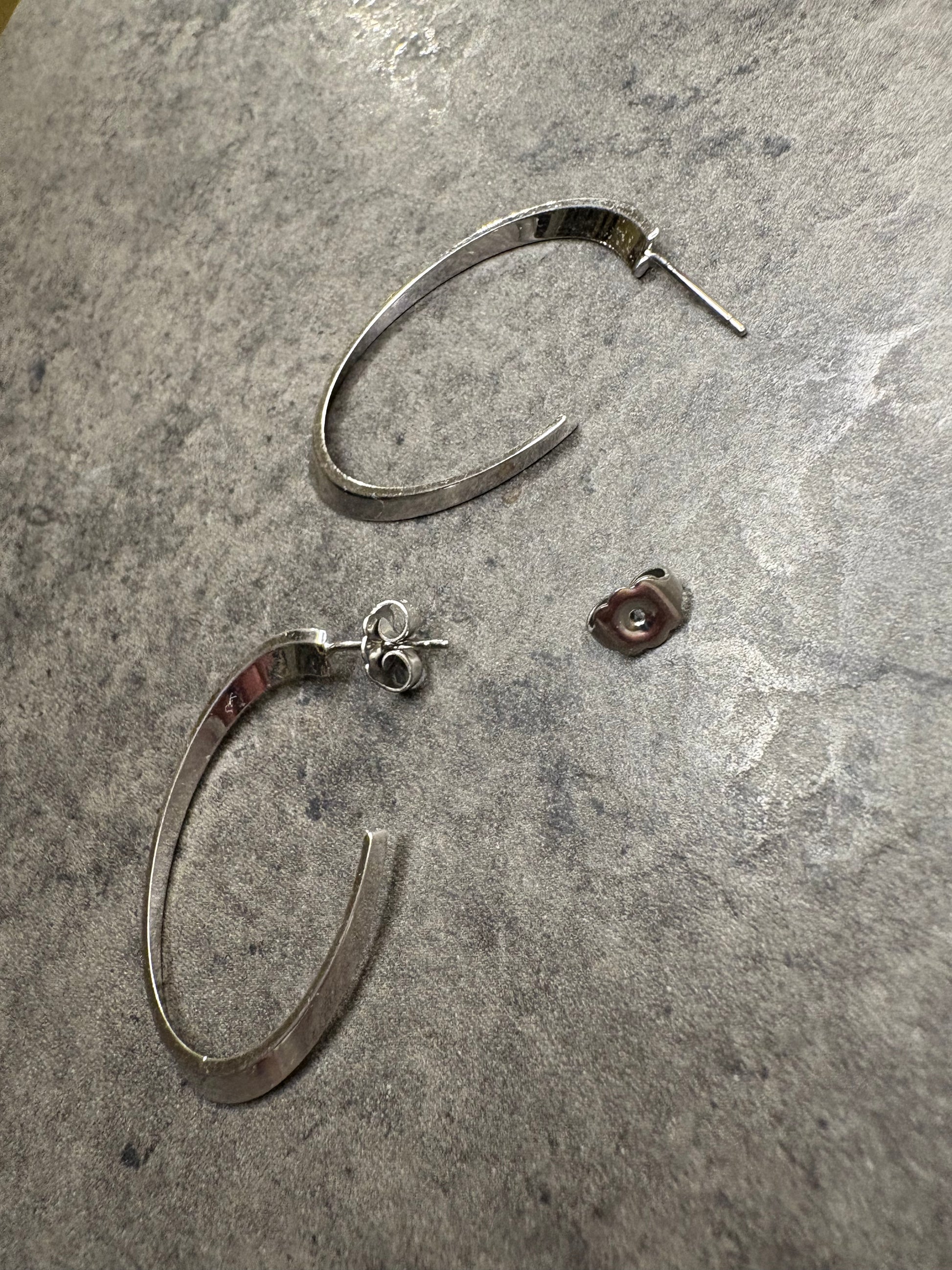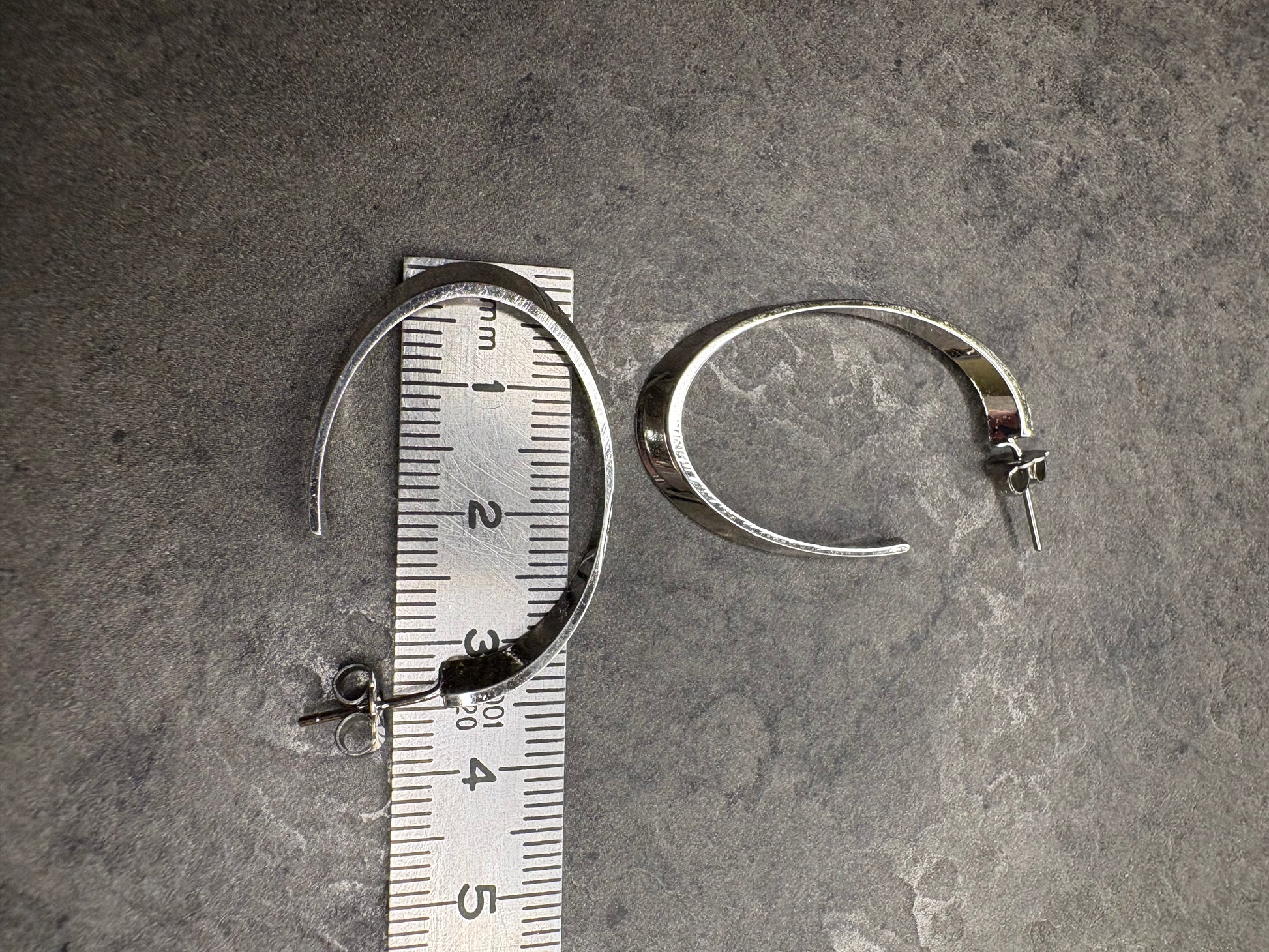 Eleganti orecchini vintage Sarah Coventry del 1982, modello “Stylish”, pensati per lobi forati. Realizzati in metallo argentato lucido, presentano una linea sinuosa e moderna, a forma di mezza luna asimmetrica, che abbraccia delicatamente il viso con un effetto di luce raffinato.
