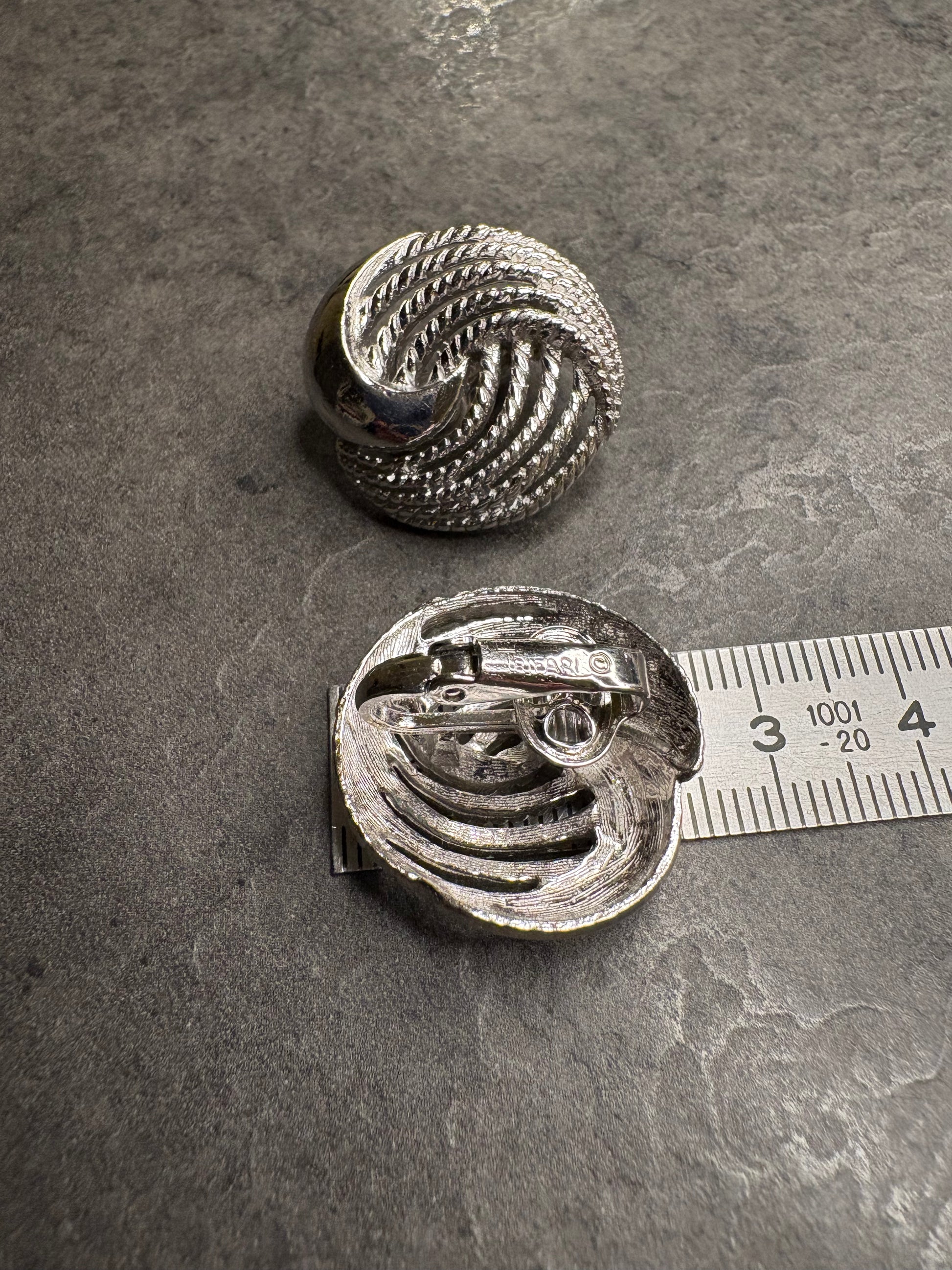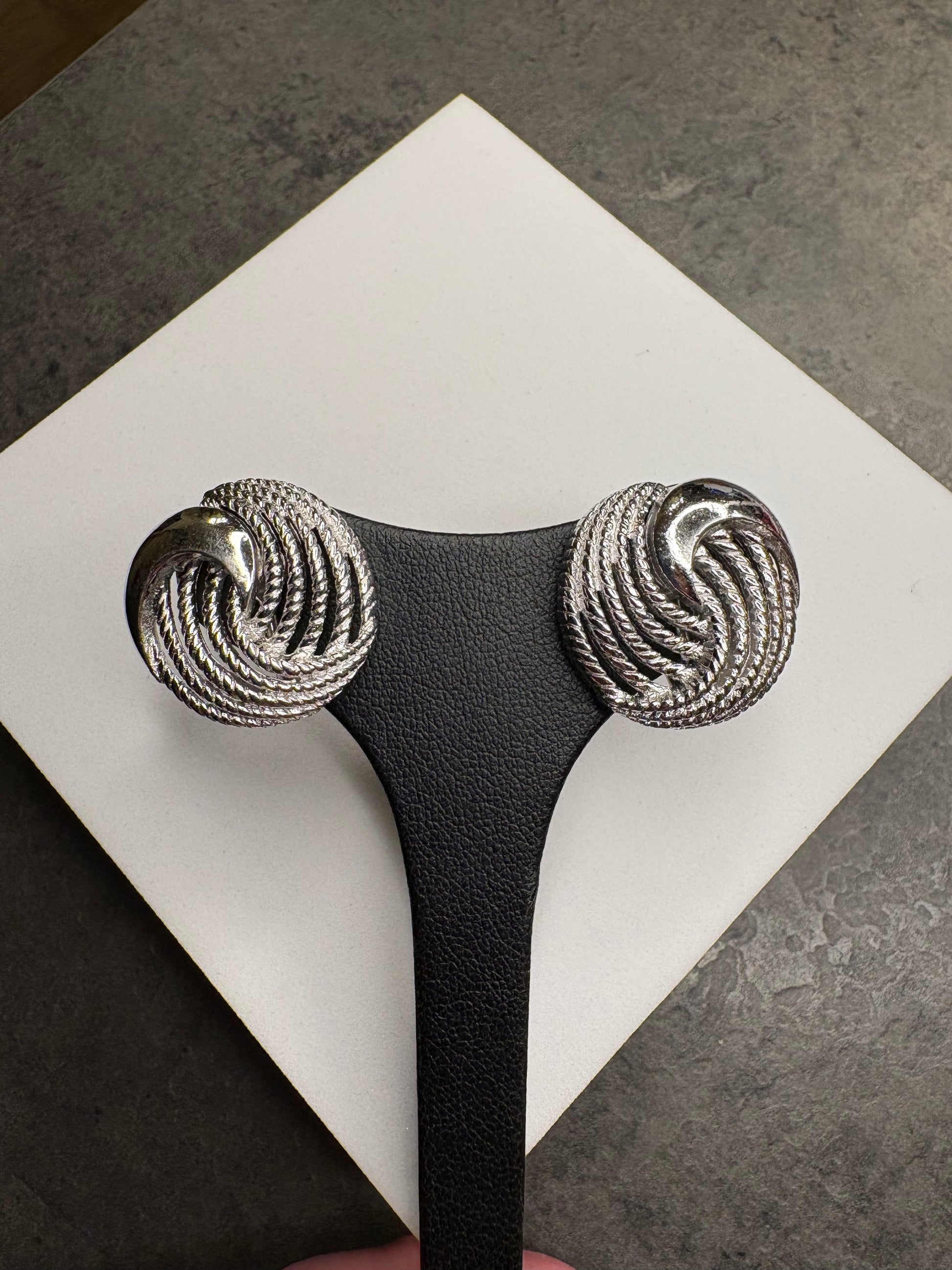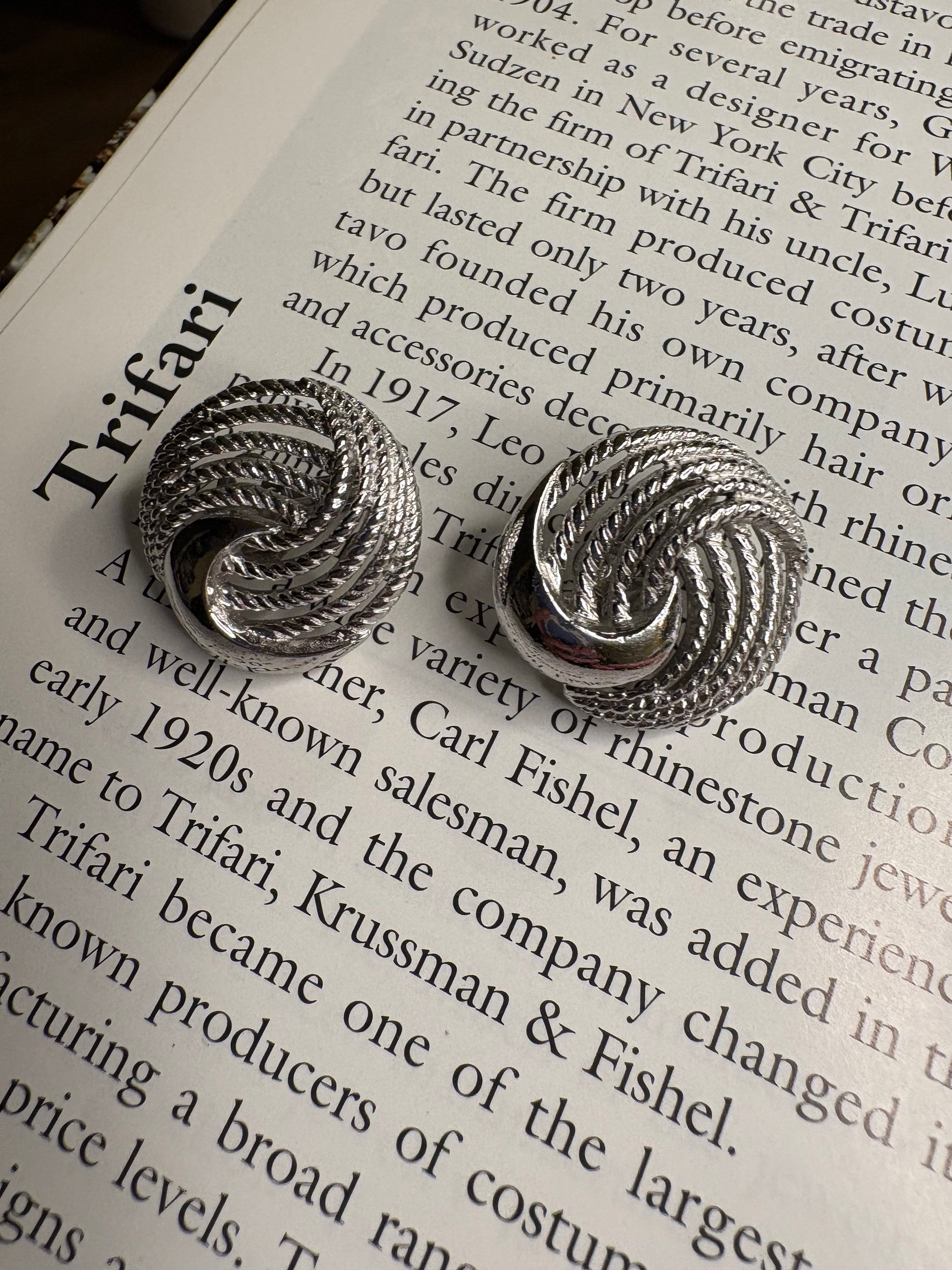 Raffinati orecchini vintage a clip firmati Trifari, realizzati in metallo color argento con un design elegante e tridimensionale a spirale intrecciata. La lavorazione a rilievo crea un gioco di luci e ombre che valorizza le superfici e mette in evidenza la qualità della finitura.