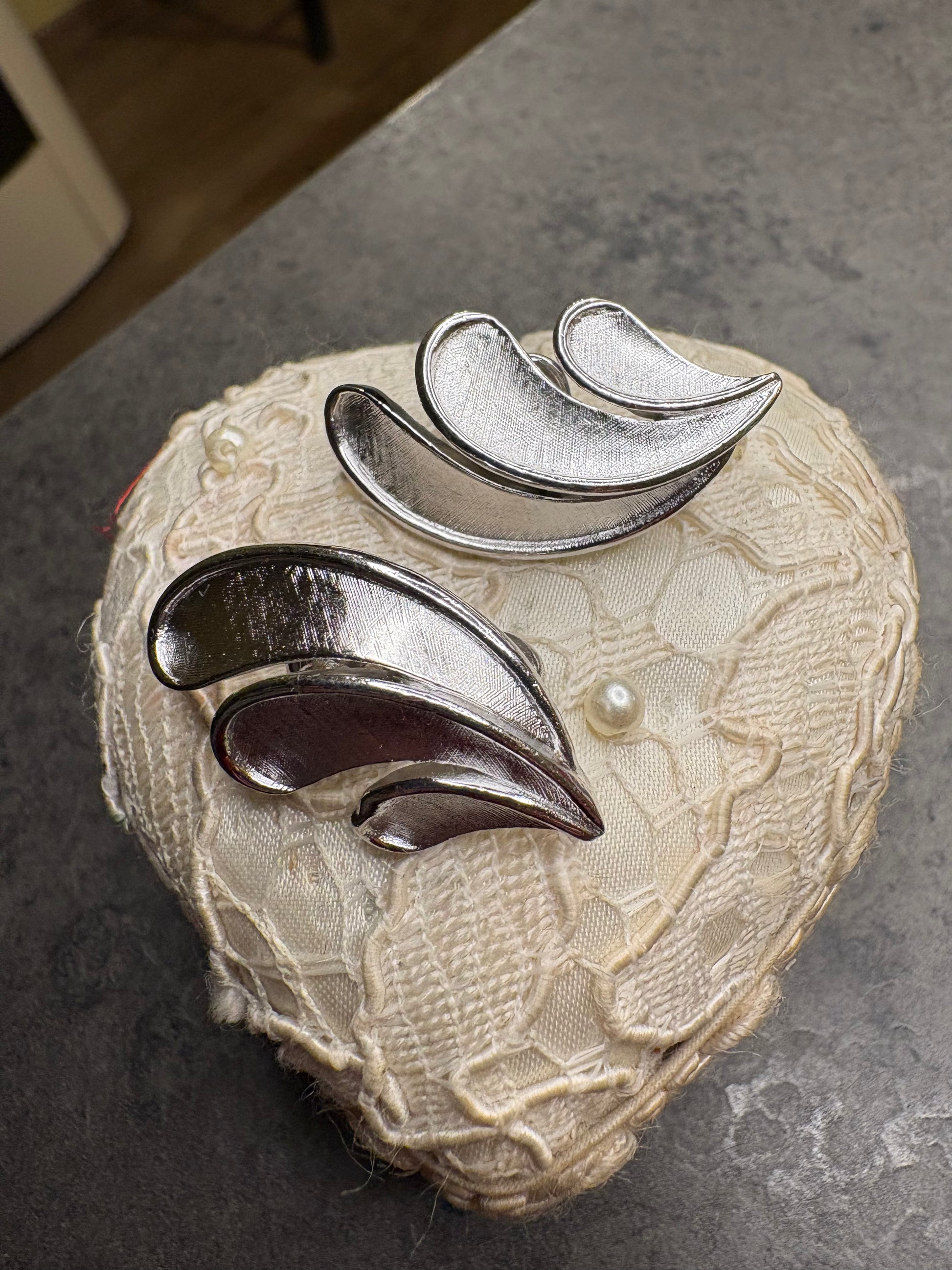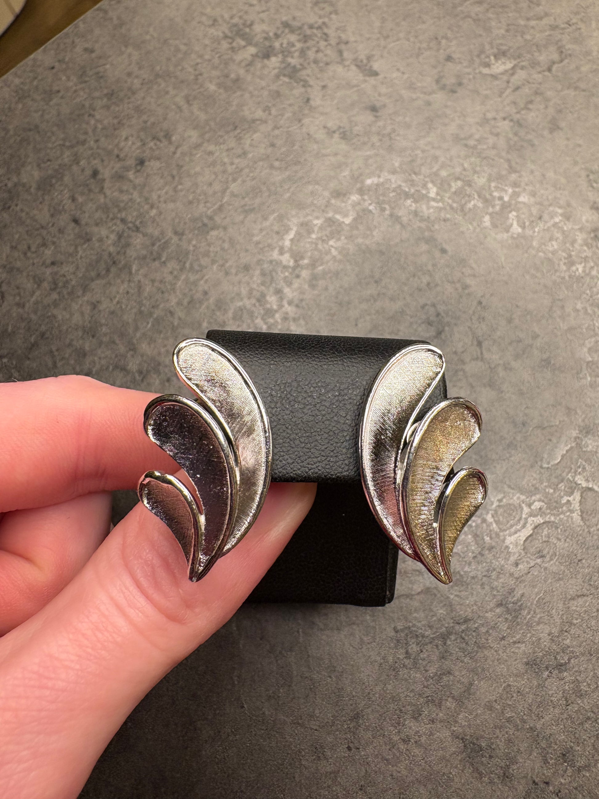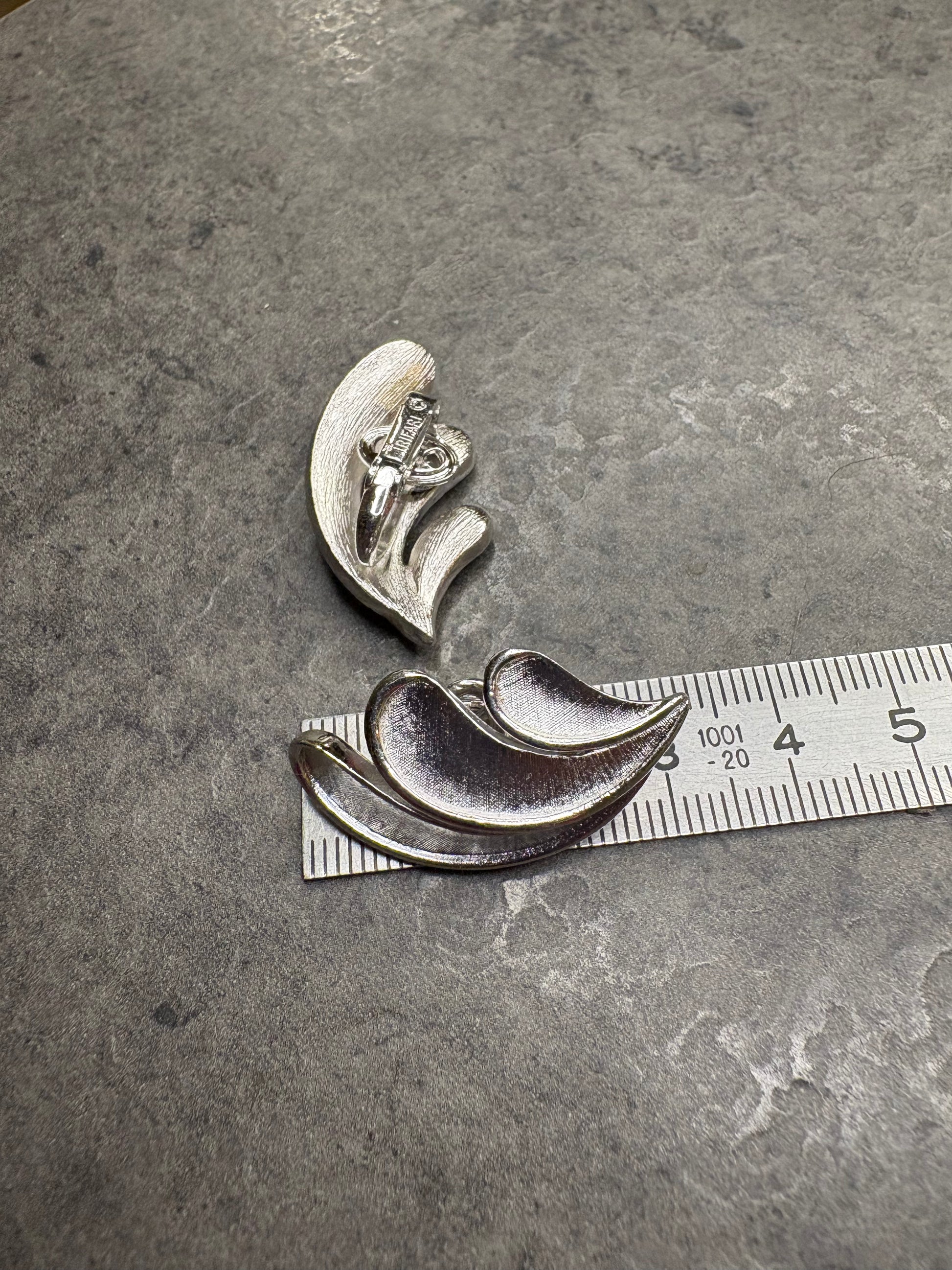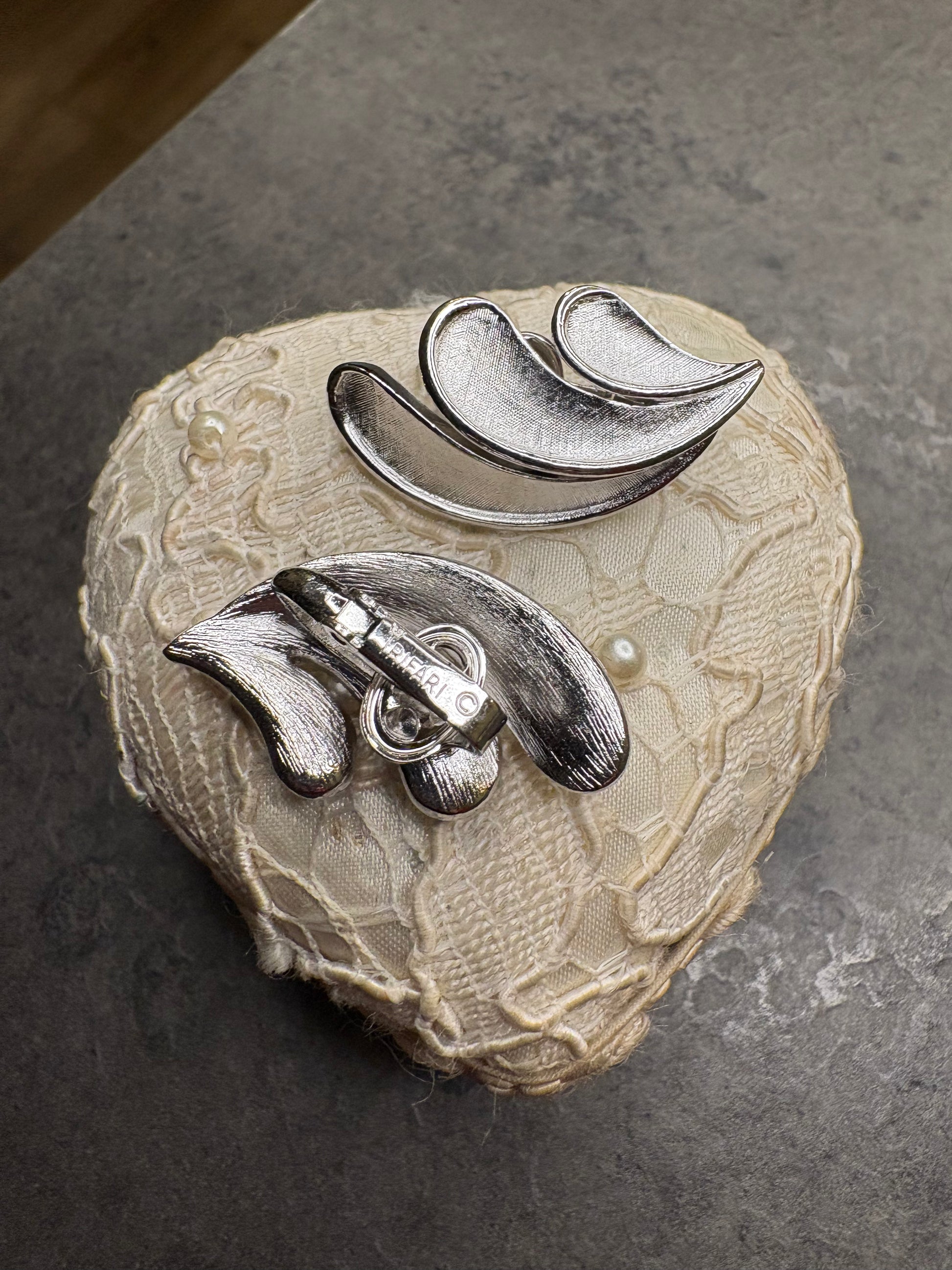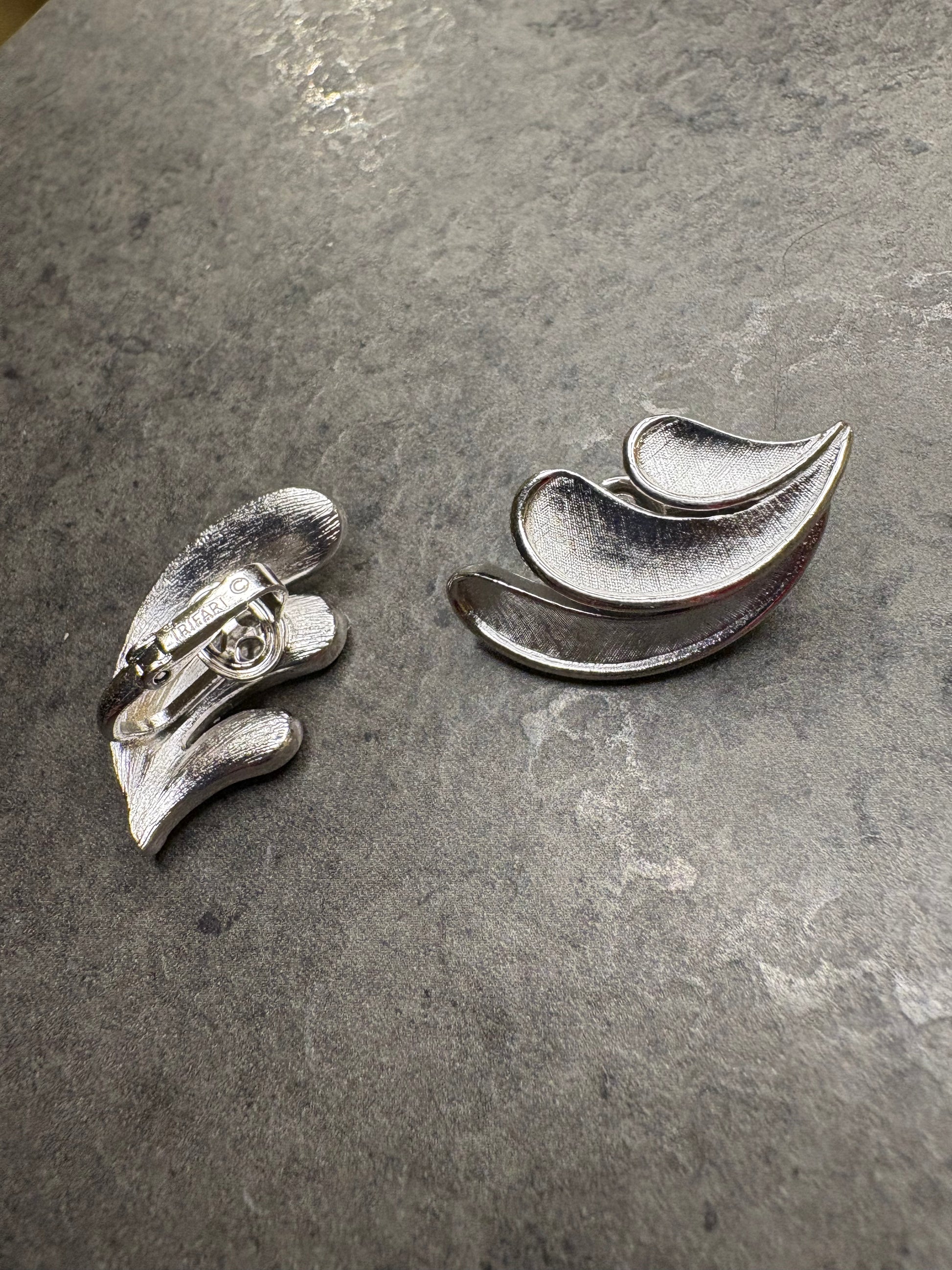 Splendidi orecchini a clip vintage Trifari, dal design elegante e scultoreo, realizzati in metallo argentato. Le forme morbide e ondulate, composte da tre elementi sovrapposti, creano un movimento armonioso che richiama onde o piume stilizzate.