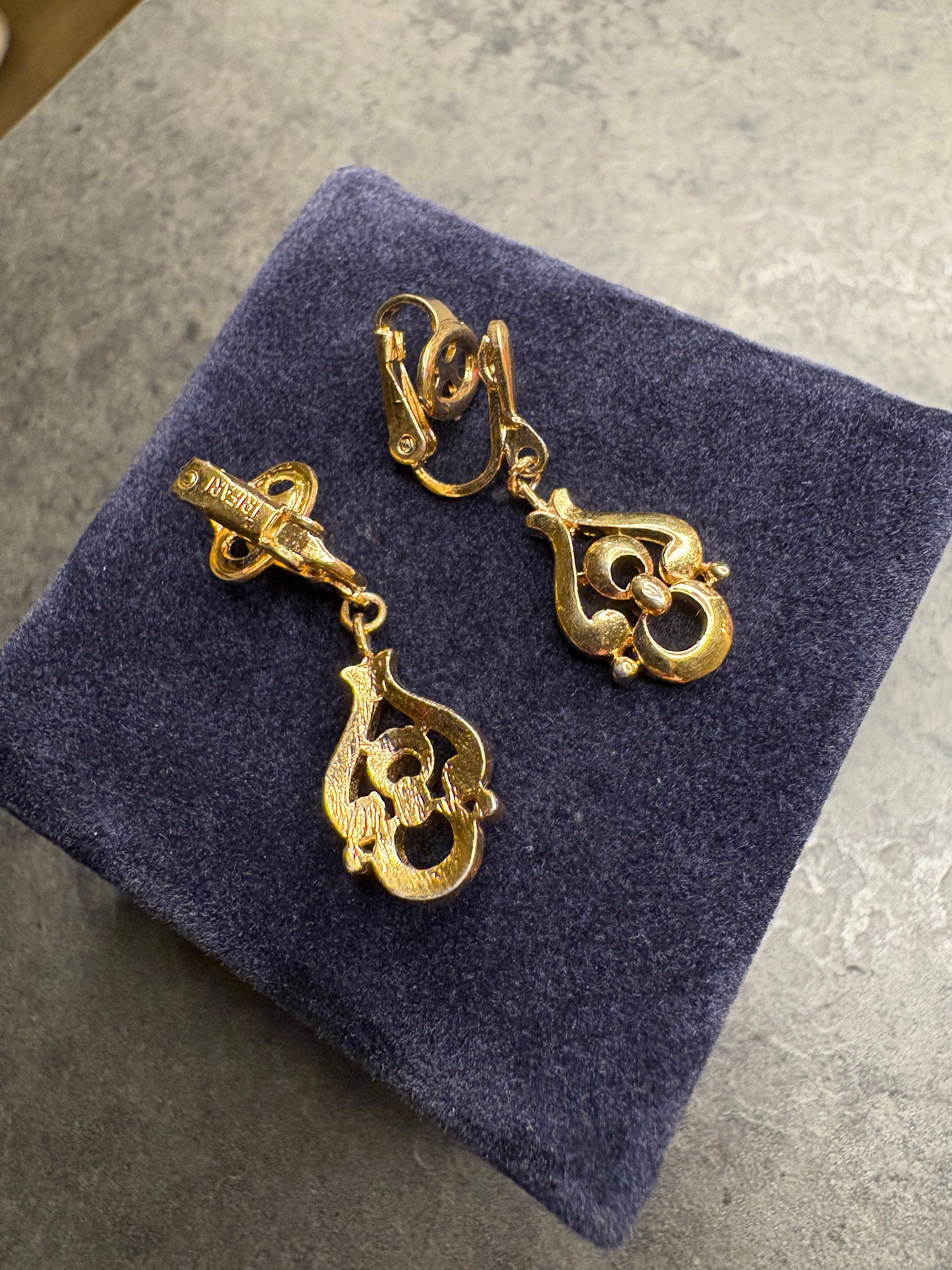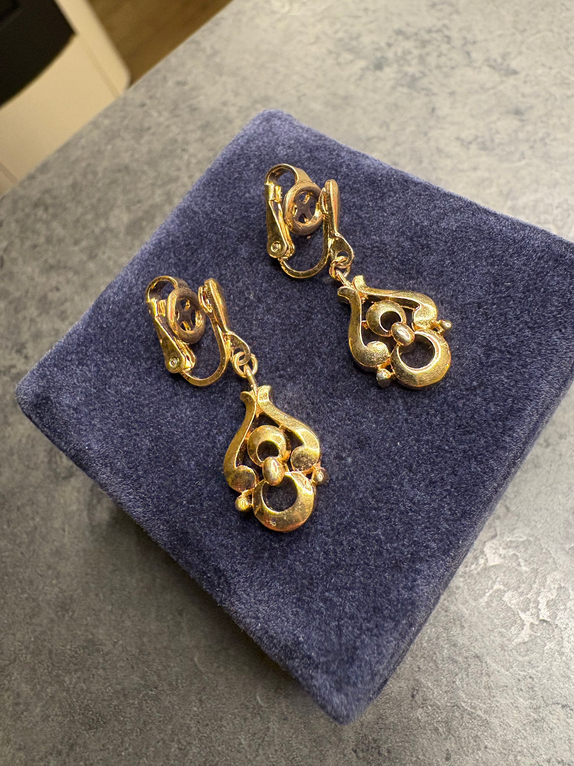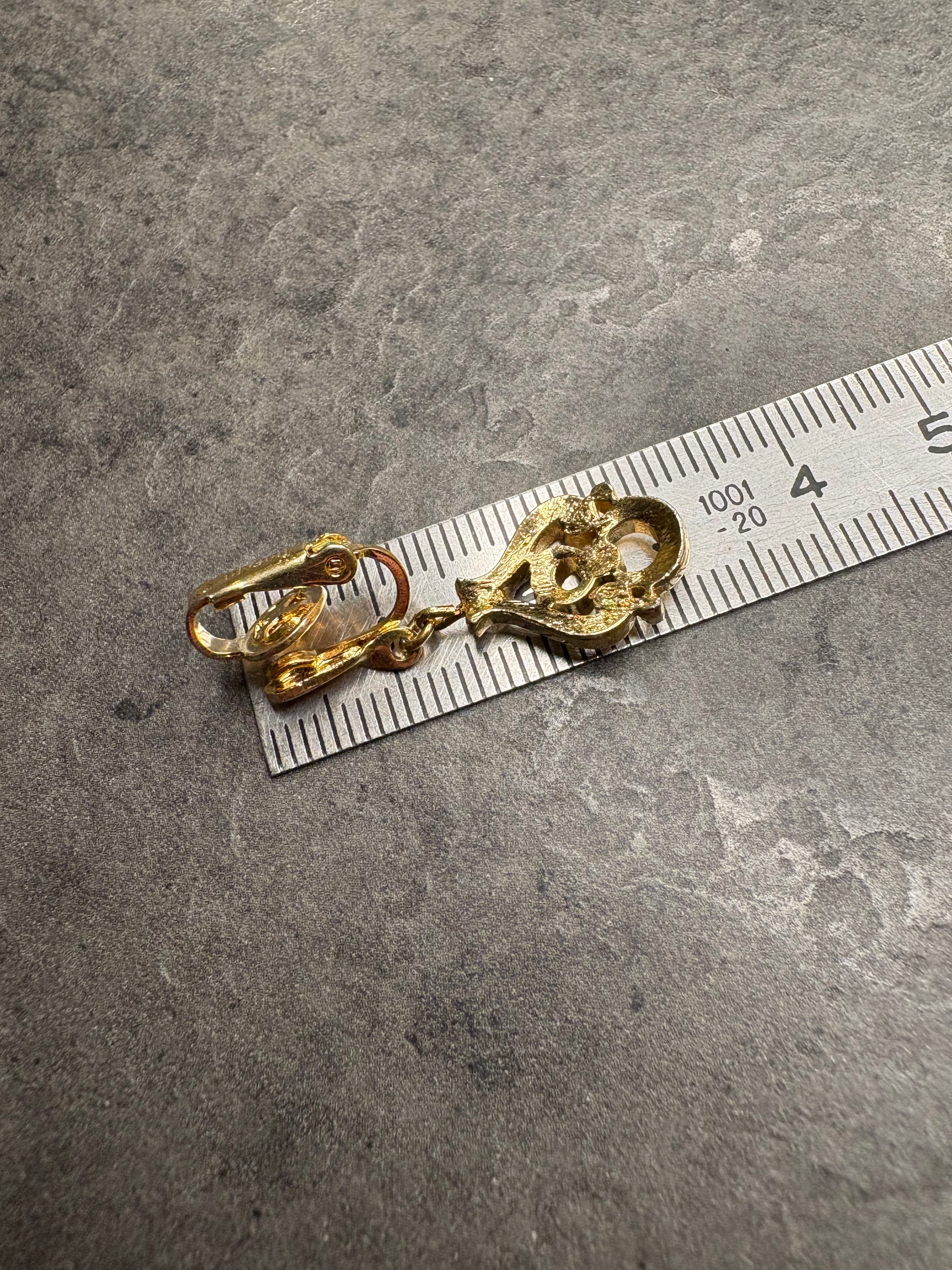 Questi splendidi orecchini a clip vintage firmati Trifari incantano con il loro design raffinato e ricco di carattere, tipico delle creazioni più eleganti della maison americana. La struttura è realizzata in metallo dorato con una lavorazione liscia e luminosa, che mette in risalto le curve armoniose del pendente.