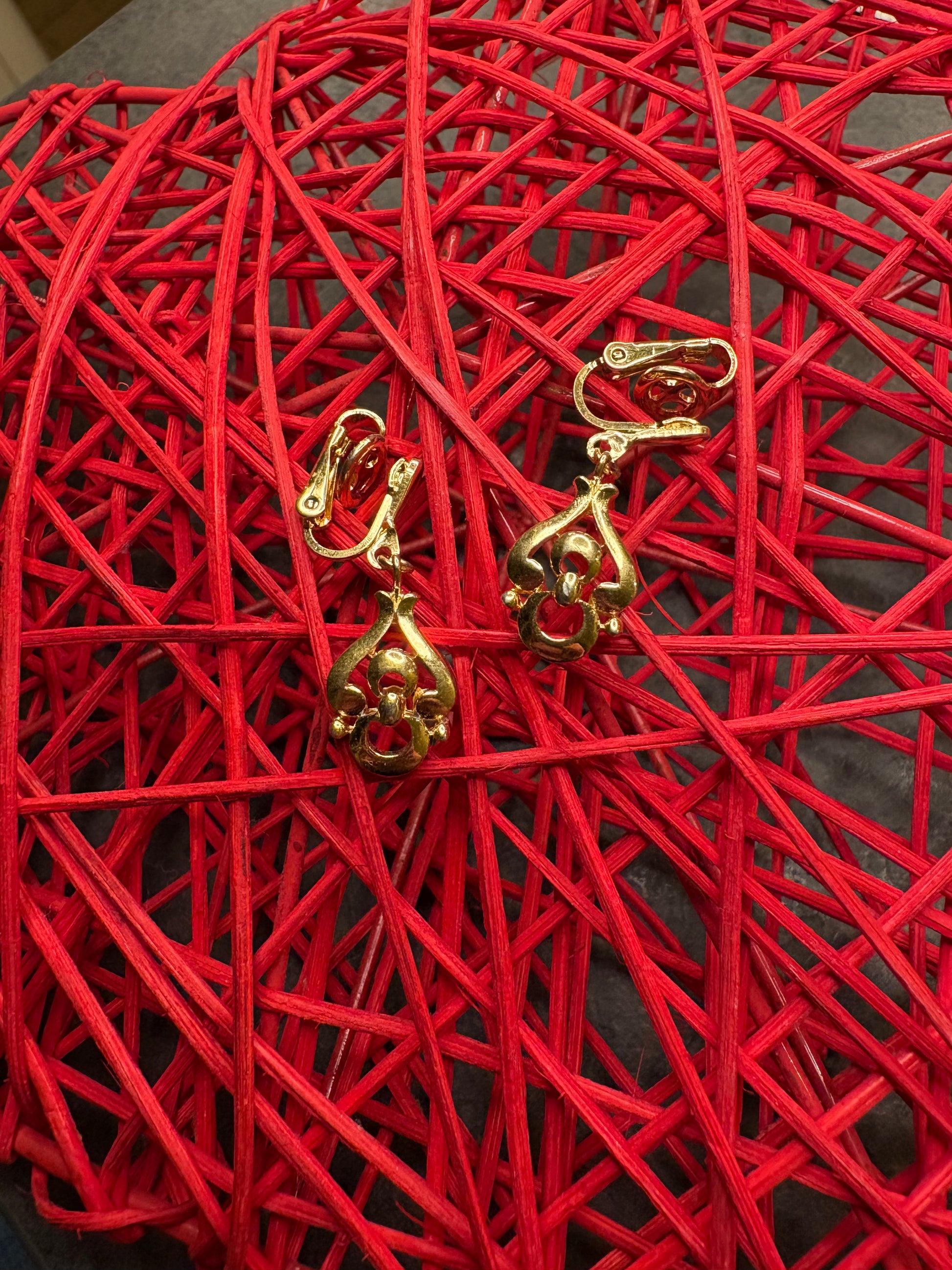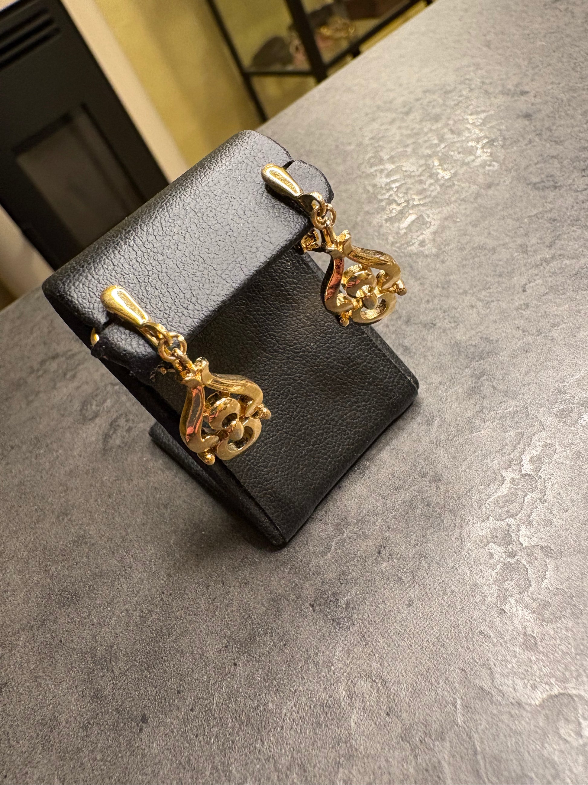 Il motivo è un intreccio stilizzato che ricorda un piccolo arabesco: linee morbide, volute e piccoli elementi sferici che creano un effetto decorativo equilibrato e sofisticato. La doratura conserva una bella brillantezza, mentre la clip marcata TRIFARI, garantisce una chiusura stabile e confortevole.