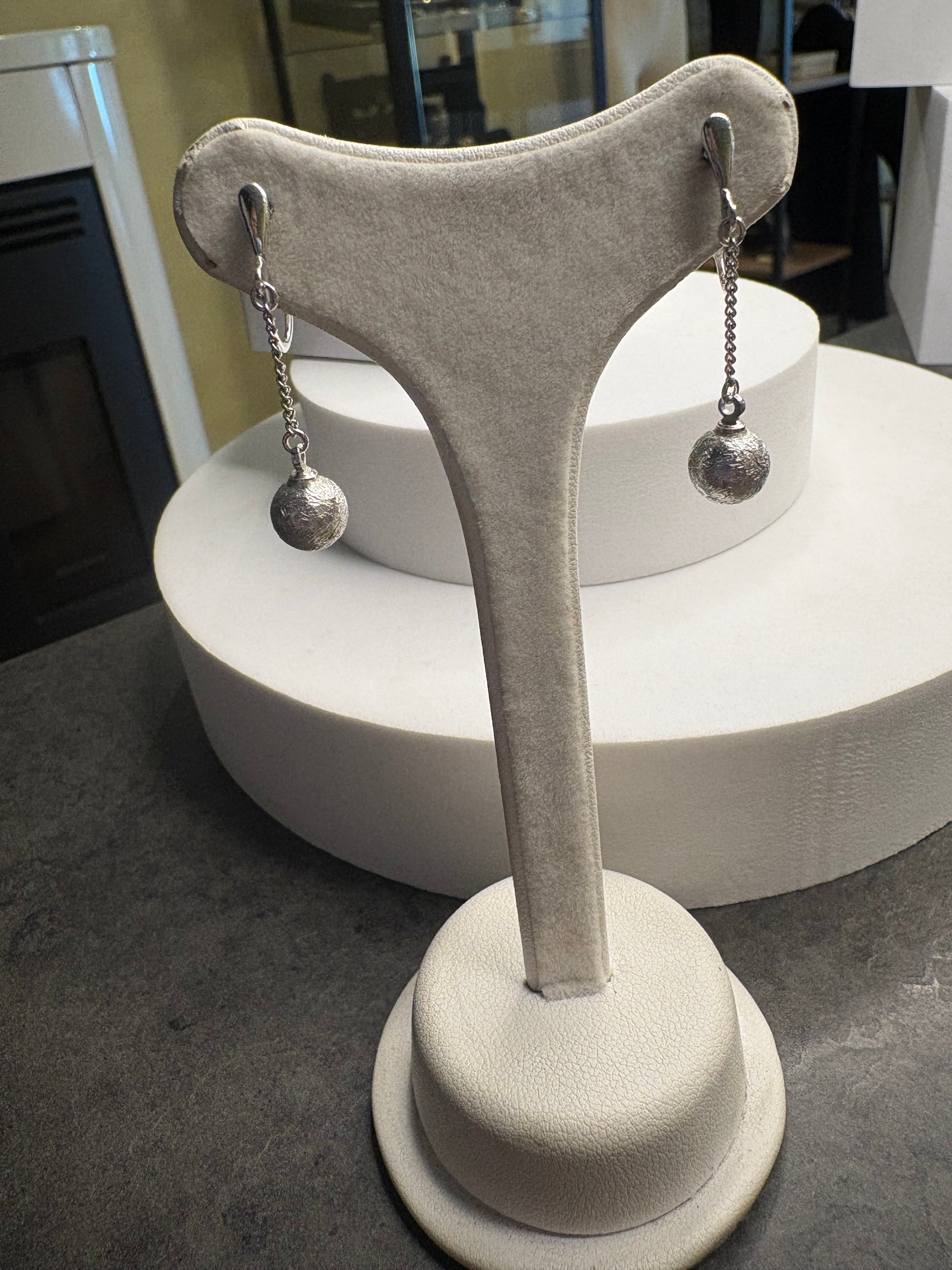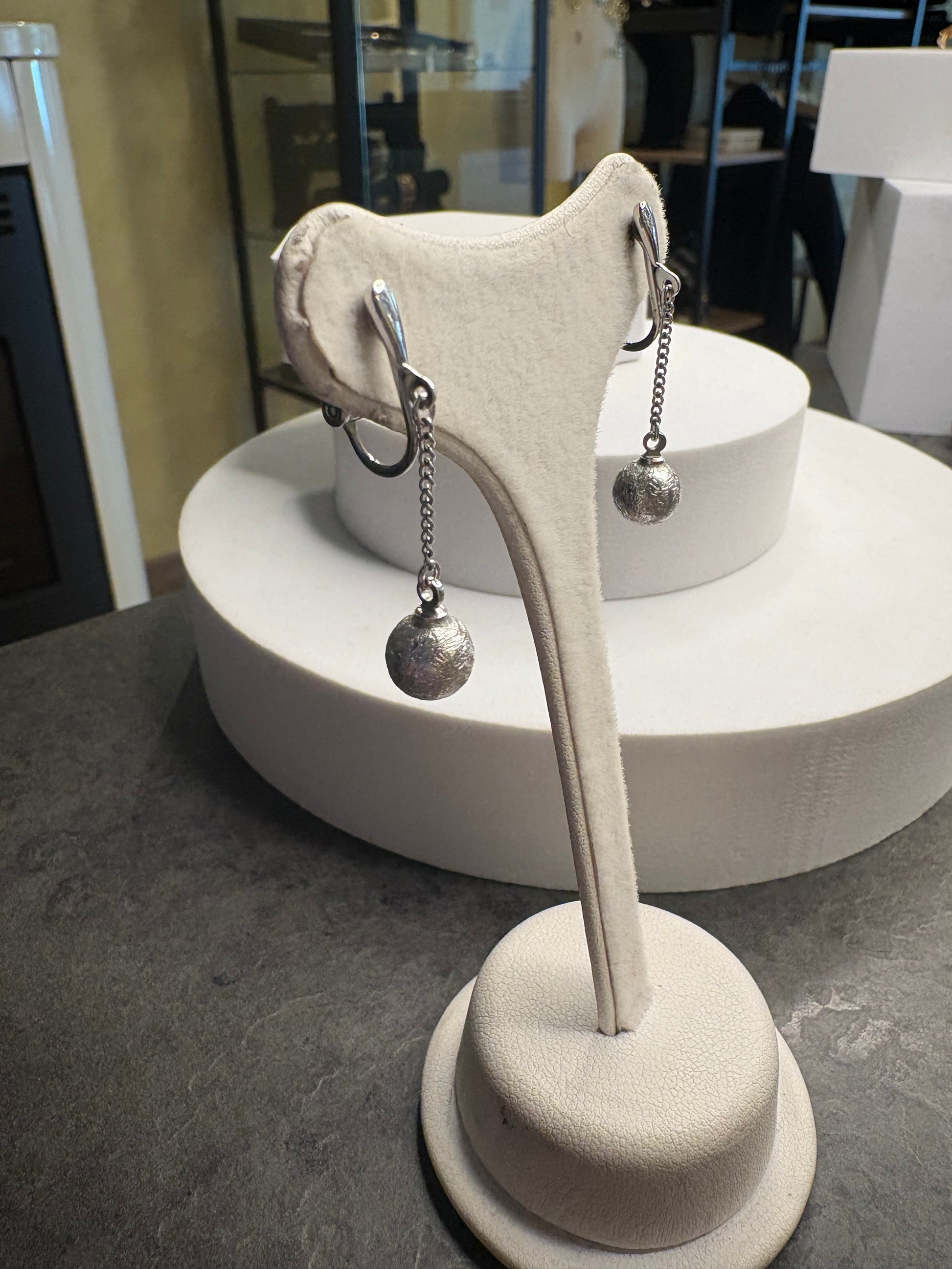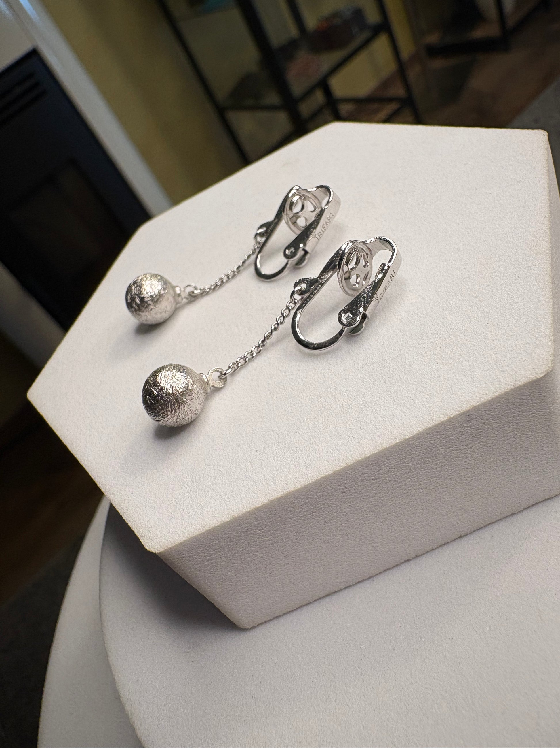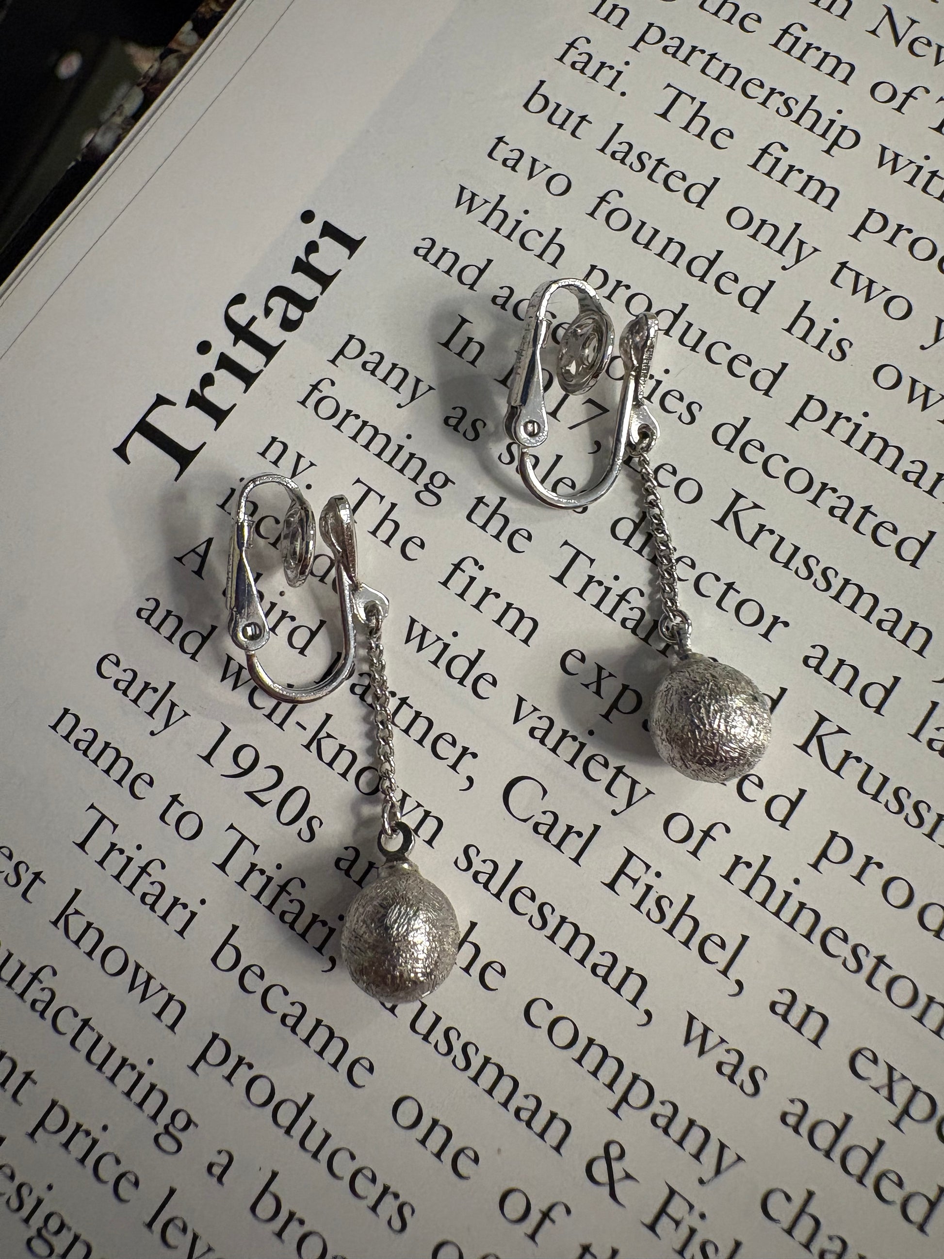 Eleganti orecchini vintage a clip firmati Trifari, realizzati in metallo color argento. Il design è essenziale e raffinato: una sottile catena termina con una piccola sfera satinata che dona movimento e leggerezza. La linea pulita e minimal li rende estremamente versatili, perfetti per valorizzare il viso con discrezione e classe. Leggeri e confortevoli, sono ideali sia per il giorno che per la sera.