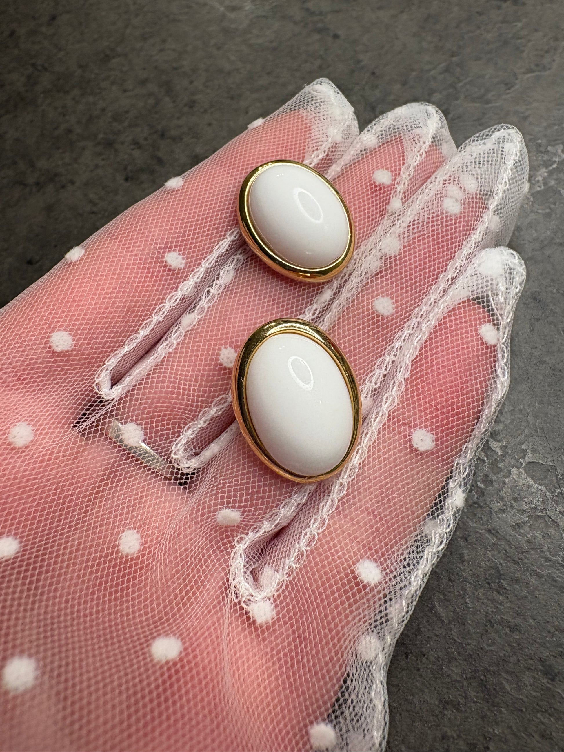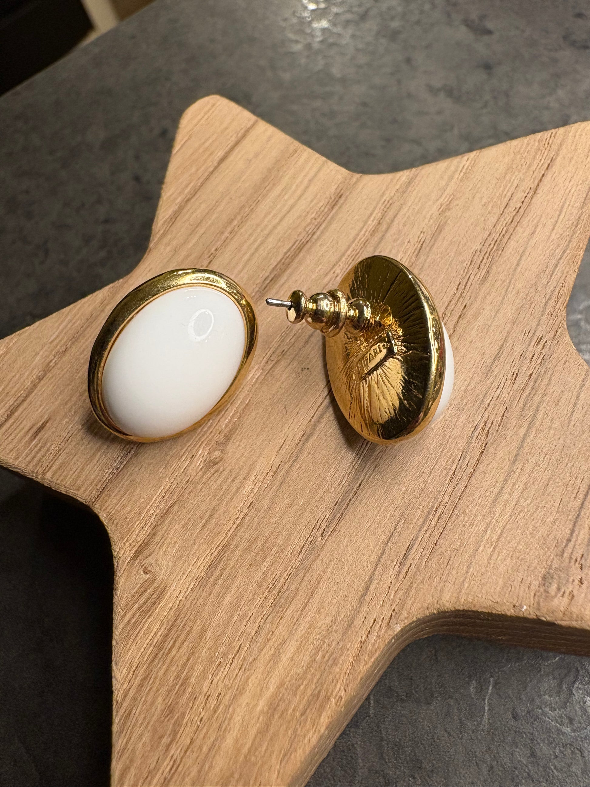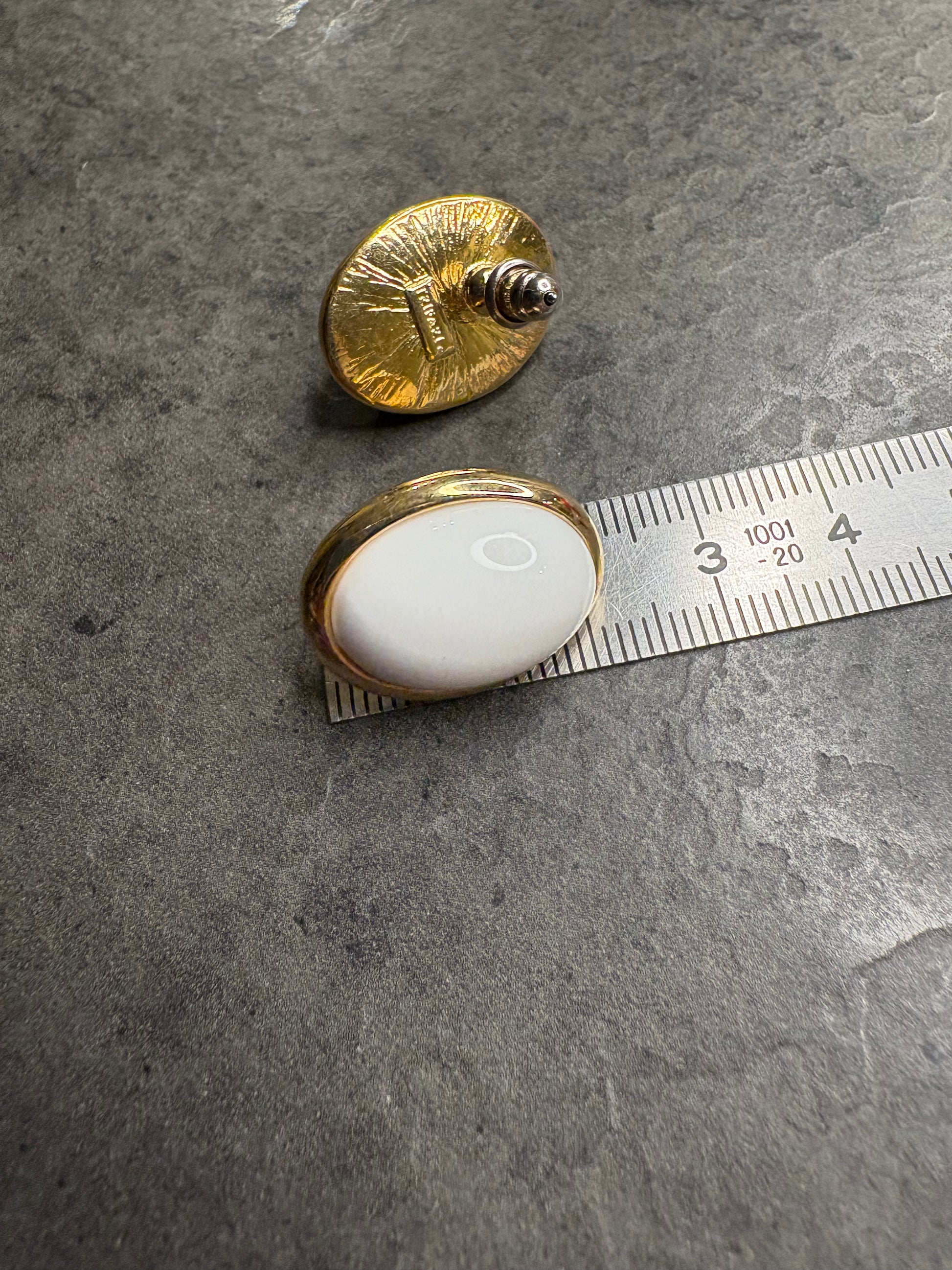 Eleganti orecchini vintage firmati Trifari TM, realizzati in metallo dorato con raffinata finitura lucida. Al centro è incastonato un cabochon bianco latte perfettamente liscio e bombato, con splendida lucentezza setosa che ricorda la porcellana. Il contrasto tra il bianco puro della pietra e il caldo oro della montatura crea un effetto molto chic e luminoso. Forma classica leggermente bombata, dimensione equilibrata e molto elegante. Chiusura a perno per lobi forati con farfallina. Accessorio senza tempo, perfetto sia per look quotidiani raffinati che per occasioni eleganti.