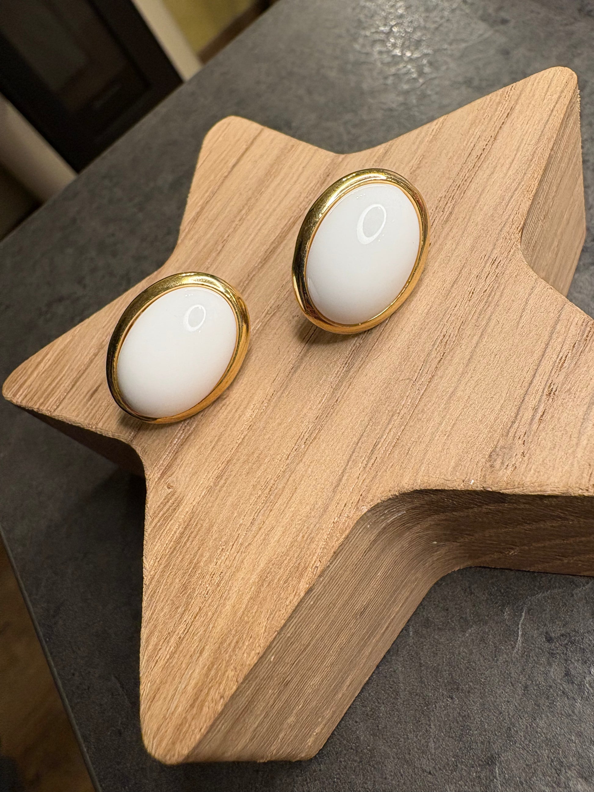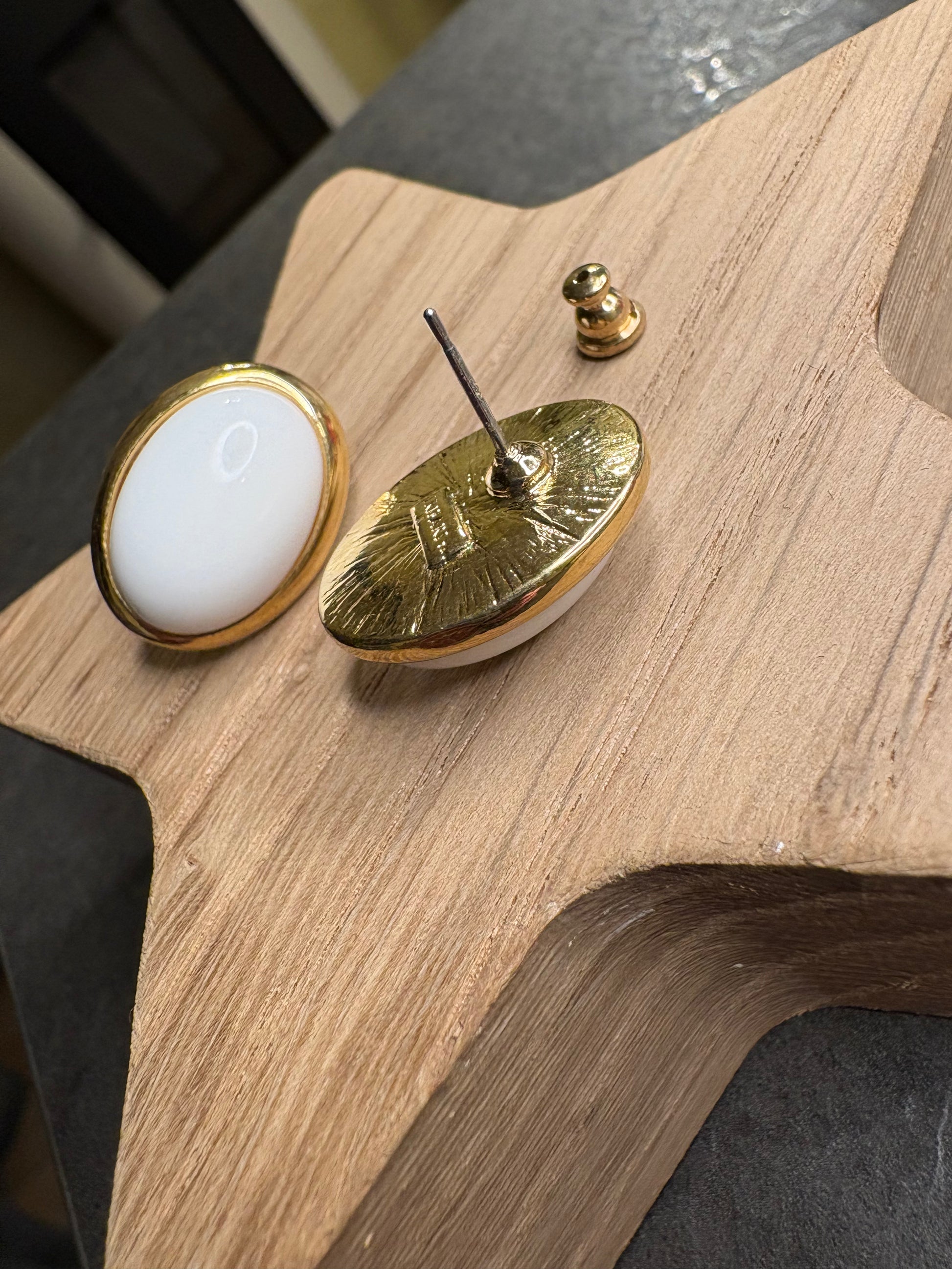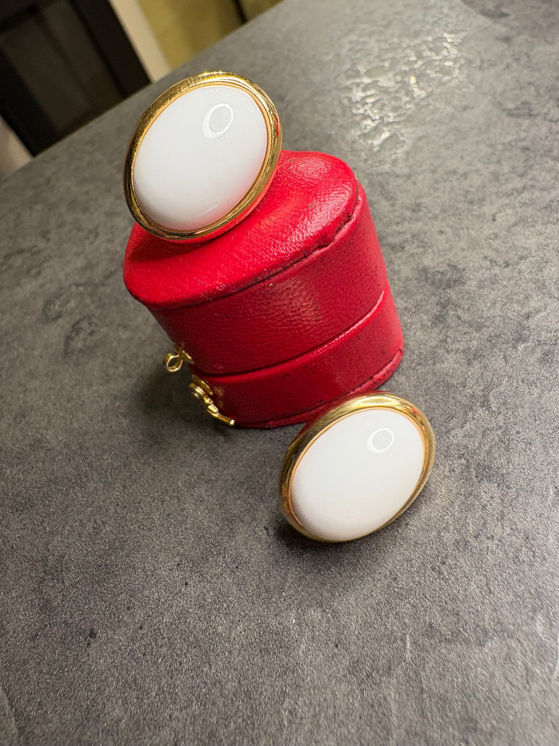 Eleganti orecchini vintage firmati Trifari TM, realizzati in metallo dorato con raffinata finitura lucida. Al centro è incastonato un cabochon bianco latte perfettamente liscio e bombato, con splendida lucentezza setosa che ricorda la porcellana. Il contrasto tra il bianco puro della pietra e il caldo oro della montatura crea un effetto molto chic e luminoso. Forma classica leggermente bombata, dimensione equilibrata e molto elegante. Chiusura a perno per lobi forati con farfallina. Accessorio senza tempo, perfetto sia per look quotidiani raffinati che per occasioni eleganti.