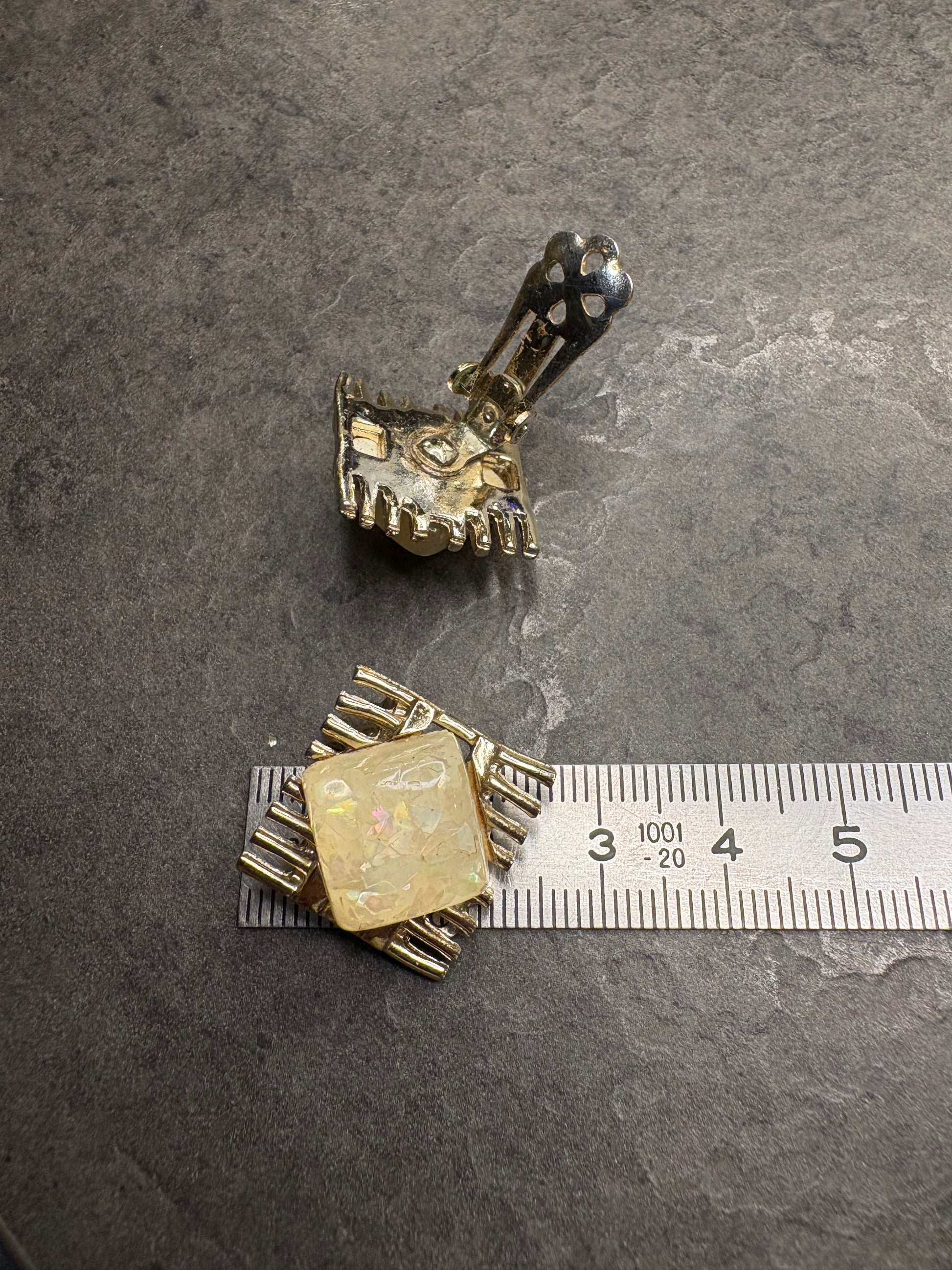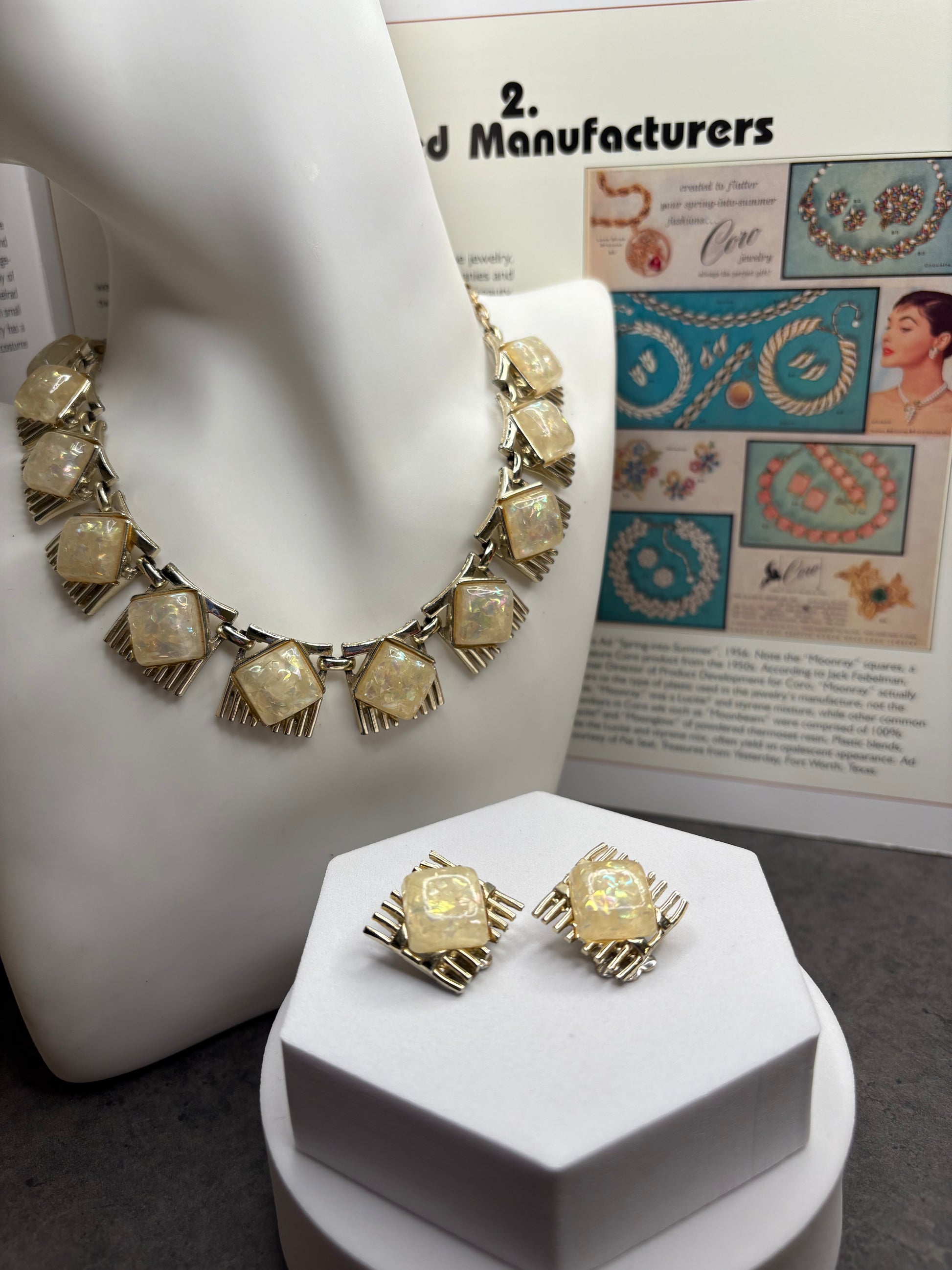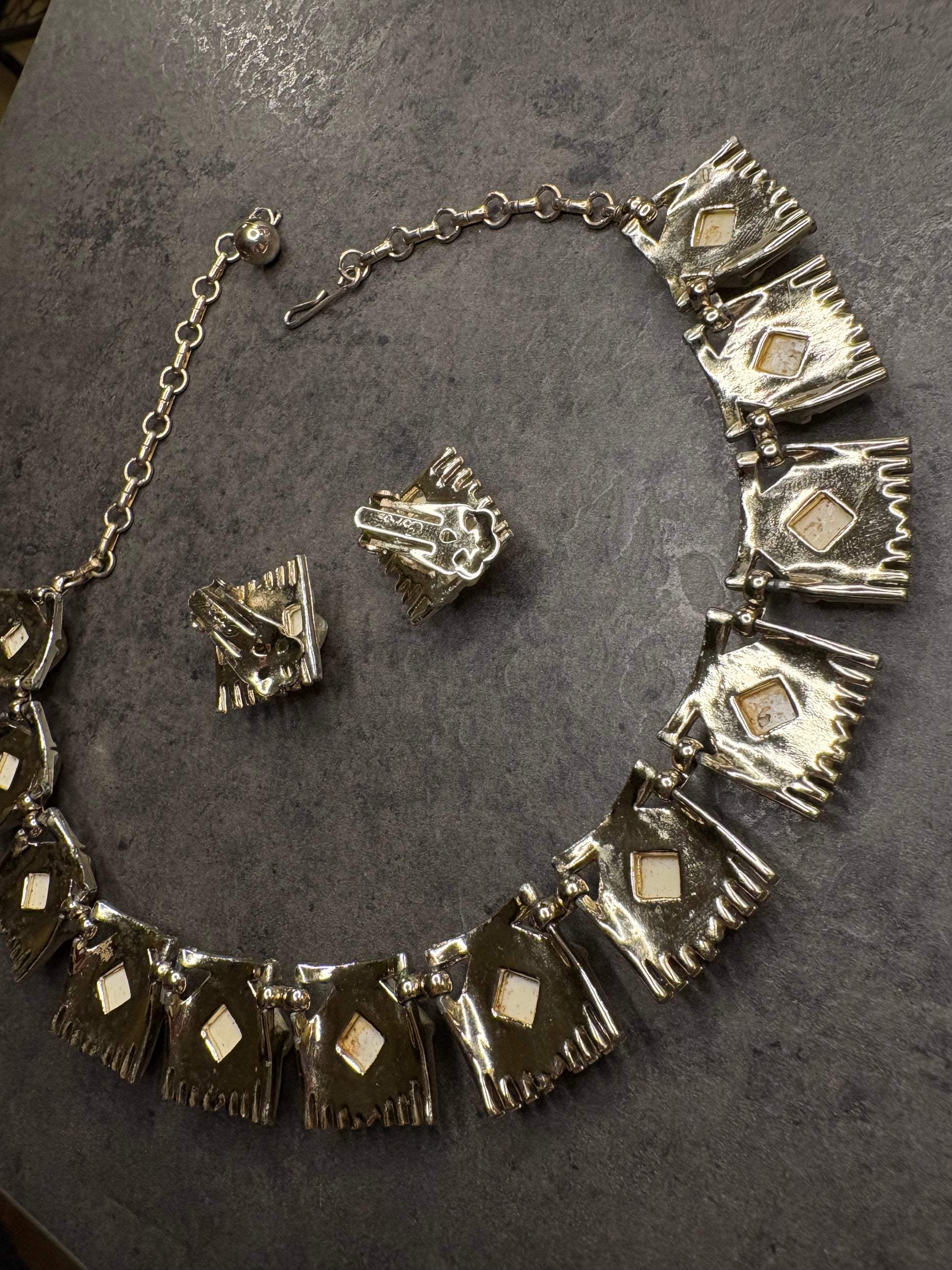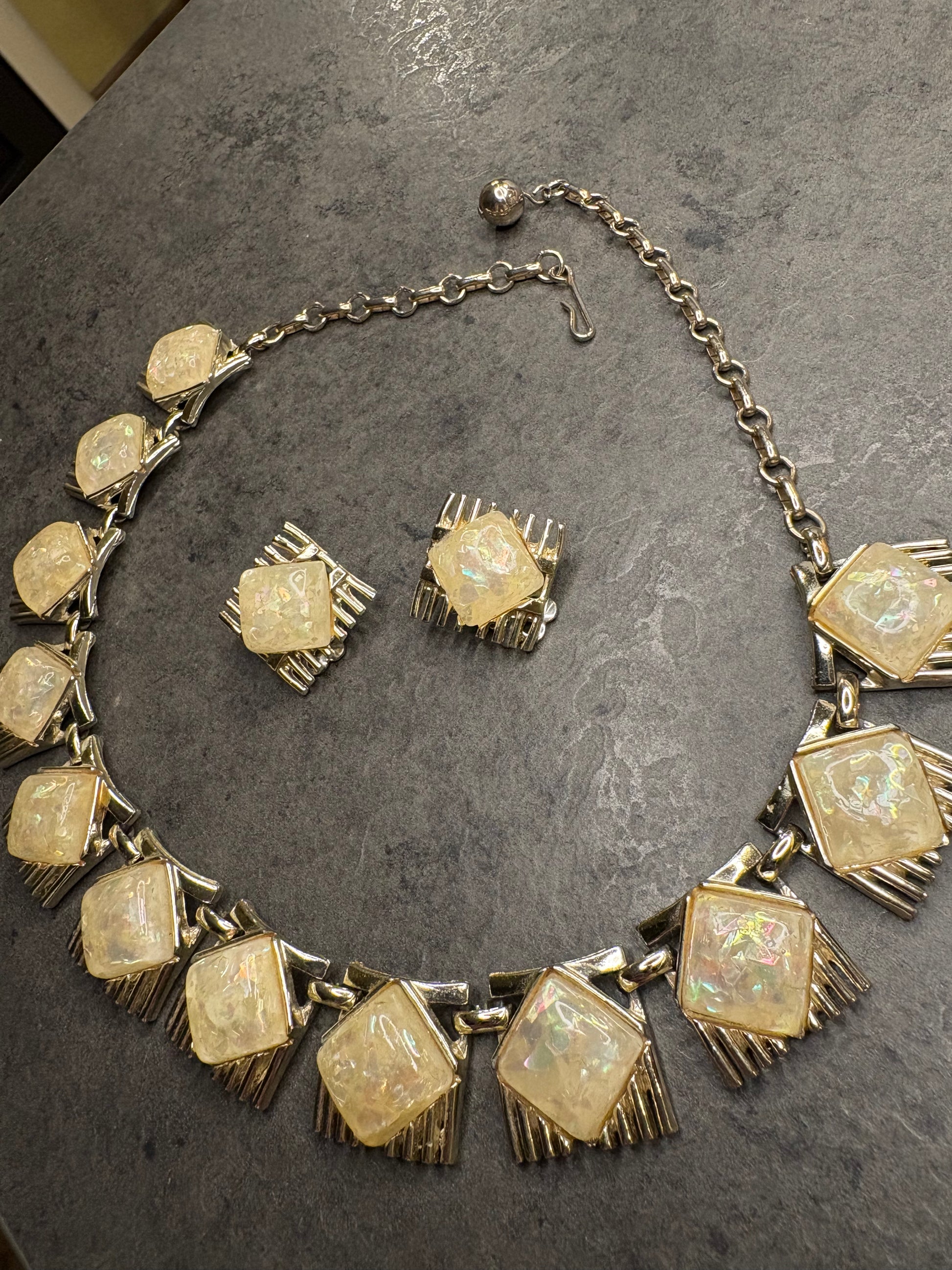 Questa incantevole parure firmata Coro, risalente agli anni ’50, è composta da un collier lungo circa 41 cm e un paio di orecchini a clip, entrambi realizzati con dettagli eleganti e distintivi dell’epoca. I gioielli utilizzano elementi in lucite che imitano l’effetto opale, donando un aspetto luminoso e cangiante, con delicate sfumature che riflettono la luce.