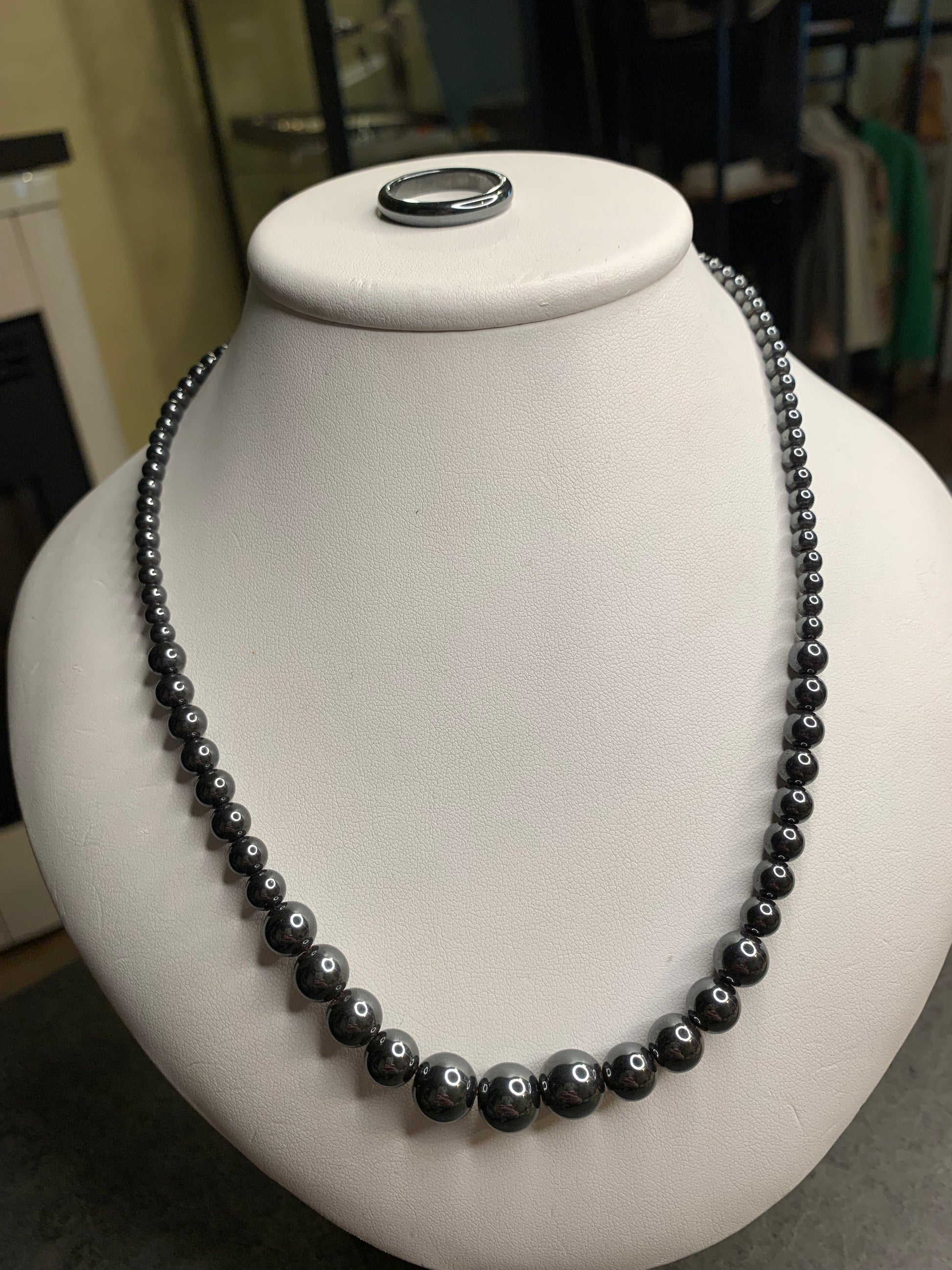 Questa demi parure è un elegante set realizzato in ematite, composto da un girocollo e un anello. Il girocollo, lungo circa 46 cm, presenta una fila di perle sferiche lucenti, tipiche dell’ematite, che conferiscono un aspetto sofisticato e moderno. La chiusura è a vite, un dettaglio pratico e discreto che assicura una tenuta sicura. L’anello, coordinato, è un semplice cerchio in ematite con una finitura liscia e brillante, progettato per abbinarsi armoniosamente al girocollo.