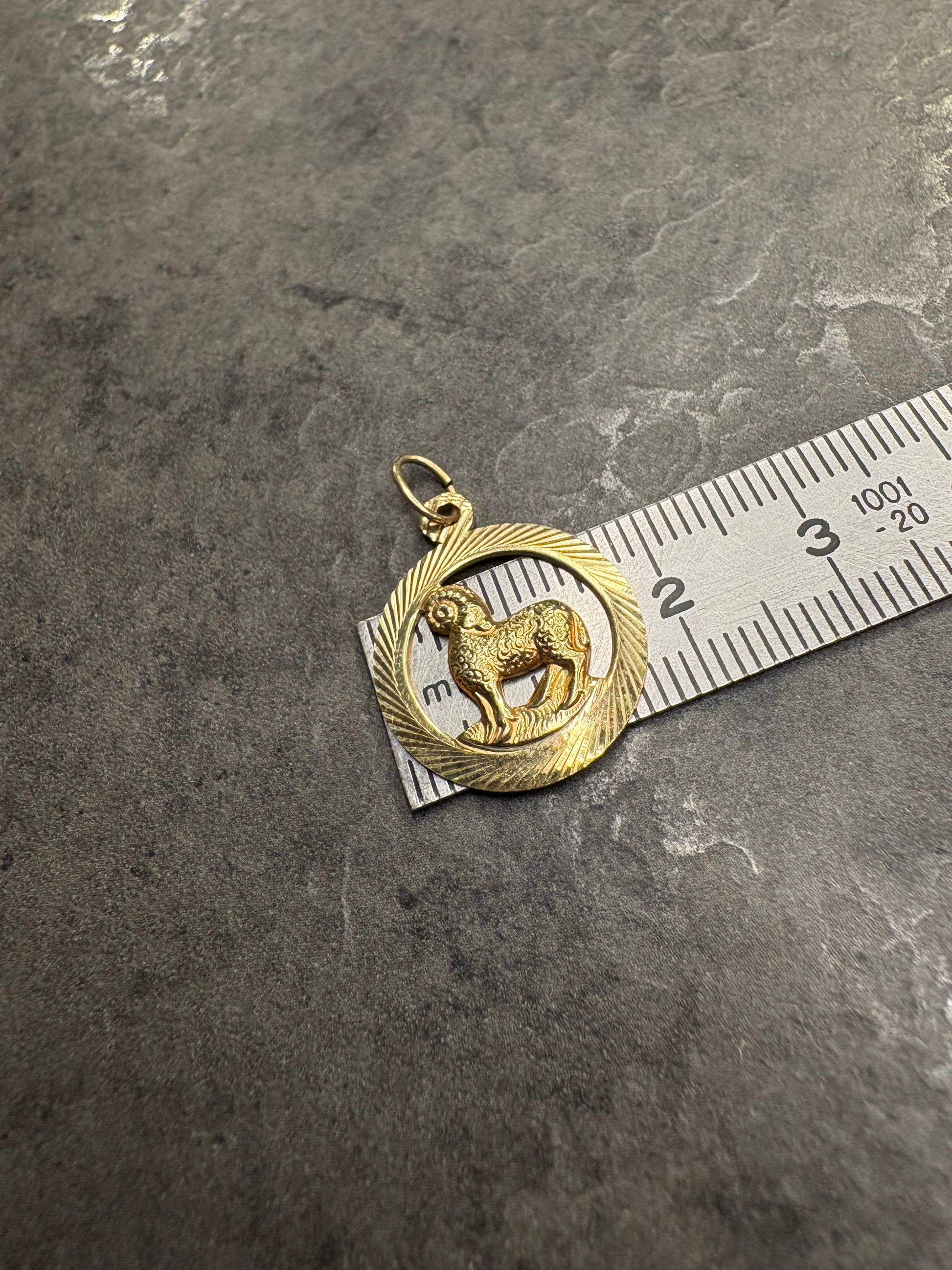 Elegante pendente vintage in Amerikaner, raffigurante un ariete in rilievo racchiuso in una cornice circolare dorata dal bordo inciso con una delicata lavorazione a raggiera.