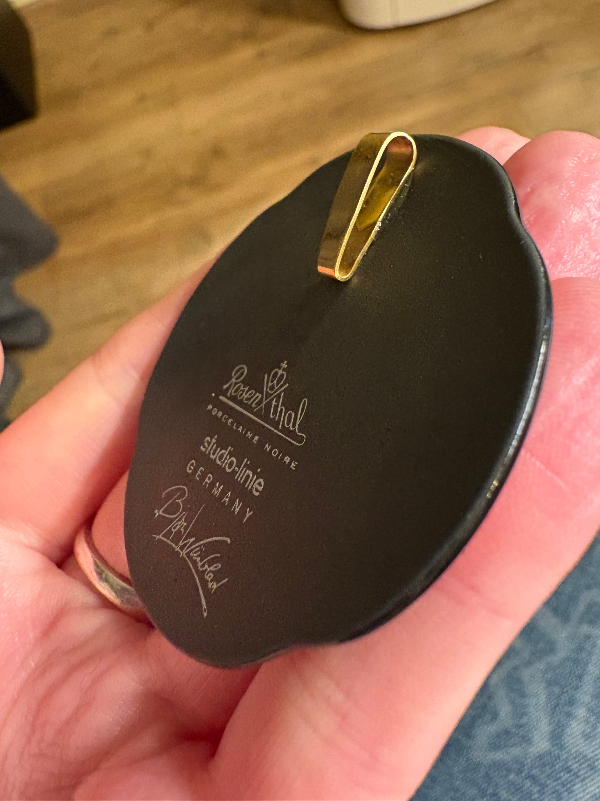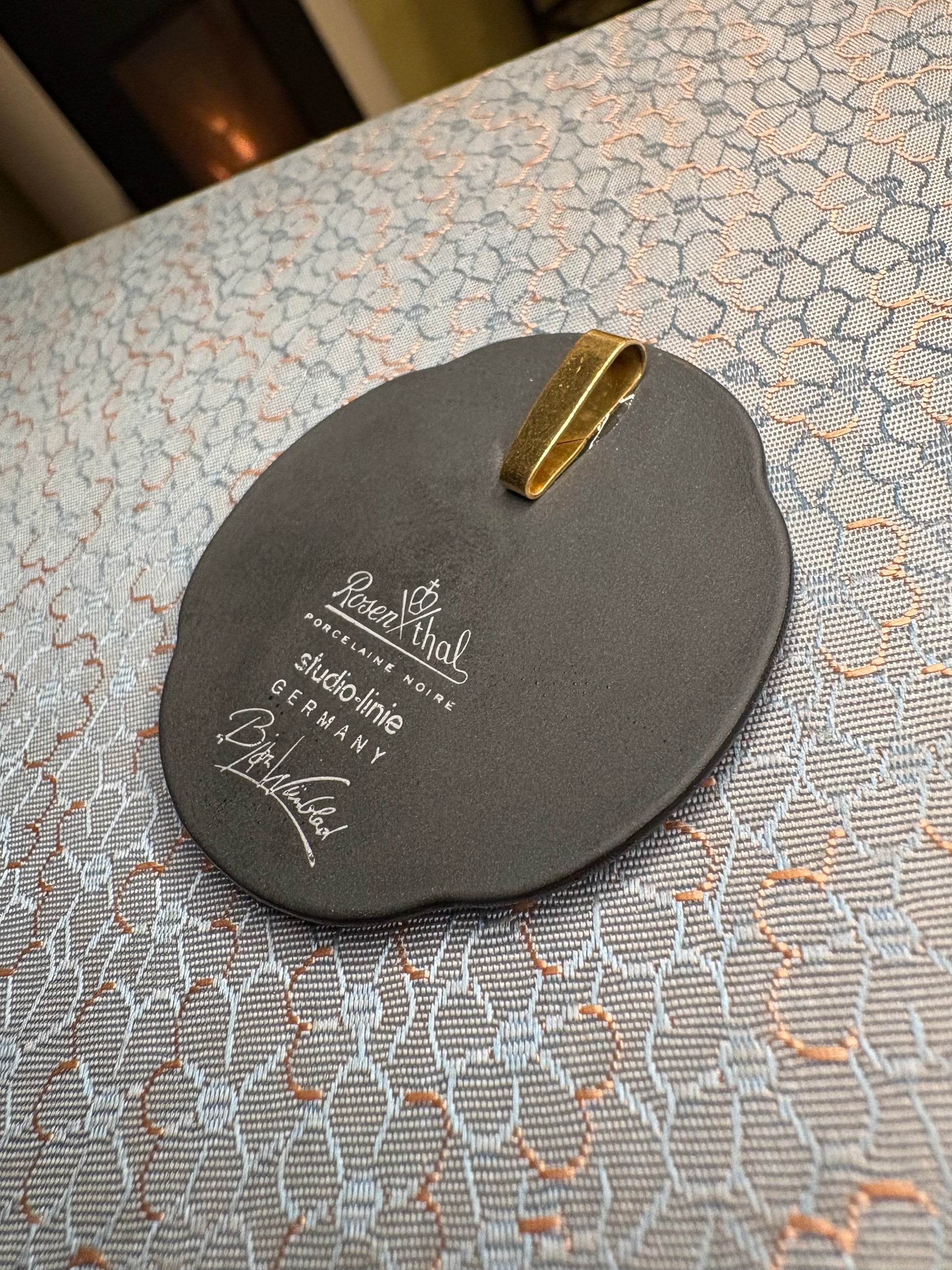 Il retro presenta la marcatura originale Rosenthal – Porcelaine Noire – Studio-Linie – Germany – Björn Wiinblad e un gancio dorato per l’utilizzo come ciondolo o elemento decorativo.