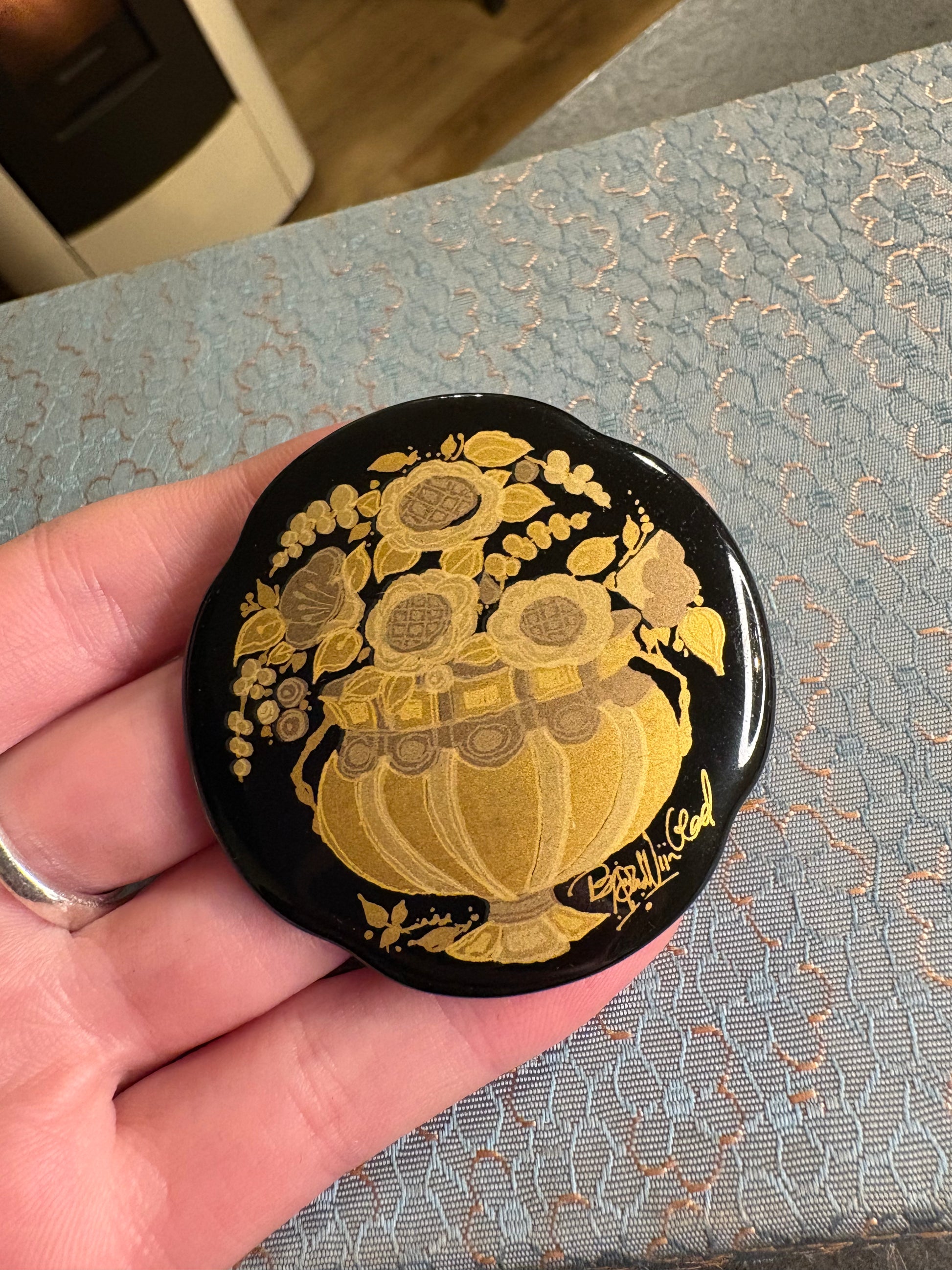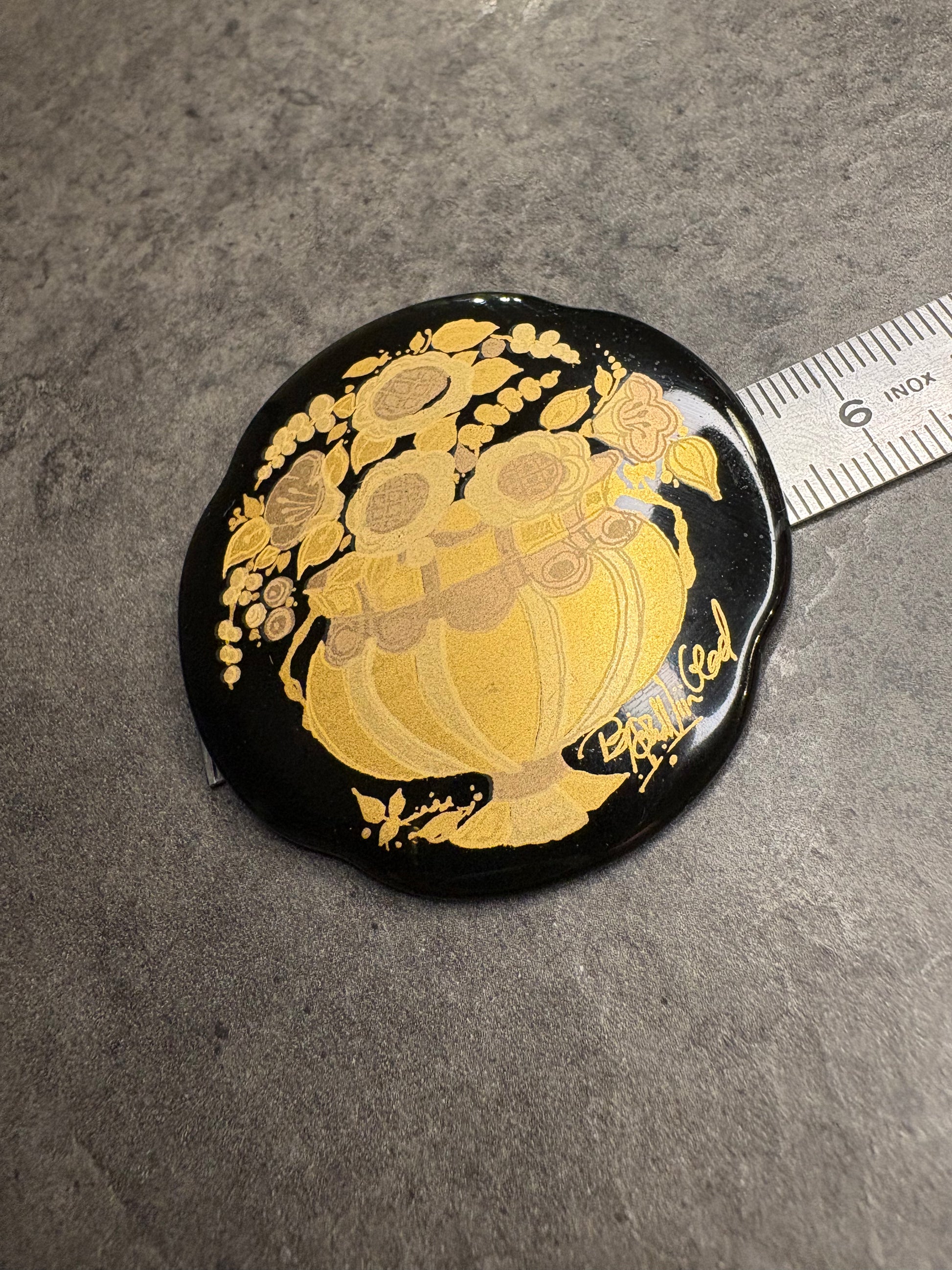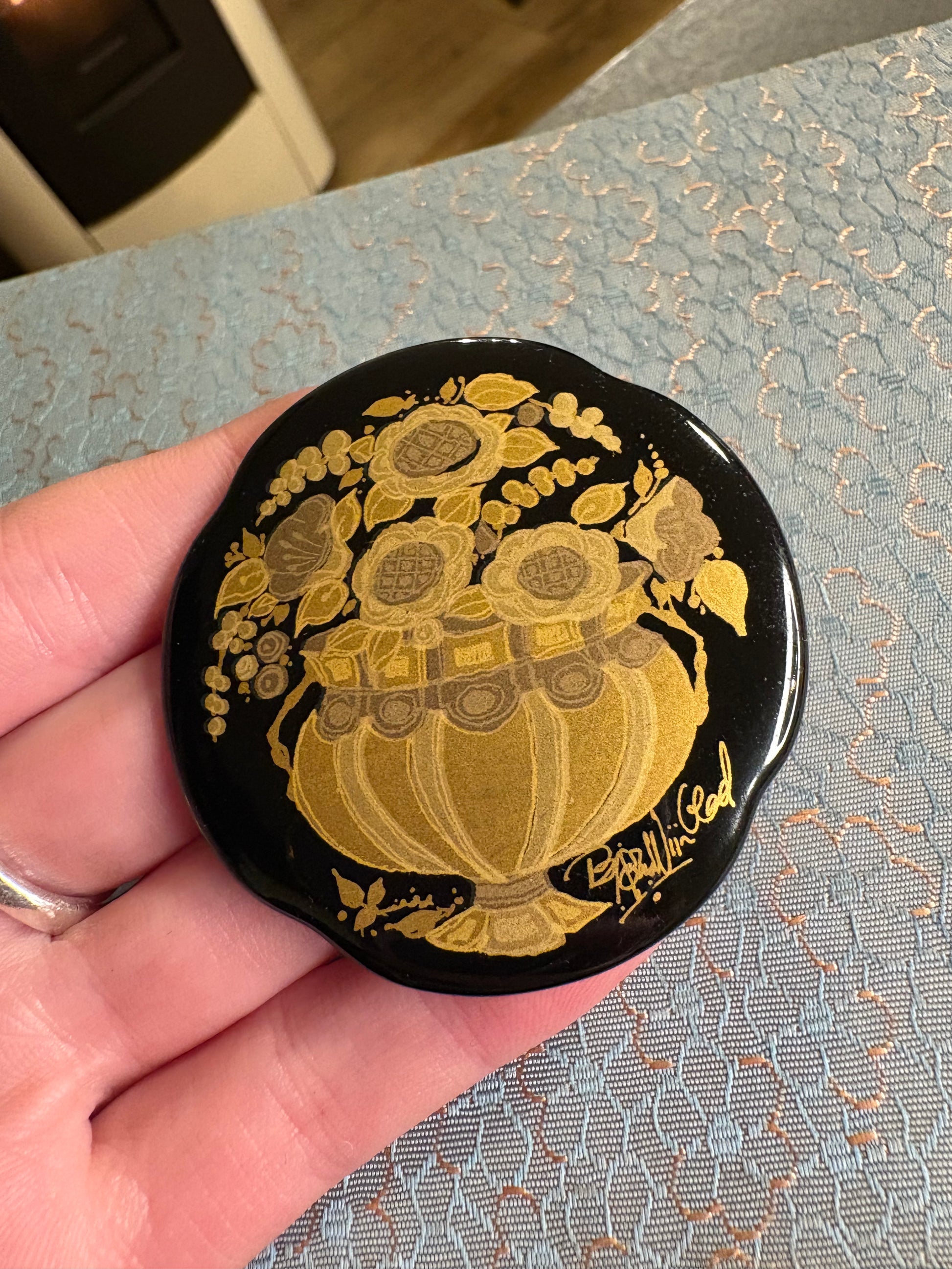 La superficie lucida e profonda del nero ospita una delicata decorazione dorata, raffigurante un vaso fiorito stilizzato dal gusto artistico e poetico, tipico dell’estro di Wiinblad. Ogni dettaglio, finemente inciso e dorato, riflette la maestria artigianale e l’eleganza distintiva della produzione Rosenthal.