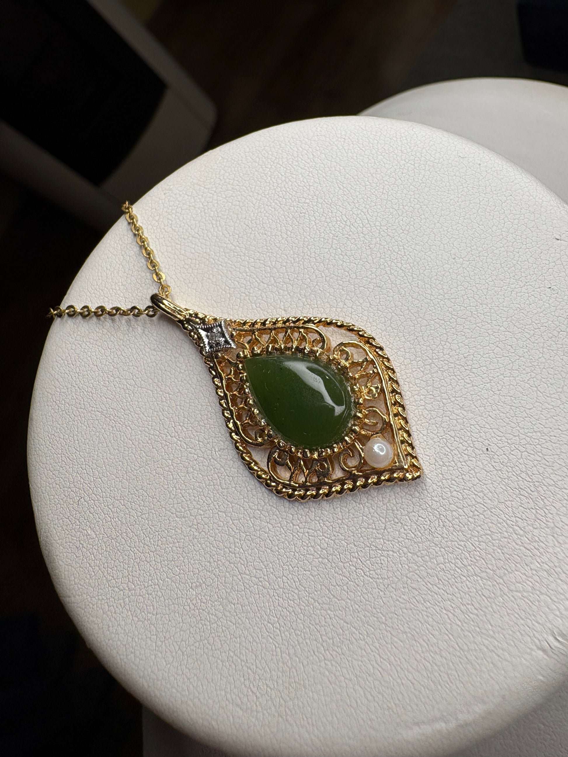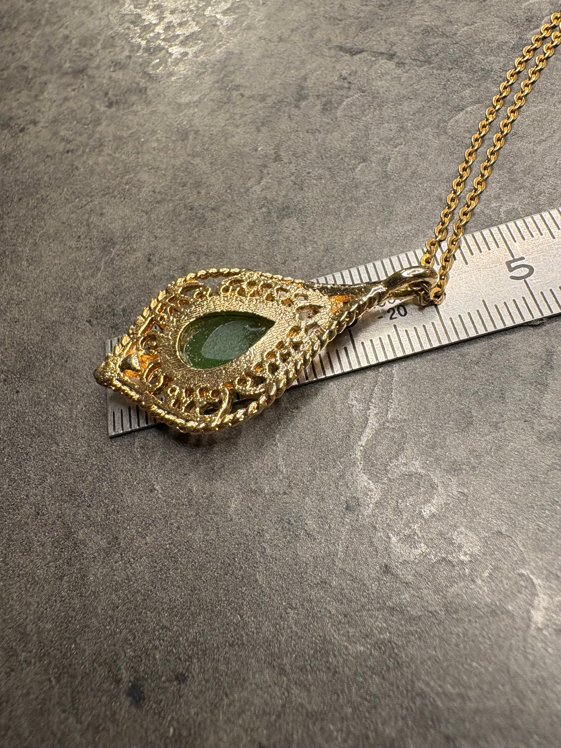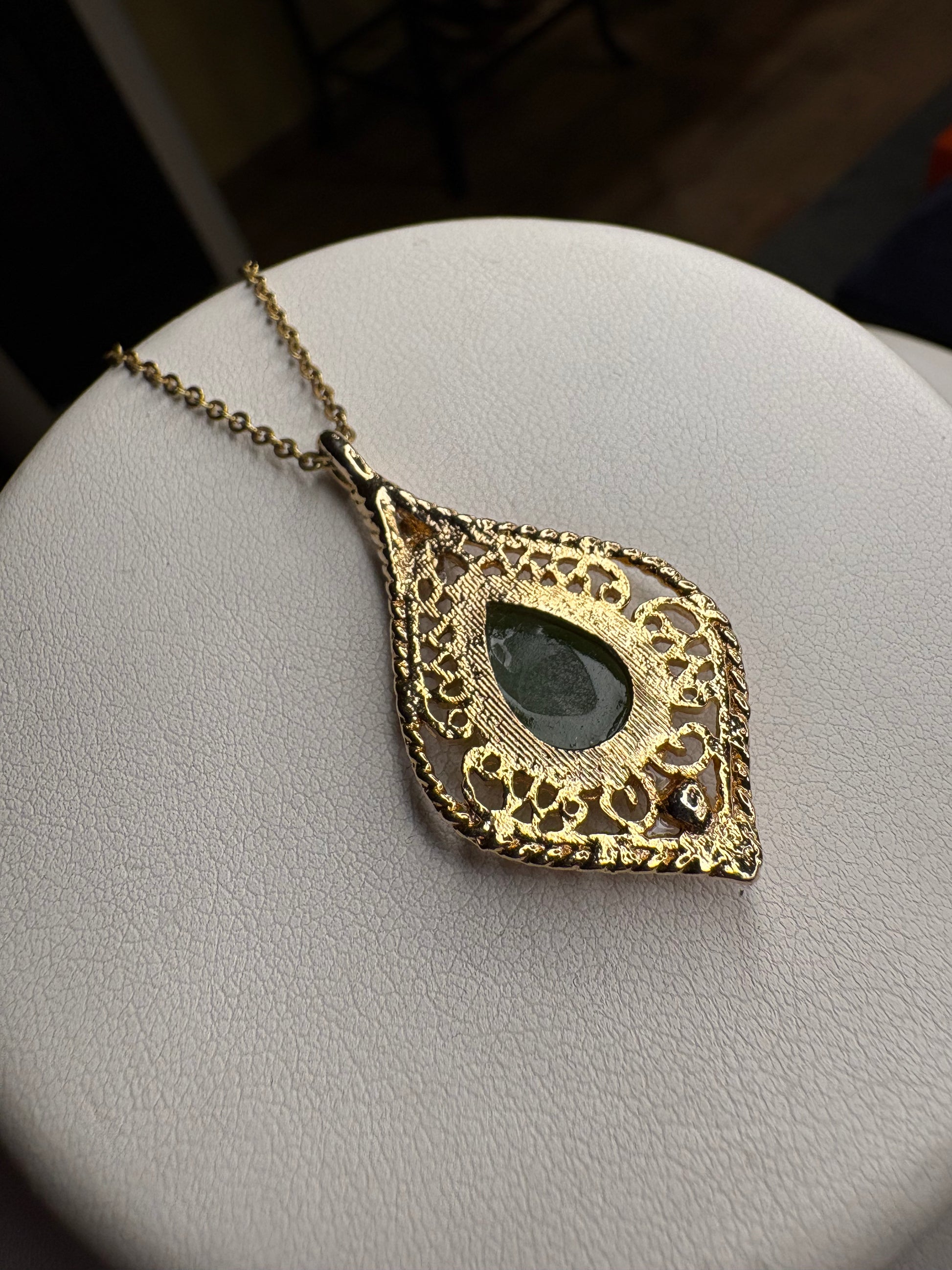 Pendente vintage di grande fascino, realizzato in metallo dorato con lavorazione traforata che richiama motivi ornamentali raffinati e leggeri. Al centro è incastonato un elegante elemento in giada verde a goccia, dalla superficie liscia e luminosa, che costituisce il cuore del gioiello.