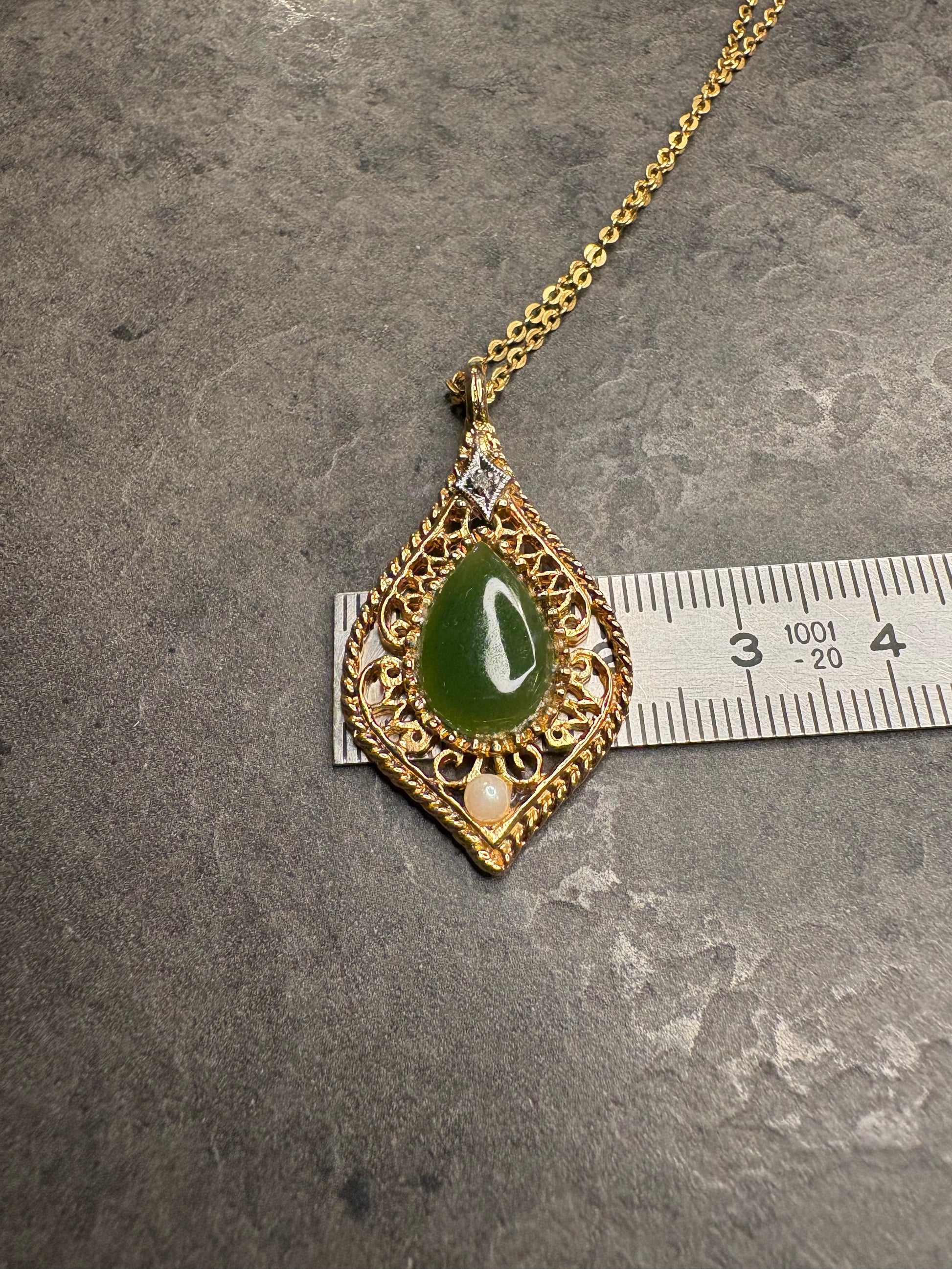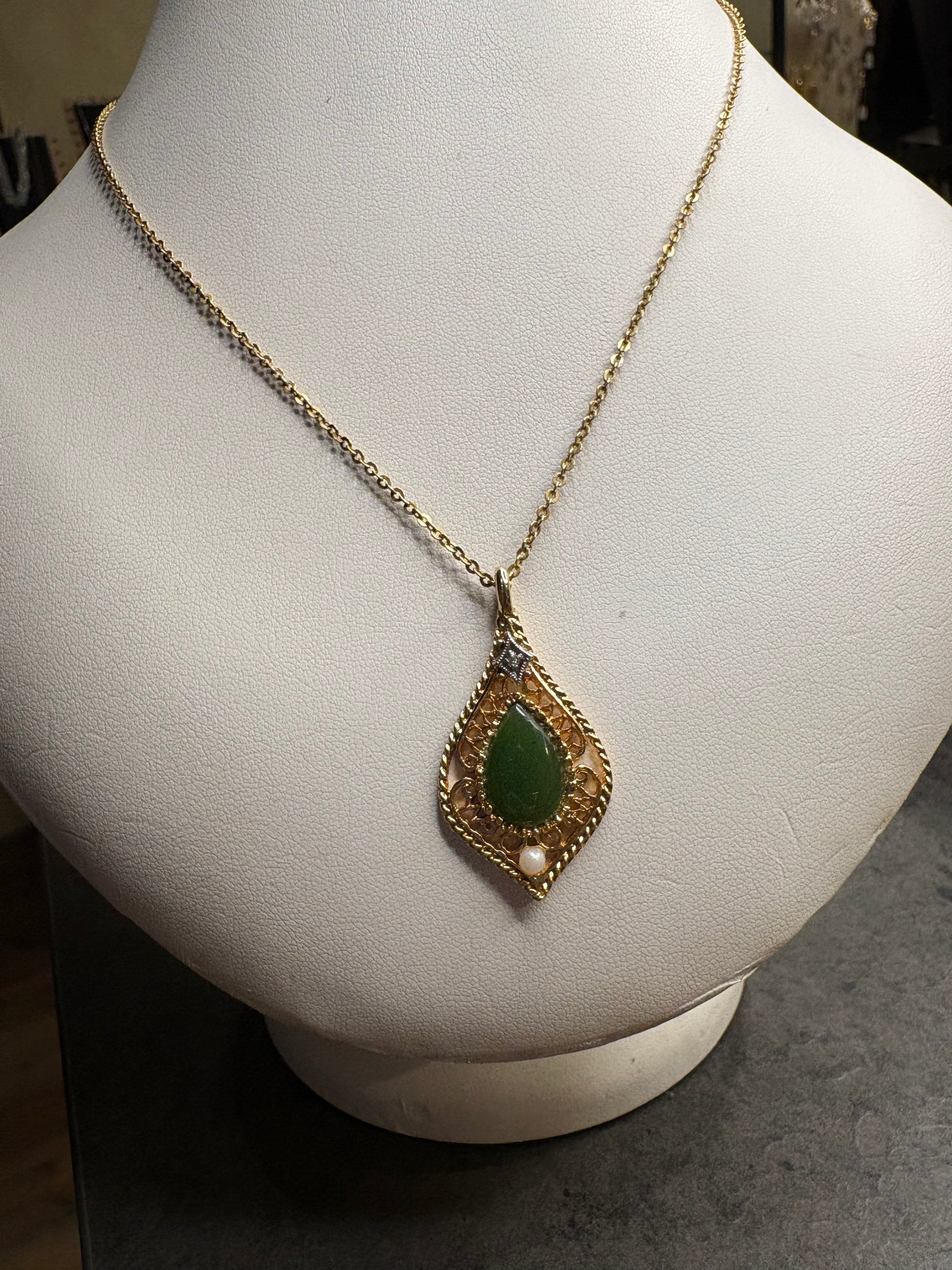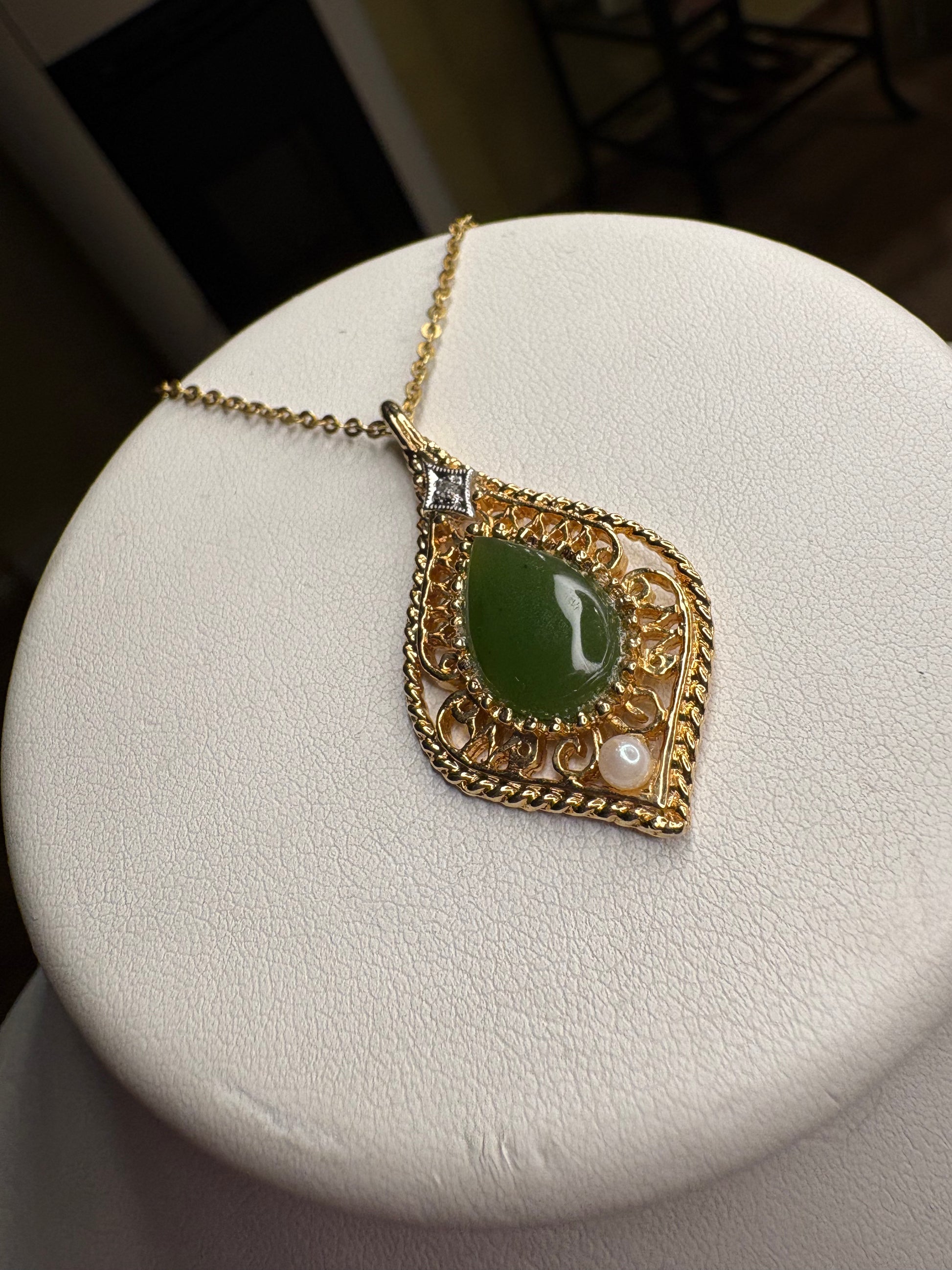 Pendente vintage di grande fascino, realizzato in metallo dorato con lavorazione traforata che richiama motivi ornamentali raffinati e leggeri. Al centro è incastonato un elegante elemento in giada verde a goccia, dalla superficie liscia e luminosa, che costituisce il cuore del gioiello.